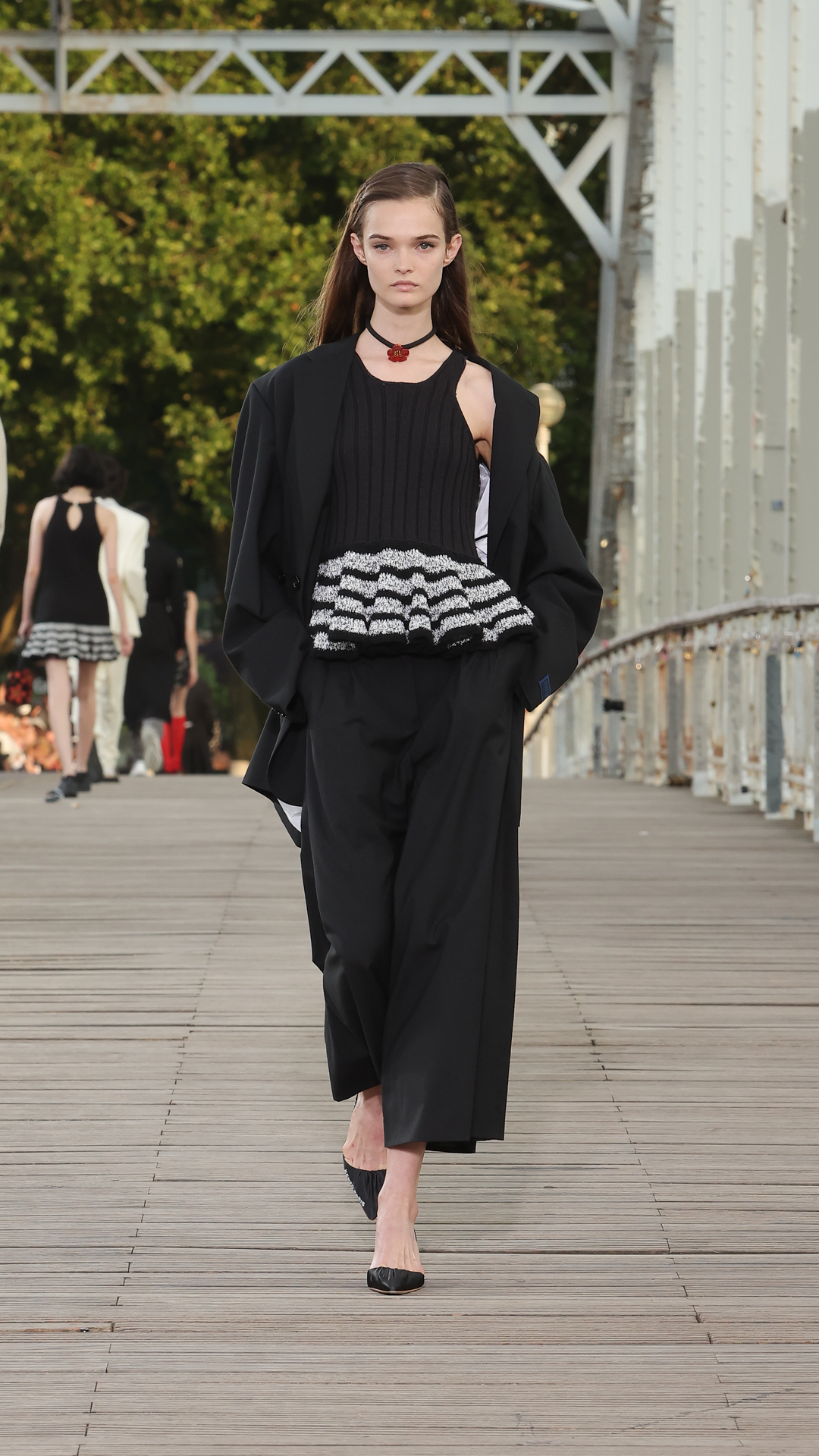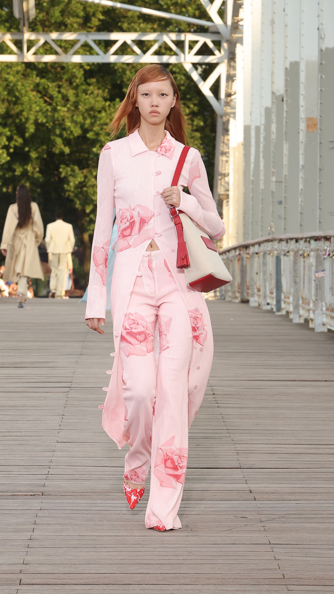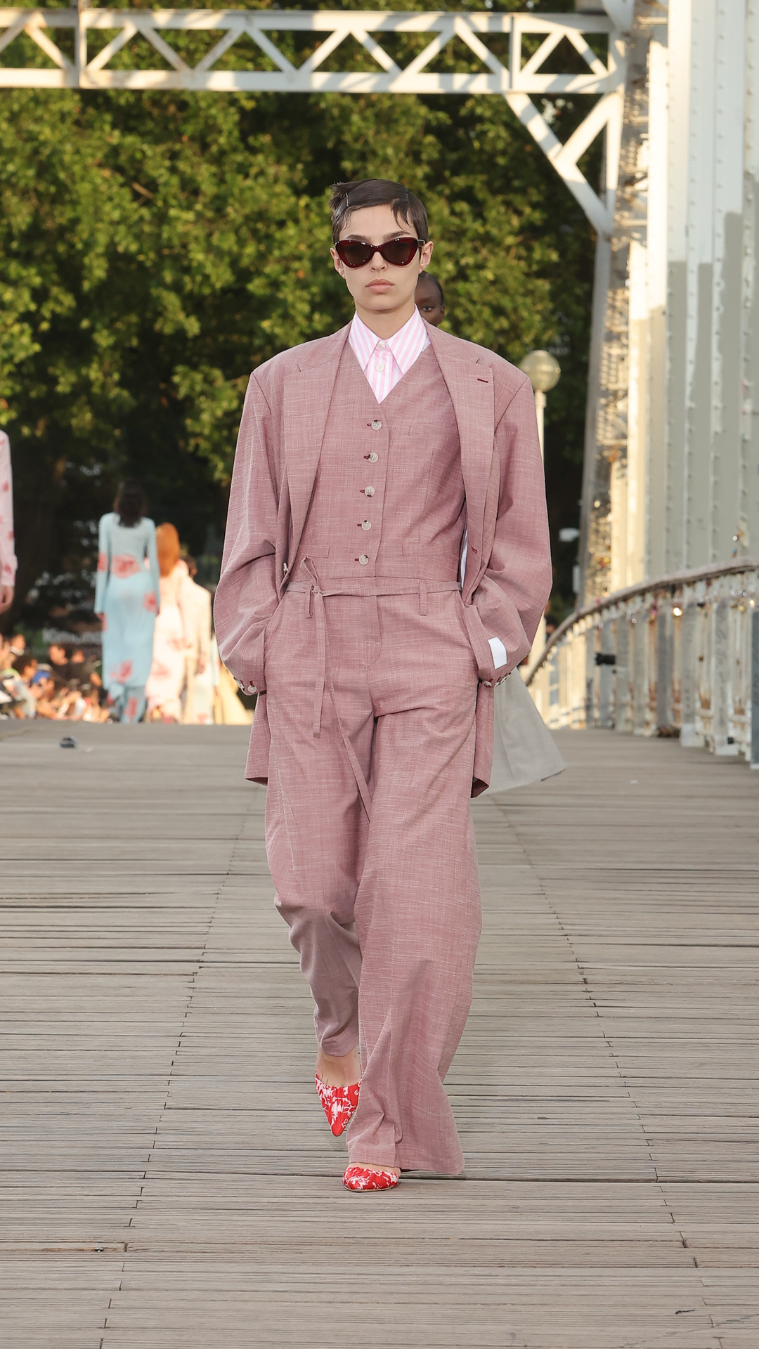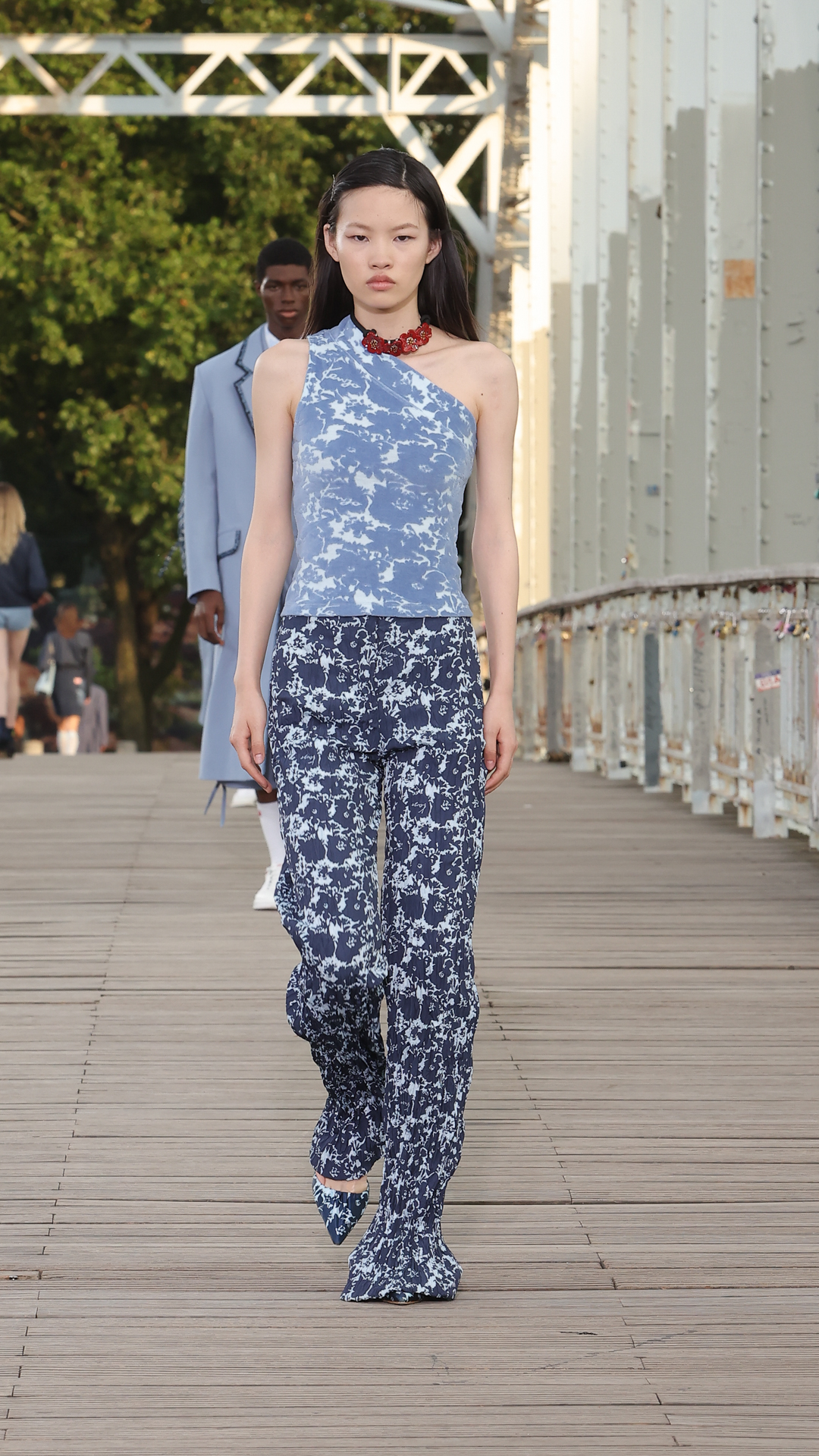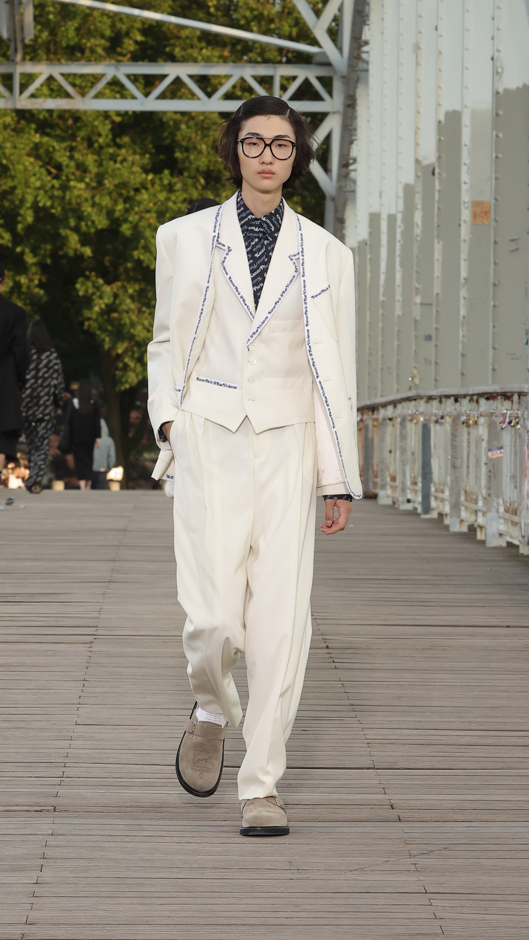 Les tailles sont marquées par des vestes cintrées ou des cardigans colonnes portés ouverts. Les matières estivales comme le lin composent des ensembles chemise-pantalon assortis, clin d’œil aux looks coordonnés de Kenzo Takada.