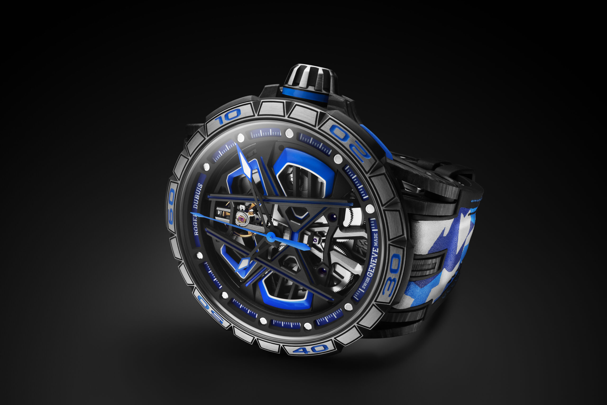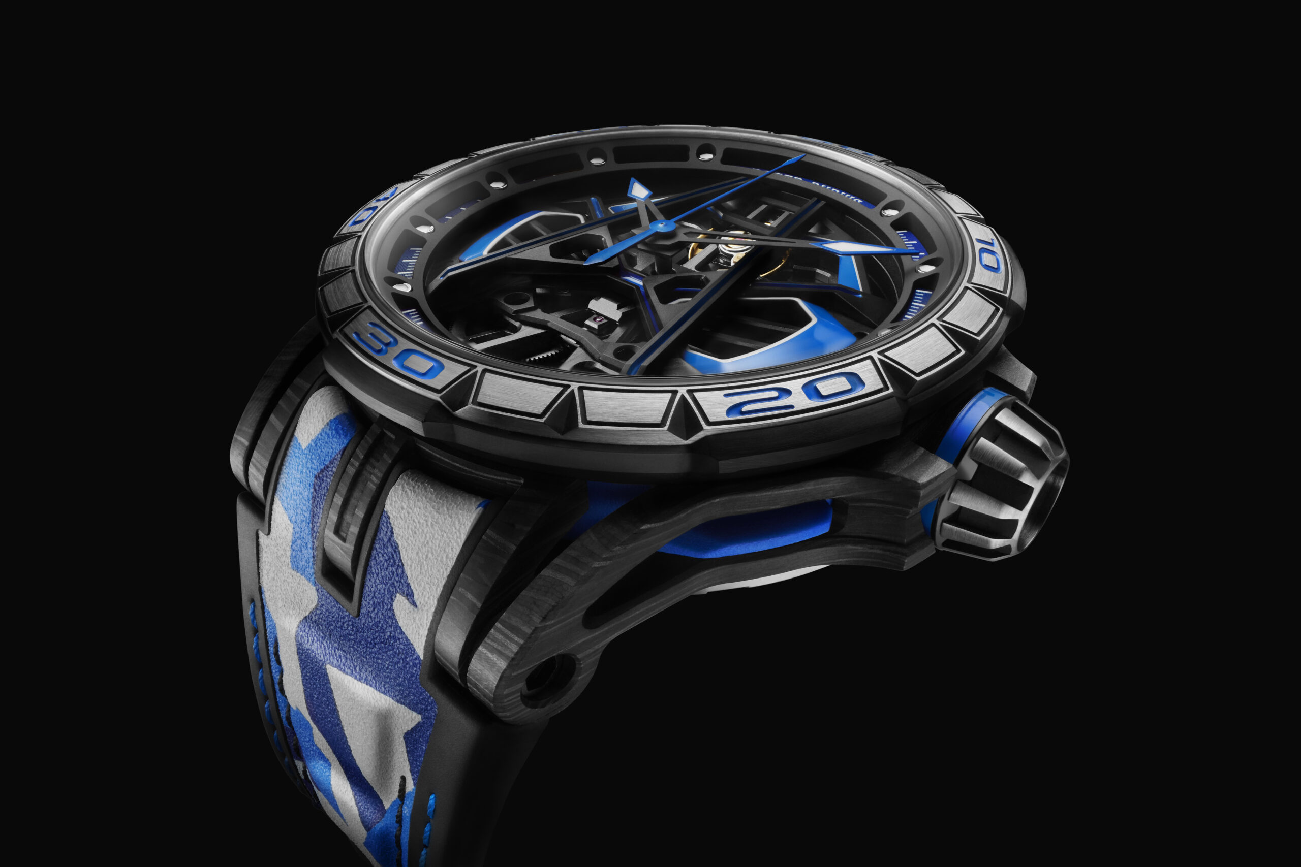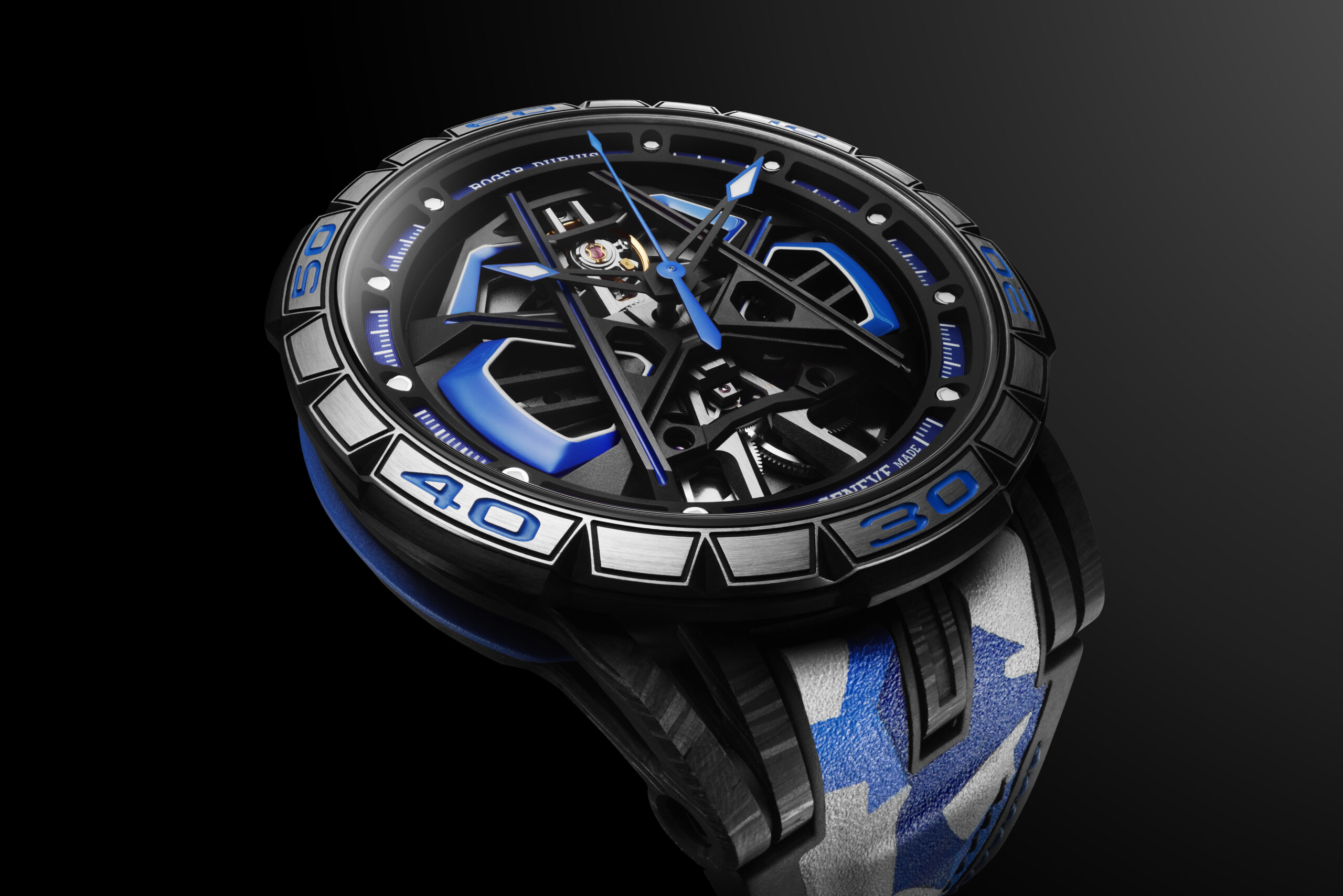 Roger Dubuis ne cesse de réinventer les règles du design, laissant les trajectoires conventionnelles derrière eux, pour marquer chaque virage de leur empreinte. Limitée à 28 pièces, l’Excalibur Spider Huracán Sterrato MB Bleue est un trésor rare qui plaira à tout collectionneur. Les cinq premiers à commander la montre en ligne sur le site Roger Dubuis recevront un casque de course sur mesure et peint à la main qui reflète le design de la montre.