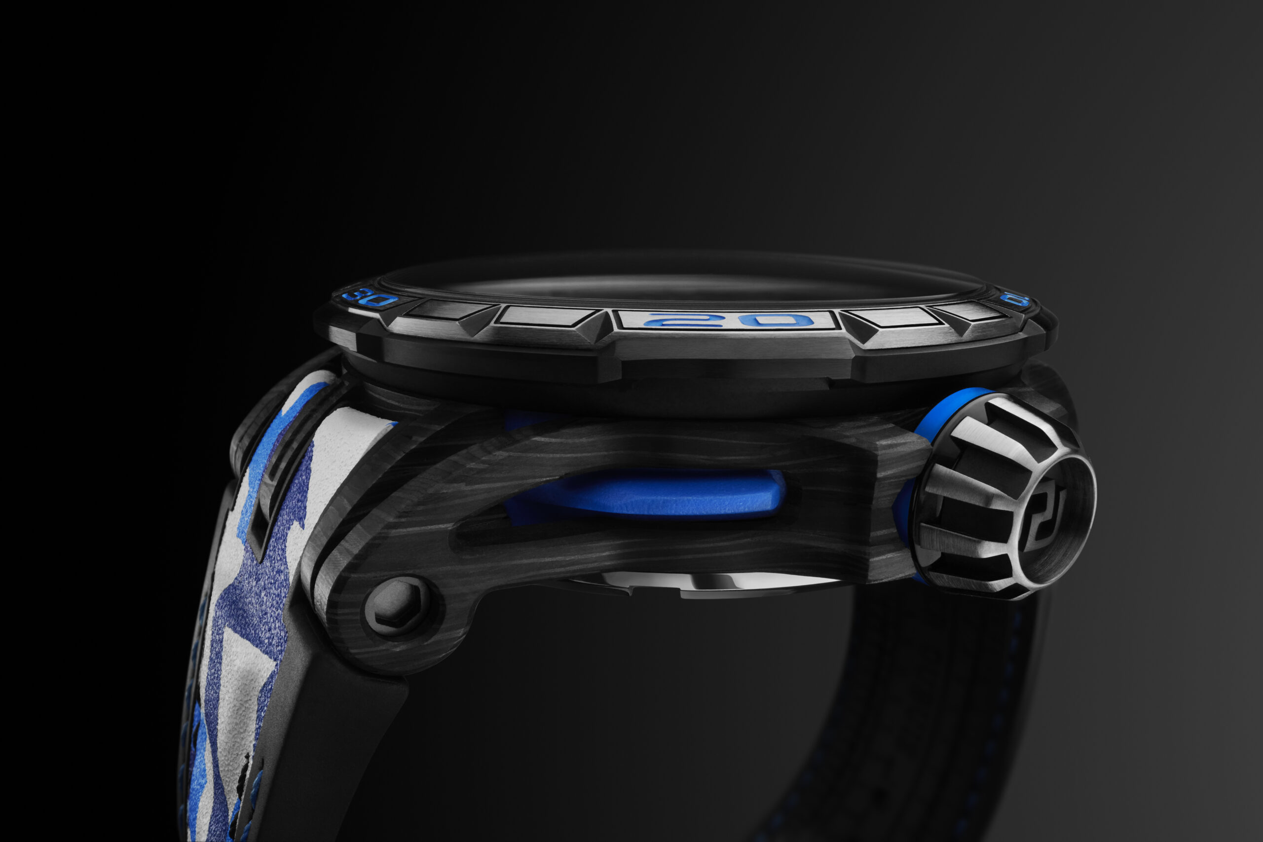 Le bracelet affiche un motif camouflage bleu réalisé par un processus ingénieux appelé « vulcanisation combinée ». L’intérieur du bracelet en caoutchouc noir arbore le motif d’un pneu Pirelli Trofeo R, un clin d’œil au monde de l’automobile.