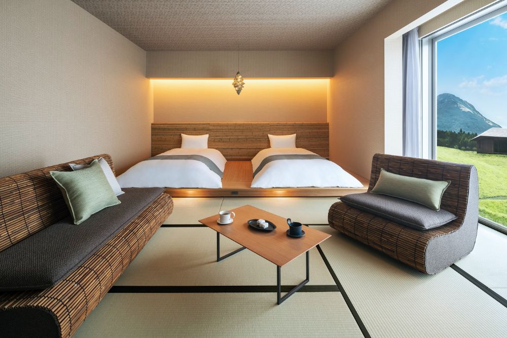 Les suites de KAI Yufuin offrent une vue panoramique sur les cascades de rizières en terrasses, avec le mont Yufu en toile de fond. Ici, la transformation saisonnière est perceptible à travers le changement d’apparence du paysage, de l’émeraude fraîche du printemps à la dorure de l’automne. Chaque chambre dispose d’un espace ouvert, où l’on peut apprécier le doux parfum naturel des tatamis fabriqués à partir de l’herbe rare shichitoi.