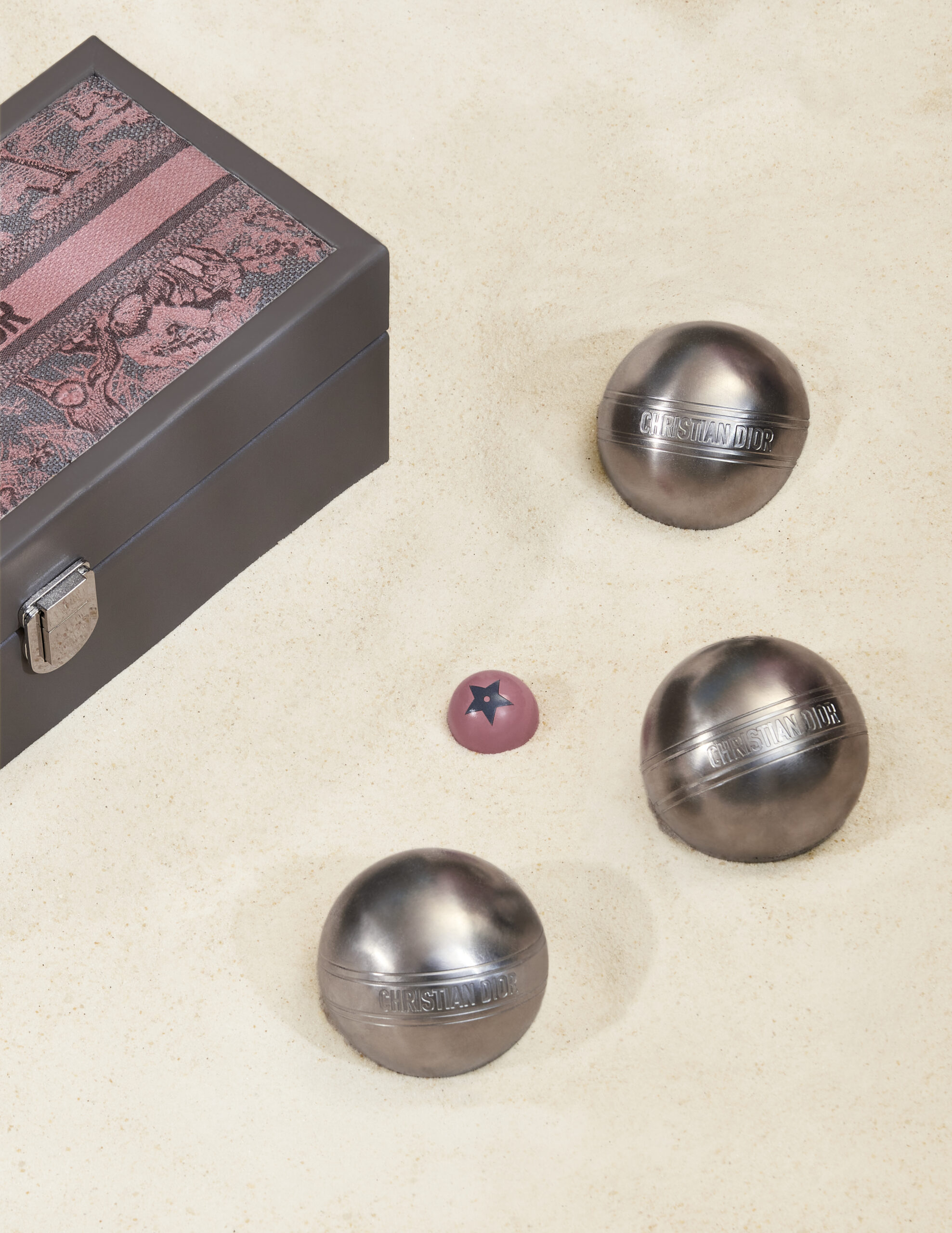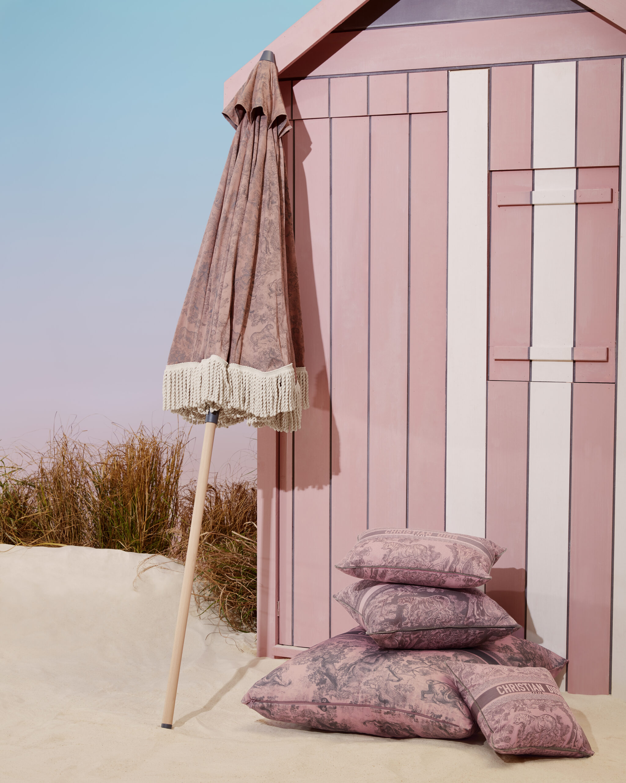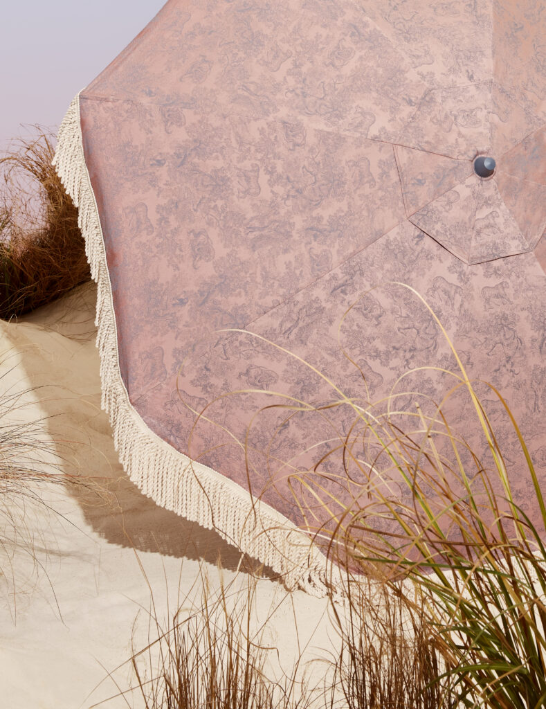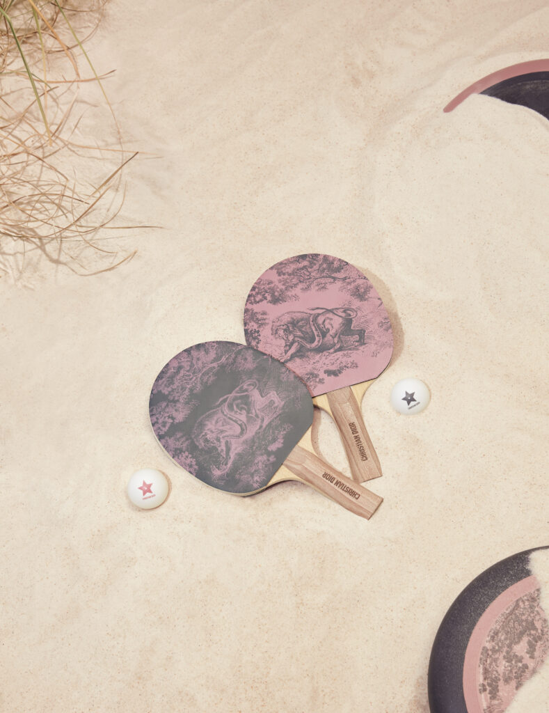 Dior Maison unveils the latest additions to the Dioriviera capsule, celebrating the gentle life dear to Christian Dior. Extensions of a radiant wardrobe reinvented by Maria Grazia Chiuri, these unique creations are dressed in iconic toile de Jouy, dreamed up by the Creative Director of women’s collections, in two emblematic Dior colors: pink and gray – the founding-couturier’s favorite shade. This timeless motif illuminates essential summer accessories – a yoga mat, table tennis rackets, a set of Finnish skittles, pétanque balls and dumbbells -, as well as two placemats, dinner and dessert plates, a flask, a box of three mini candles and embroidered cushions. An invitation to take a sunny break, this exceptional design also adorns an armchair, two deckchairs, a parasol and a surfboard. A moment suspended in time, like an escape to the seaside.