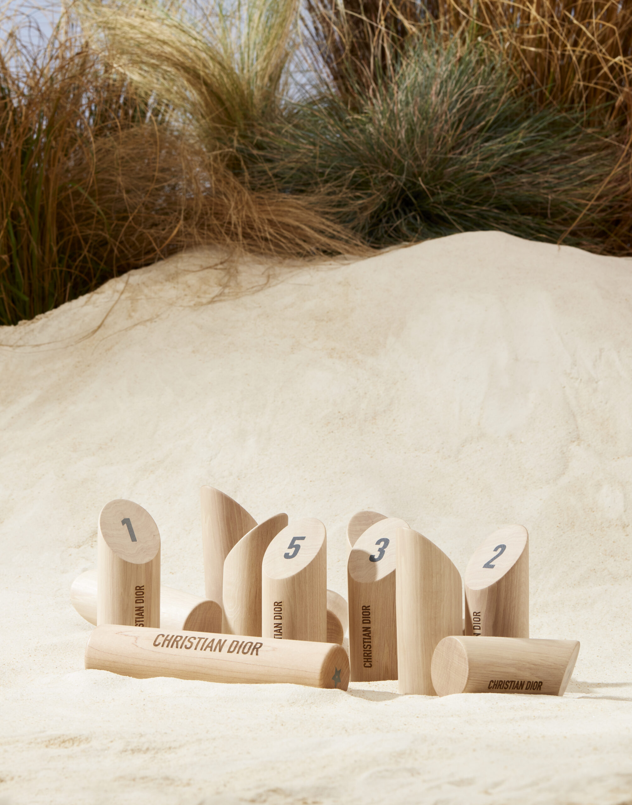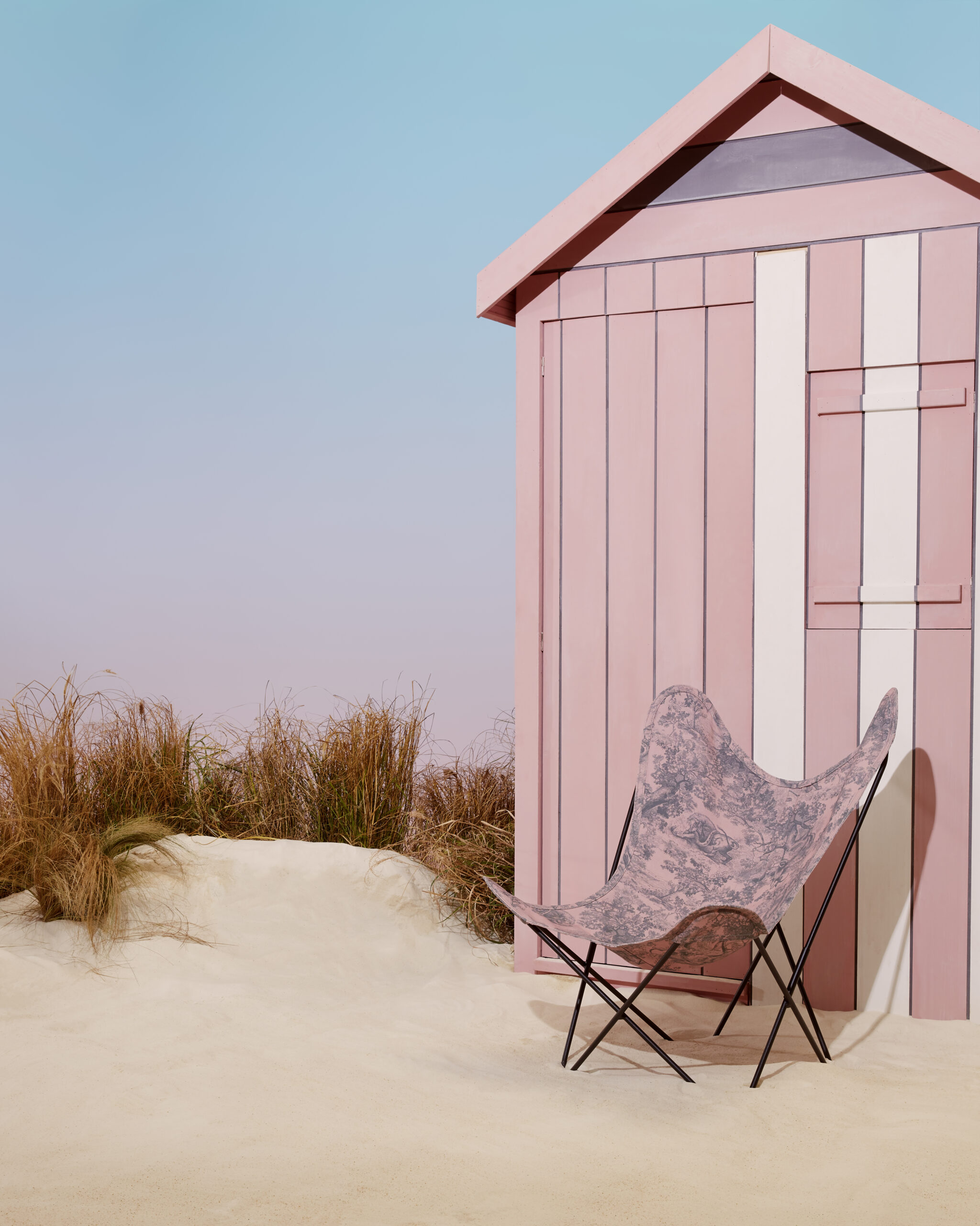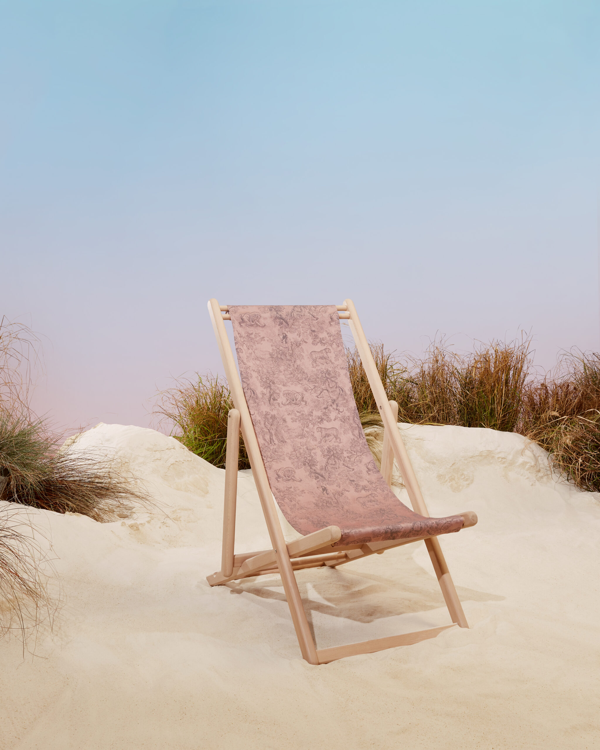 Dior Maison unveils the latest additions to the Dioriviera capsule, celebrating the gentle life dear to Christian Dior. Extensions of a radiant wardrobe reinvented by Maria Grazia Chiuri, these unique creations are dressed in iconic toile de Jouy, dreamed up by the Creative Director of women’s collections, in two emblematic Dior colors: pink and gray – the founding-couturier’s favorite shade. This timeless motif illuminates essential summer accessories – a yoga mat, table tennis rackets, a set of Finnish skittles, pétanque balls and dumbbells -, as well as two placemats, dinner and dessert plates, a flask, a box of three mini candles and embroidered cushions. An invitation to take a sunny break, this exceptional design also adorns an armchair, two deckchairs, a parasol and a surfboard. A moment suspended in time, like an escape to the seaside.