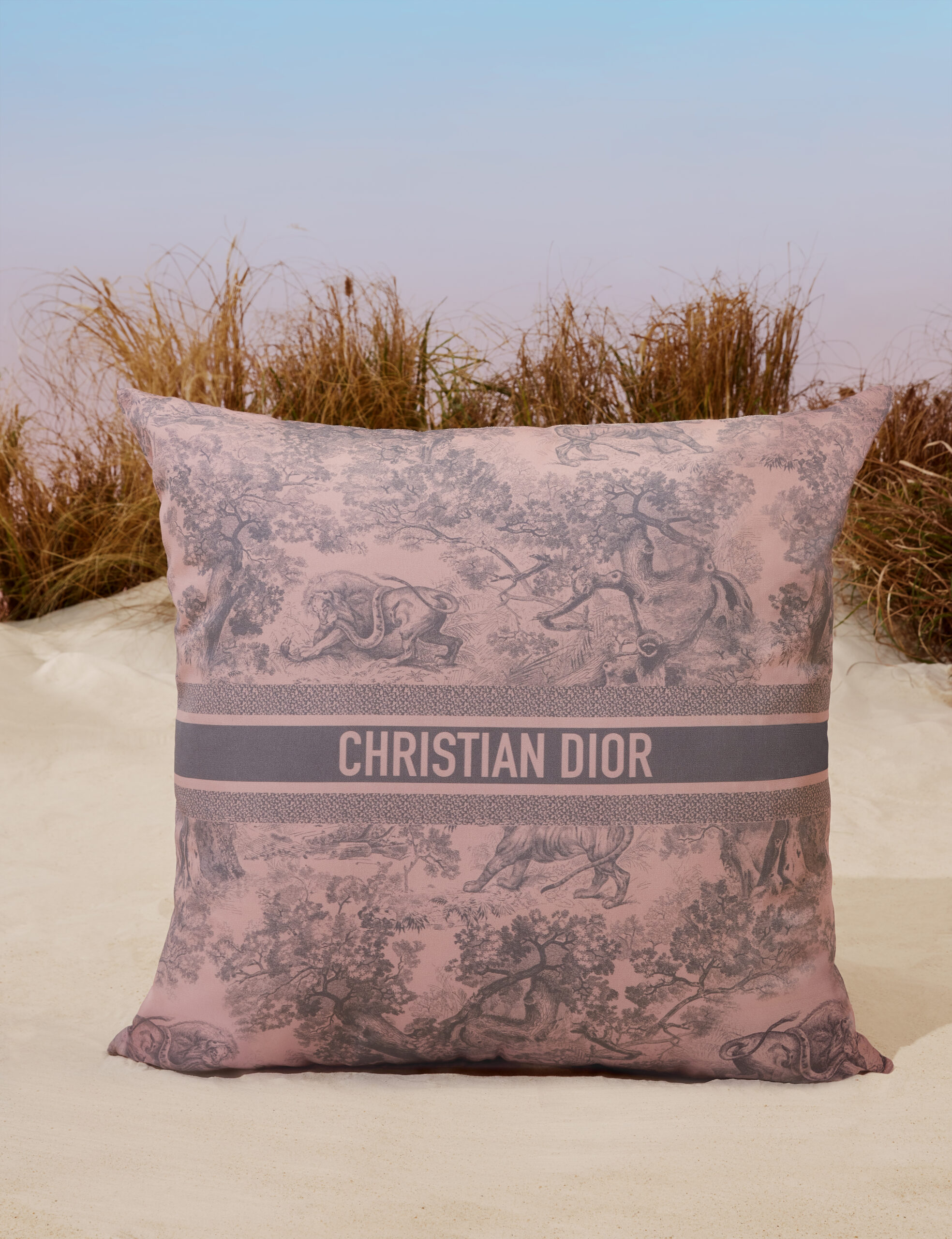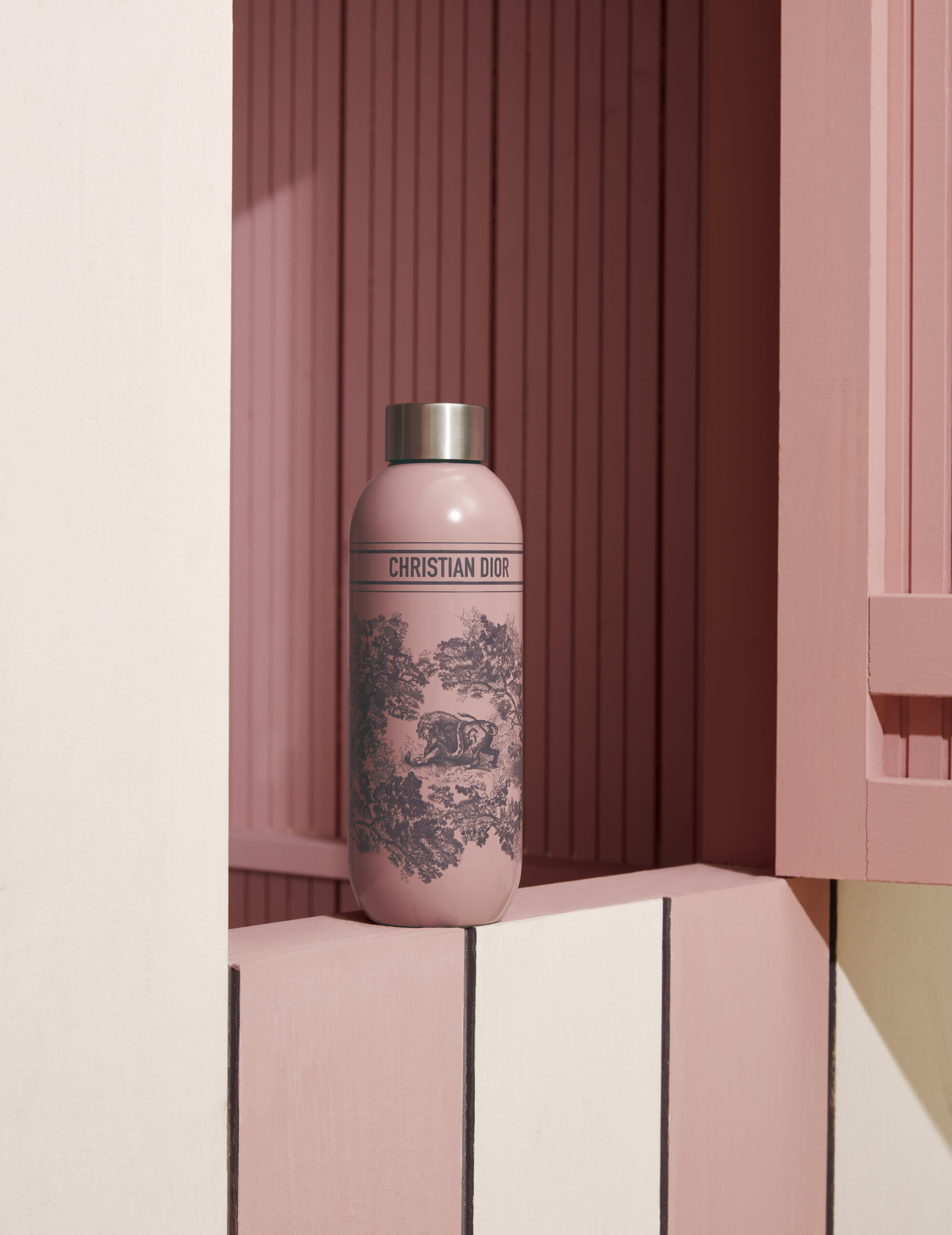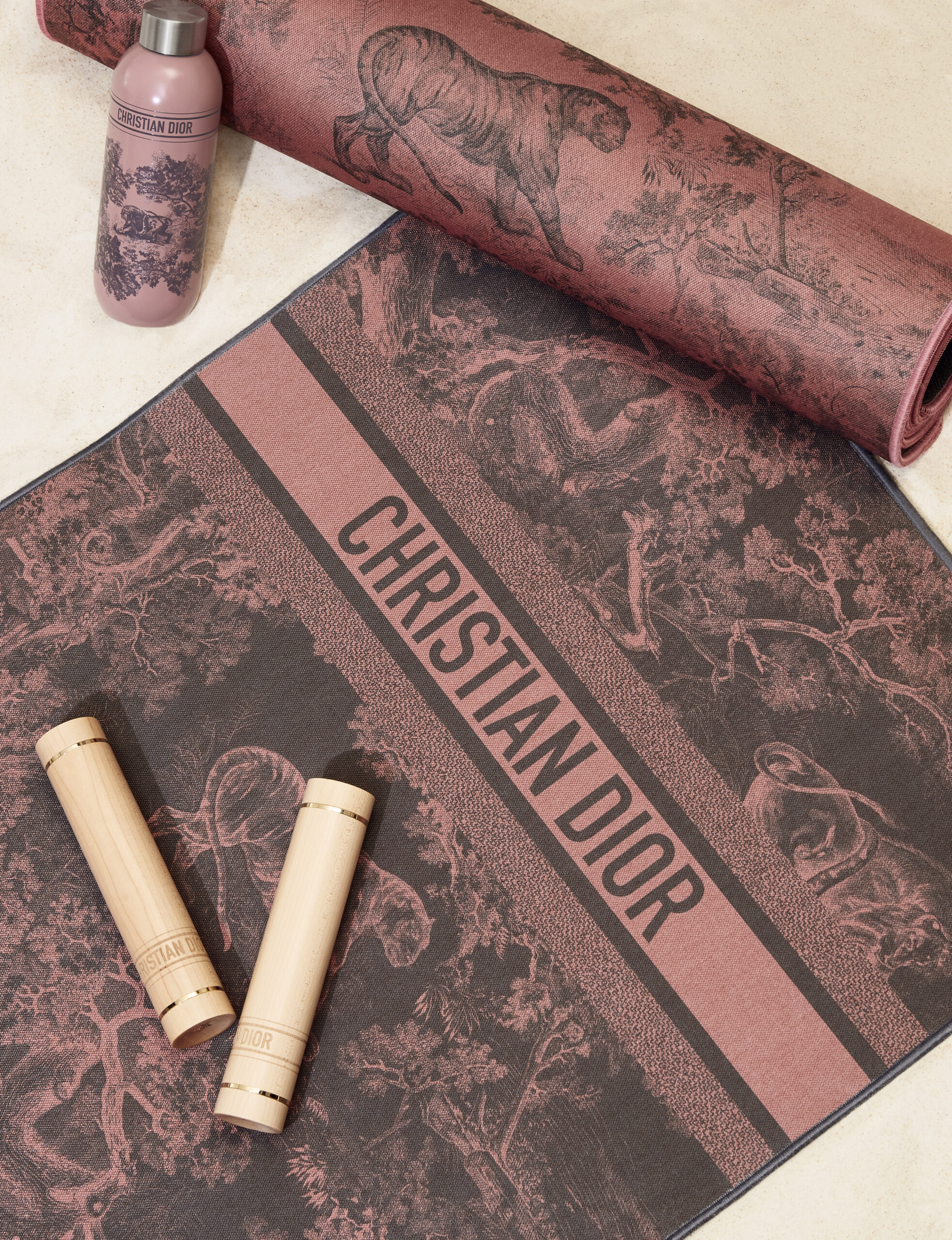 THE DIORIVIERA 2023 COLLECTION Dior Maison dévoile les nouveautés de la capsule Dioriviera, célébrant la douceur de vivre chère à Christian Dior. Prolongements du vestiaire solaire réinventé par Maria Grazia Chiuri, ces créations inédites s’habillent de l’iconique toile de Jouy, imaginée par la Directrice Artistique des collections féminines, dans deux couleurs Dior emblématiques : le rose et le gris – nuance fétiche du couturier-fondateur. Ce dessin atemporel illumine les accessoires essentiels de l’été – un tapis de yoga, des raquettes de tennis de table, un jeu de quilles finlandaises, des boules de pétanque et des haltères -, ainsi que deux sets de table, des assiettes à diner et à dessert, une gourde, un coffret de trois mini bougies ou encore des coussins brodés. Invitation à un voyage ensoleillé, ce motif d’exception orne également un fauteuil, deux transats, un parasol, mais aussi une planche de surf. Un instant suspendu, telle une échappée en bord de mer.