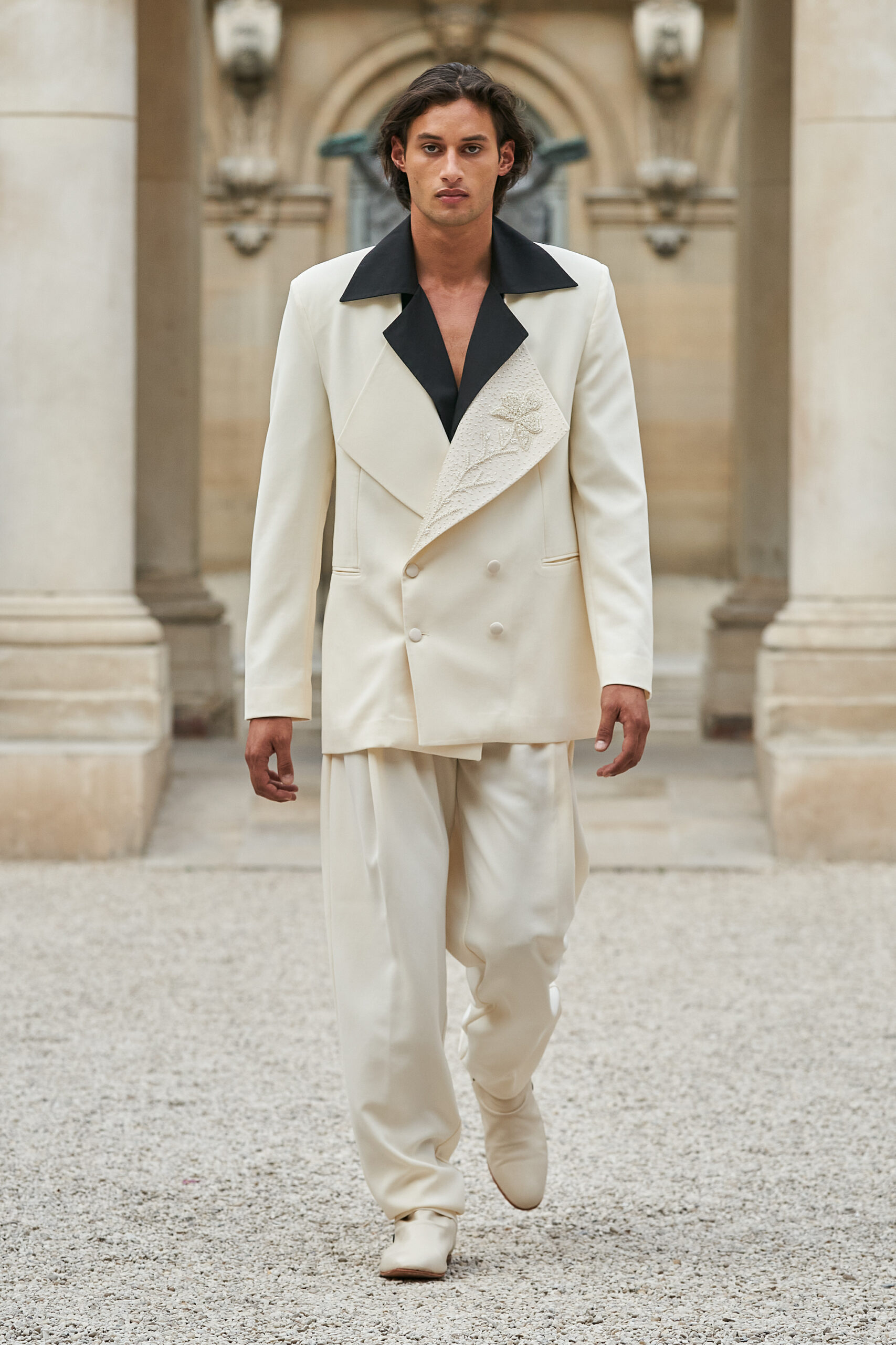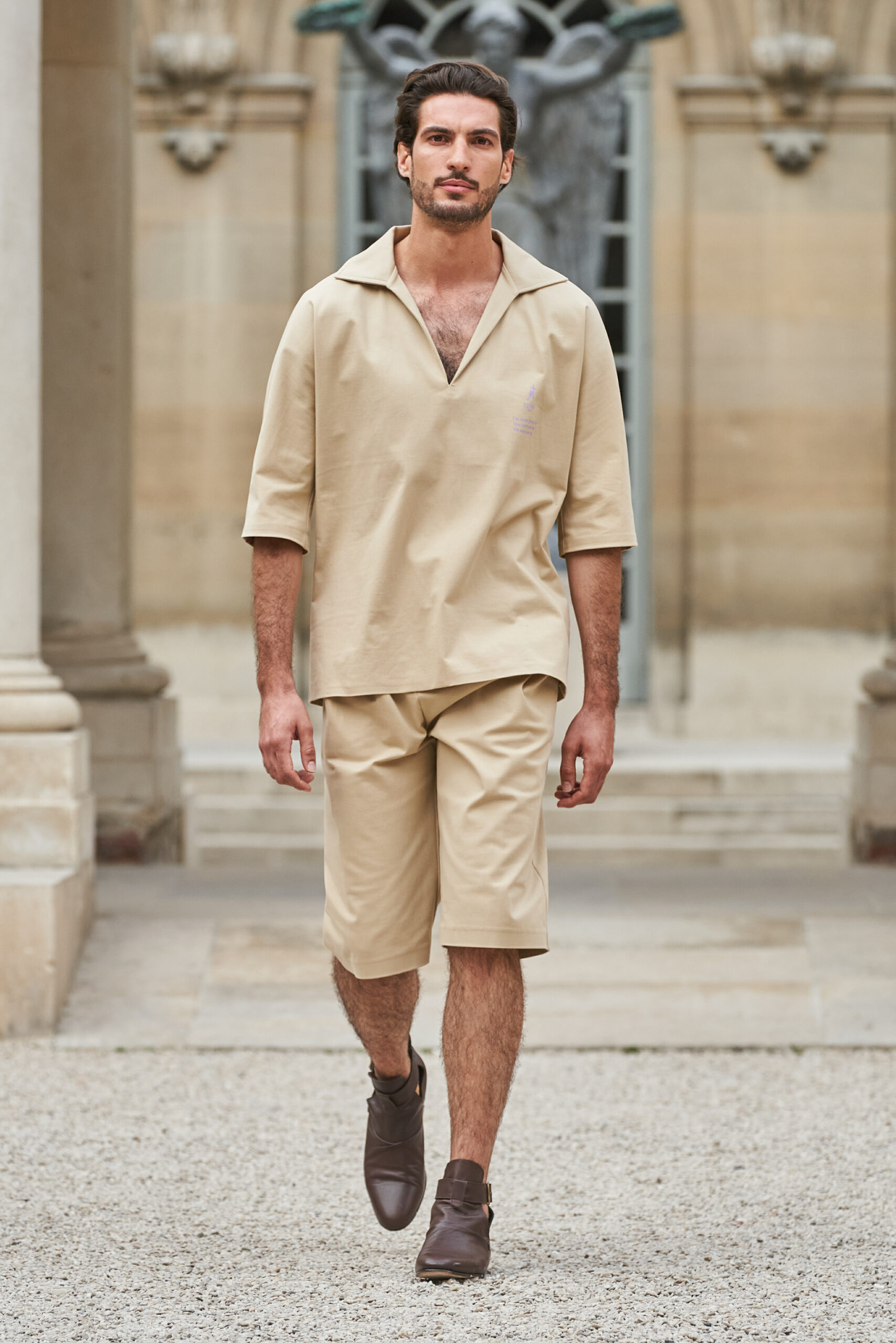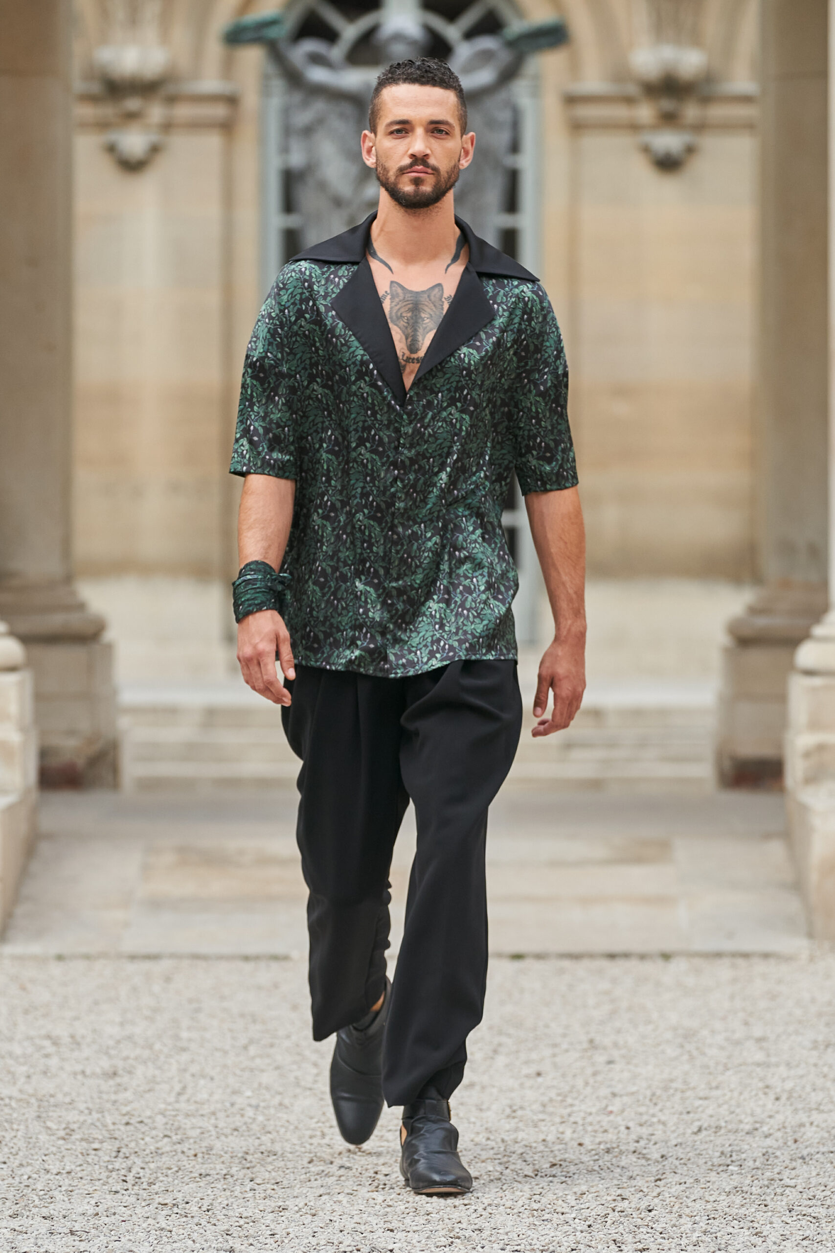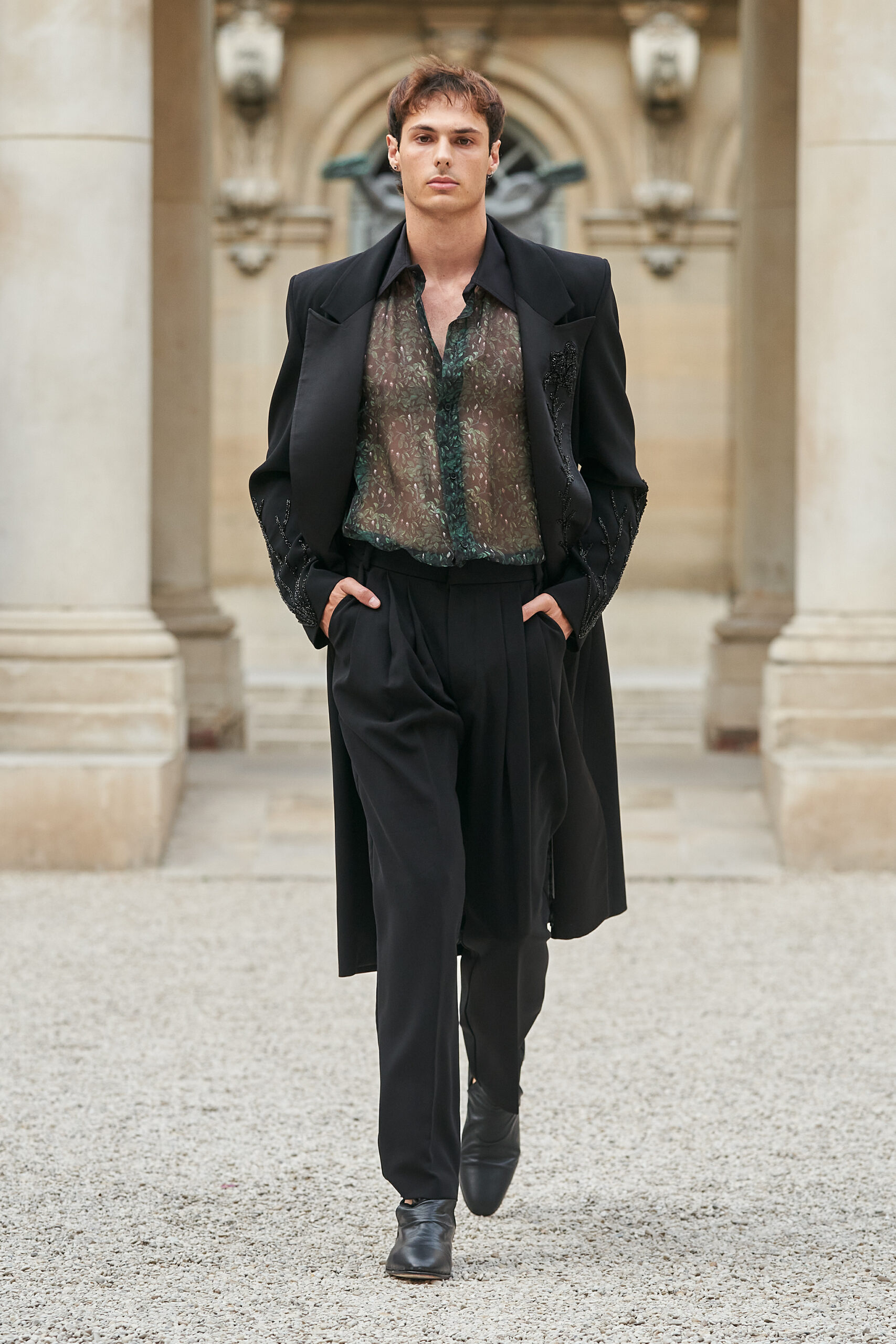 Le tuxedo orné de broderies jusqu’à l’ourlet est un hommage à un Hollywood disparu et accompagne l’homme de St Nian Paris du tapis rouge à la vie quotidienne. Car on peut être élégant et non conventionnel même au quotidien. Mais la veste bomber comporte également des décorations dans le dos et est portée avec des pantalons ajustés ou, pour une touche Beverly Hills, des shorts. En dessous, des chemises sur mesure et douces font leur apparition.