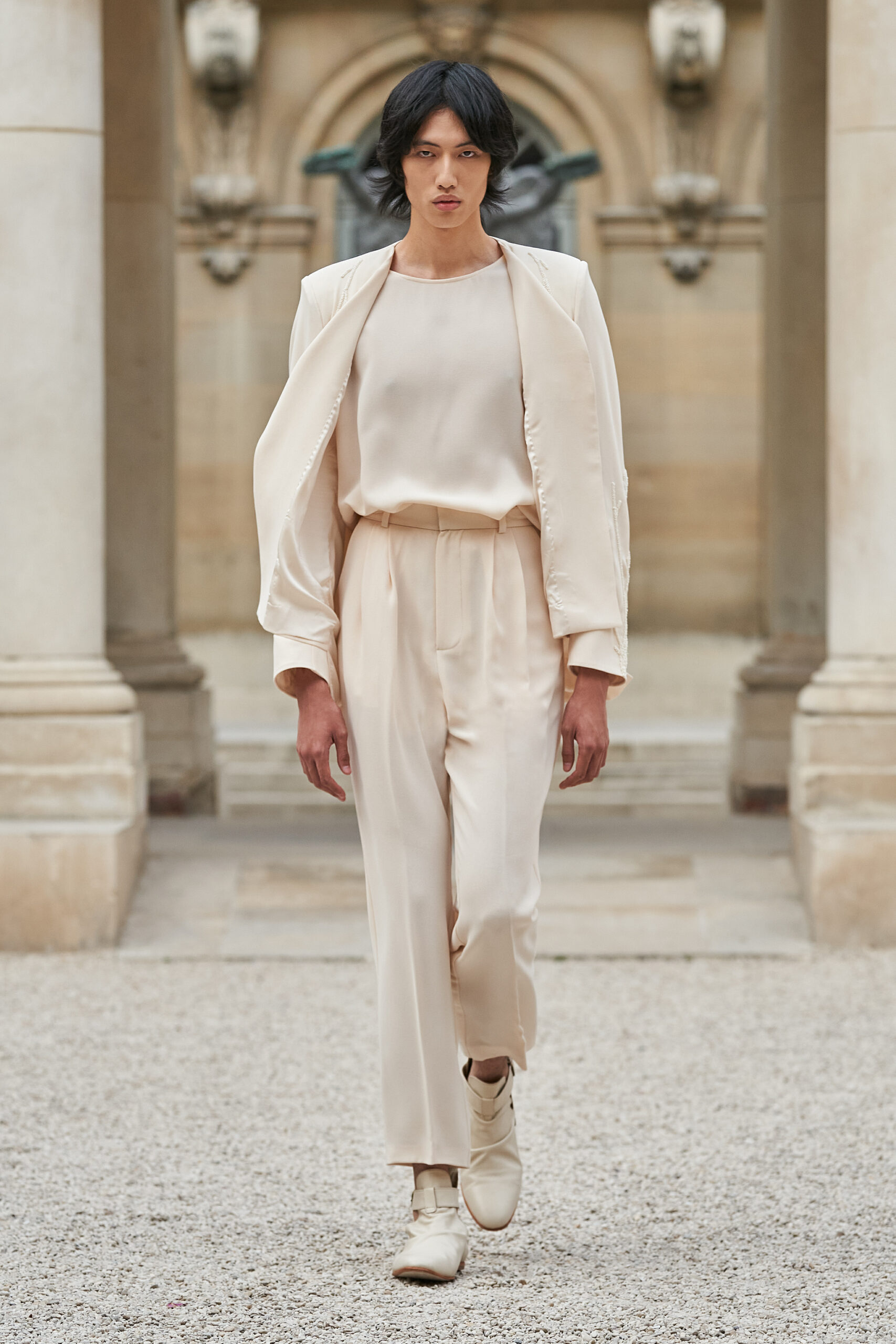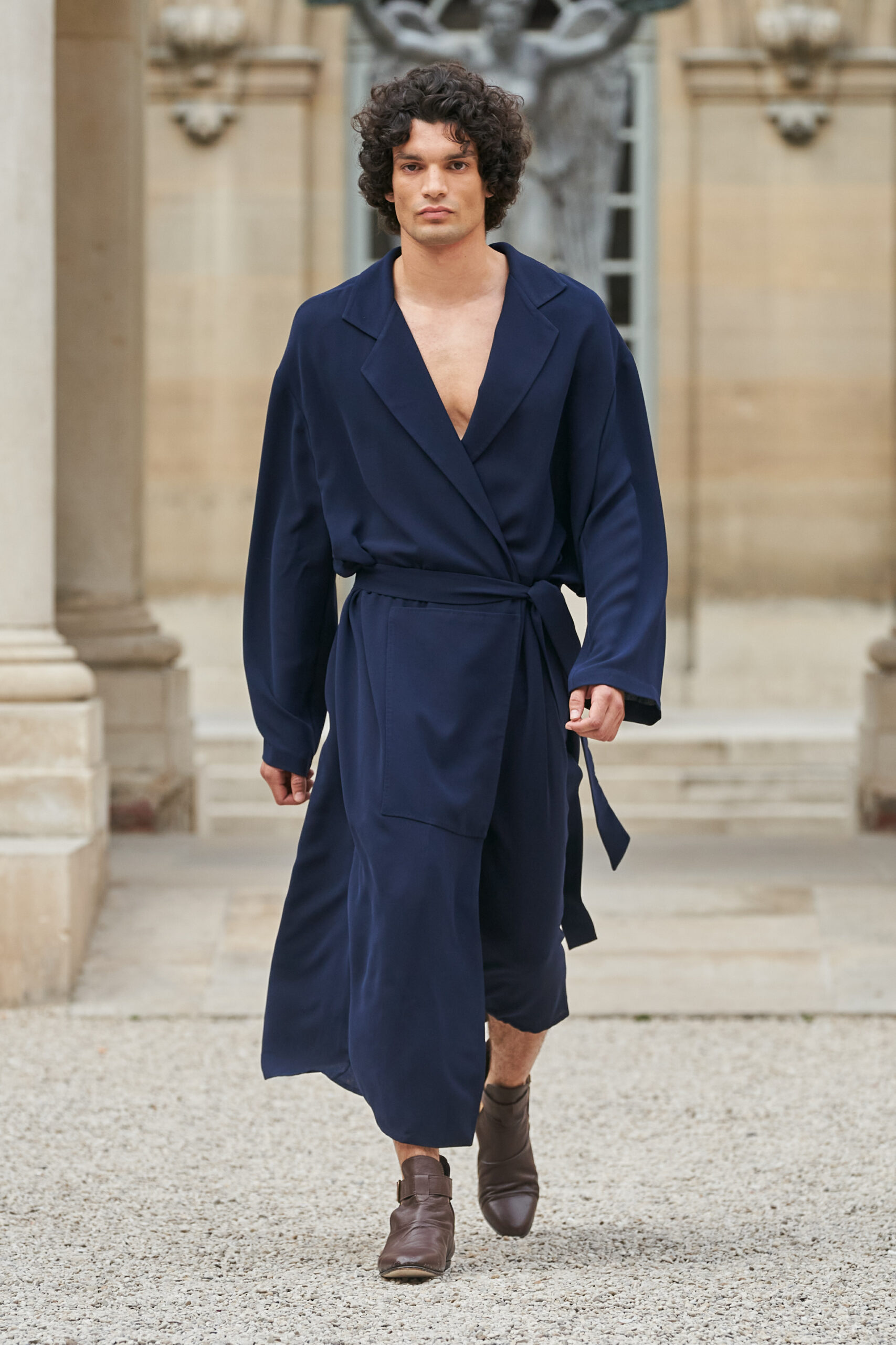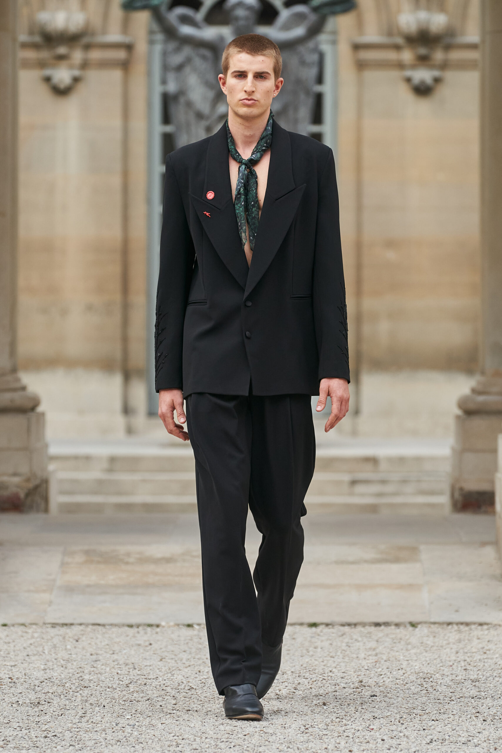 Le tuxedo orné de broderies jusqu’à l’ourlet est un hommage à un Hollywood disparu et accompagne l’homme de St Nian Paris du tapis rouge à la vie quotidienne. Car on peut être élégant et non conventionnel même au quotidien. Mais la veste bomber comporte également des décorations dans le dos et est portée avec des pantalons ajustés ou, pour une touche Beverly Hills, des shorts. En dessous, des chemises sur mesure et douces font leur apparition.