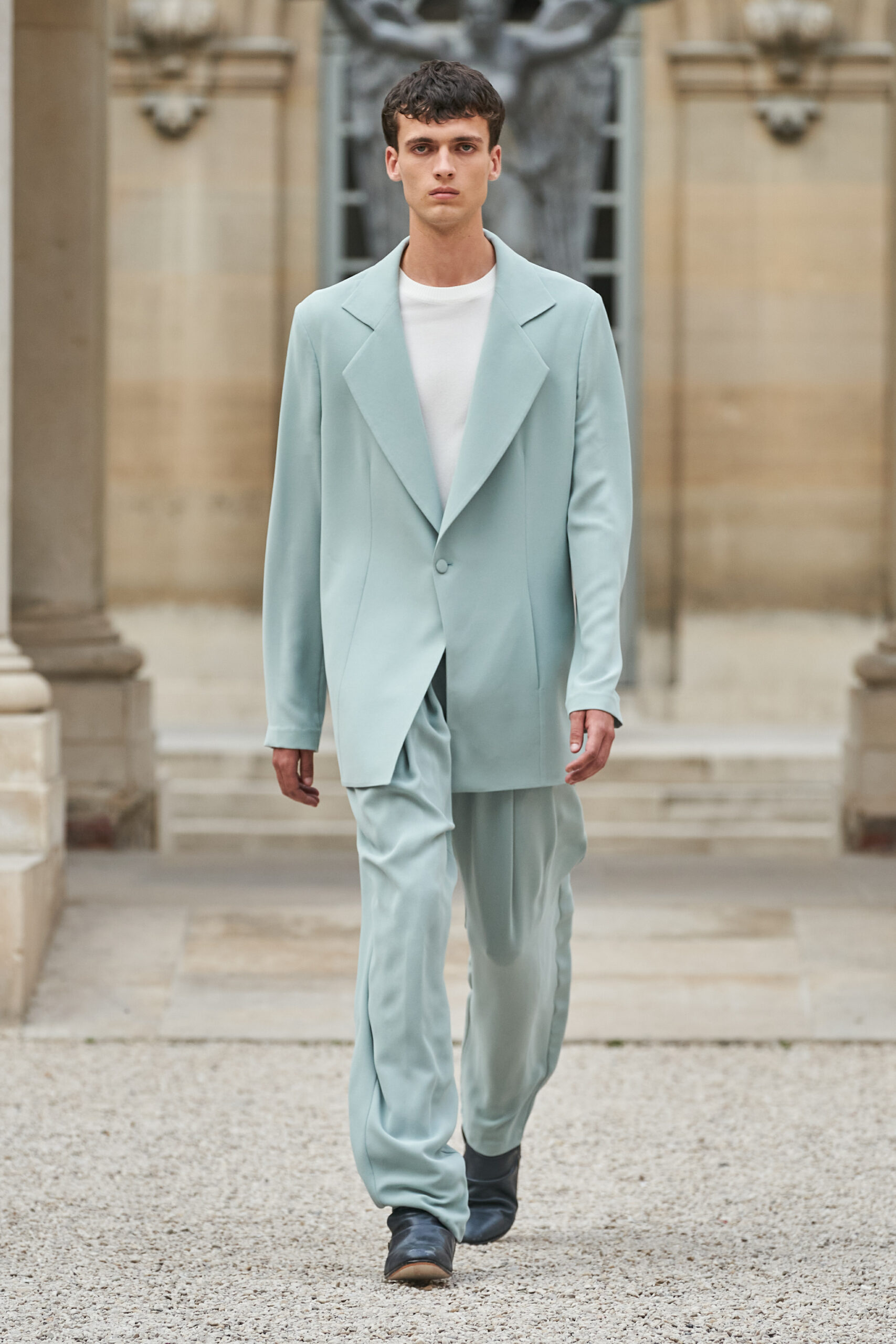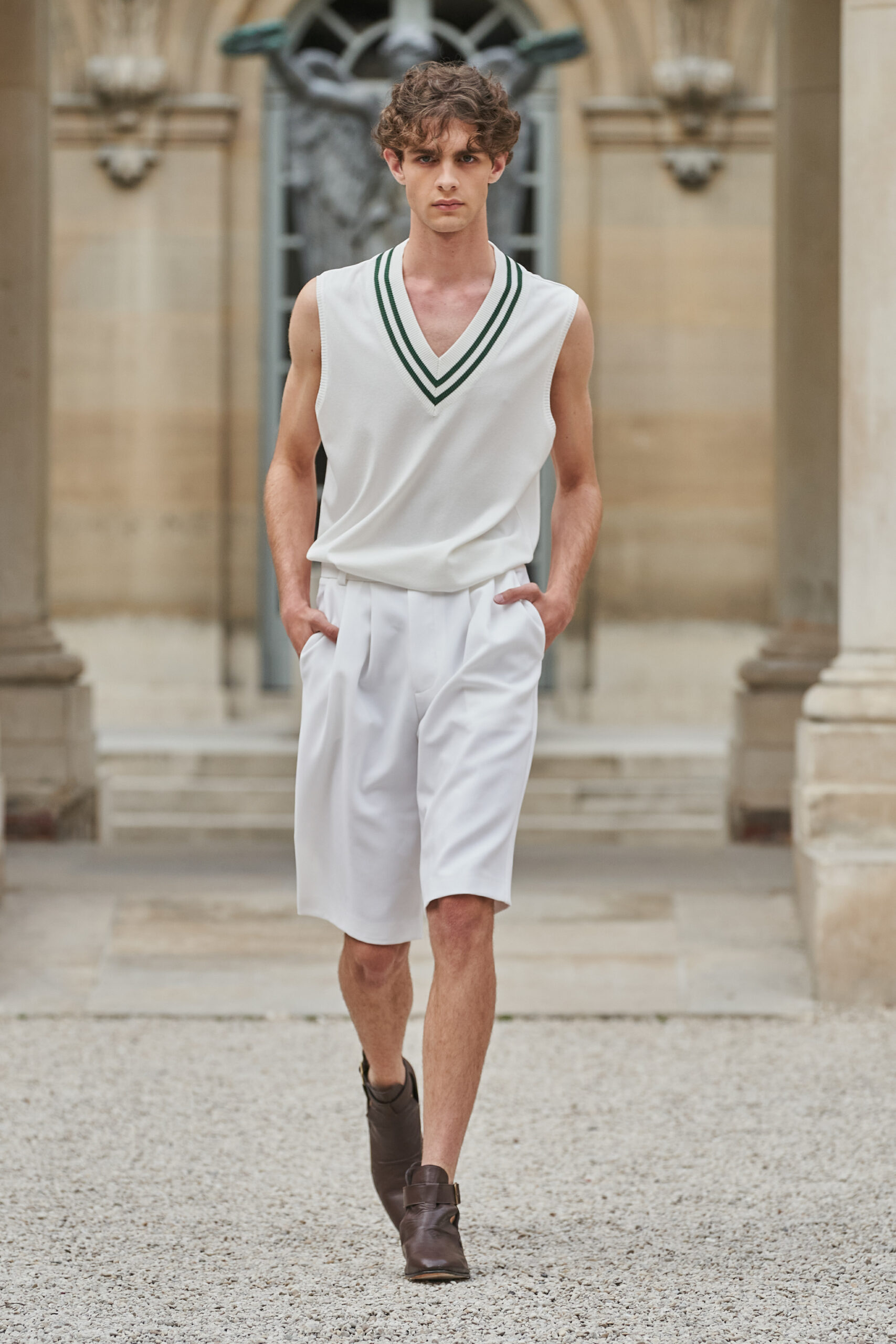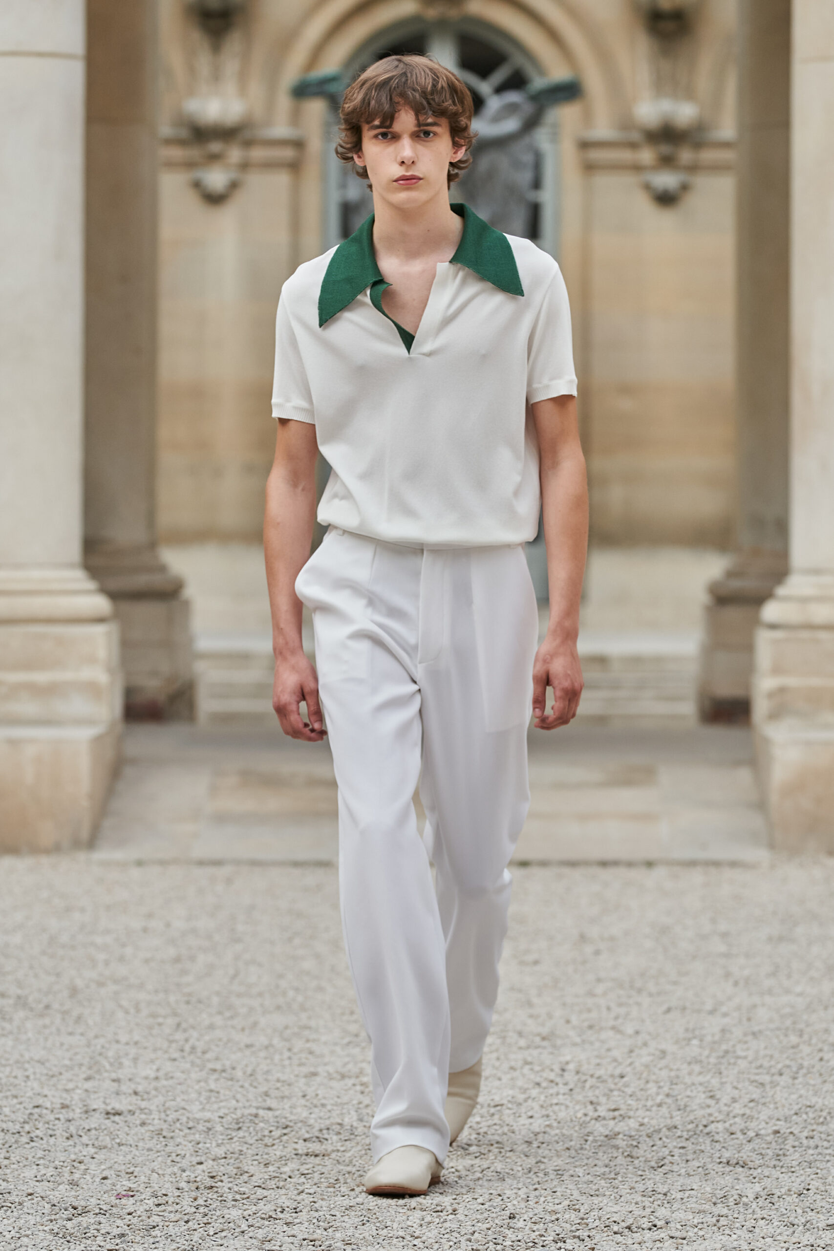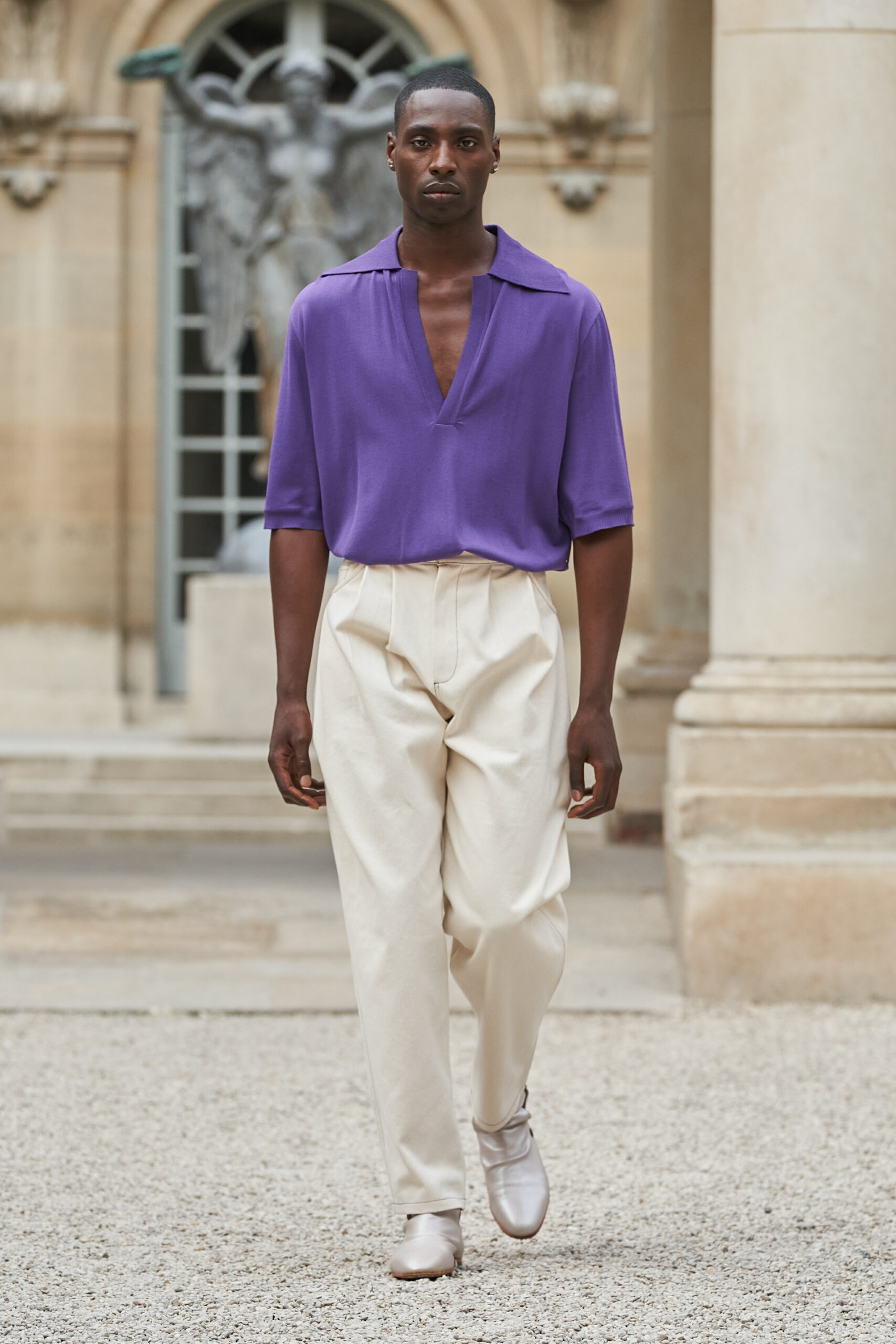 Le tuxedo orné de broderies jusqu’à l’ourlet est un hommage à un Hollywood disparu et accompagne l’homme de St Nian Paris du tapis rouge à la vie quotidienne. Car on peut être élégant et non conventionnel même au quotidien. Mais la veste bomber comporte également des décorations dans le dos et est portée avec des pantalons ajustés ou, pour une touche Beverly Hills, des shorts. En dessous, des chemises sur mesure et douces font leur apparition.