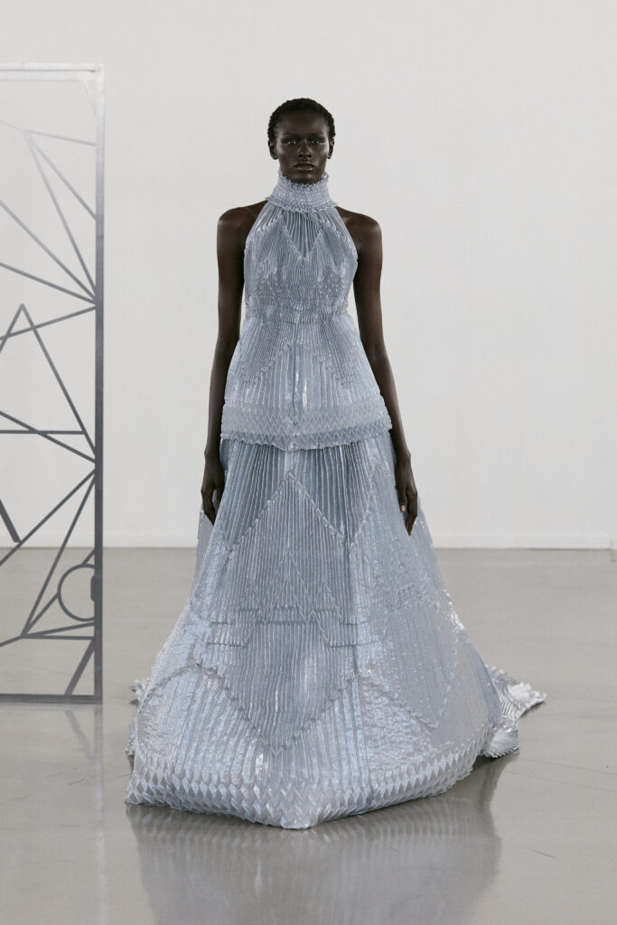 Un véritable hymne à la luminescence, La Diffraction de la Lumière dévoile une variété de textiles sur-mesure qui mettent en évidence le jeu de la lumière sur le tissu, délicatement plissé et drapé autour de silhouettes inspirées de la géométrie des gemmes et des motifs stupéfiants qui émergent lorsque la lumière les traverse.