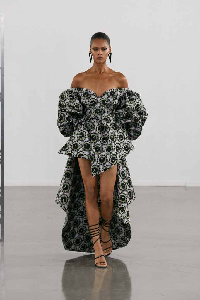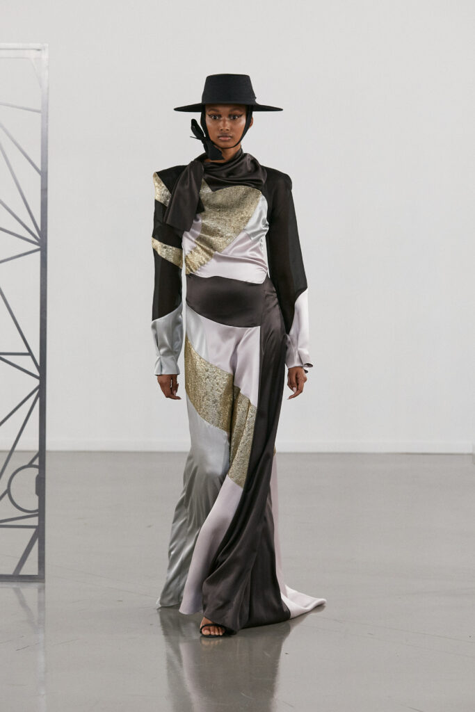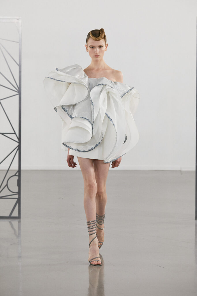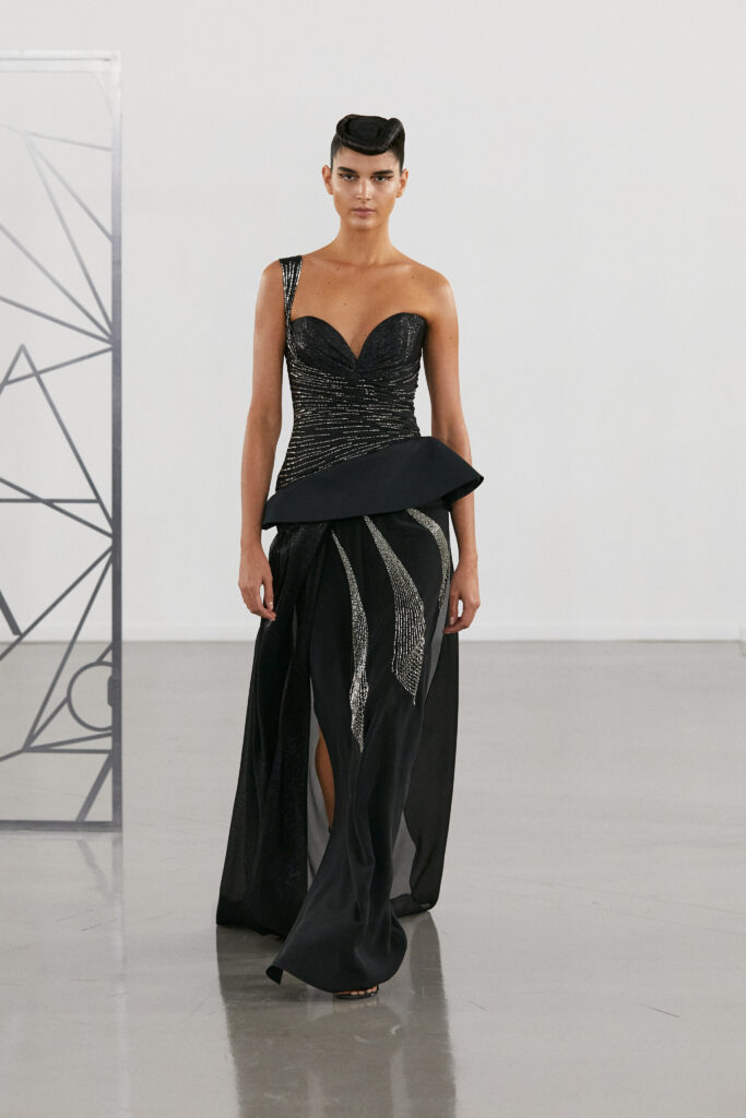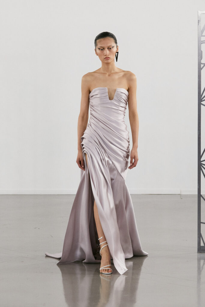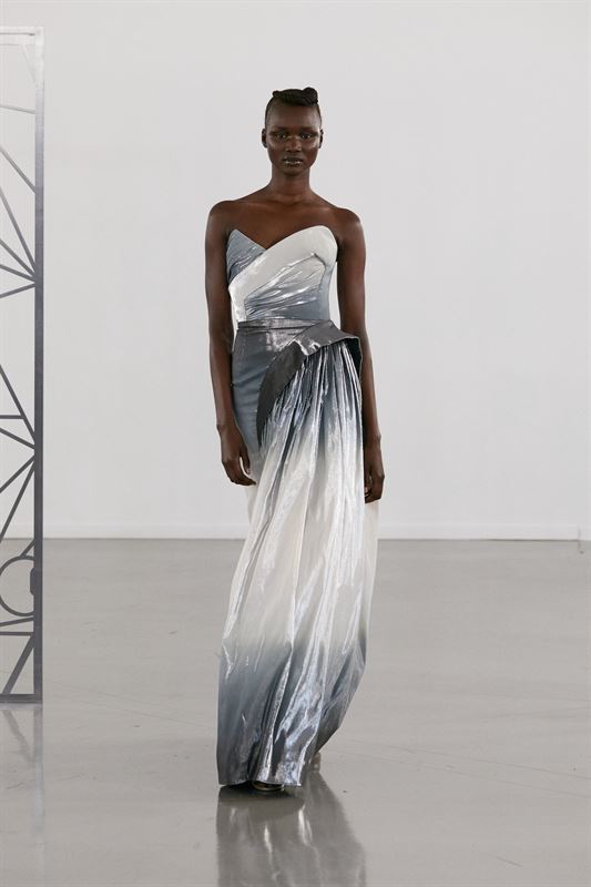 Les lignes asymétriques et les formes géométriques de la collection sont contrastées par un drapé doux et volumineux, comme on peut le voir dans la robe de soirée « June ». Créée avec plus de 850 heures de travail et 200 mètres de soie, elle est définie par ses couches légères de mousseline de soie, d’organza et de lurex argenté qui tourbillonnent gracieusement autour du corps.