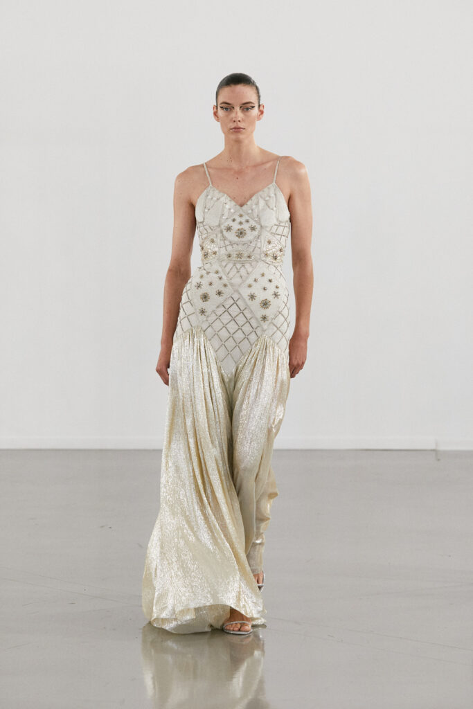 Composée de 24 looks, la collection met en avant des techniques de couture artisanales telles que le smocking, le plissage, la broderie et l’appliqué, pour créer l’effet de la lumière irradiant d’un vêtement. Le thème de la lumière est également interprété, de façon littérale, par l’utilisation de tissus légers, souvent transparents, qui révèlent l’attention méticuleuse portée à leur construction, et comment leur véritable beauté vient de l’intérieur.