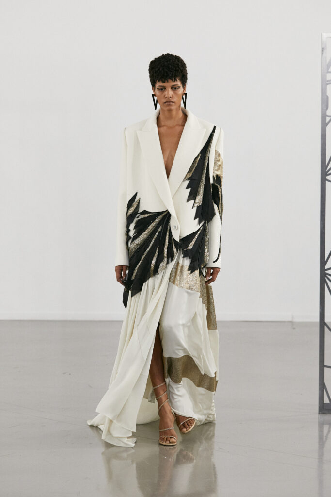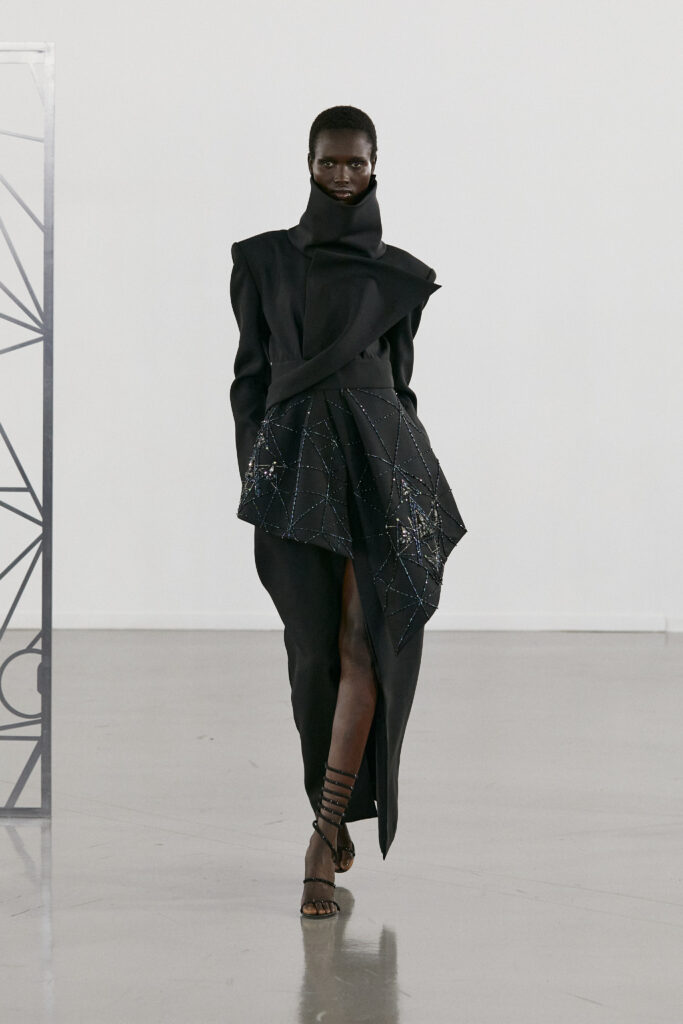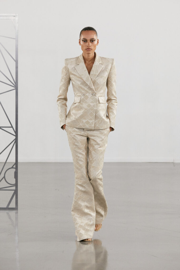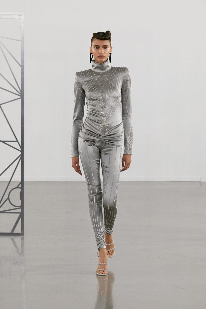 La géométrie est un thème récurrent. La robe « Vega », en soie fine, s’inspire d’un plafond orné de l’ancienne ville perse de Yazd, dont les mathématiques élaborées ont guidé la composition du plissé, de l’appliqué et de la broderie de perles, de sequins et de fils d’argent sur la robe. La collection présente également des tissus jacquard sur mesure, avec la structure atomique du minéral Béryl, appliquée à un costume impeccablement taillé et à une robe à longue traîne, tous deux découpés de manière géométrique pour créer la taille de pierre ArdAzAei.