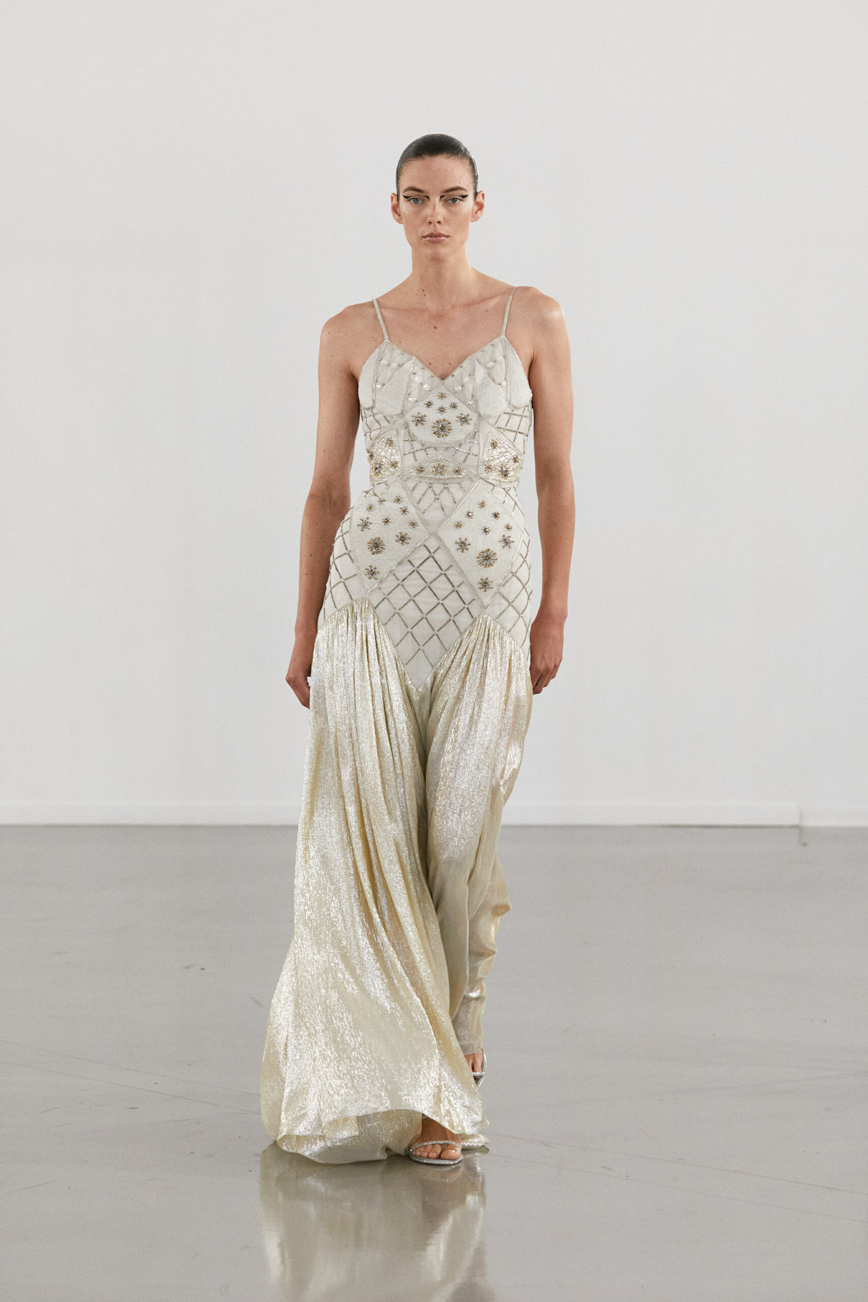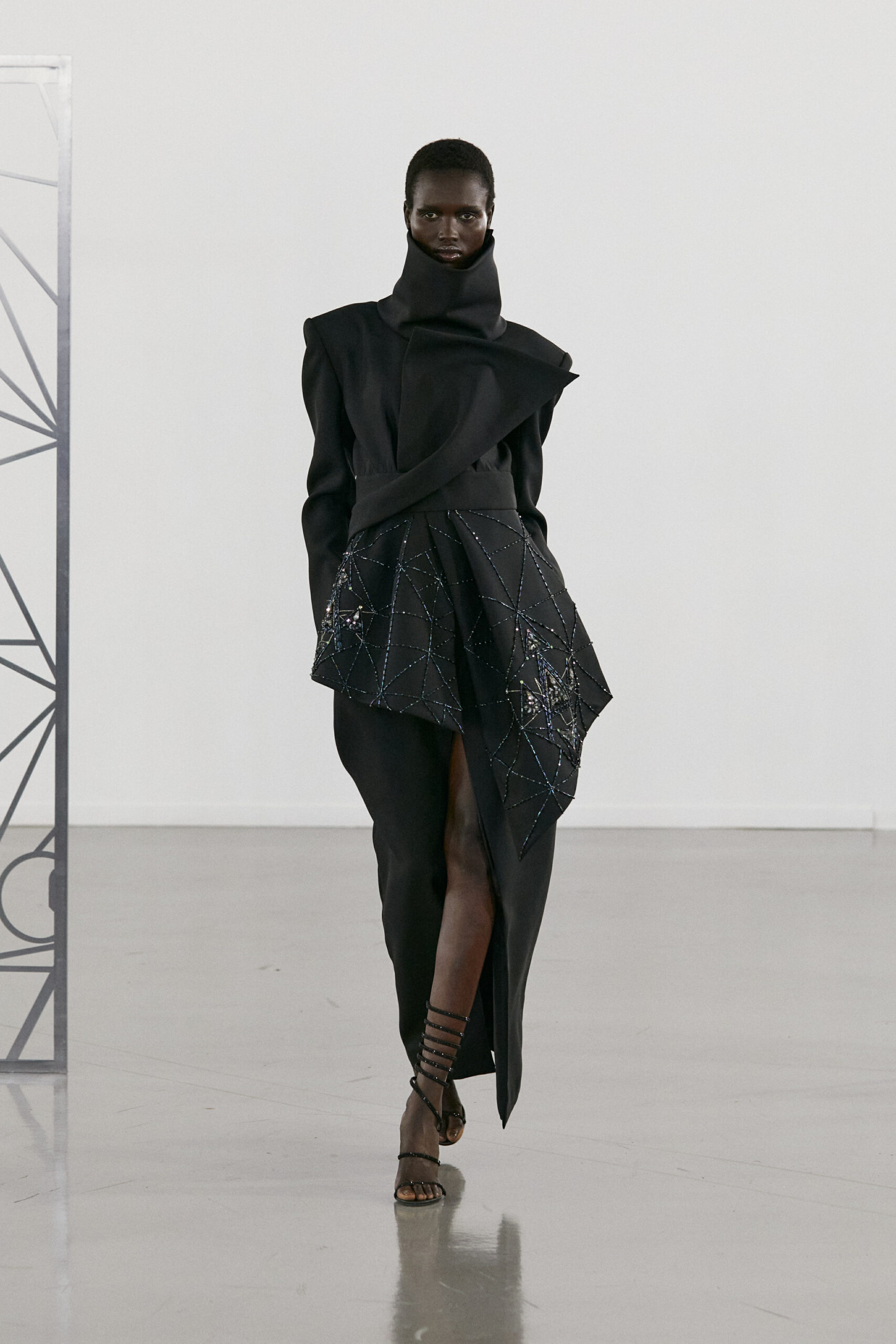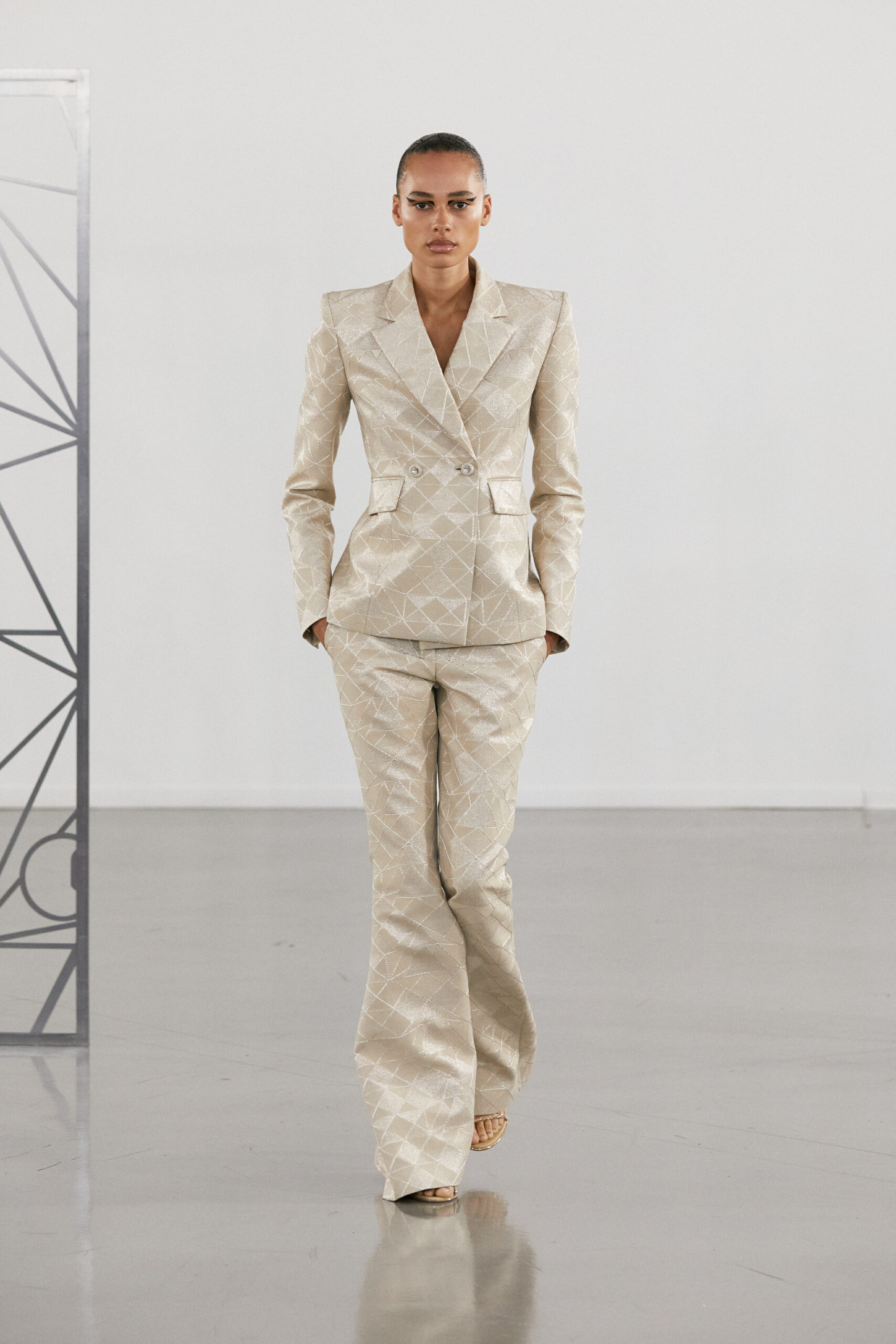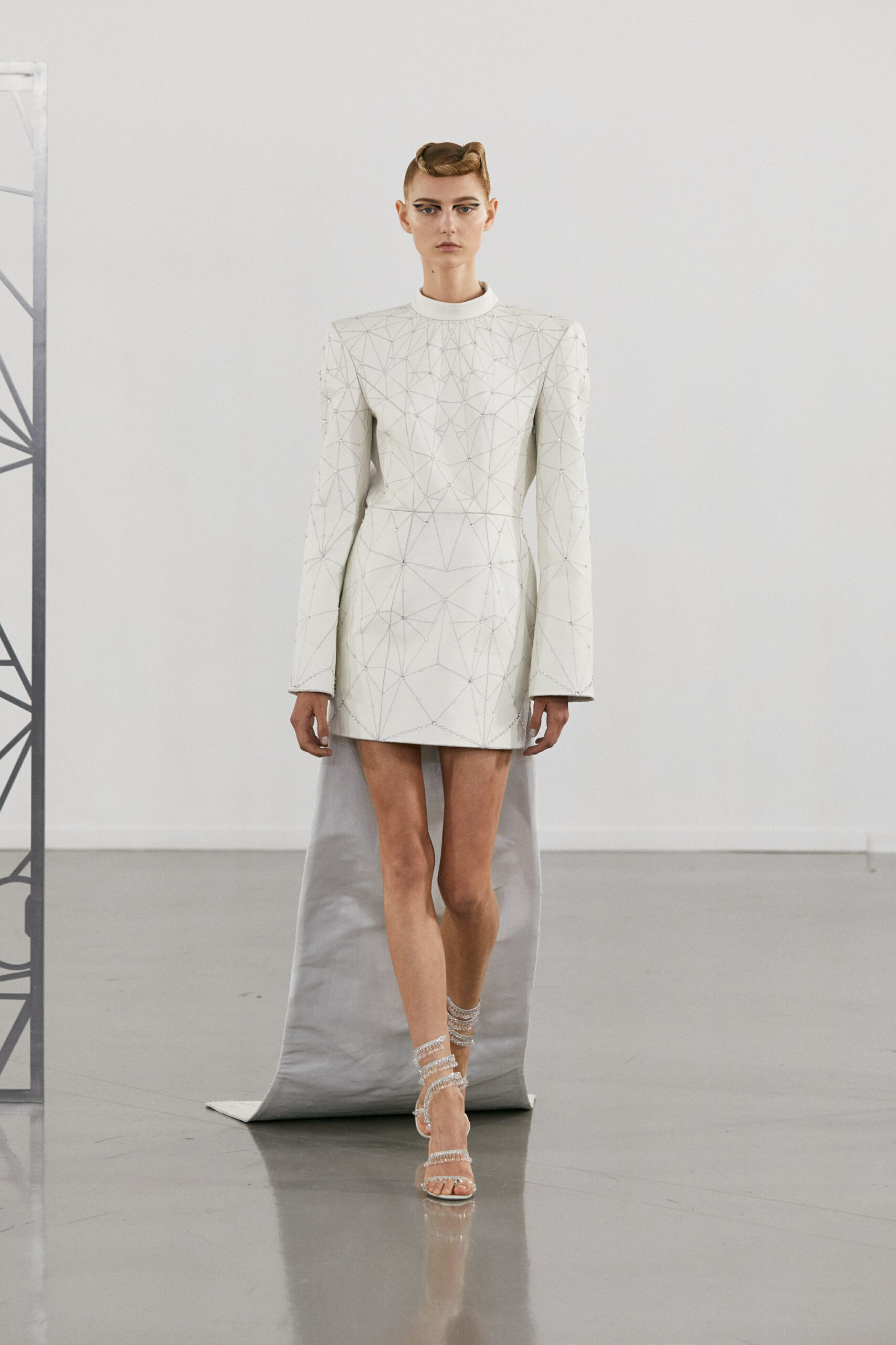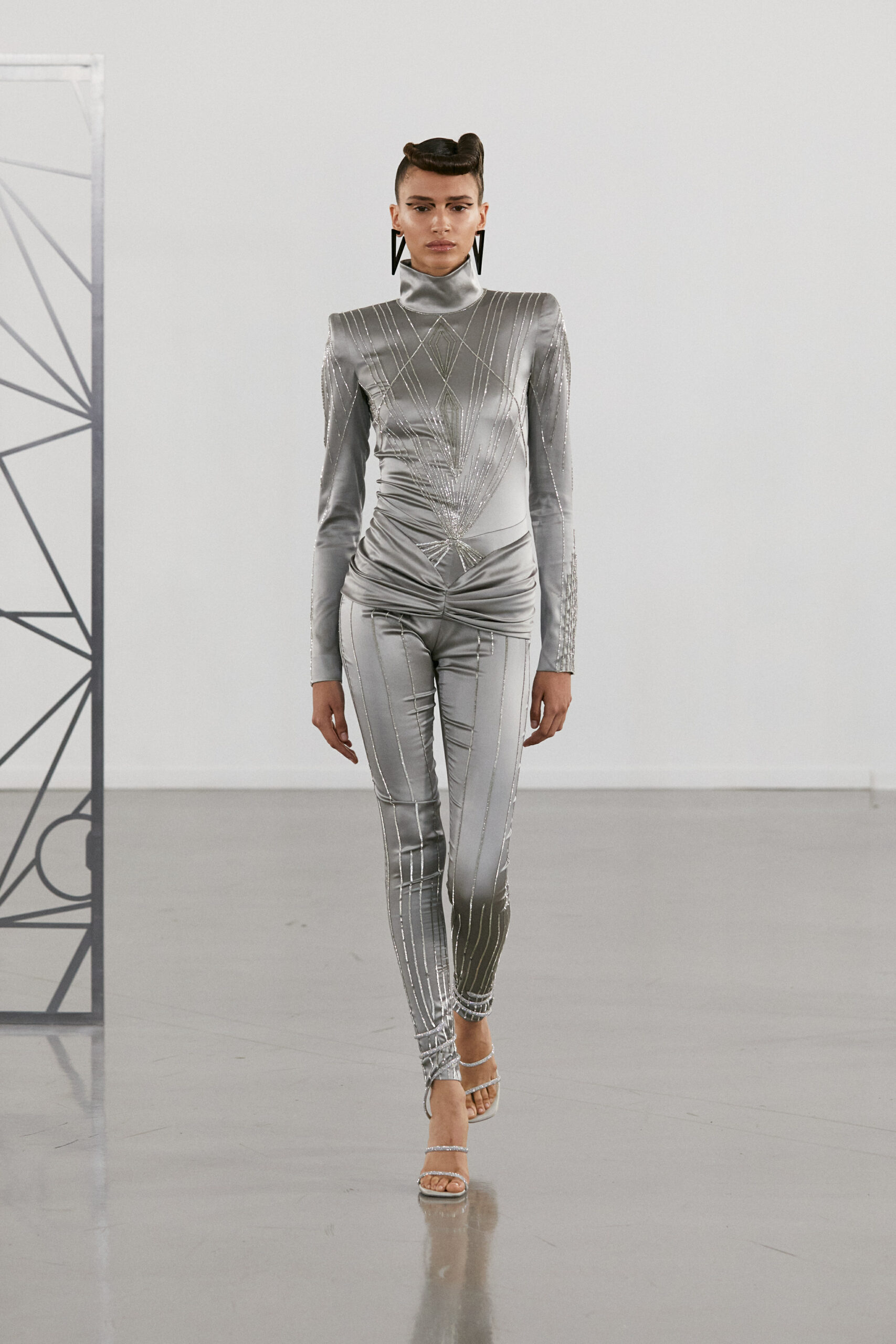 La géométrie est un thème récurrent. La robe « Vega », en soie fine, s’inspire d’un plafond orné de l’ancienne ville perse de Yazd, dont les mathématiques élaborées ont guidé la composition du plissé, de l’appliqué et de la broderie de perles, de sequins et de fils d’argent sur la robe. La collection présente également des tissus jacquard sur mesure, avec la structure atomique du minéral Béryl, appliquée à un costume impeccablement taillé et à une robe à longue traîne, tous deux découpés de manière géométrique pour créer la taille de pierre ArdAzAei.