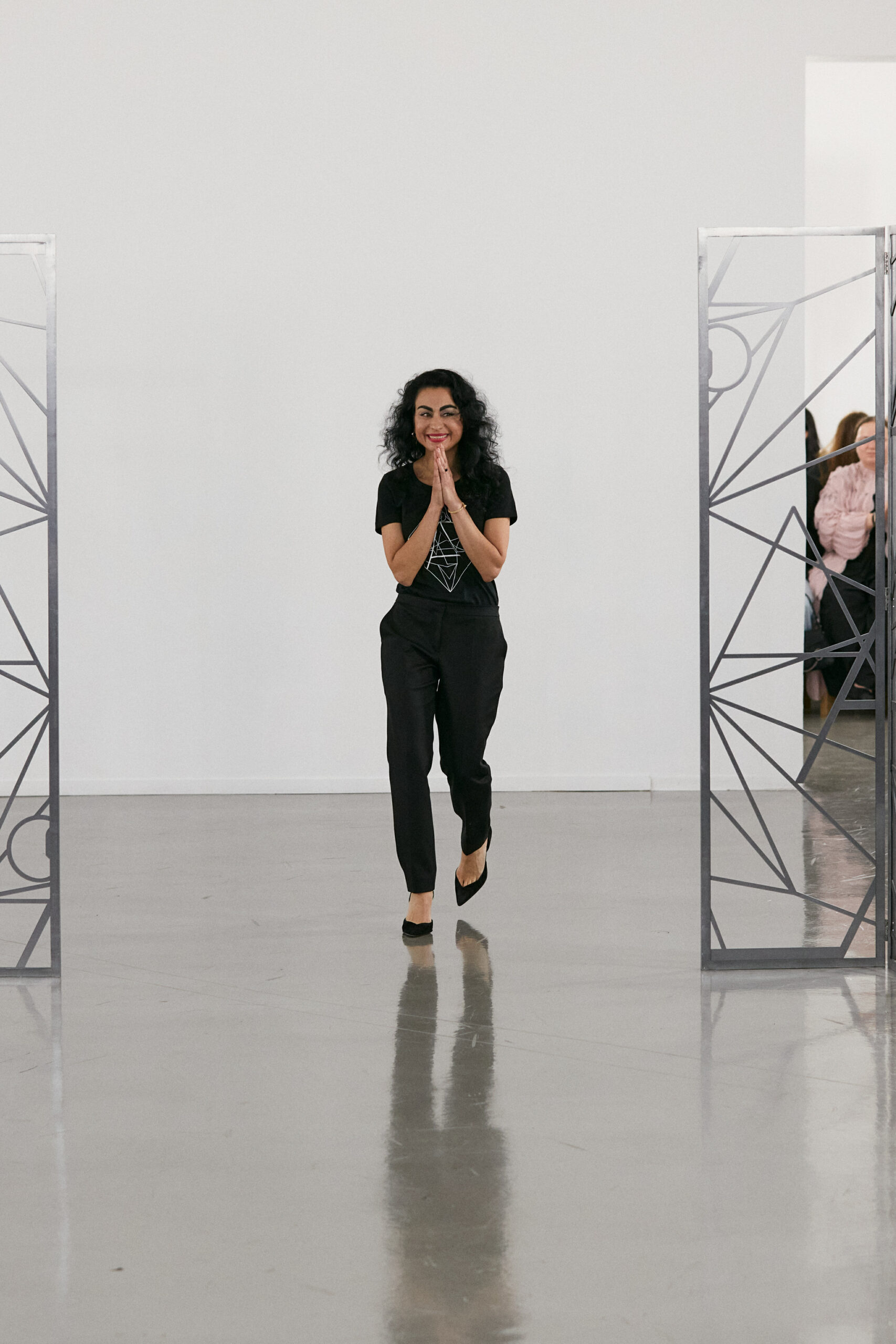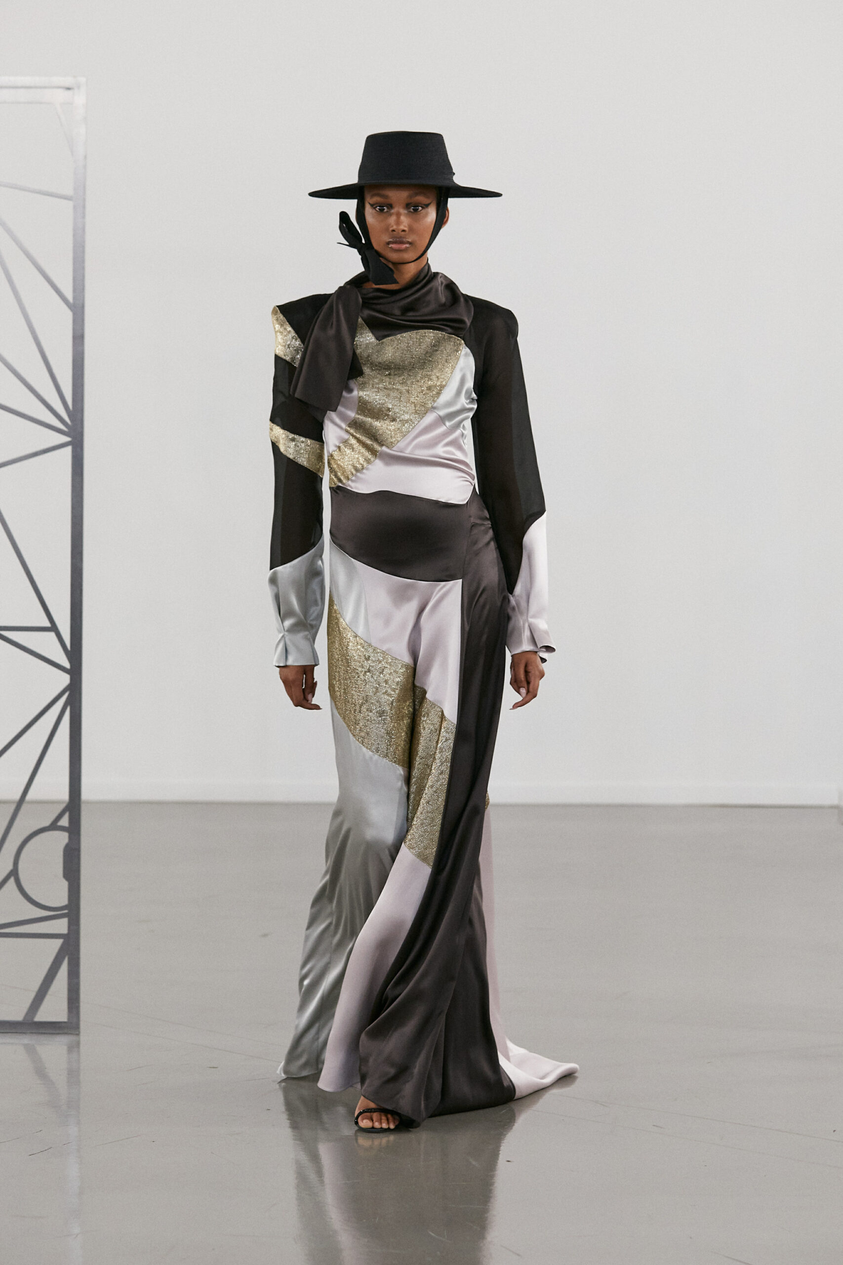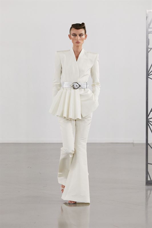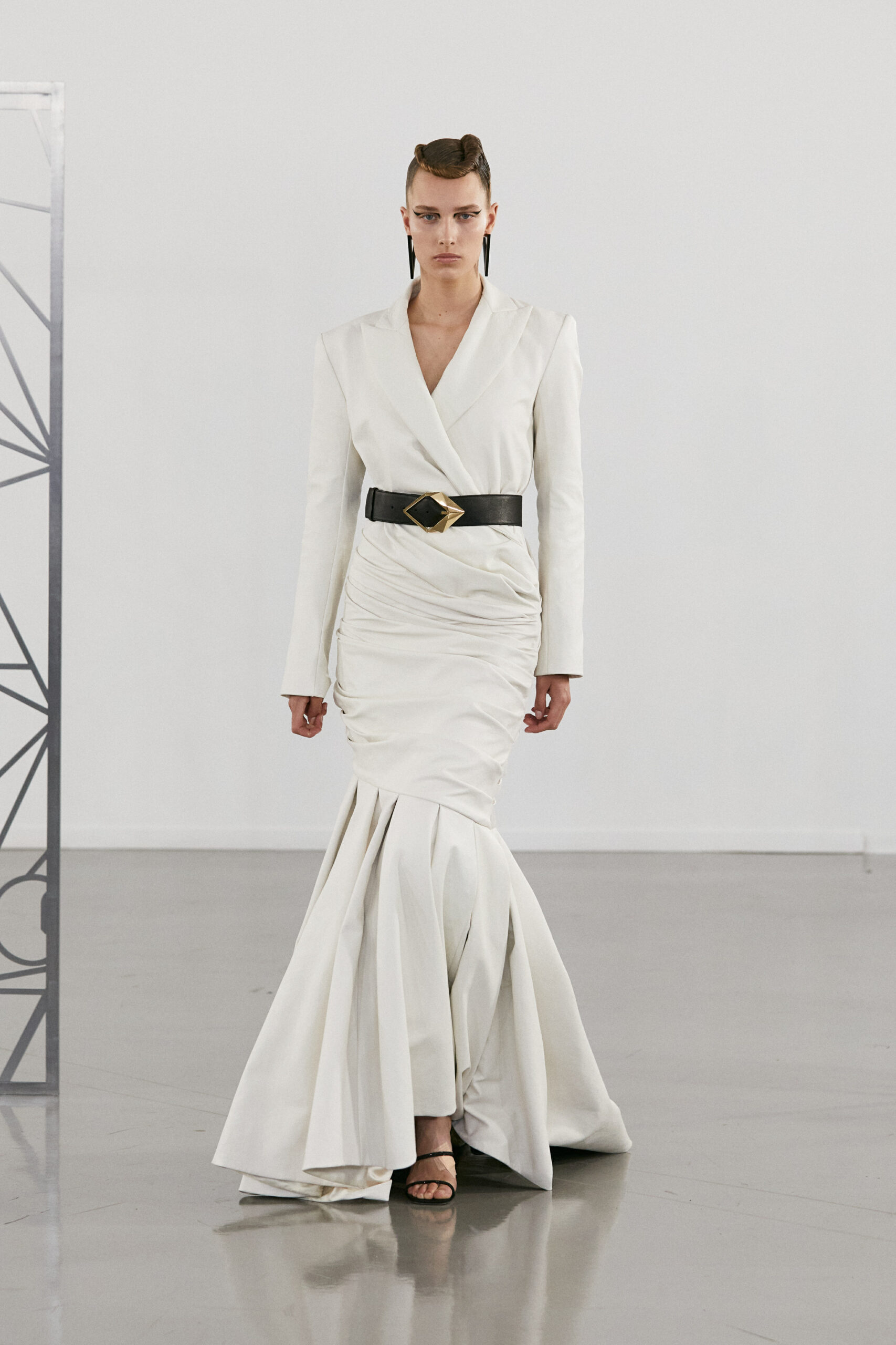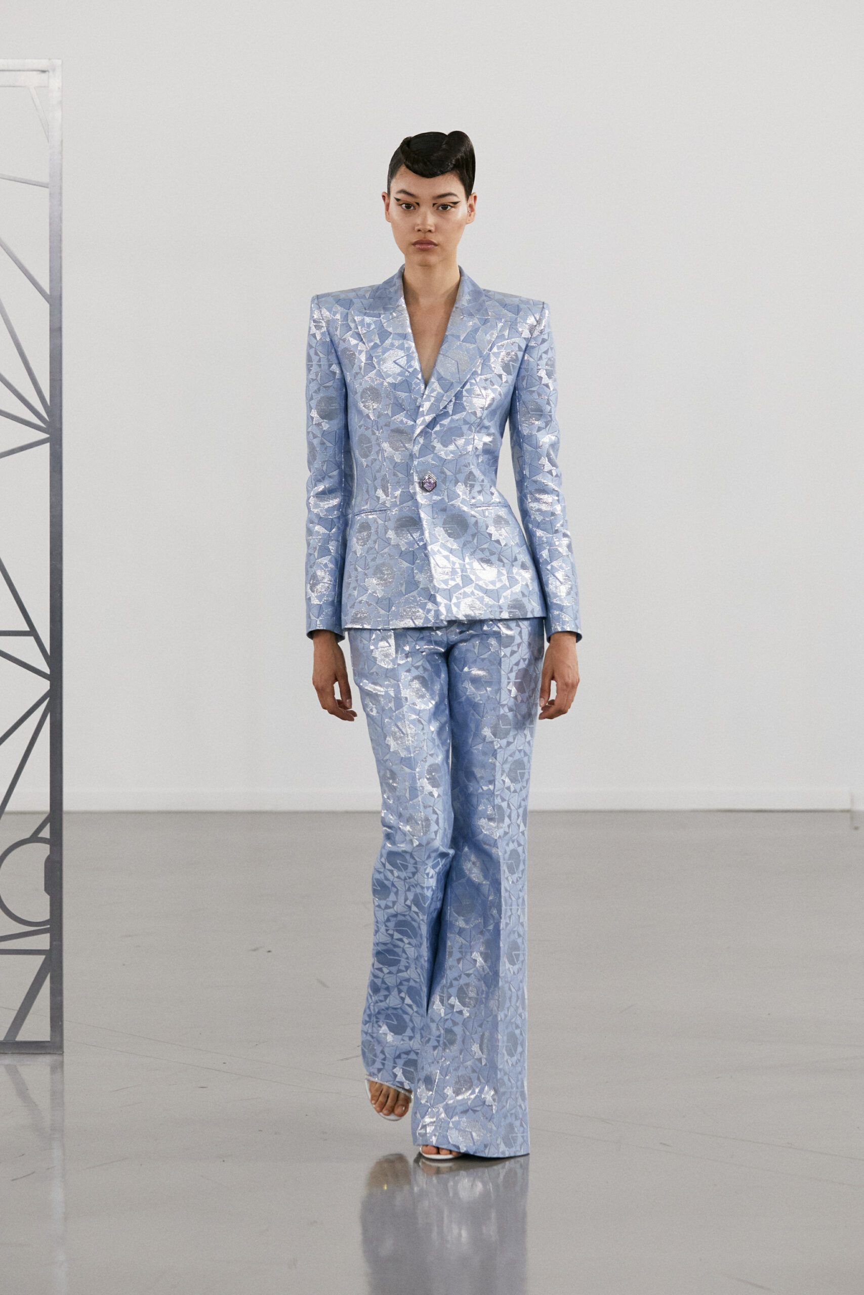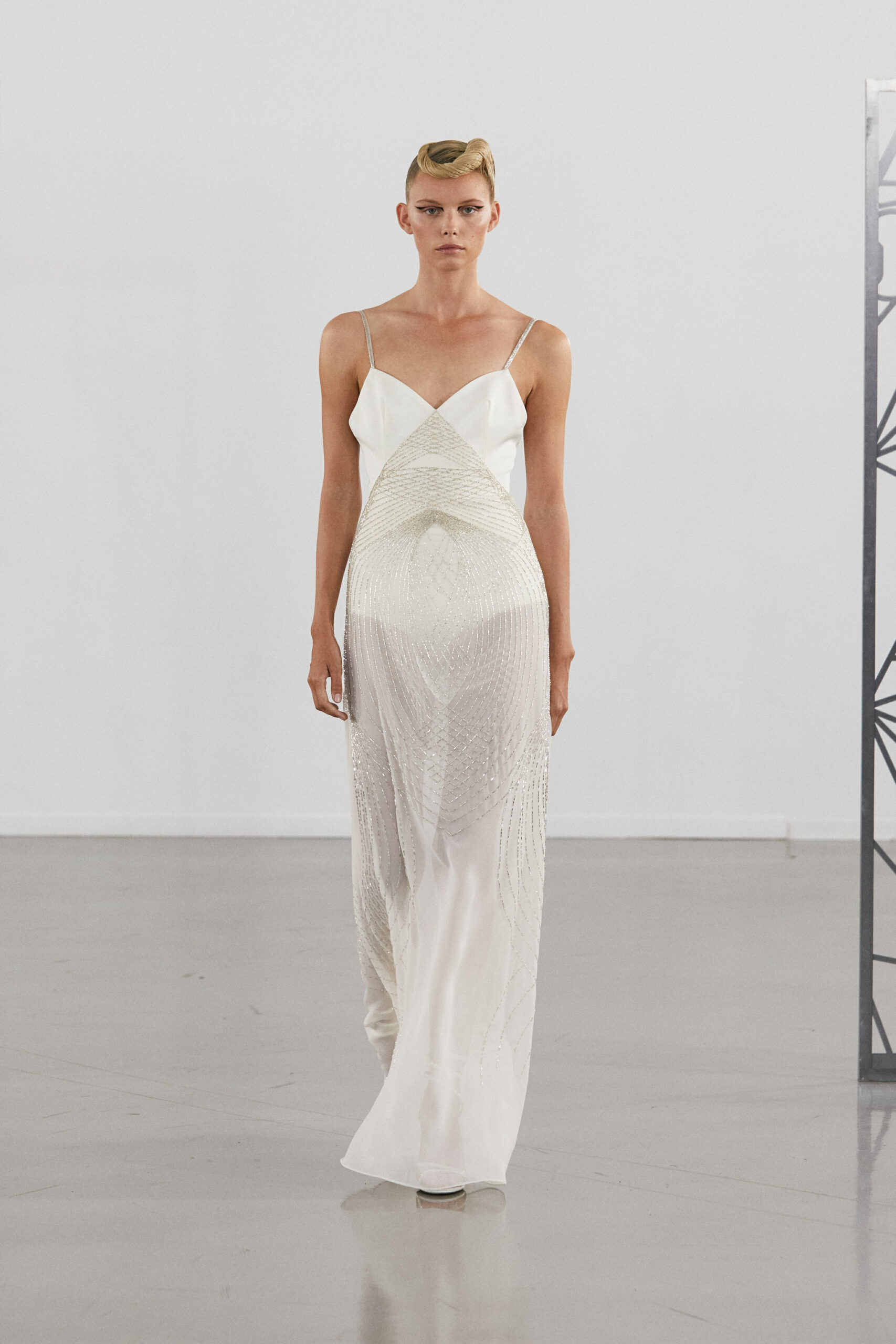 La géométrie est un thème récurrent. La robe « Vega », en soie fine, s’inspire d’un plafond orné de l’ancienne ville perse de Yazd, dont les mathématiques élaborées ont guidé la composition du plissé, de l’appliqué et de la broderie de perles, de sequins et de fils d’argent sur la robe. La collection présente également des tissus jacquard sur mesure, avec la structure atomique du minéral Béryl, appliquée à un costume impeccablement taillé et à une robe à longue traîne, tous deux découpés de manière géométrique pour créer la taille de pierre ArdAzAei.