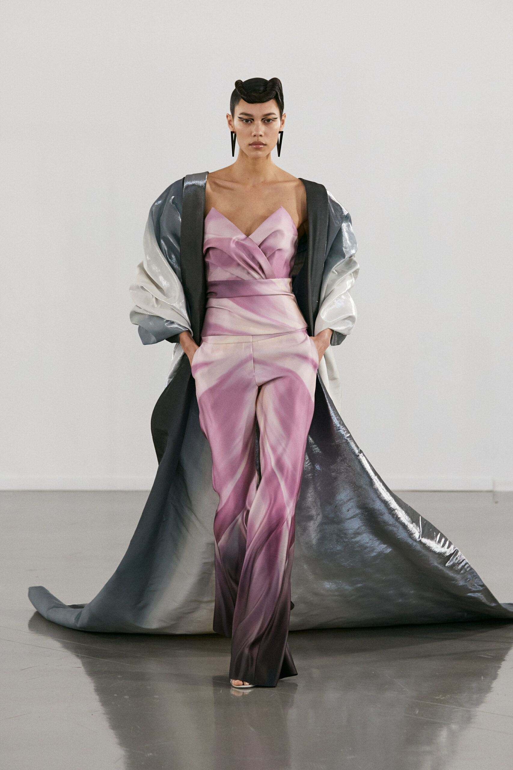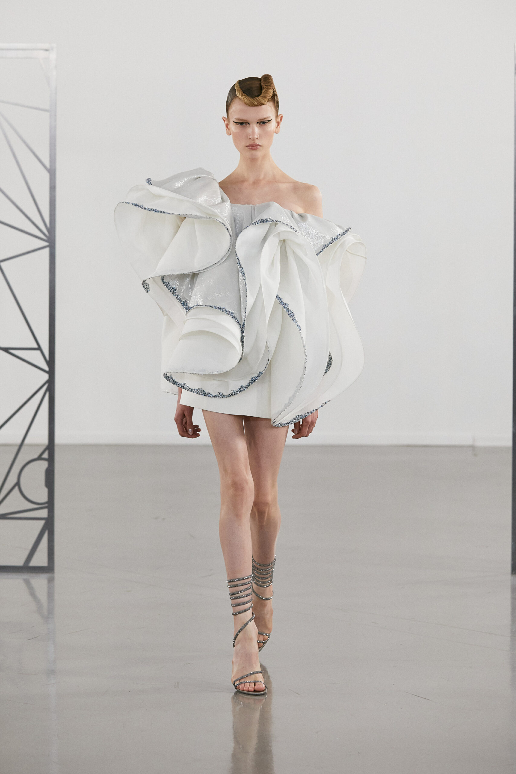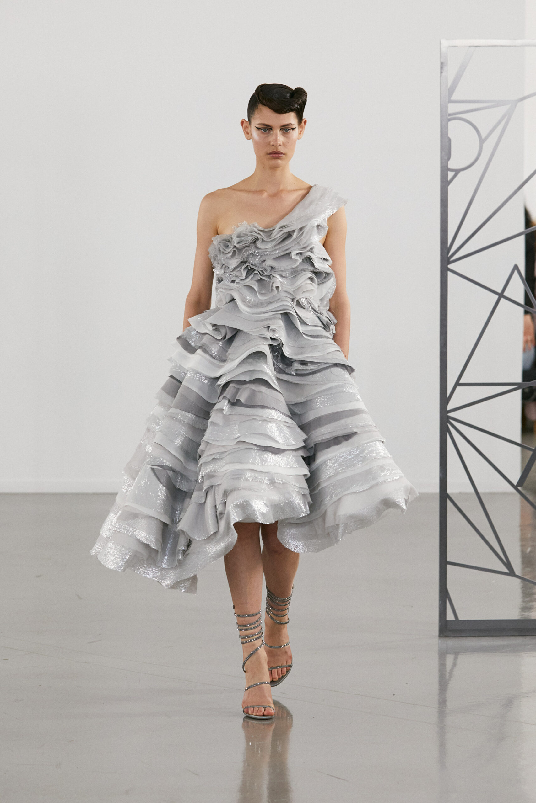 Les lignes asymétriques et les formes géométriques de la collection sont contrastées par un drapé doux et volumineux, comme on peut le voir dans la robe de soirée « June ». Créée avec plus de 850 heures de travail et 200 mètres de soie, elle est définie par ses couches légères de mousseline de soie, d’organza et de lurex argenté qui tourbillonnent gracieusement autour du corps.