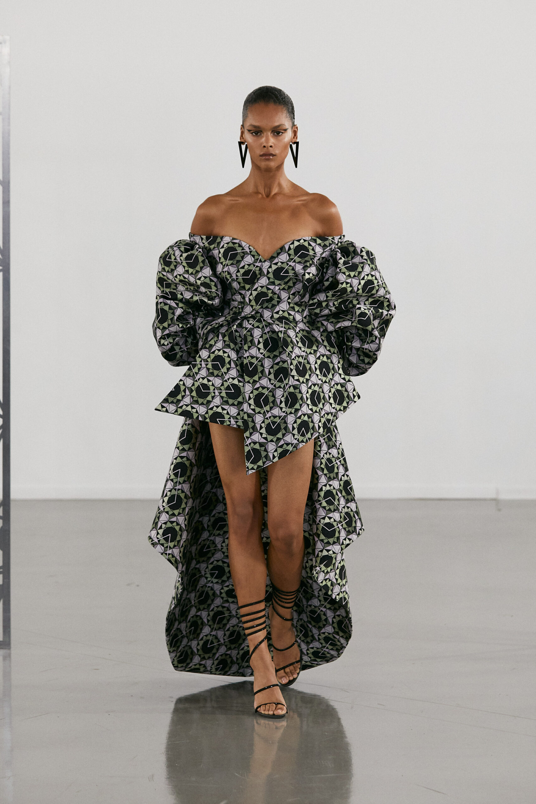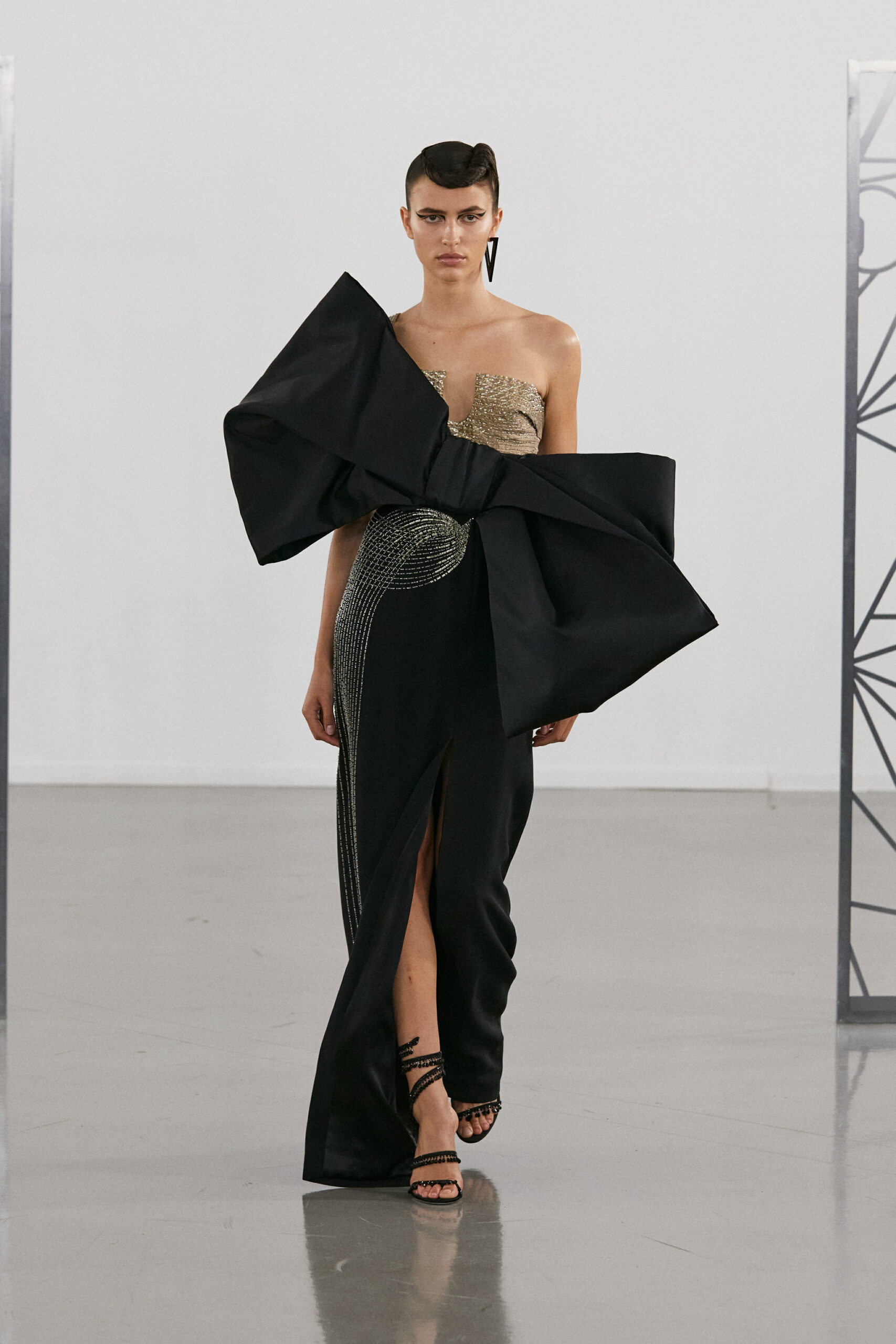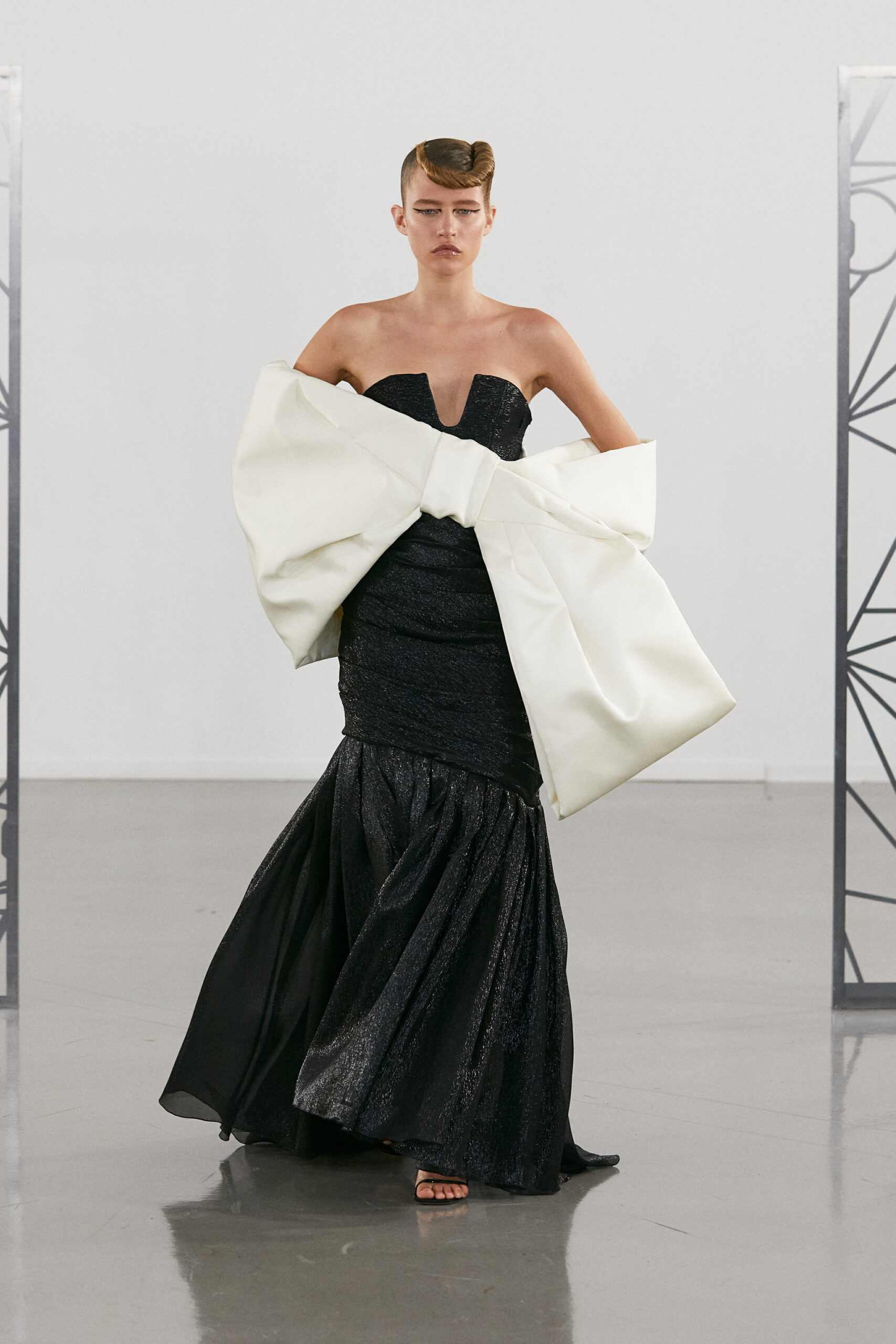 Les lignes asymétriques et les formes géométriques de la collection sont contrastées par un drapé doux et volumineux, comme on peut le voir dans la robe de soirée « June ». Créée avec plus de 850 heures de travail et 200 mètres de soie, elle est définie par ses couches légères de mousseline de soie, d’organza et de lurex argenté qui tourbillonnent gracieusement autour du corps.