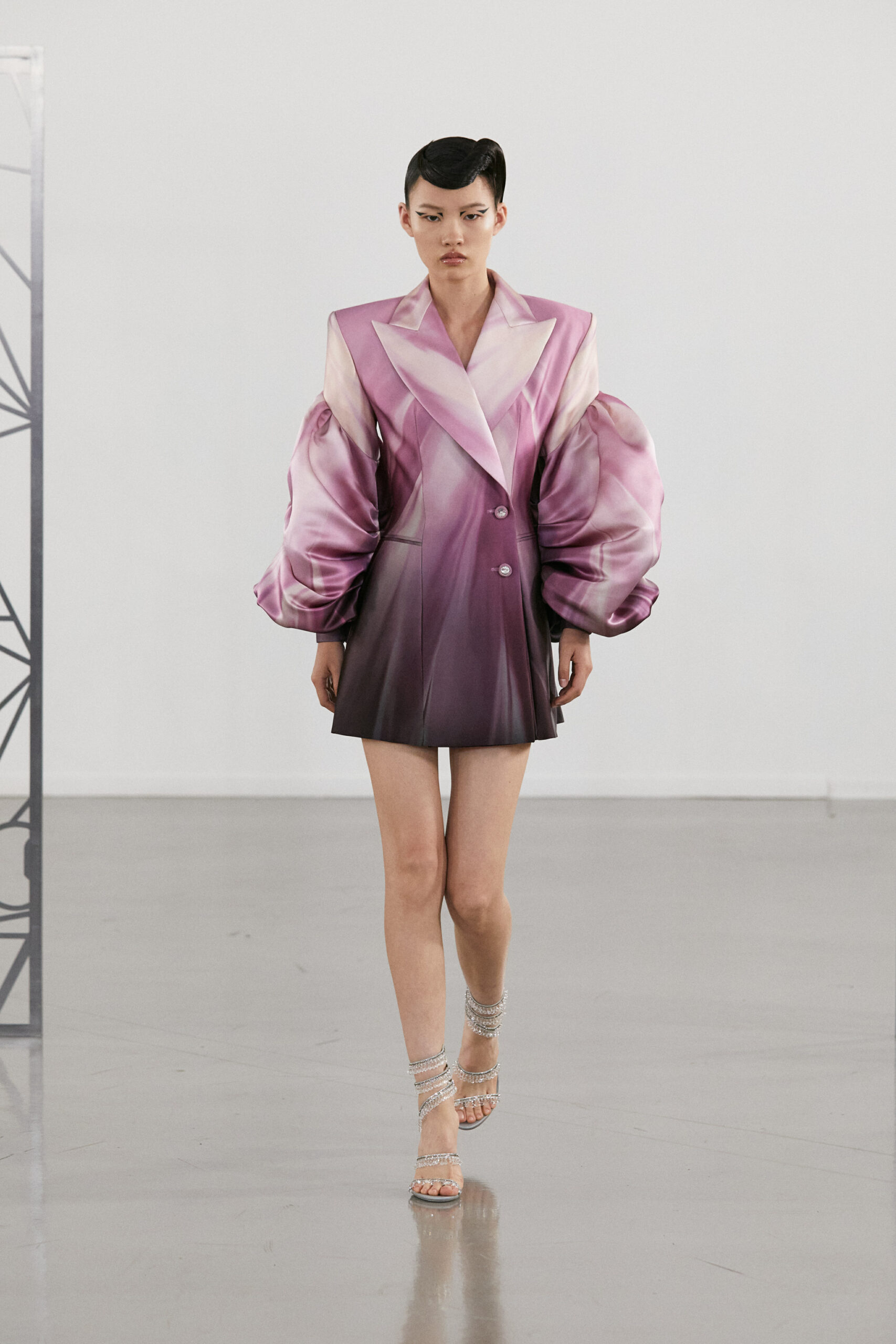 Un véritable hymne à la luminescence, La Diffraction de la Lumière dévoile une variété de textiles sur-mesure qui mettent en évidence le jeu de la lumière sur le tissu, délicatement plissé et drapé autour de silhouettes inspirées de la géométrie des gemmes et des motifs stupéfiants qui émergent lorsque la lumière les traverse.
