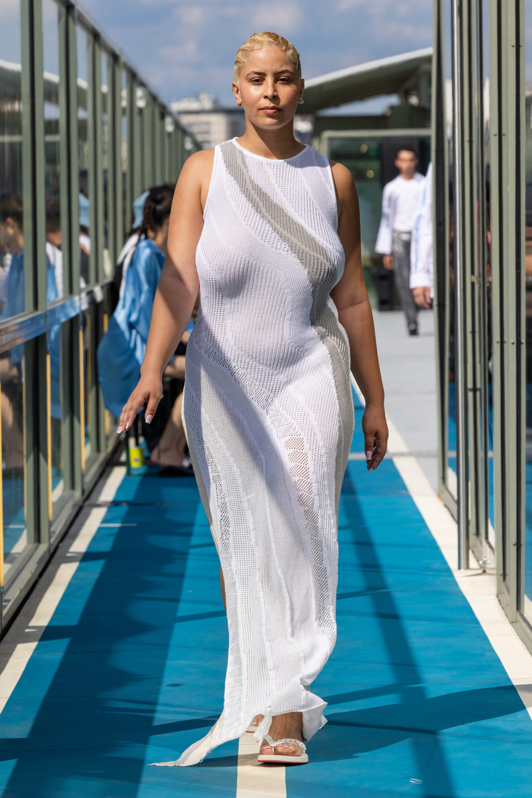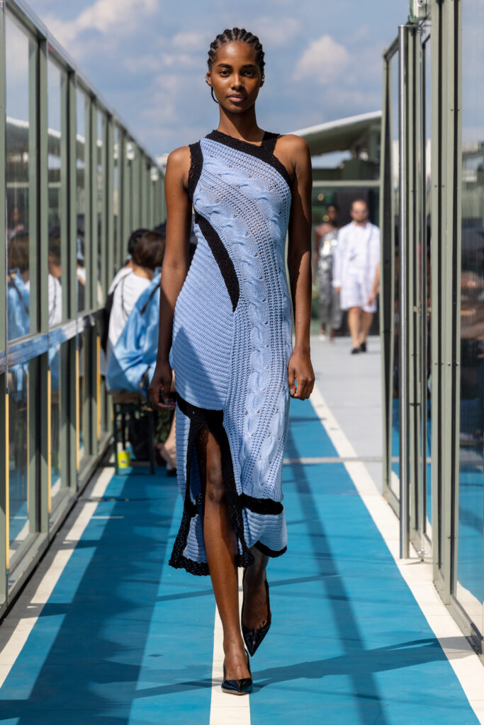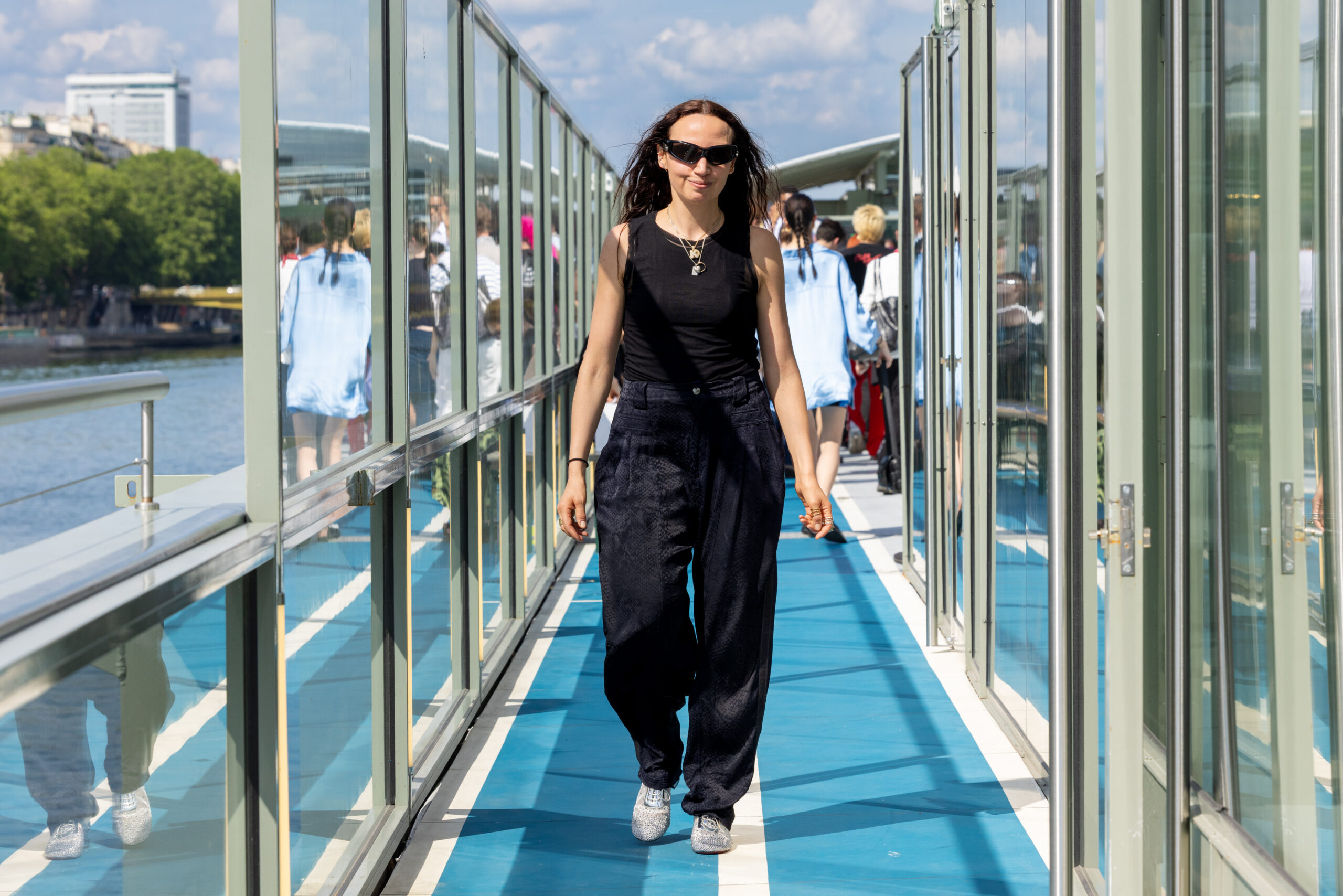 Le défilé s’est déroulé sur une barge immense à l’entrée de Paris, offrant une vue pittoresque où se mélangent eau, végétation, architecture concrète et transport en commun. Ce point de vue représente parfaitement Paris à la croisée d’influences multiples, un mélange subtil entre tradition et modernité.