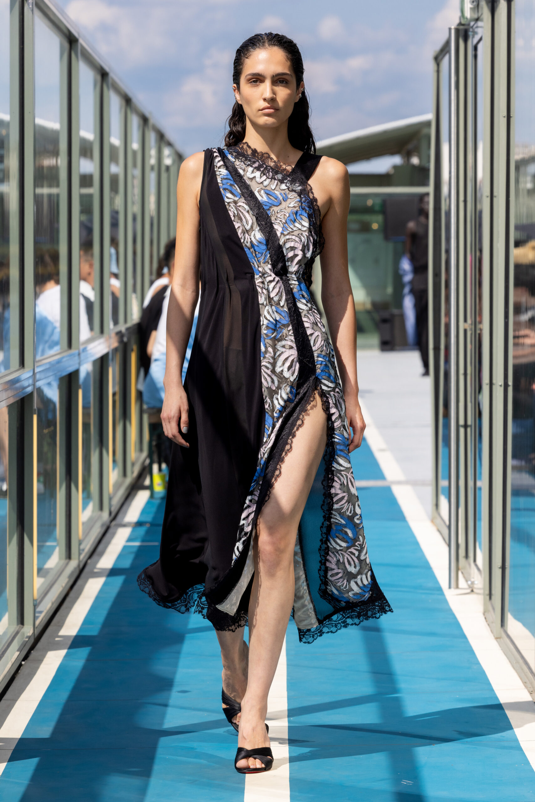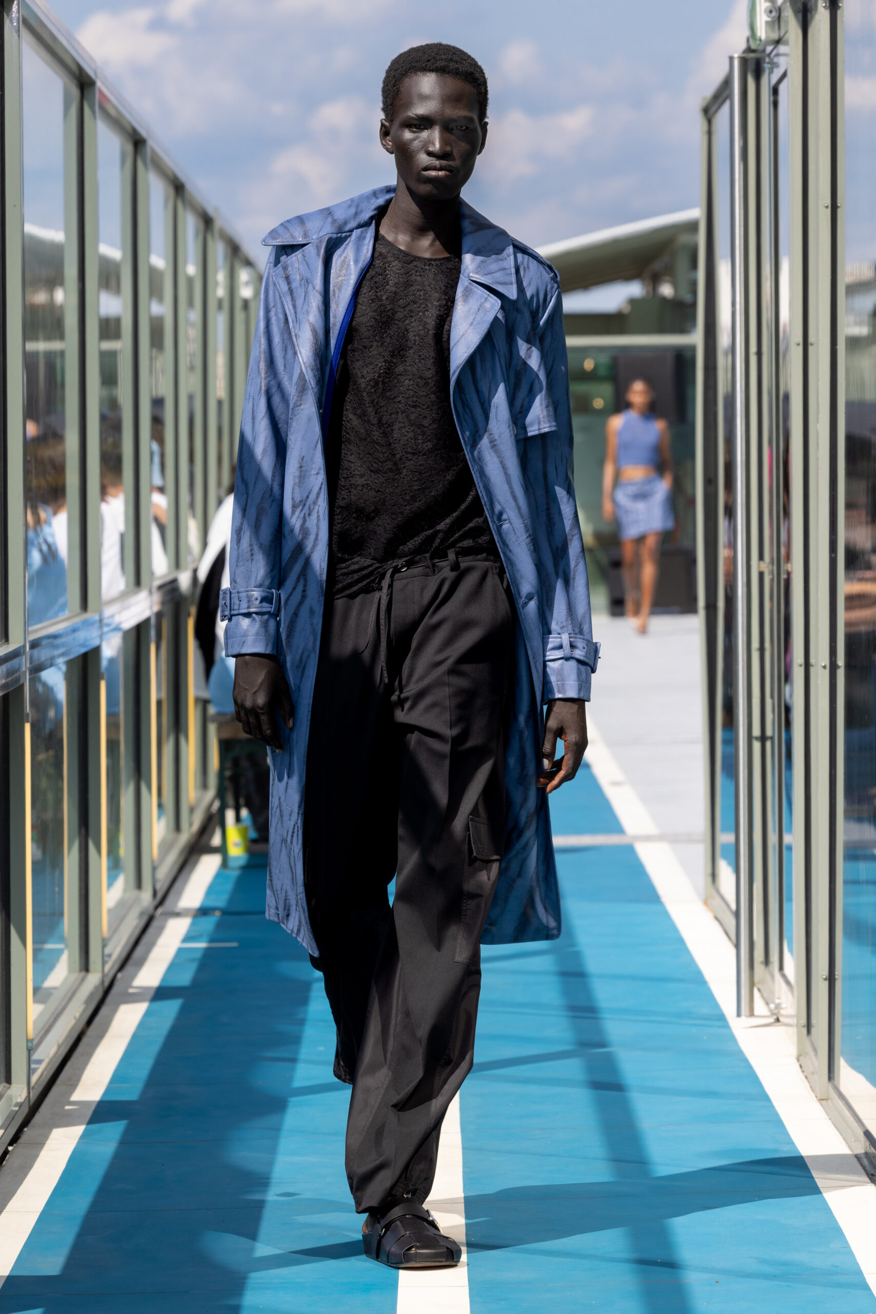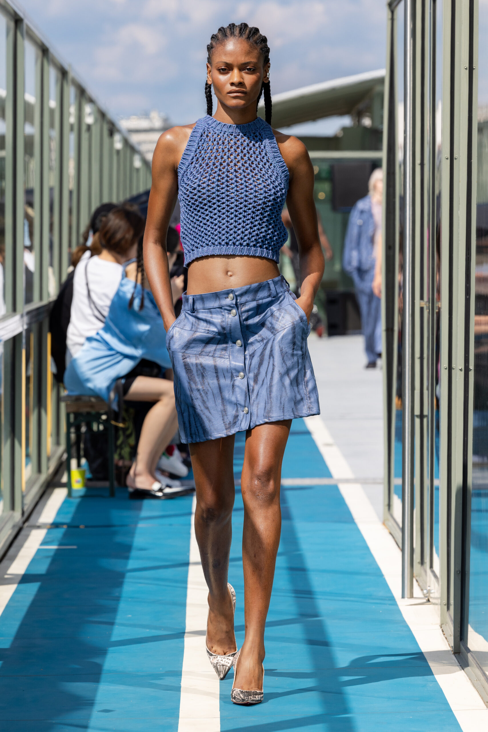 Le défilé s’est déroulé sur une barge immense à l’entrée de Paris, offrant une vue pittoresque où se mélangent eau, végétation, architecture concrète et transport en commun. Ce point de vue représente parfaitement Paris à la croisée d’influences multiples, un mélange subtil entre tradition et modernité.