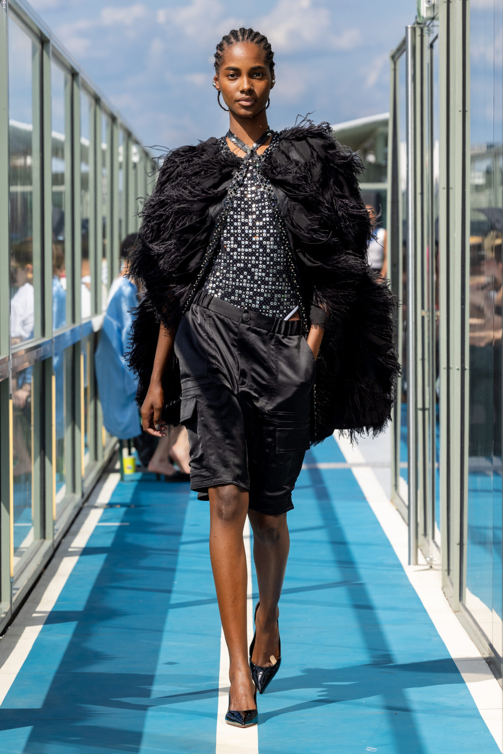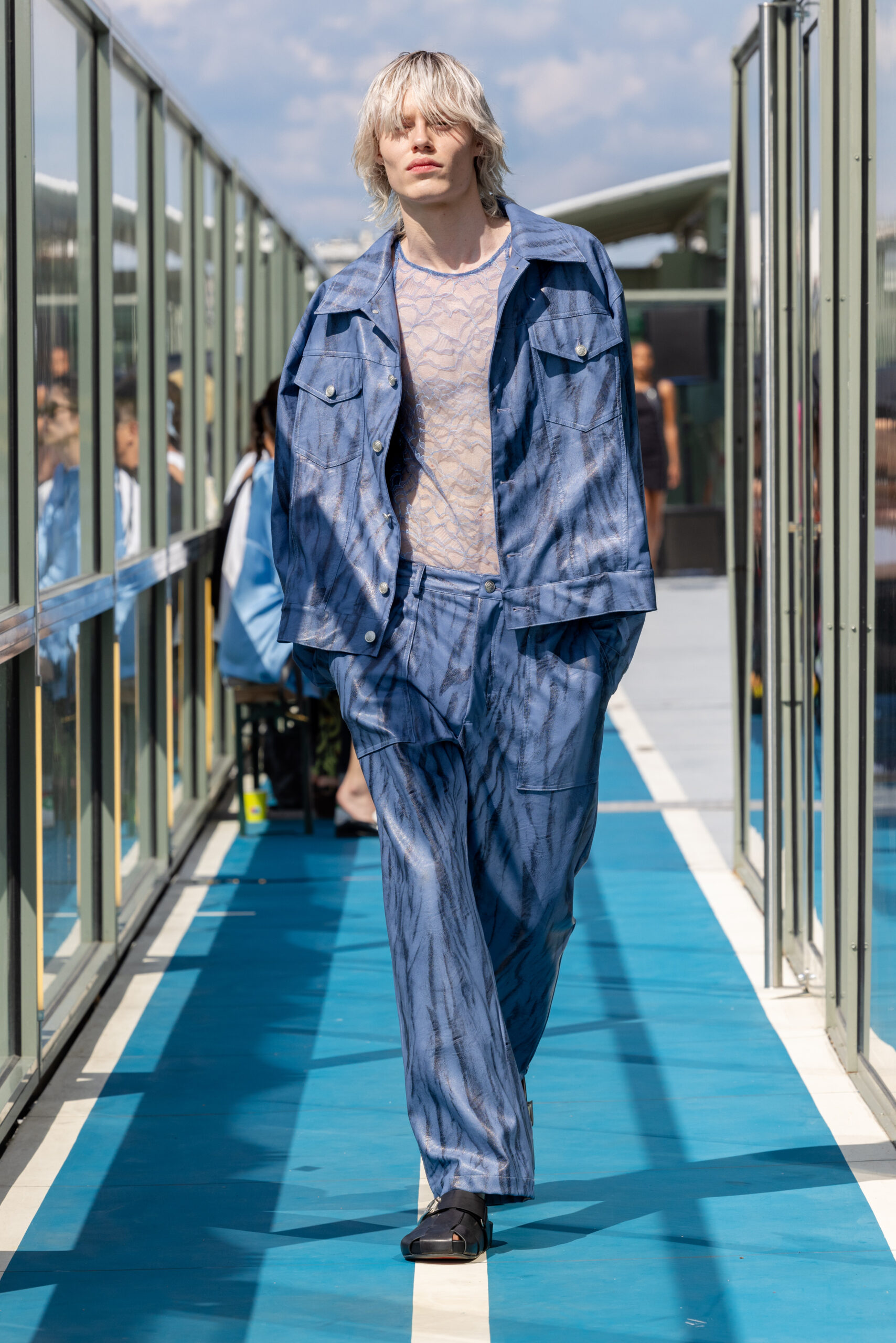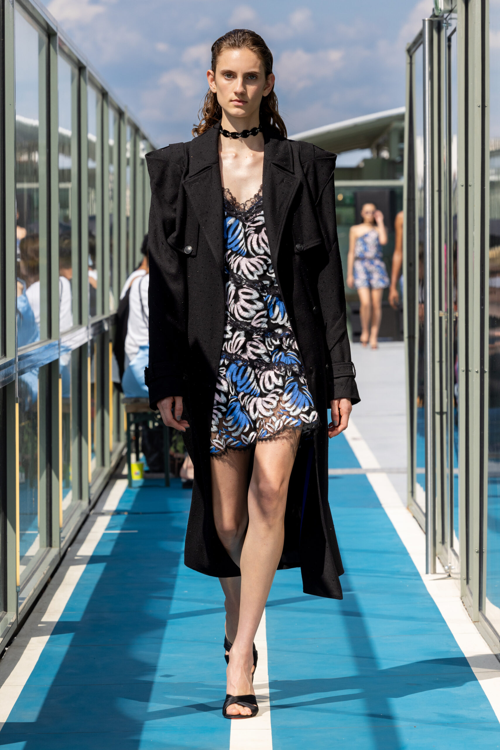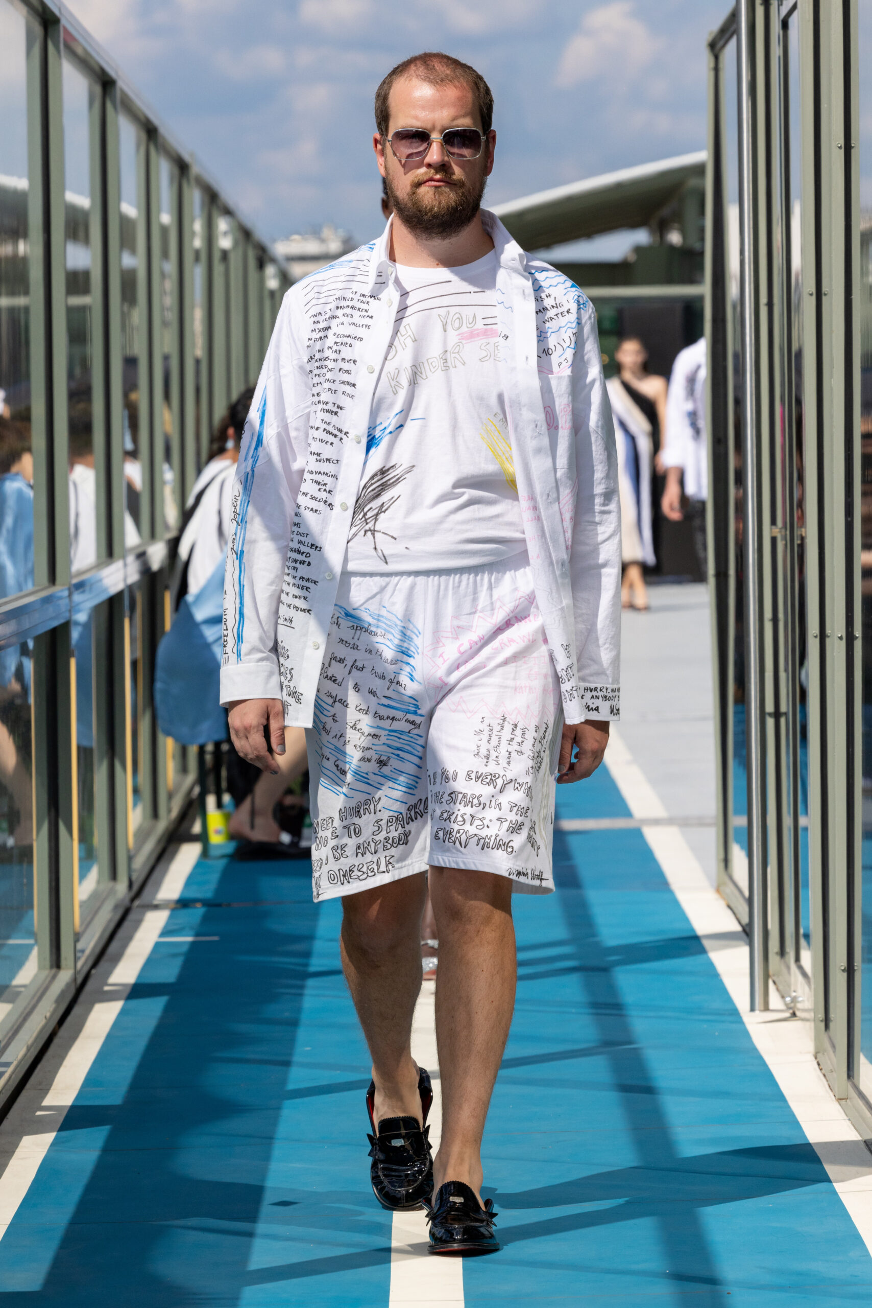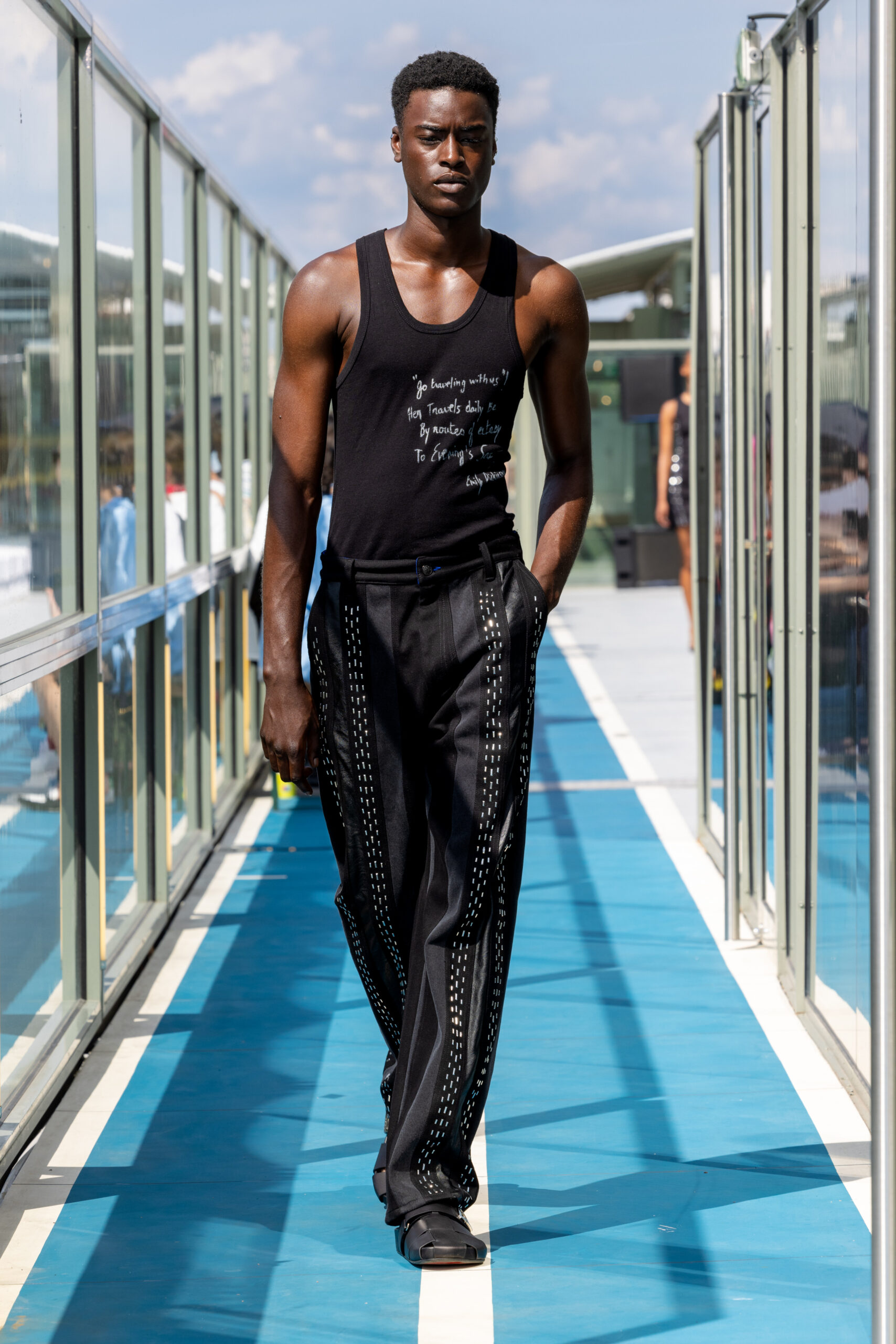 L’ode à la féminité et au masculin, à la délicatesse et à la vulnérabilité, traverse la collection. Des motifs de chemises et shorts peints à la main par Christelle elle-même, avec des citations d’artistes féminines telles Patti Smith, Virginie Despentes, et Virginia Woolf, sont portés par des garçons. KOCHÉ joue avec les matières stretch, en les mariant aux broderies les plus spectaculaires développées dans le studio parisien de la marque.