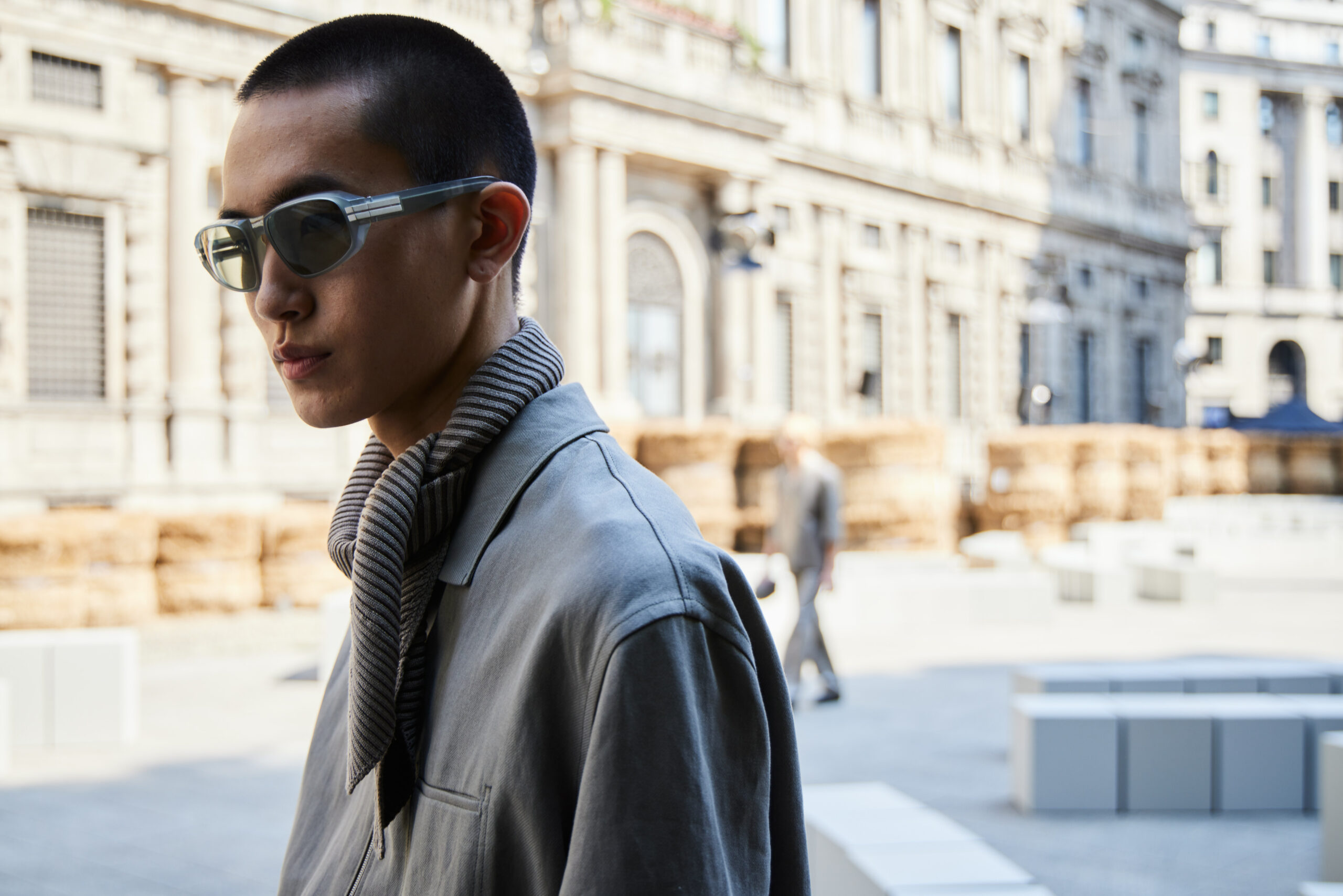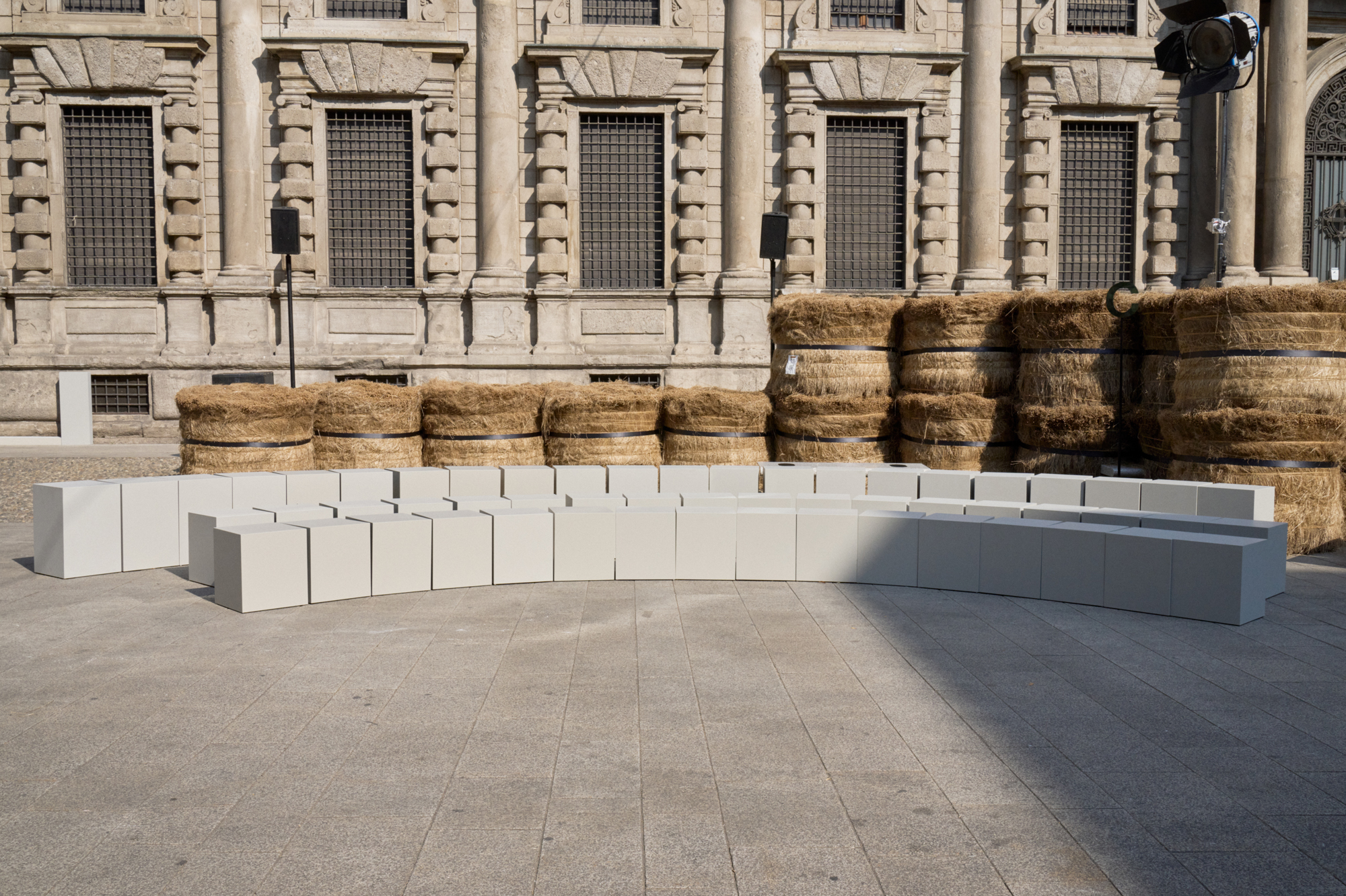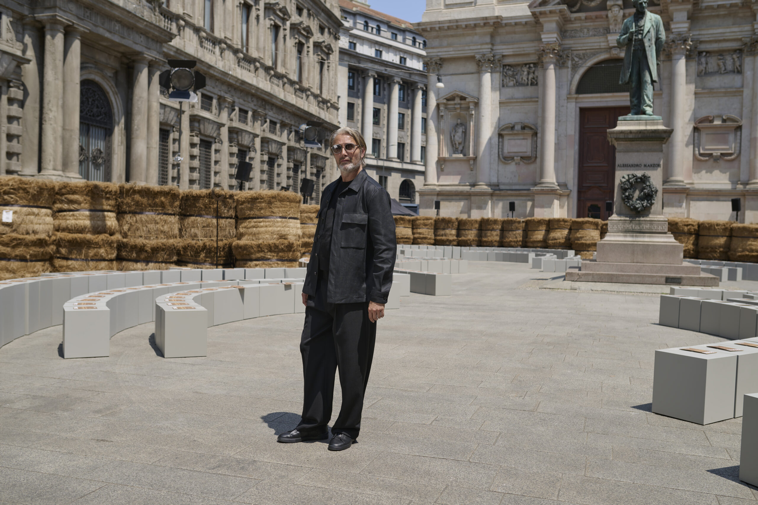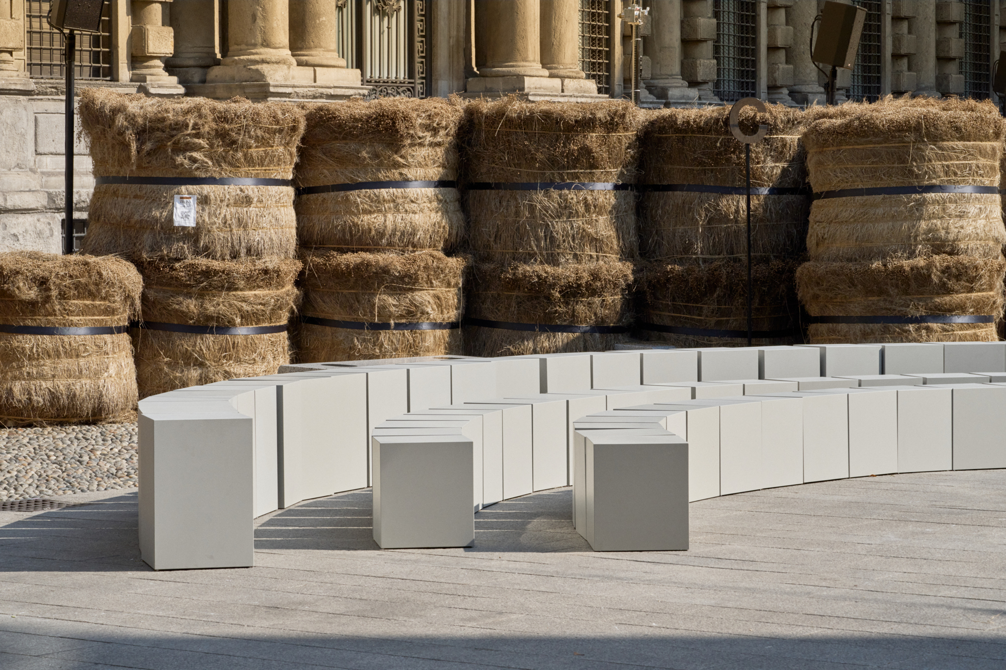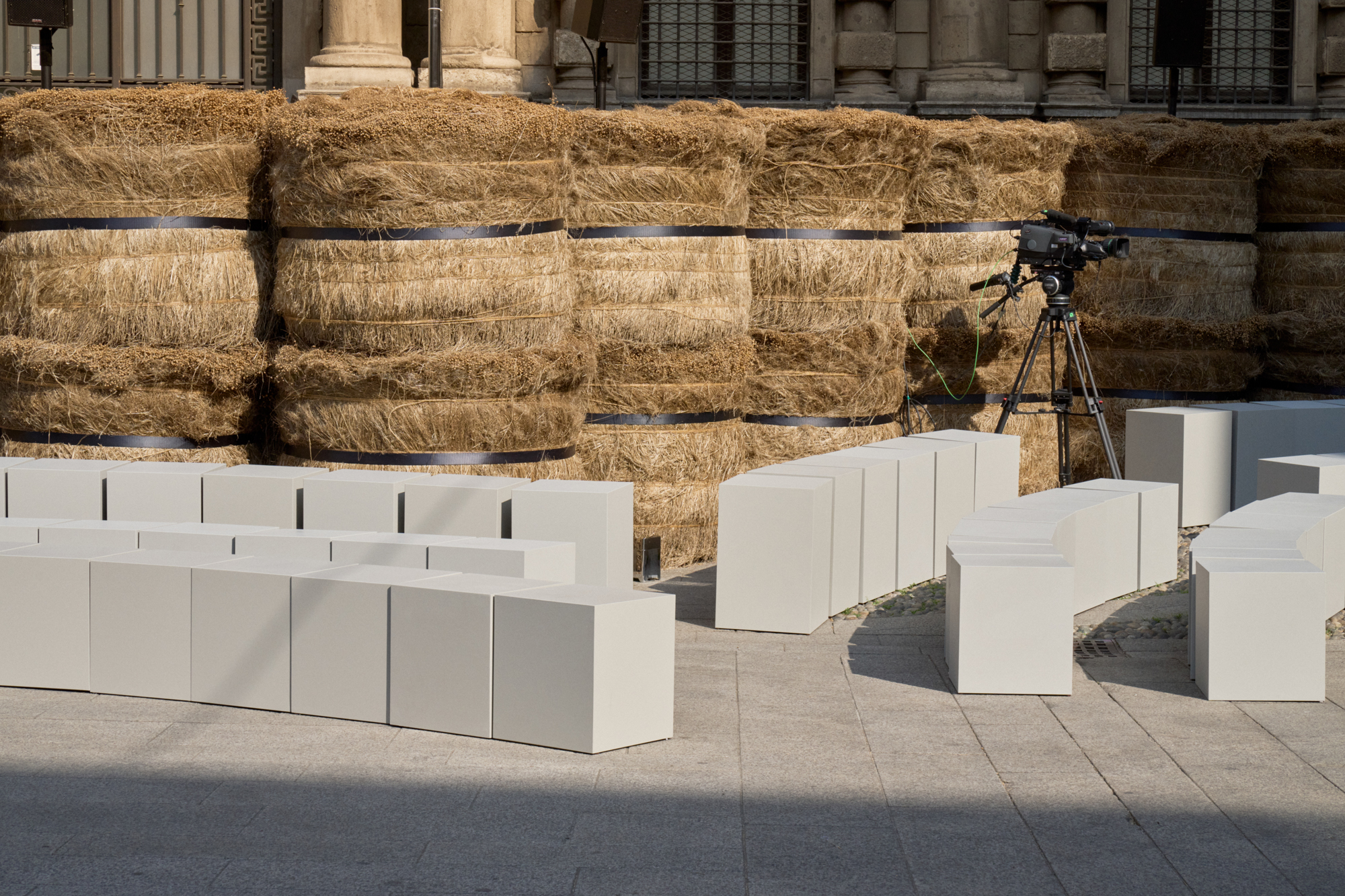 As the revolving center and the ever-evolving mindset that collects and activates everything ZEGNA stands for, Oasi Zegna represents a quest for excellence and beauty with a responsible commitment that is not static. It travels, in fact: across space and craft, near and far. The Fashion Show today introduces an oasis in Milan, among 192 bales of raw linen that occupy a square in the centre of Milano, on a backdrop of historic buildings, in broad daylight.. The bales have been transported from Normandy, where flax is grown with its blue flowers that bloom for just a single day brief moment in early summer and will re-enter the production chain once the show is over, to be crafted in Italy into Oasi Lino. The dream of nature in a metropolitan context, and the circular values it conveys, becomes tangible. ZEGNA commits to certifying Oasi Lino fibres as 100% traceable by 2024.