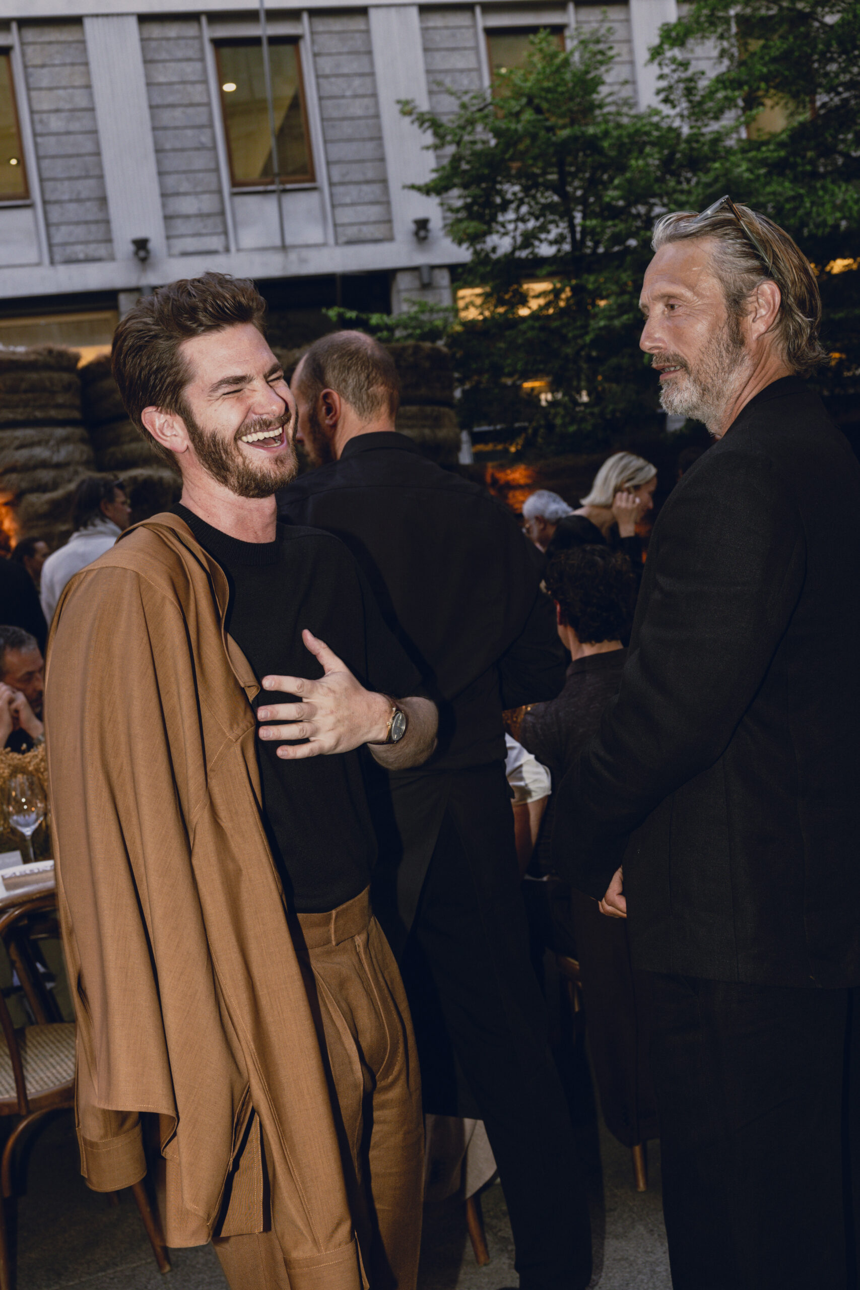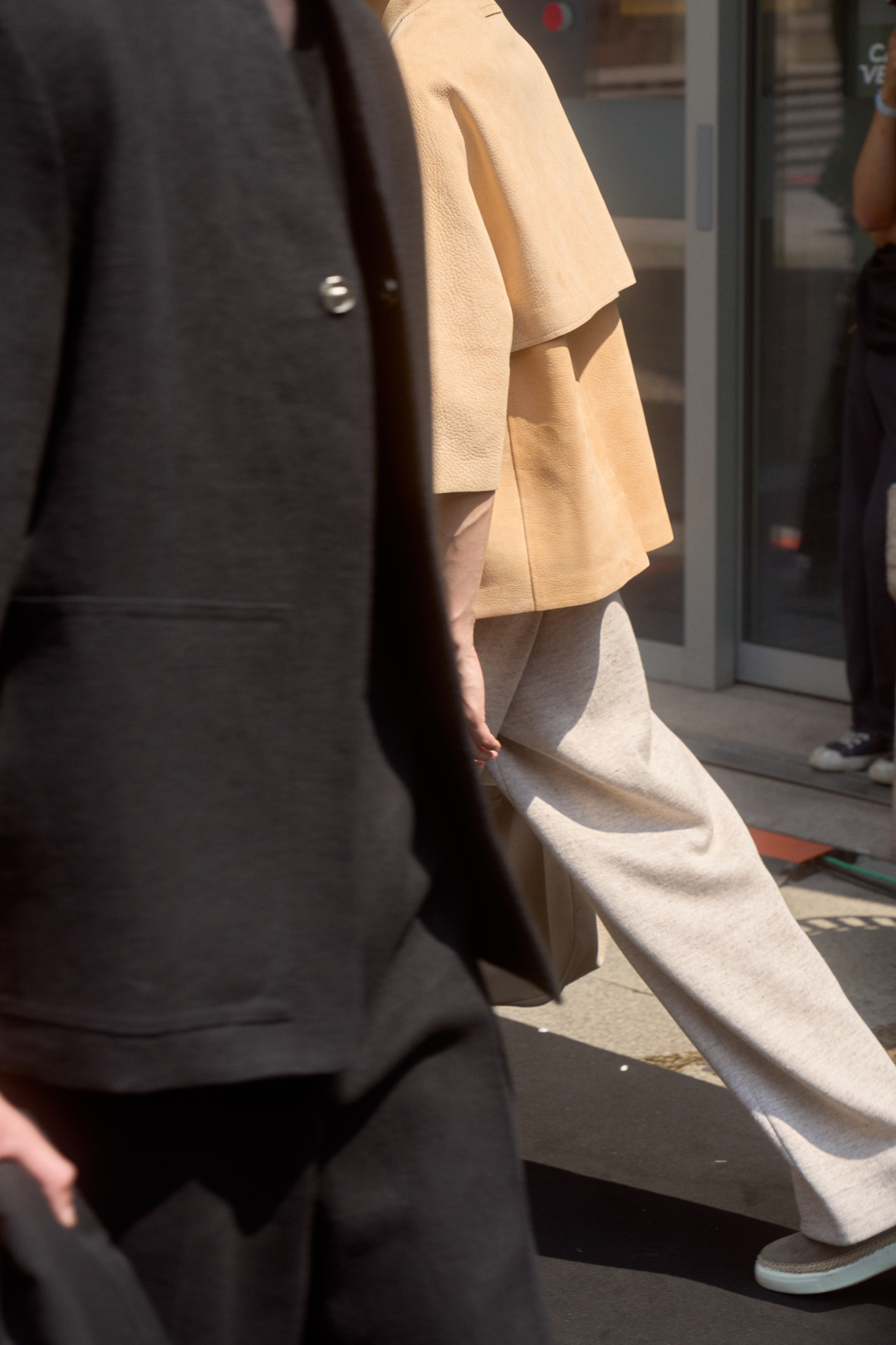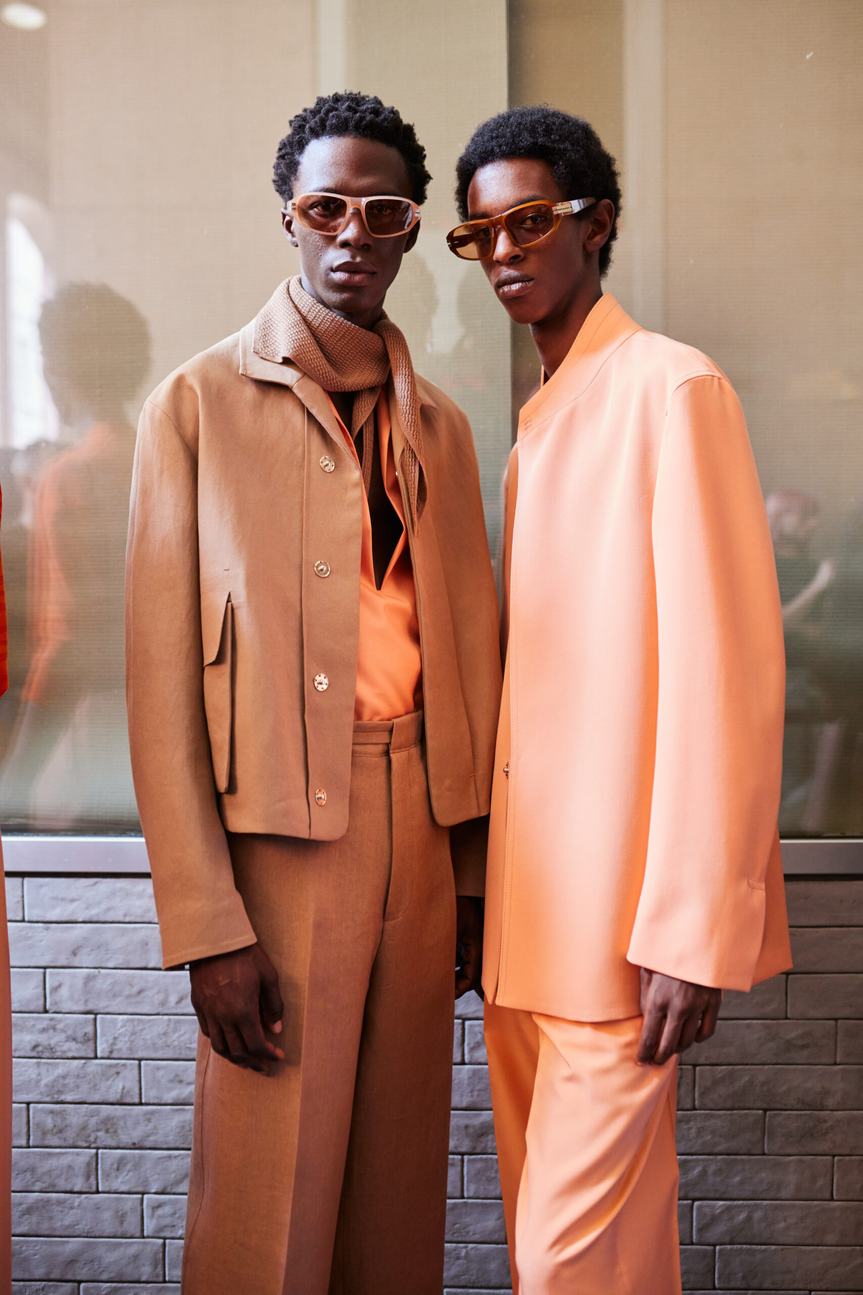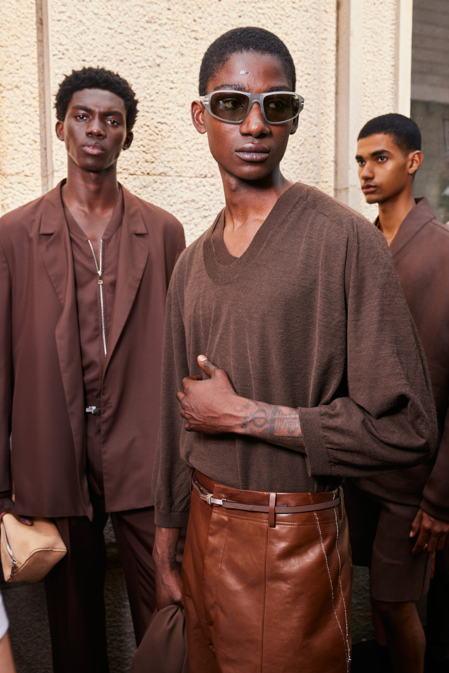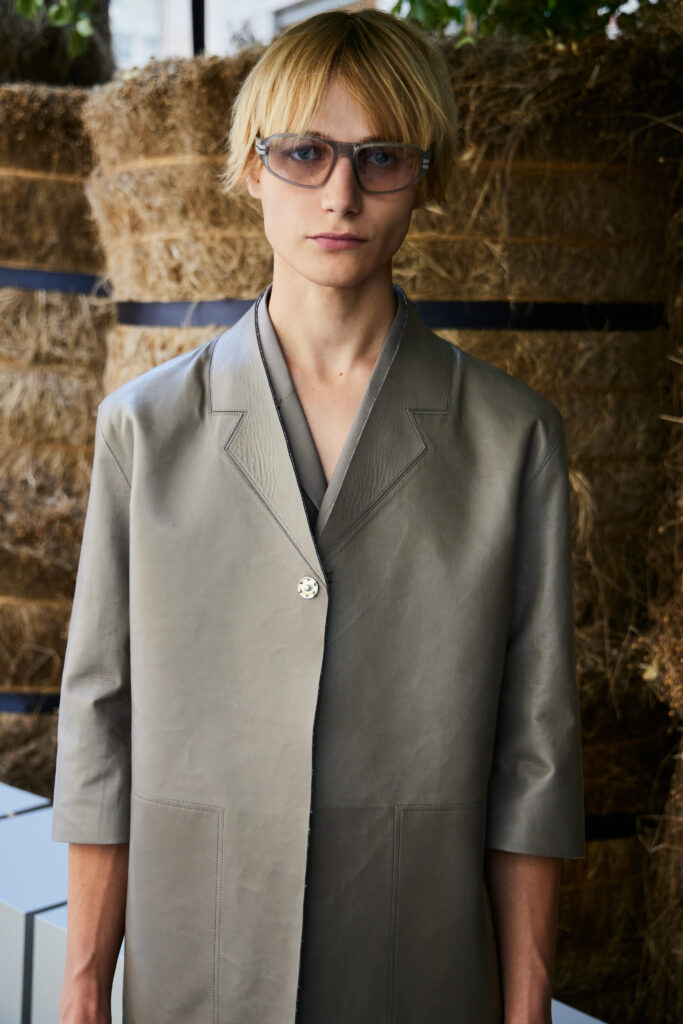 Textures add substance and surface tension: linen gabardine, linen faille, compact linen knit, compact Blue Flower linen, satin linen, jute oxford, washi paper, raffia, silk popeline, seta tussa, recycled wool granitè, double-faced wool, tela vela, mohair poplin, linen and bourette and silk canvas, hammered nabuk, bonded calf. The palette, worked in scales of similar tones and irregular monochromes, is an amalgamation of neutral hues — calcare, juta, mastice, aral gray, chilled notes of linfa, agave, lichene and petra, warm tones of foliage and ferruggine, and accents of flamingo and Namibia orange.