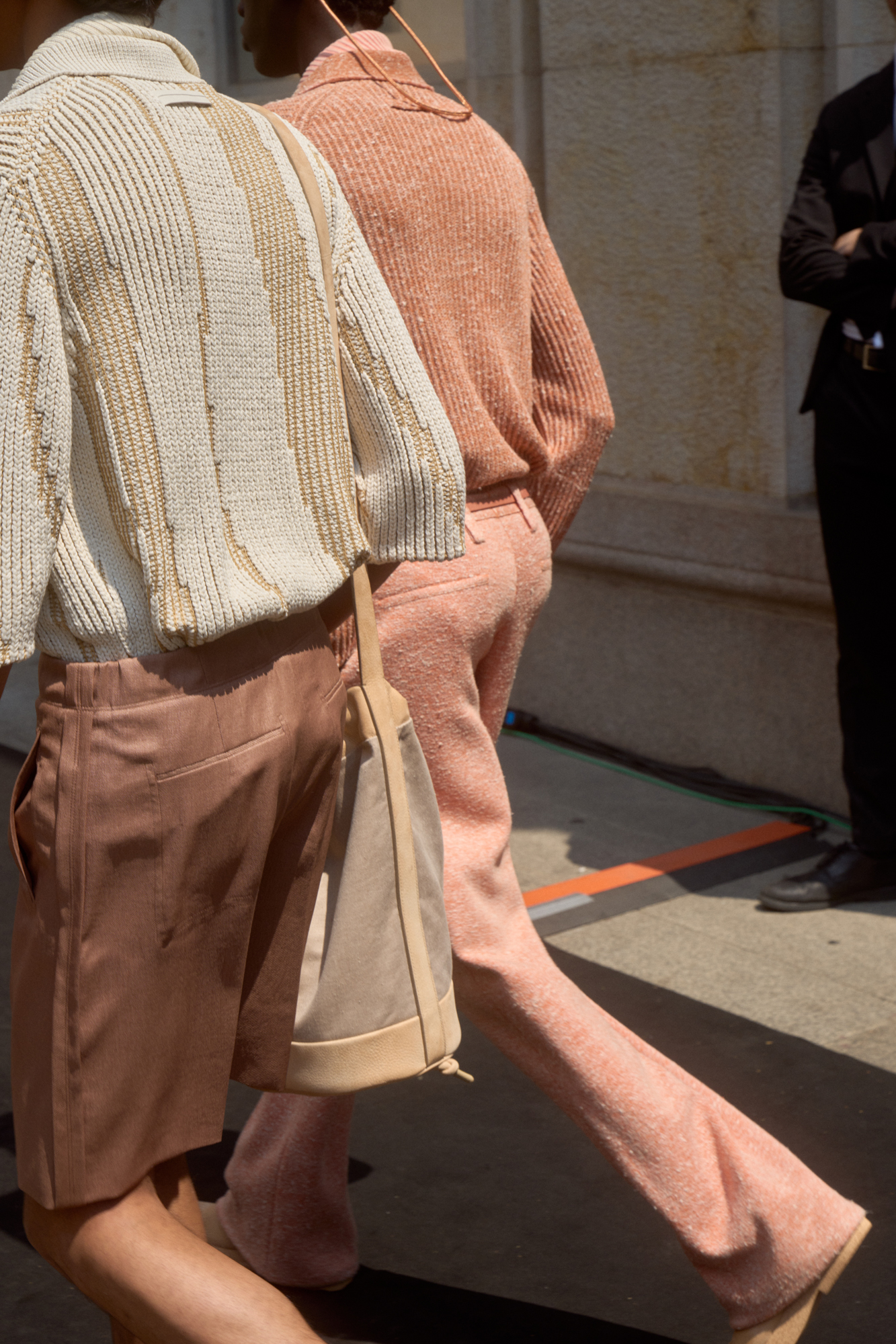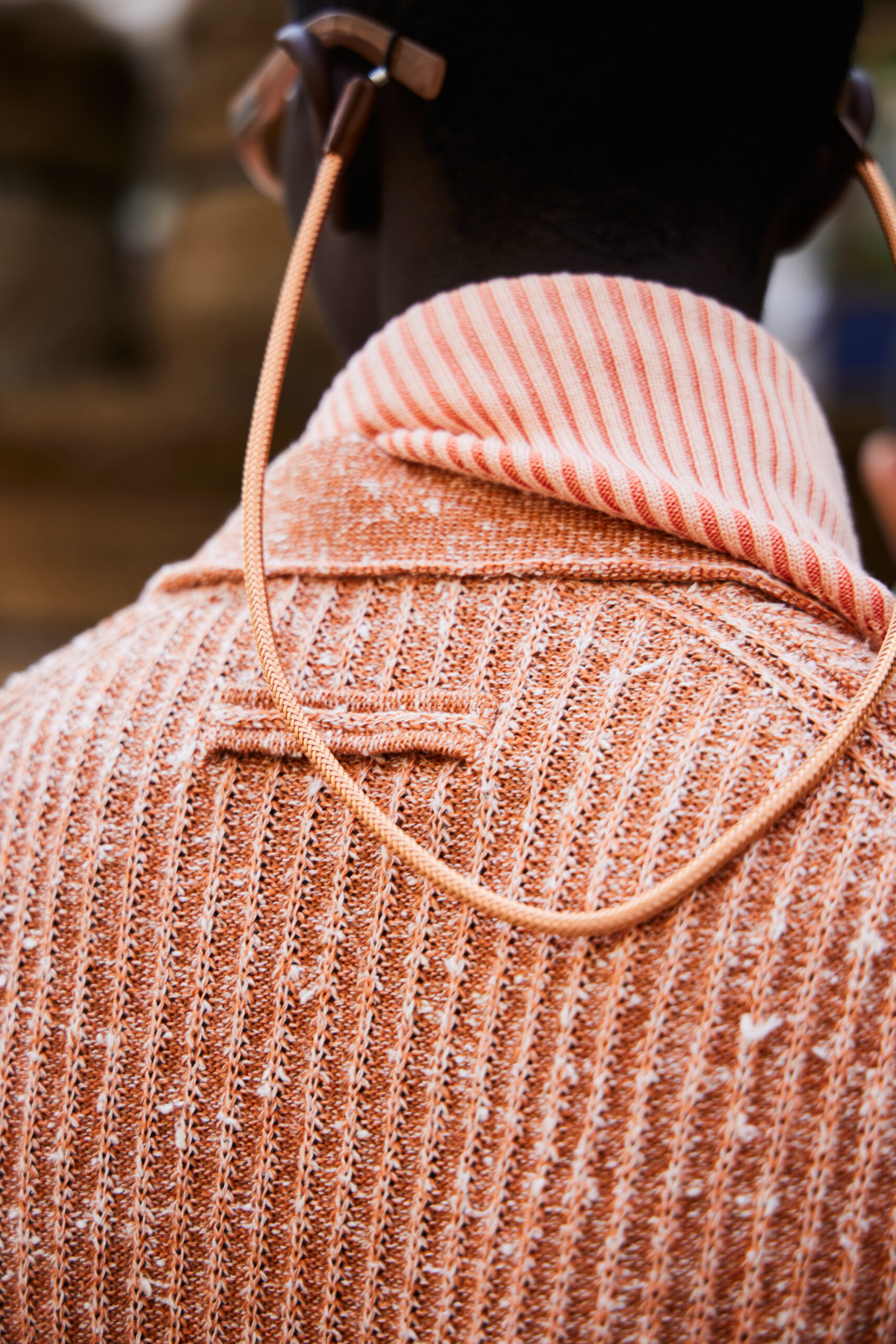 A sense of soft precision defines the collection. Volumes are fluid, categories are liquid: deconstructed jackets with low or standing collars; airy duster coats; round-neck tops that replace jackets; vests that double as tank tops; bombers that flow into shirts. The sack jackets with ¾ length sleeves introduced last season are reiterated. Trousers are full; shorts and jumpsuits add a pragmatic feel. Irregular lines run on the exterior of items as well as inside, in the linings, showing up on turn ups, marking the tension of uniform/non-uniform. Undulating stripes draw textural motifs and jacquards. Textured knitwear further accentuates the sense of ease and suppleness. Knitted triangular scarves, knitted caps, soft yet geometric handbags, double glasses, massive-soled slip-on shoes cut from one piece of leather and the iconic Triple Stitch™ Luxury Leisurewear shoe in its new espadrille evolution finish the looks.