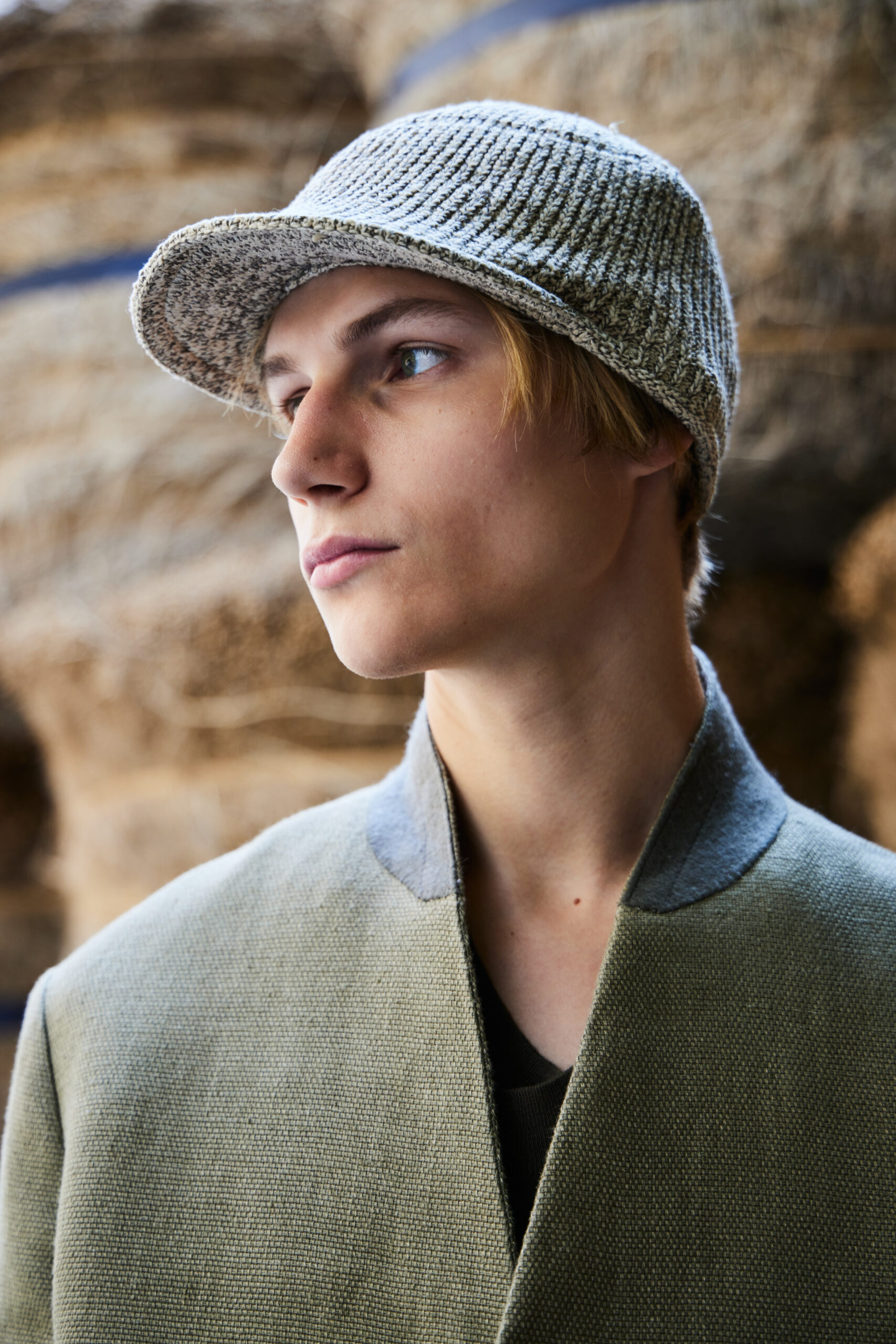- Accessoires : La collection comprend des écharpes triangulaires tricotées, des casquettes, des sacs à main doux mais géométriques, et des chaussures au design unique.