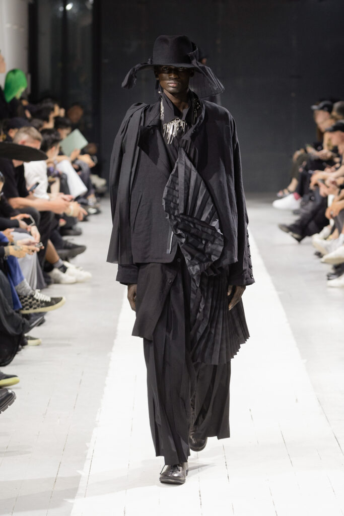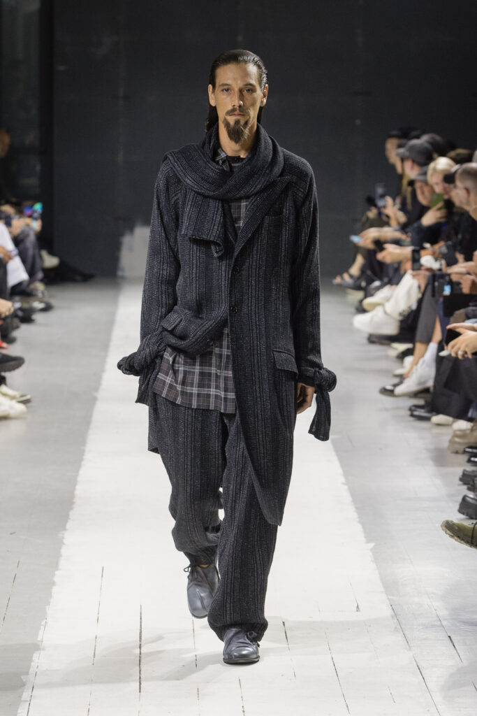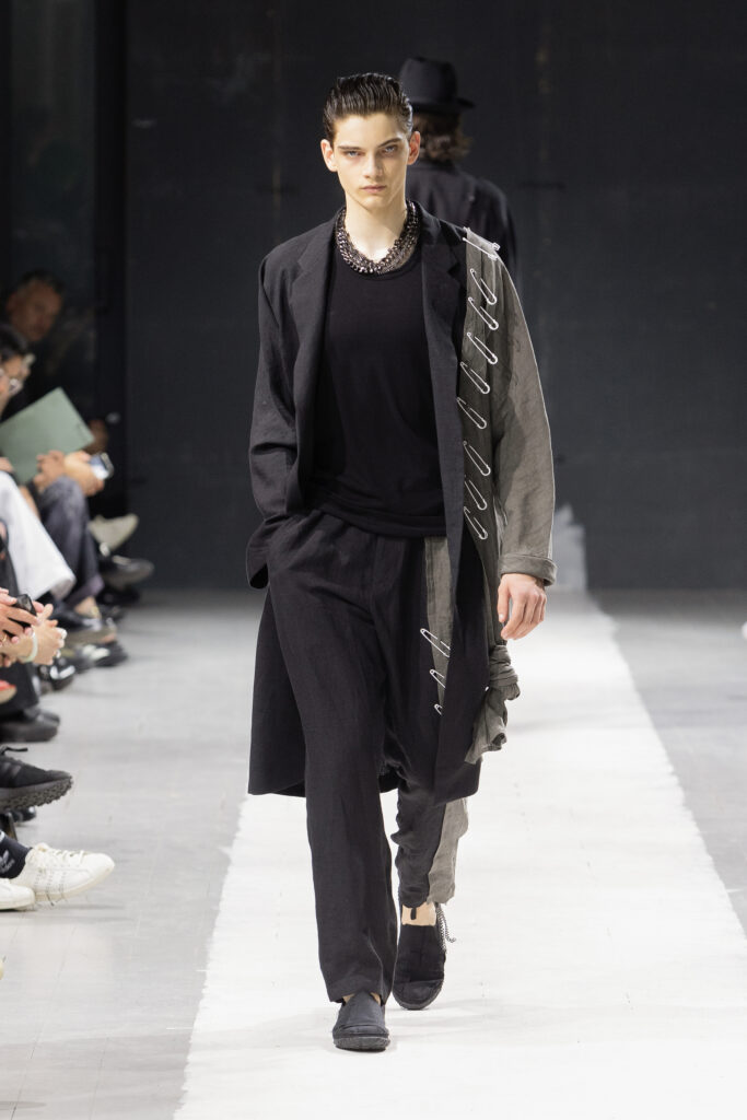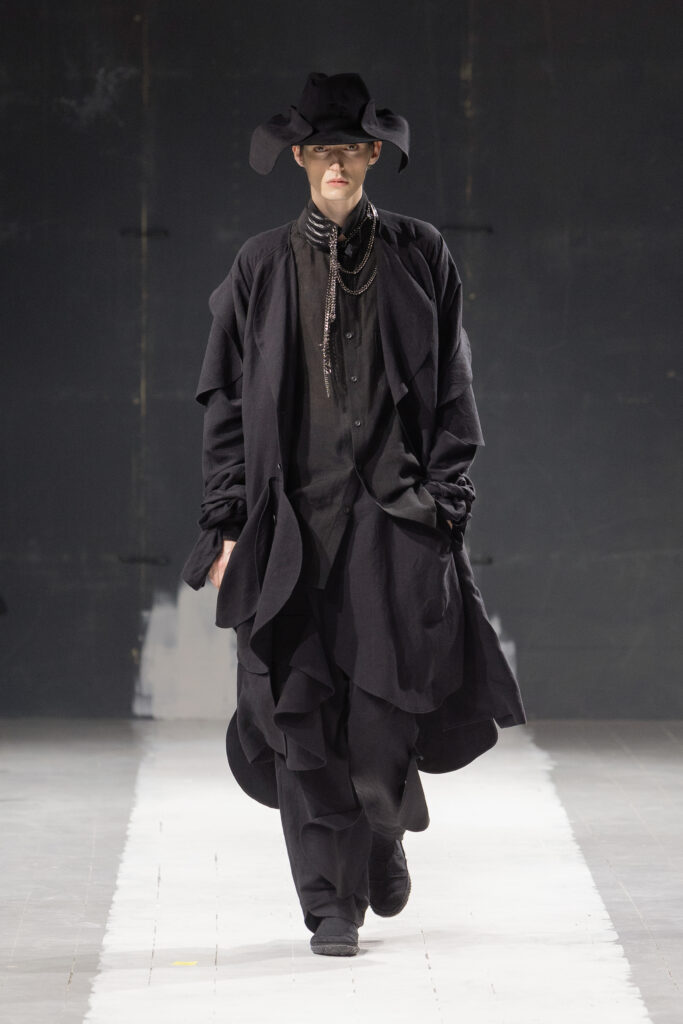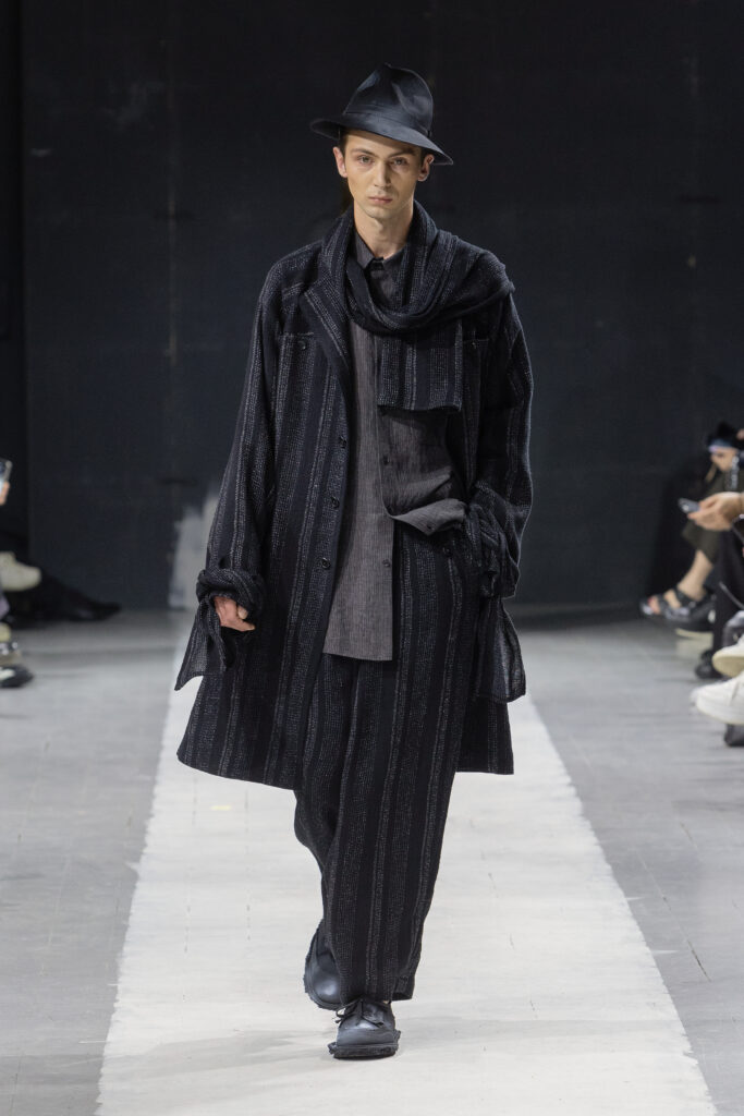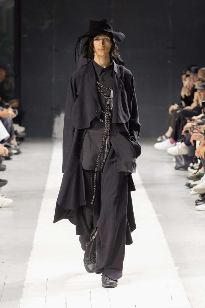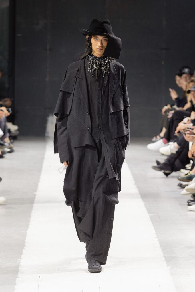 La collection SS24 évoque une esthétique gothique contemporaine, avec des vêtements en laine gabardine noire et des silhouettes amples. Ces éléments s’entremêlent pour créer une ambiance à la fois dramatique et raffinée, qui caractérise l’œuvre de Yamamoto.