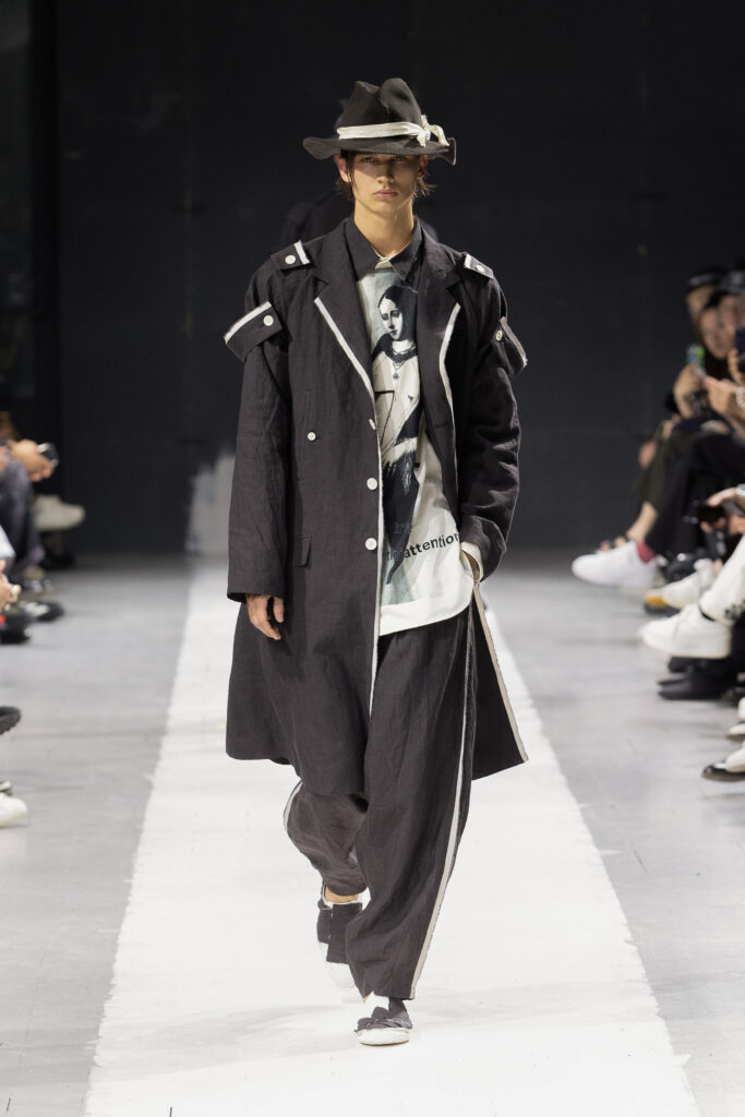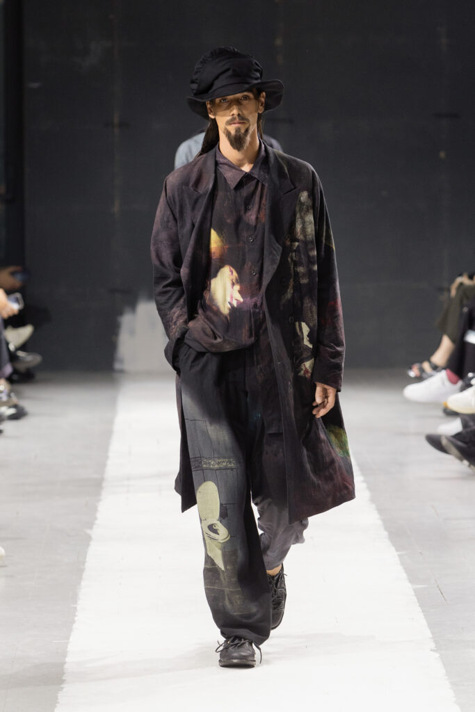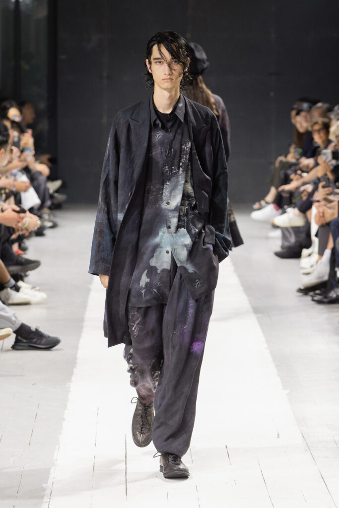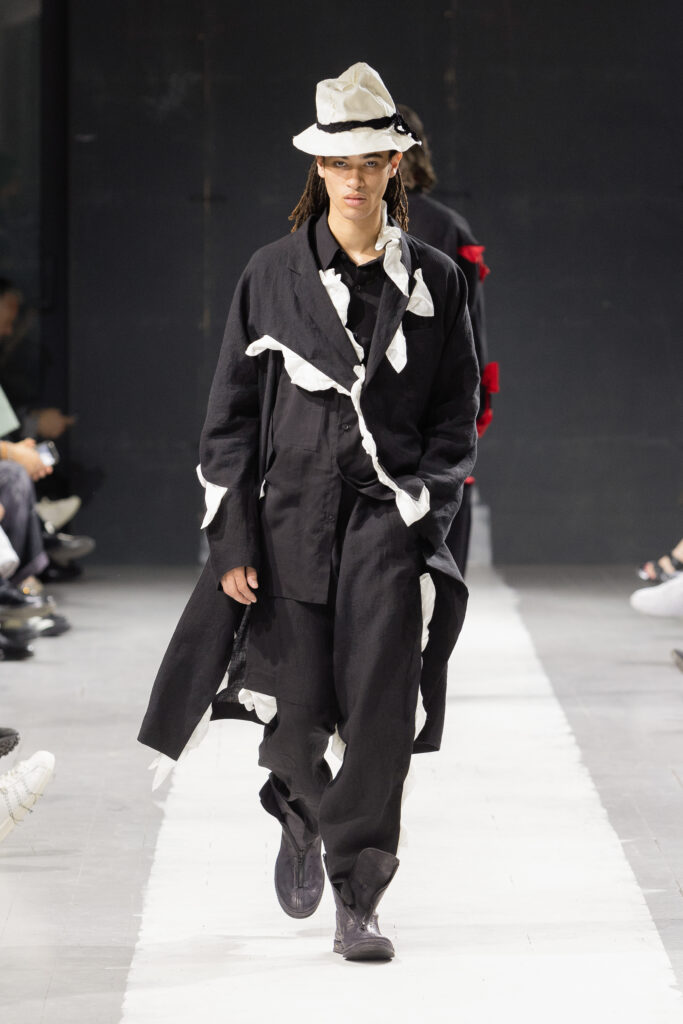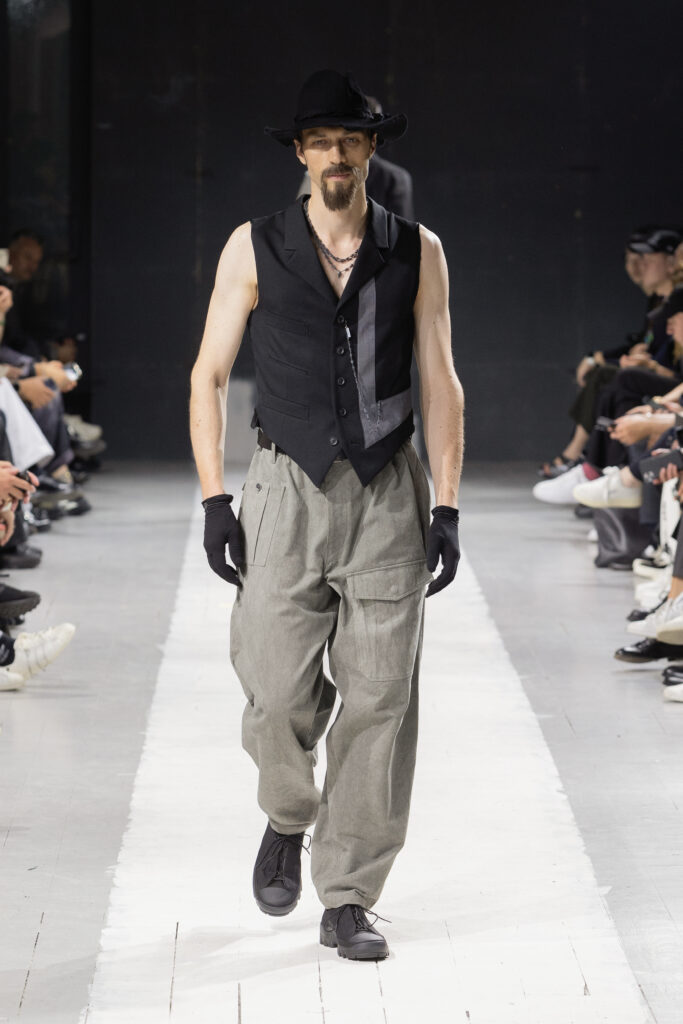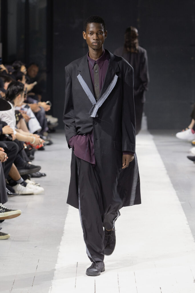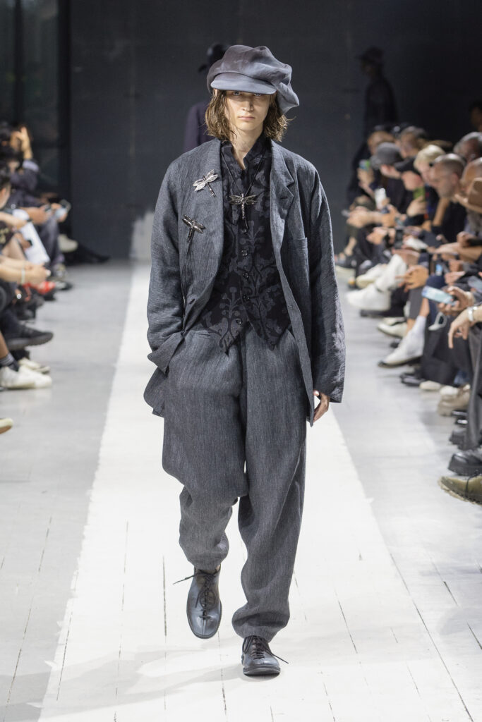 La collection SS24 évoque une esthétique gothique contemporaine, avec des vêtements en laine gabardine noire et des silhouettes amples. Ces éléments s’entremêlent pour créer une ambiance à la fois dramatique et raffinée, qui caractérise l’œuvre de Yamamoto.