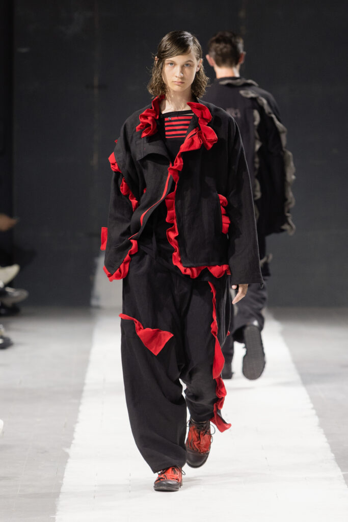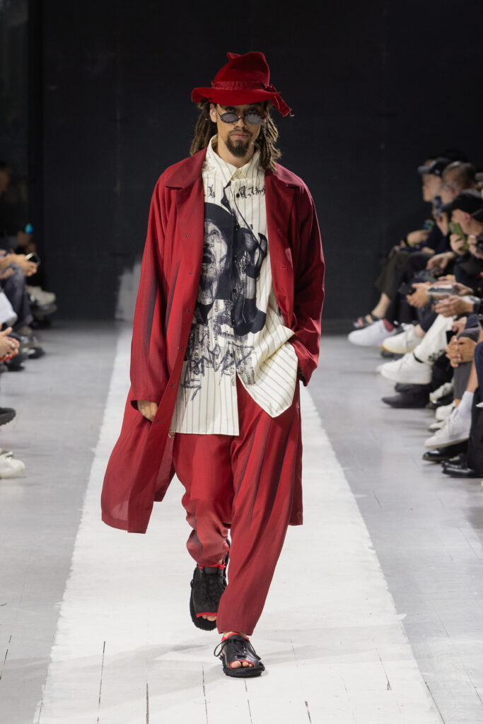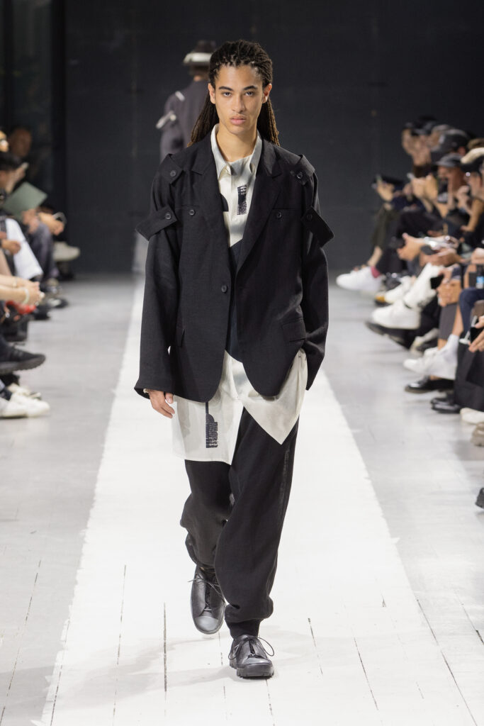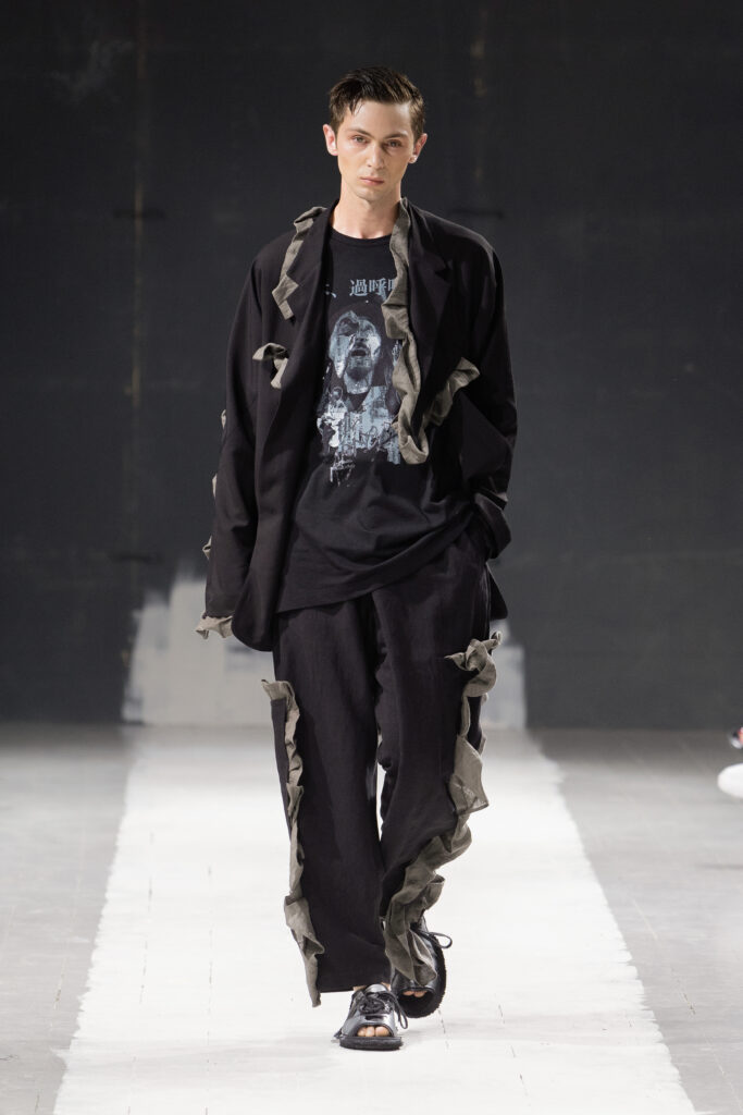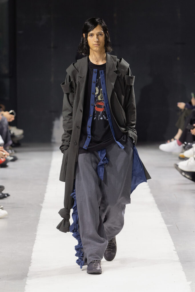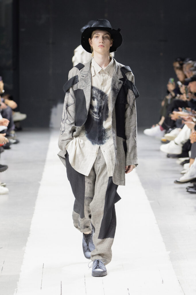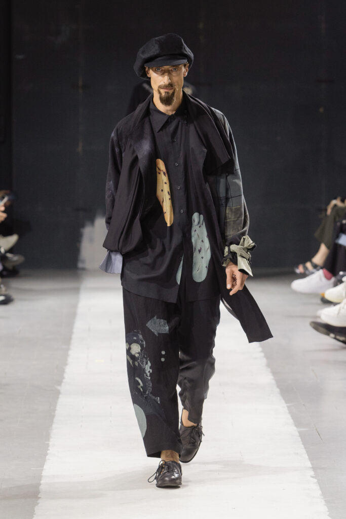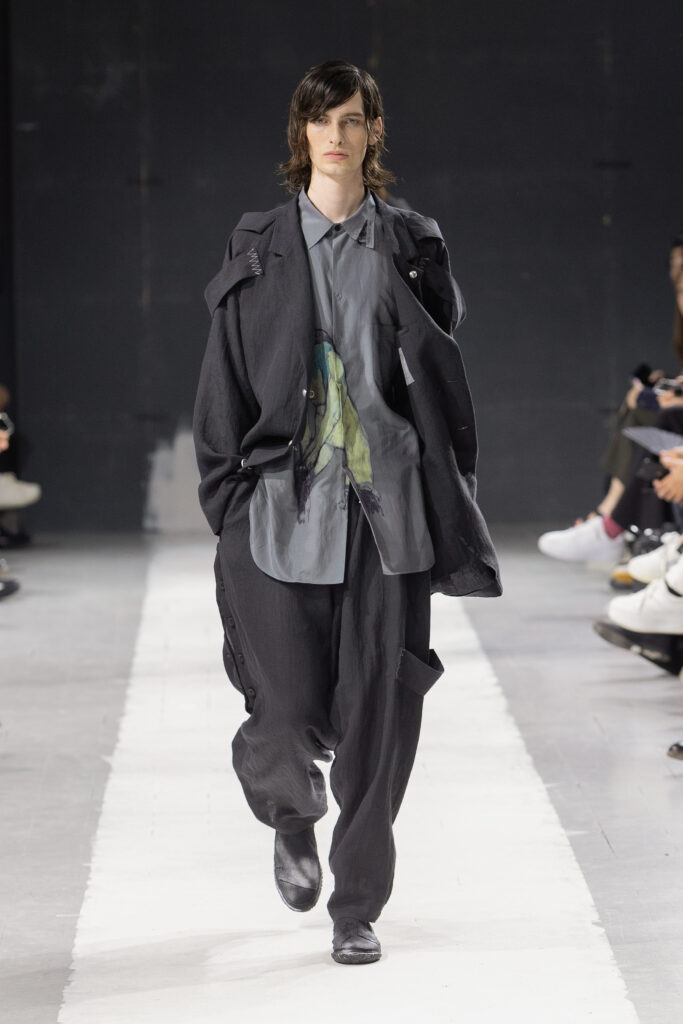 La collection SS24 évoque une esthétique gothique contemporaine, avec des vêtements en laine gabardine noire et des silhouettes amples. Ces éléments s’entremêlent pour créer une ambiance à la fois dramatique et raffinée, qui caractérise l’œuvre de Yamamoto.