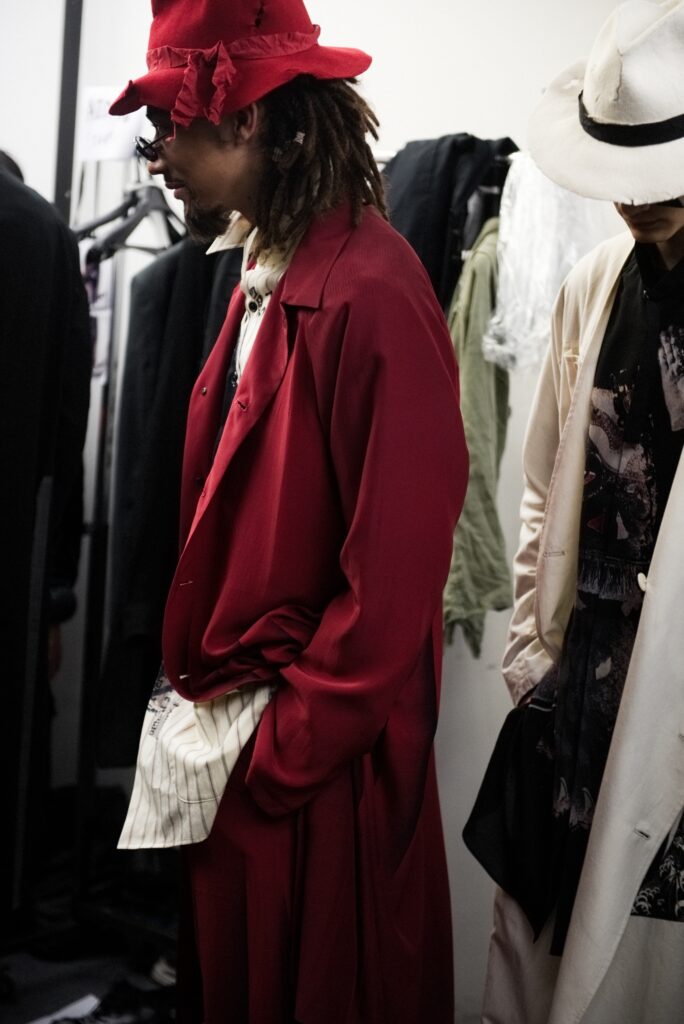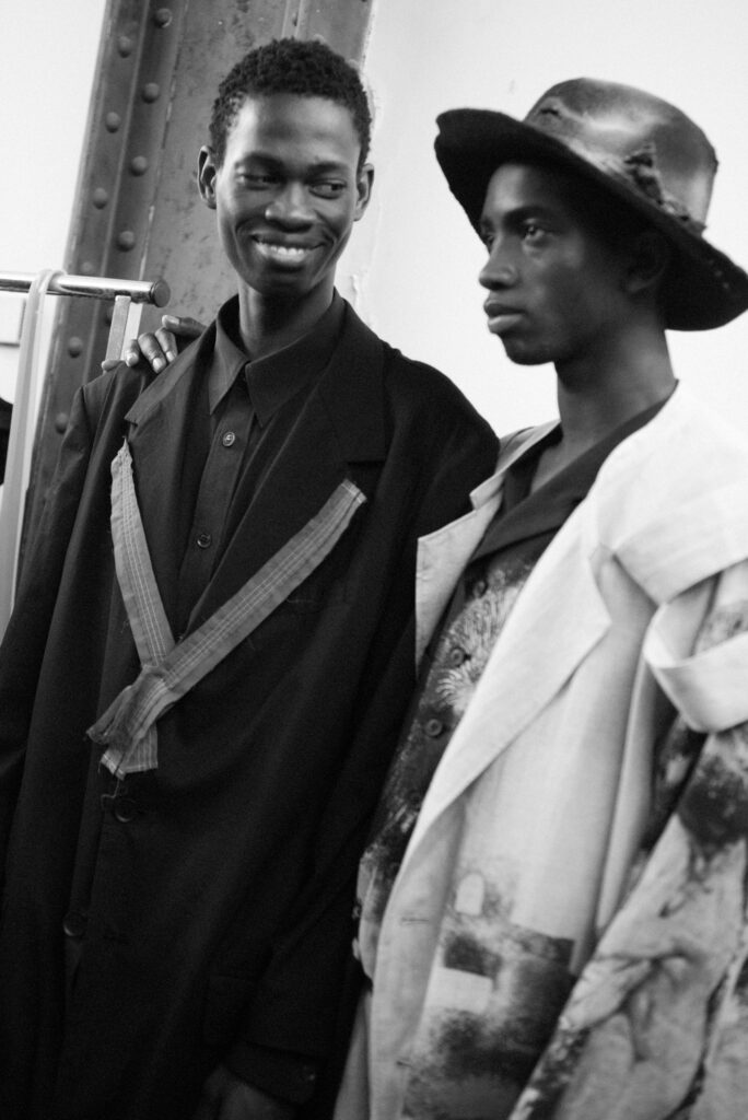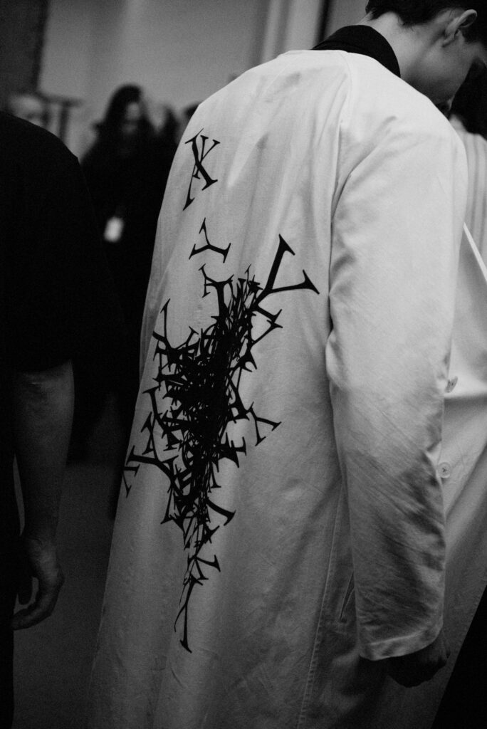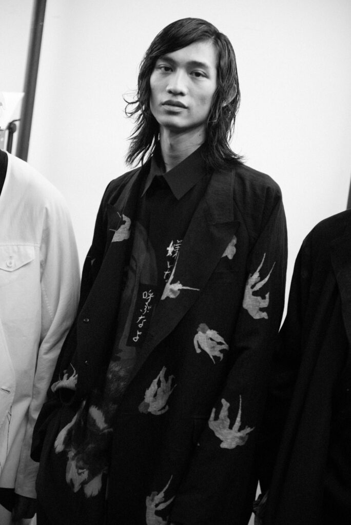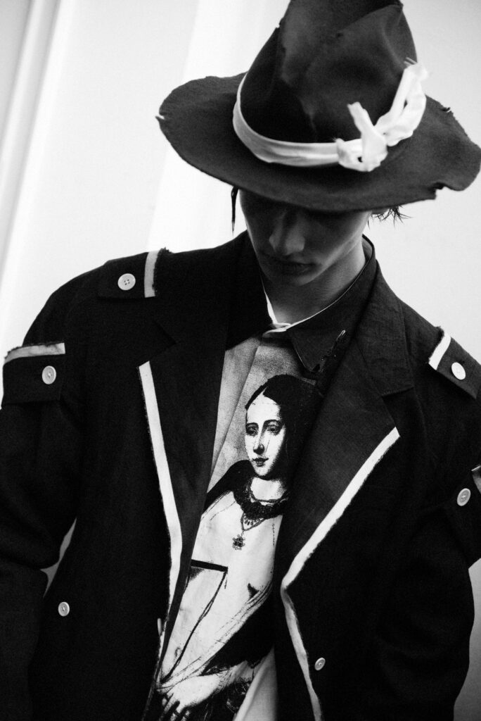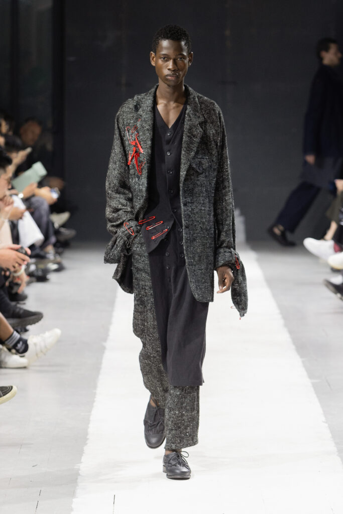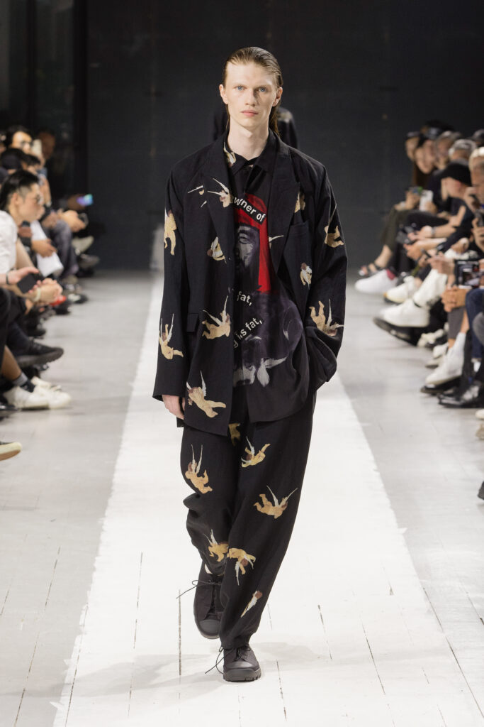 La collection SS24 évoque une esthétique gothique contemporaine, avec des vêtements en laine gabardine noire et des silhouettes amples. Ces éléments s’entremêlent pour créer une ambiance à la fois dramatique et raffinée, qui caractérise l’œuvre de Yamamoto.