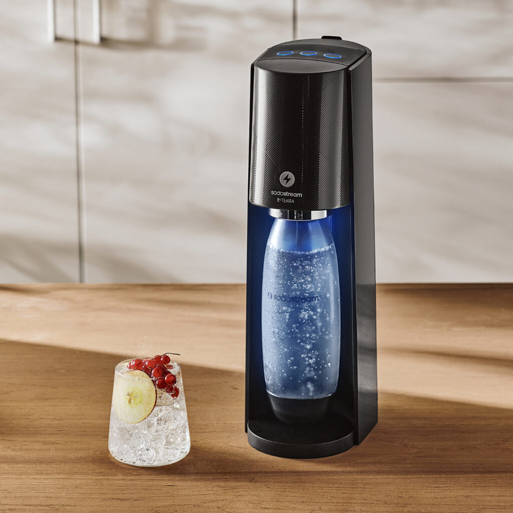 Enfin, la Terra offre une expérience de gazéification haut de gamme. D’une simple pression, elle invite à préparer une délicieuse eau pétillante et propose trois niveaux de gazéification. La bouteille s’illumine durant le processus de gazéification, grâce à un éclairage LED. Disponible en noir, elle est proposée à partir de 149,99€.