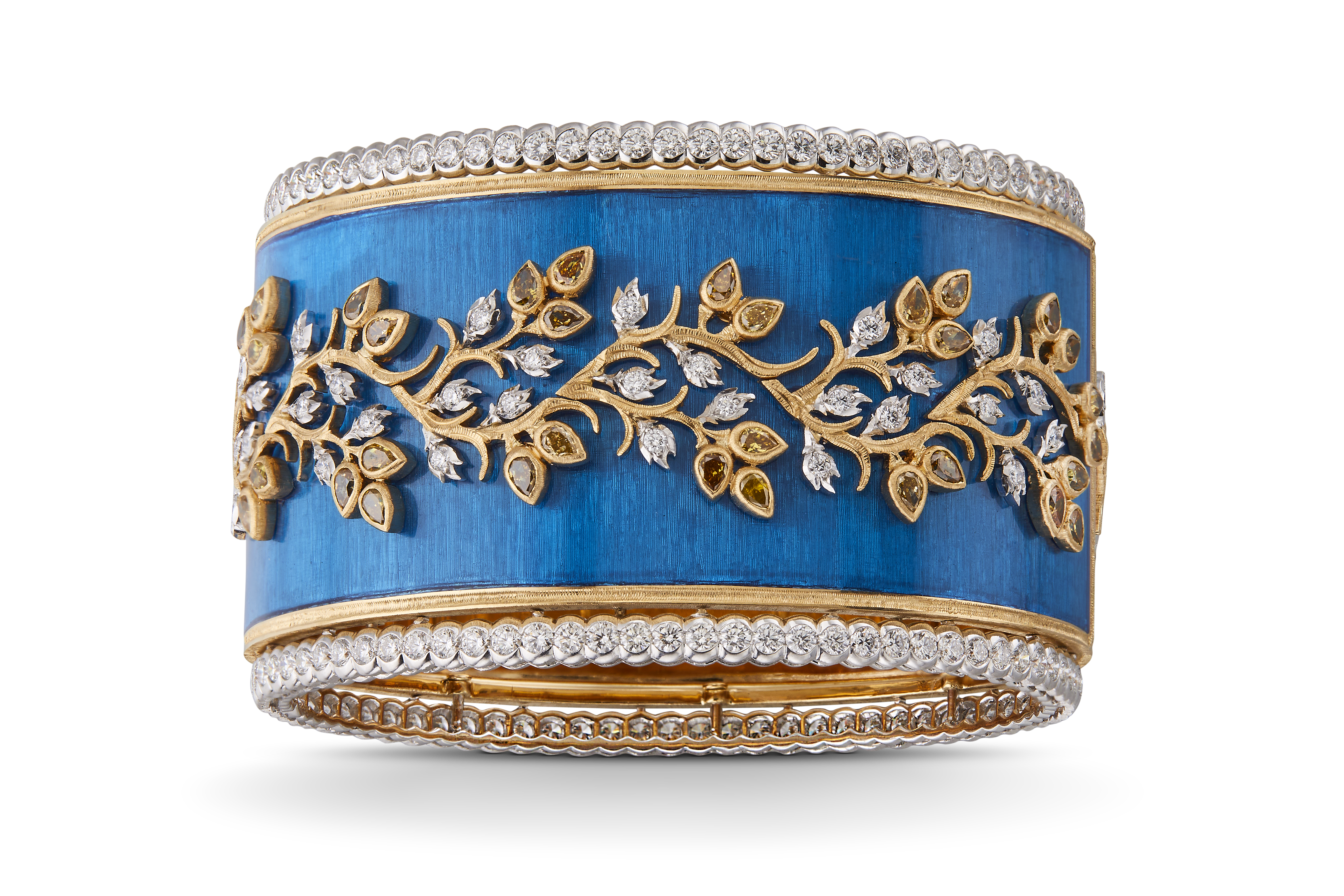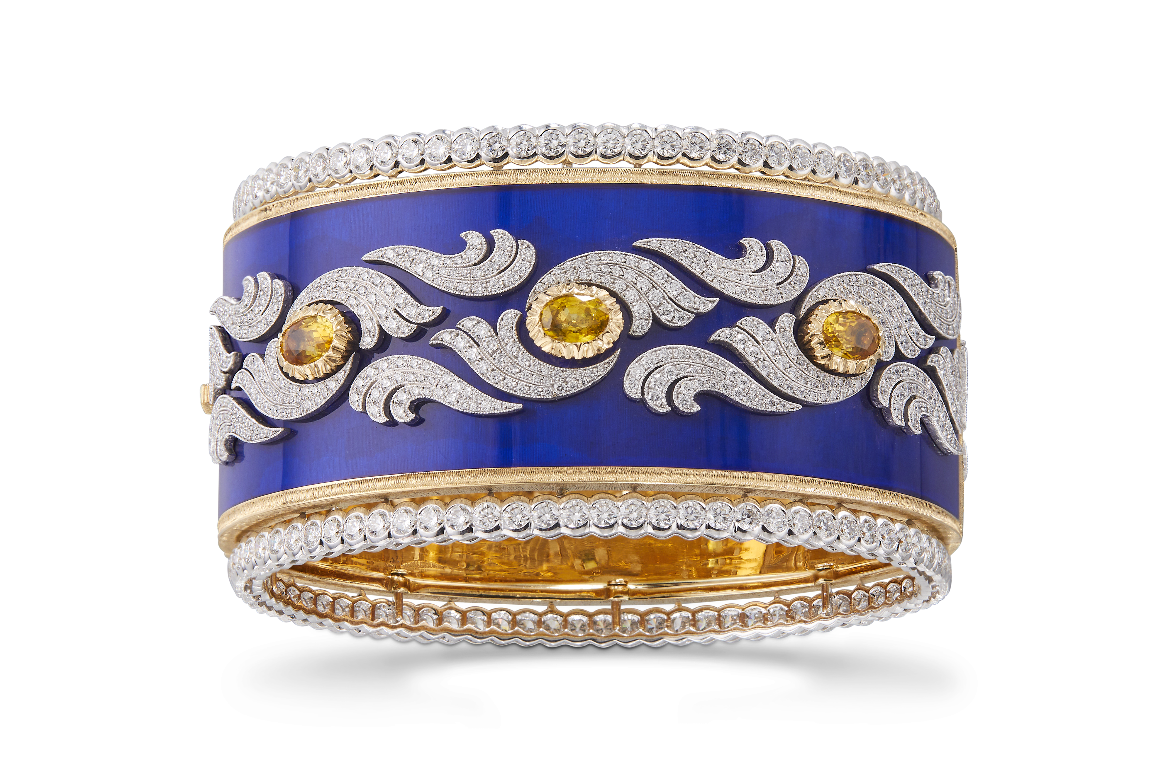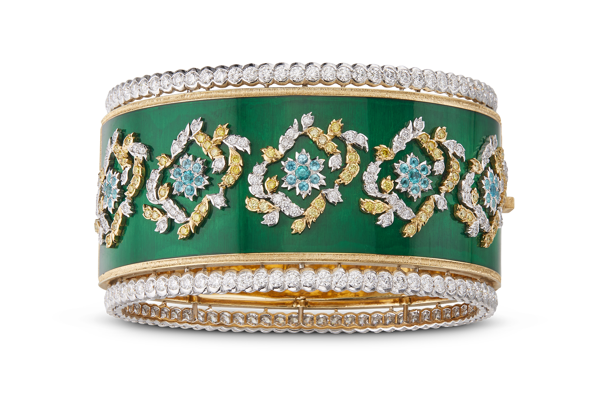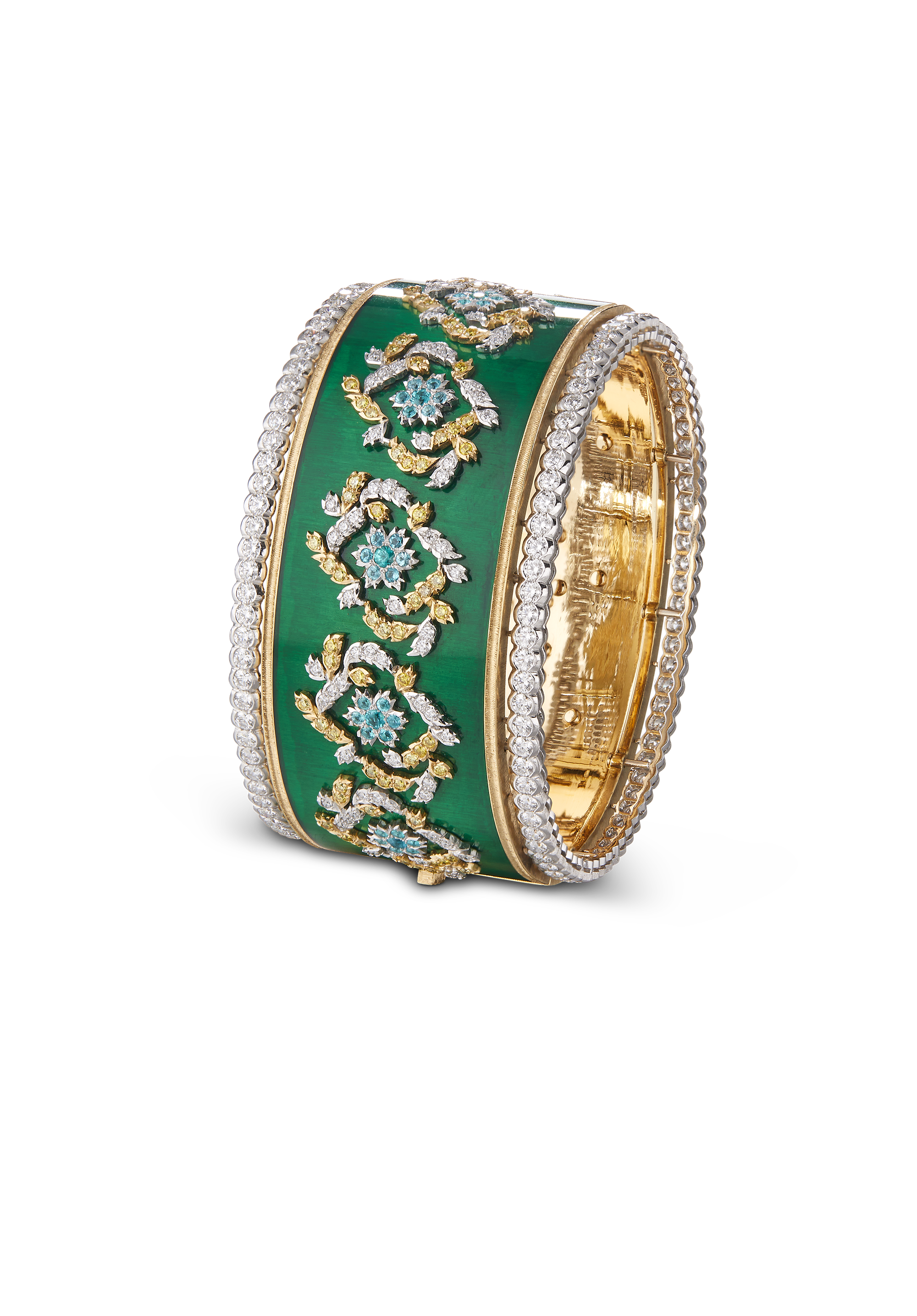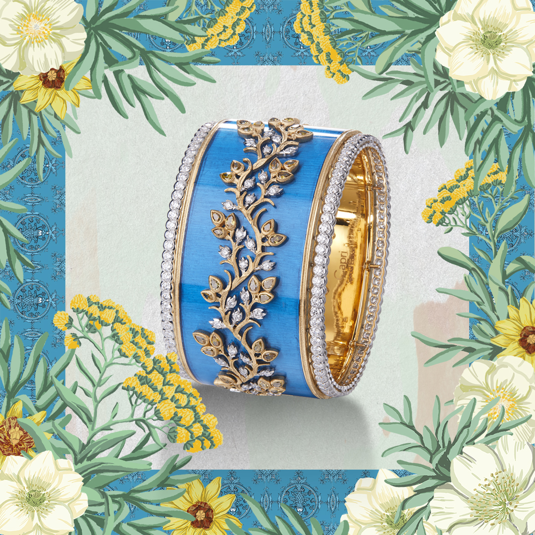 Chaque bracelet manchette est unique, réalisé à la main dans les ateliers Buccellati. Les artisans mettent en œuvre leur dextérité pour ciseler l’or jaune et blanc, sertir les diamants et les pierres de couleur, apposer des émaux chatoyants. Leurs gestes précis perpétuent les savoir-faire d’excellence de la joaillerie italienne.