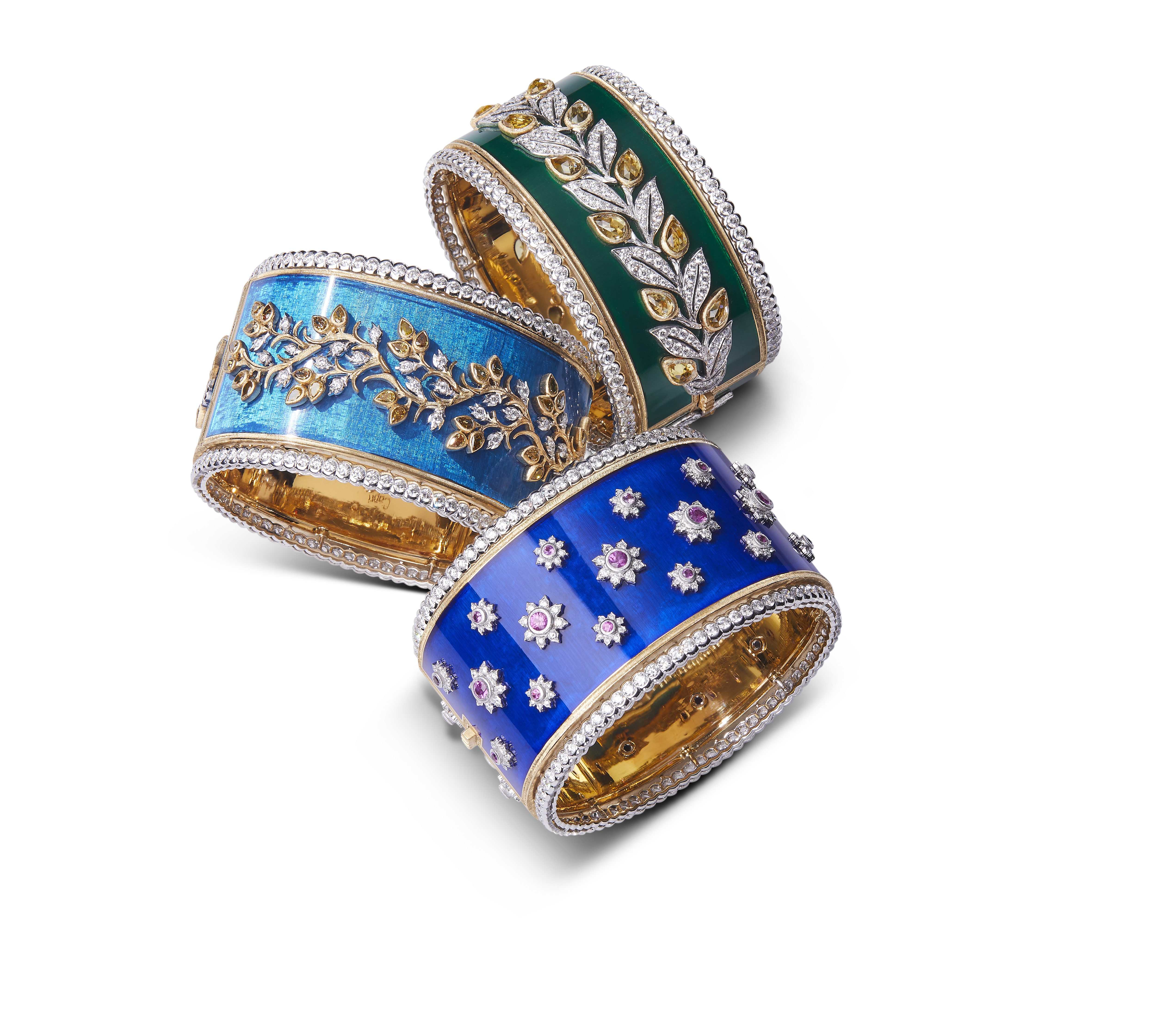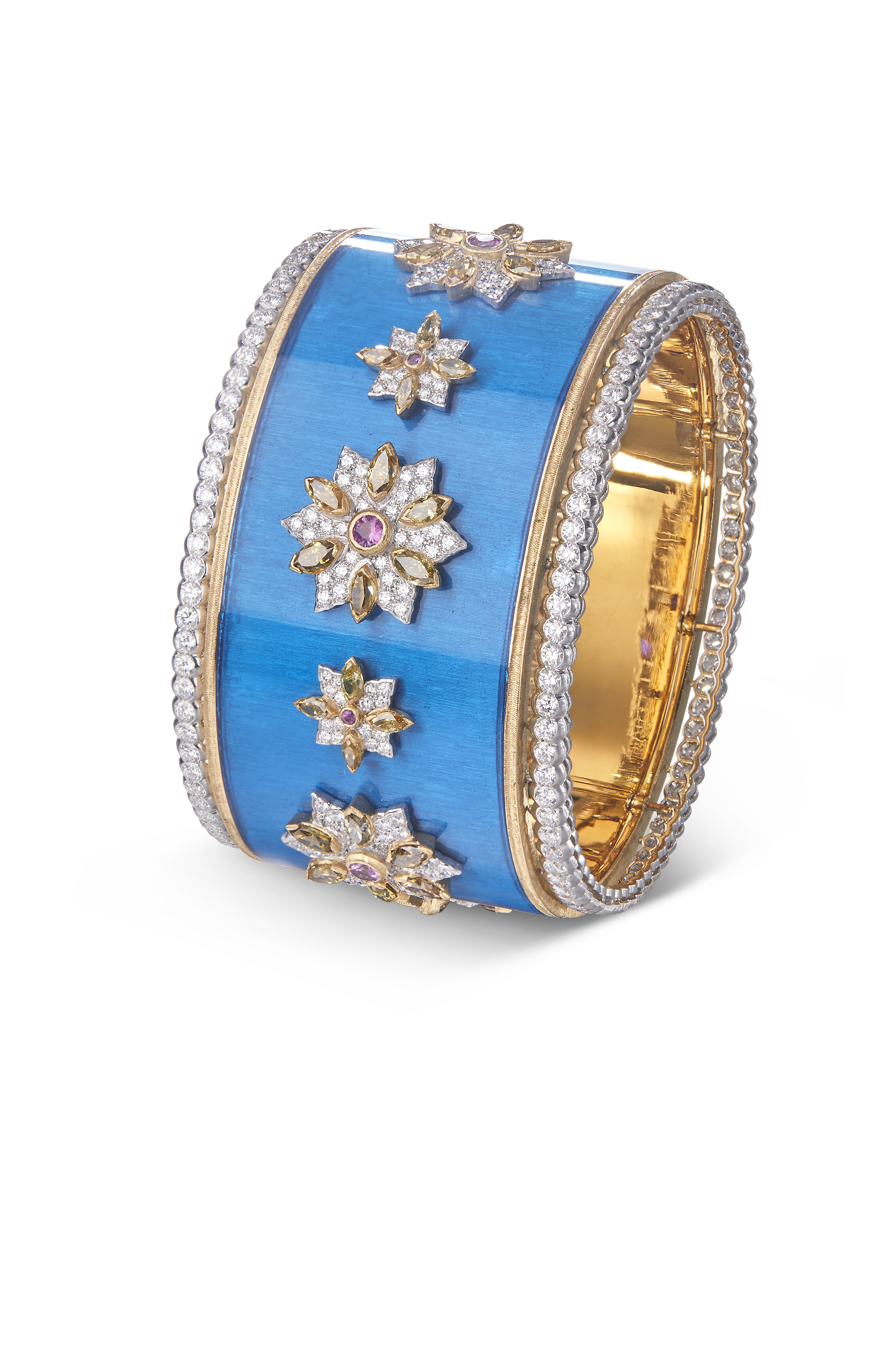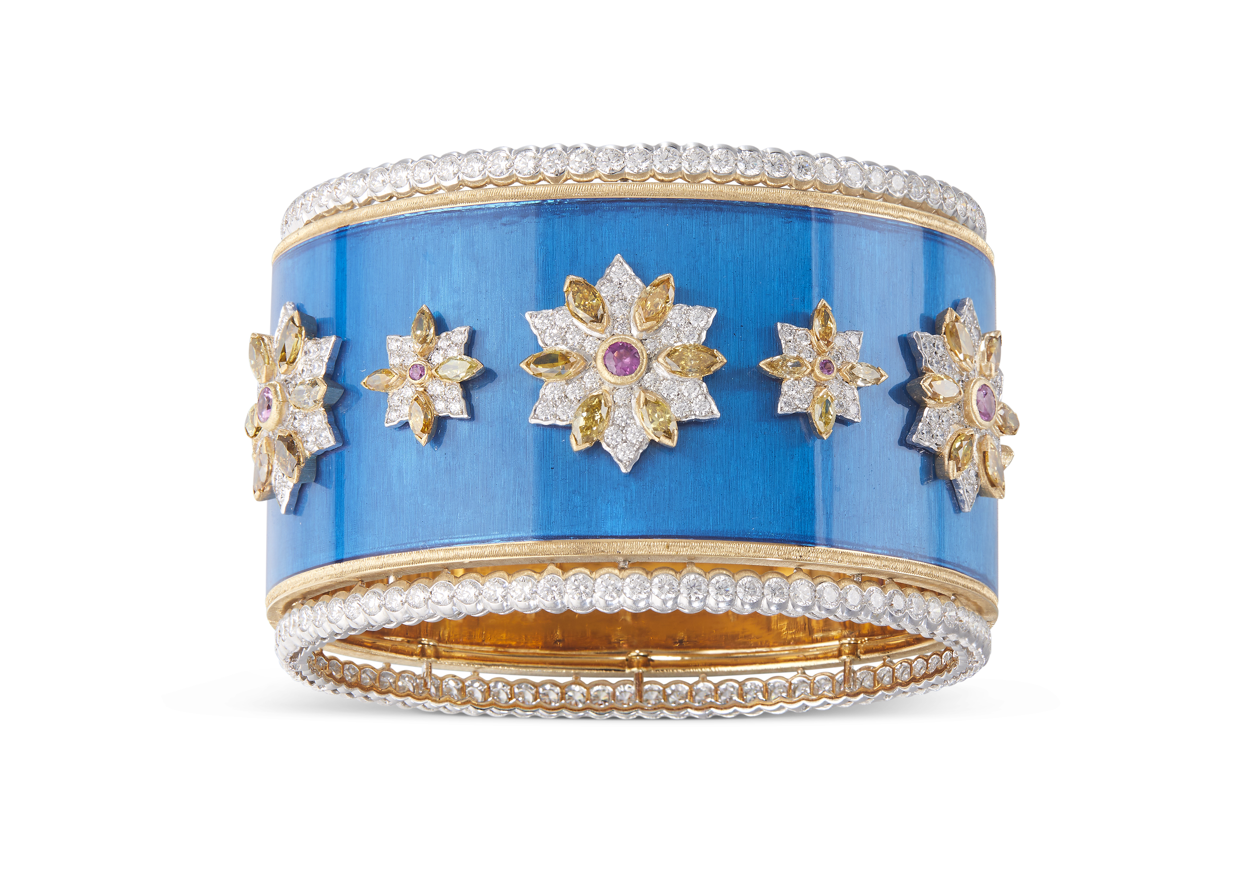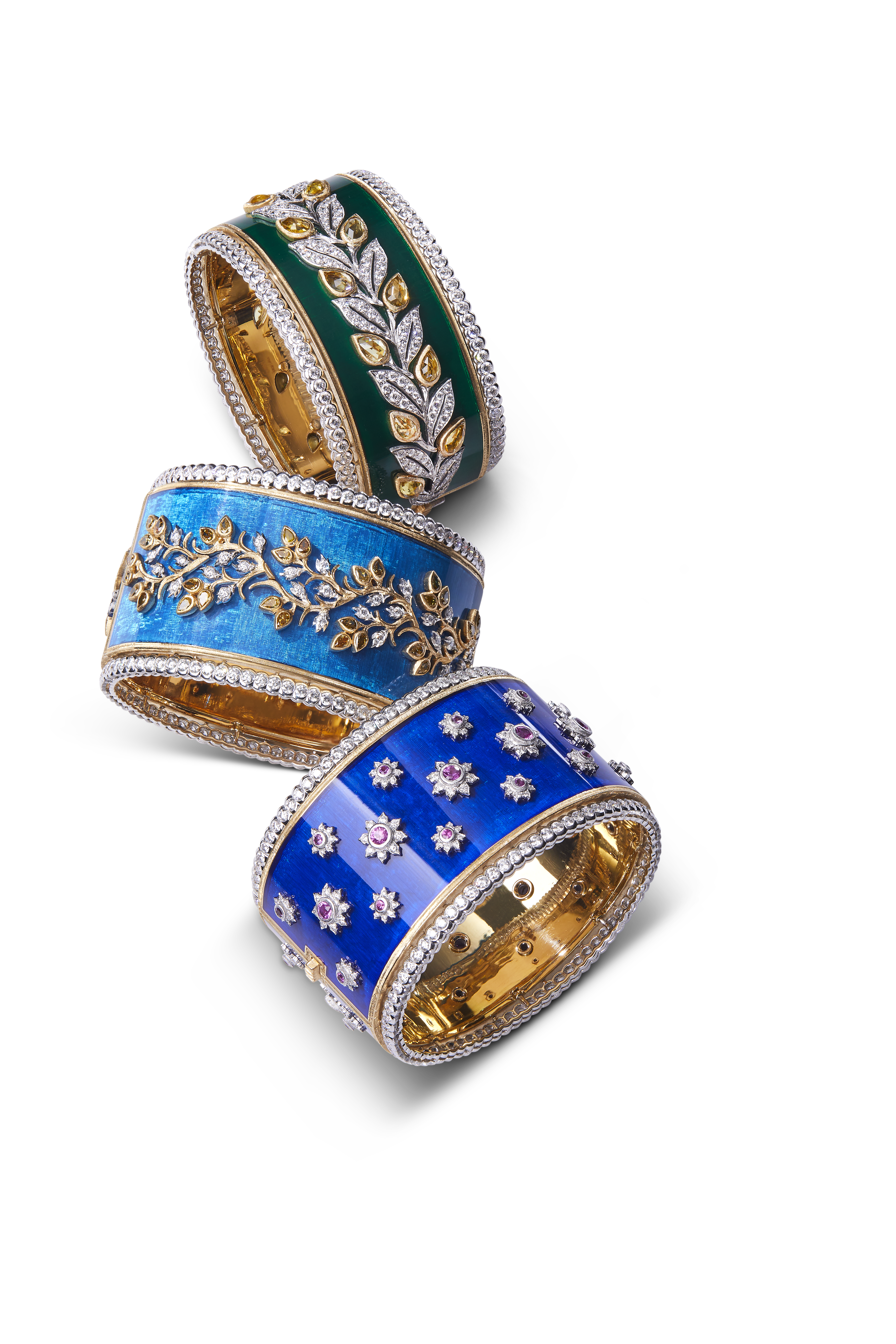 Chaque bracelet manchette est unique, réalisé à la main dans les ateliers Buccellati. Les artisans mettent en œuvre leur dextérité pour ciseler l’or jaune et blanc, sertir les diamants et les pierres de couleur, apposer des émaux chatoyants. Leurs gestes précis perpétuent les savoir-faire d’excellence de la joaillerie italienne.