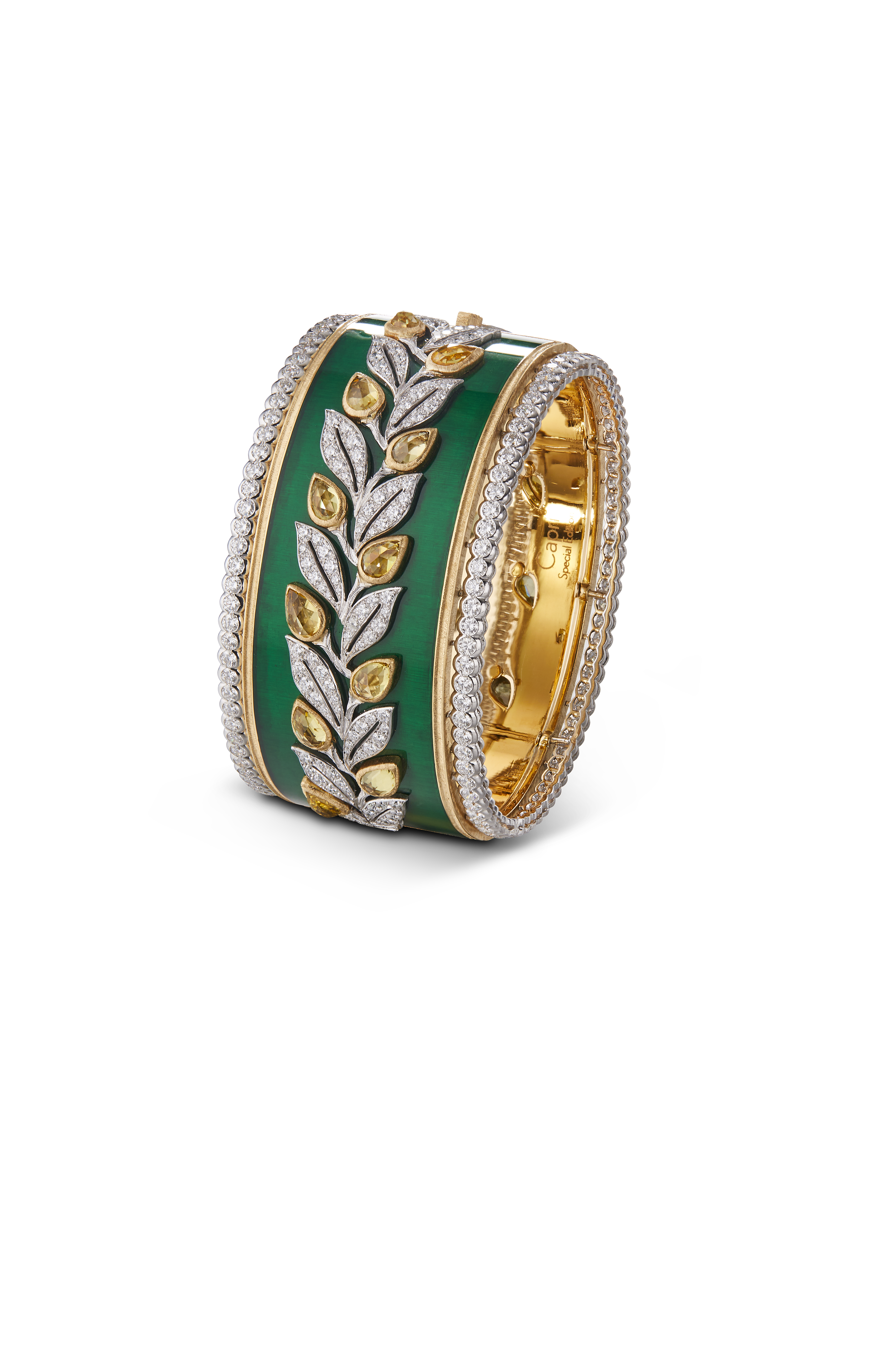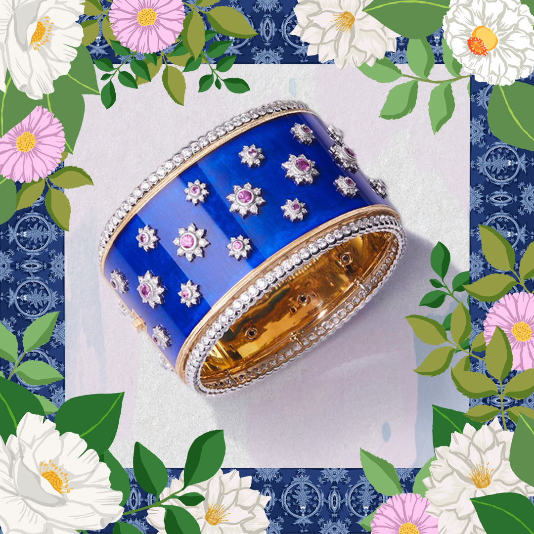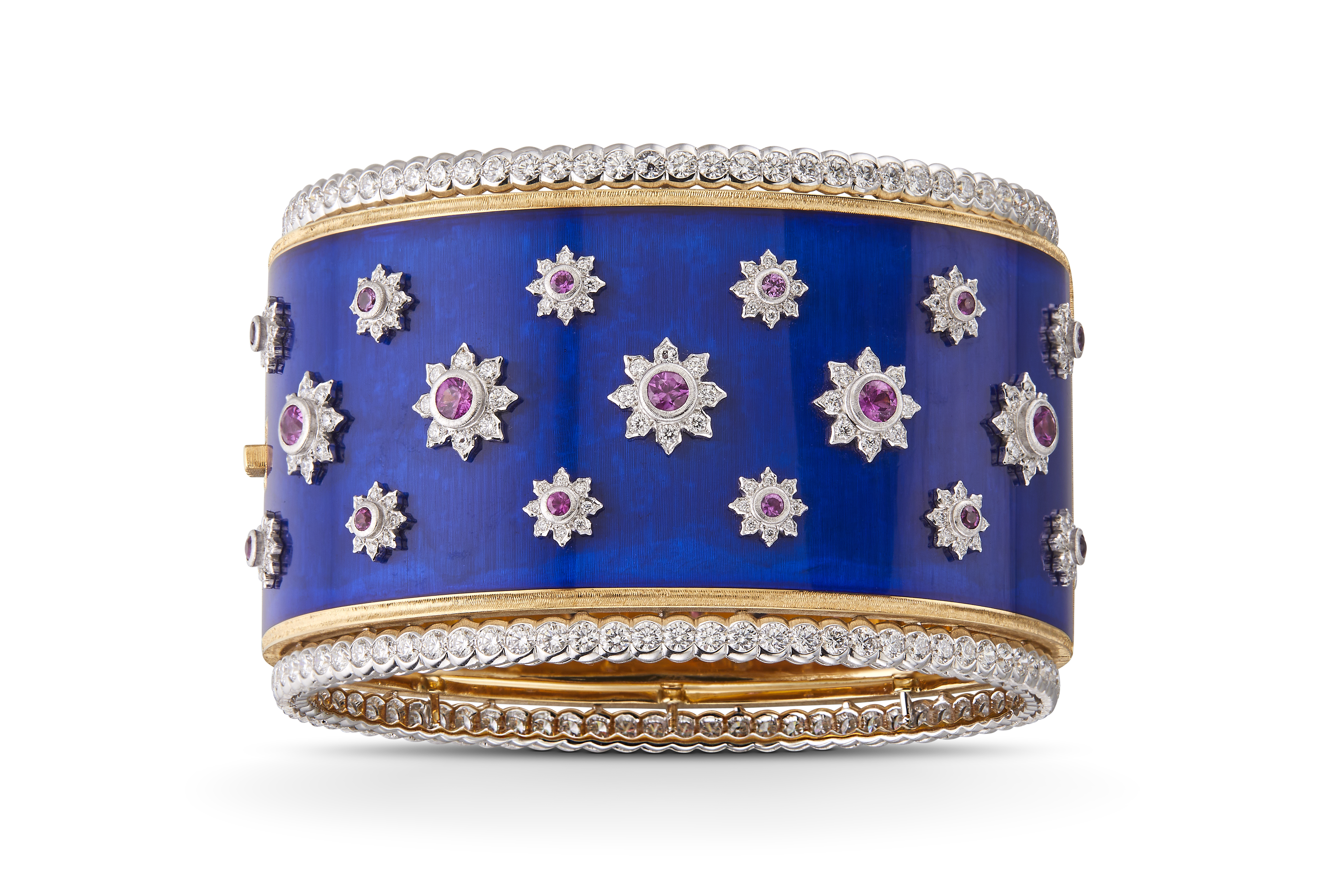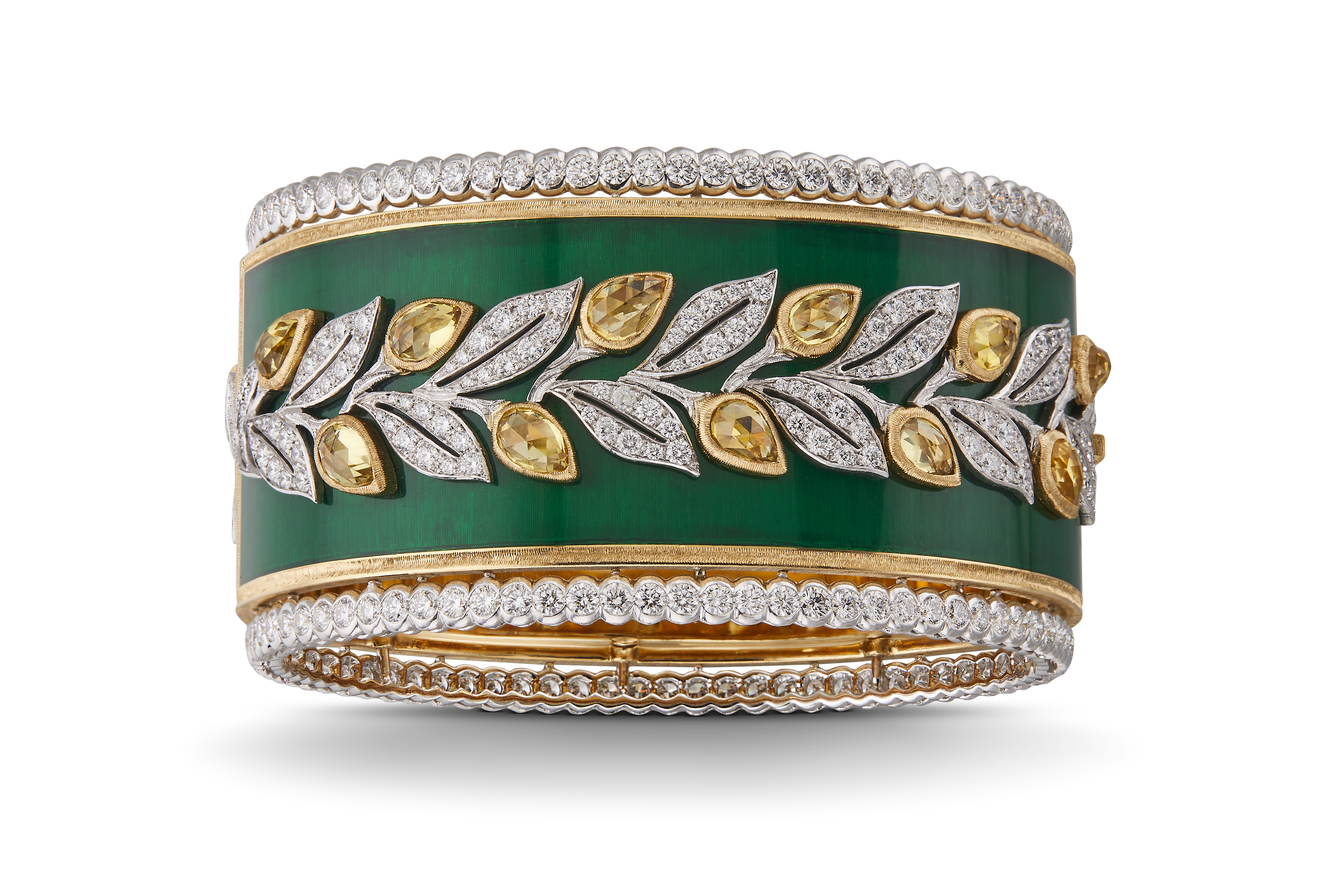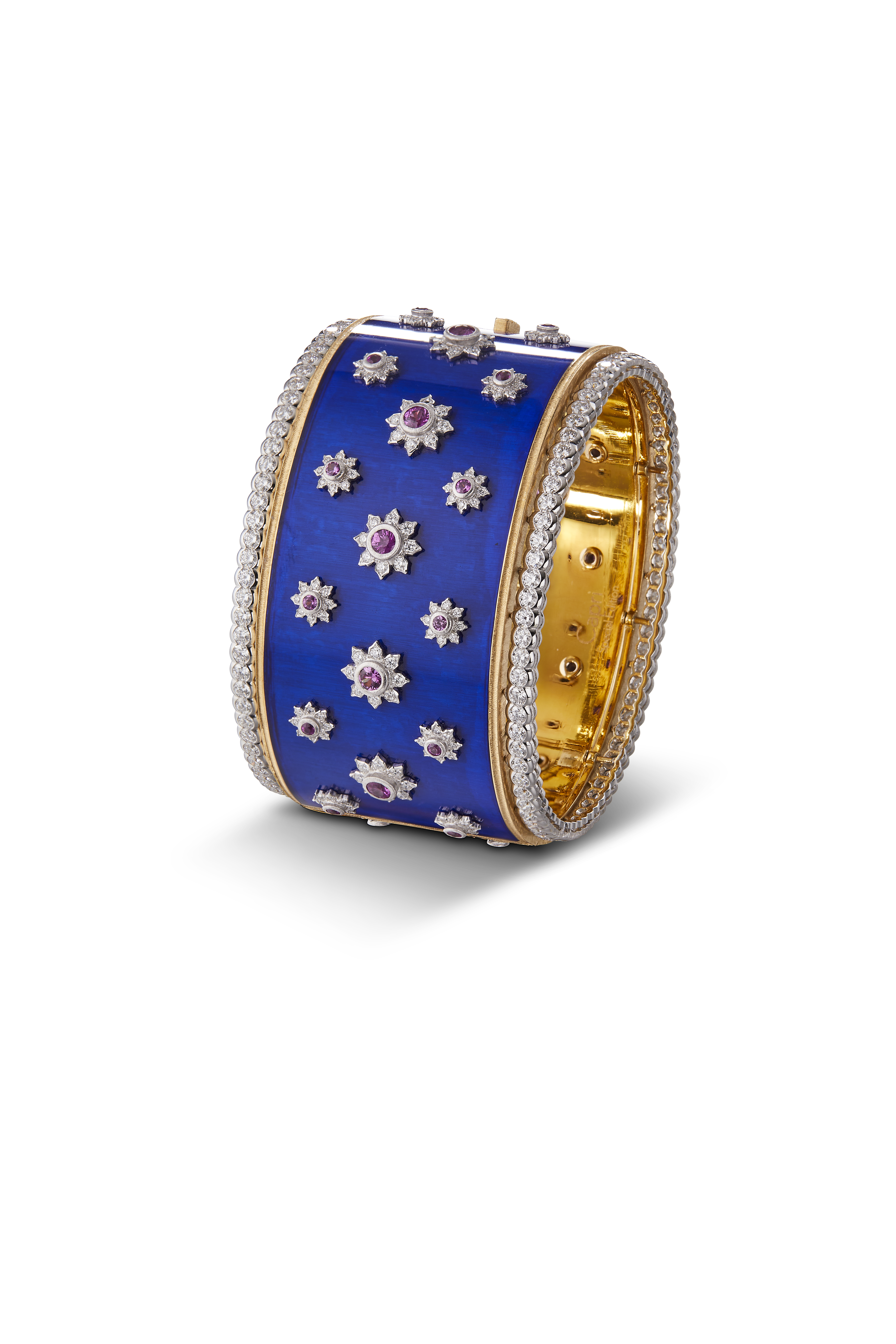Chaque bracelet manchette est unique, réalisé à la main dans les ateliers Buccellati. Les artisans mettent en œuvre leur dextérité pour ciseler l’or jaune et blanc, sertir les diamants et les pierres de couleur, apposer des émaux chatoyants. Leurs gestes précis perpétuent les savoir-faire d’excellence de la joaillerie italienne.