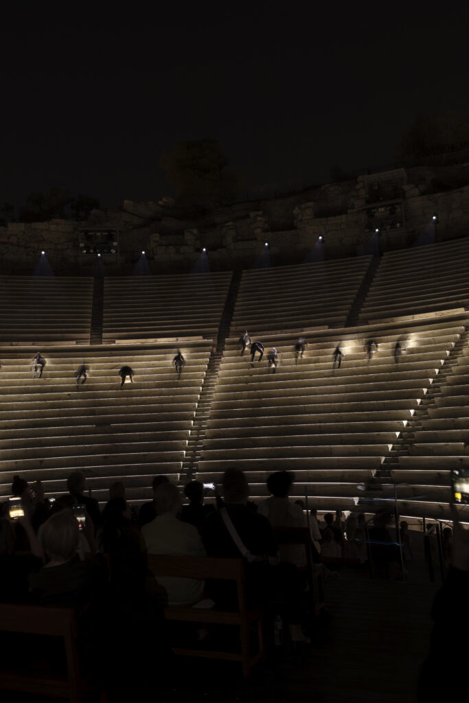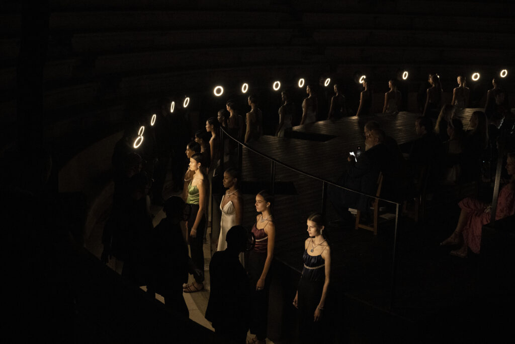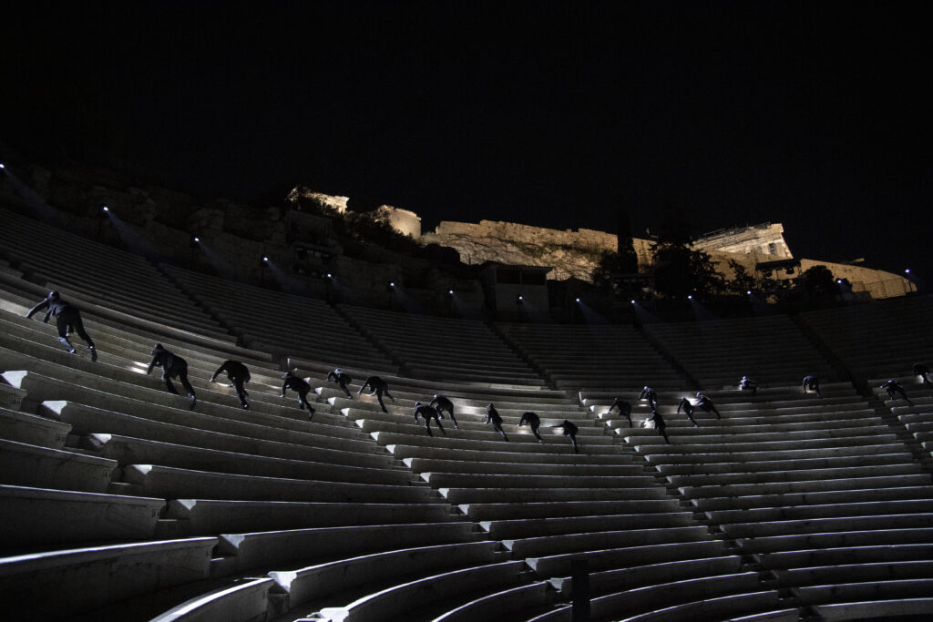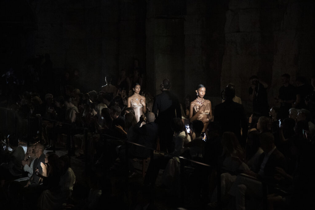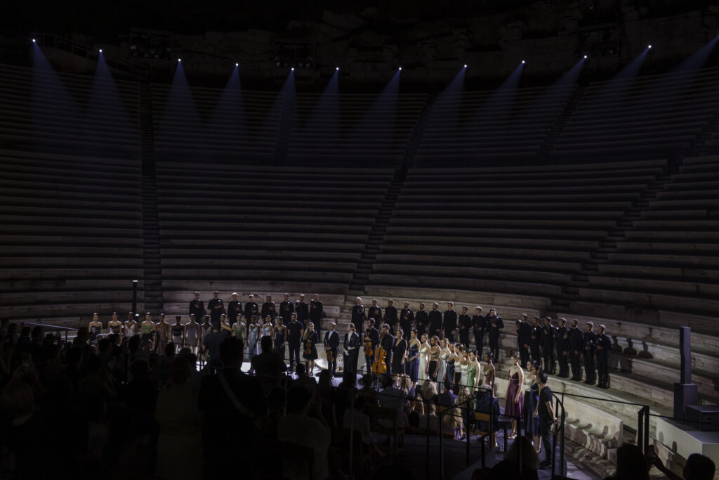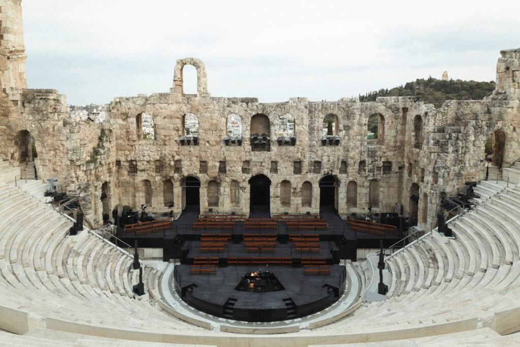 Pour présenter cette collection emblématique, quoi de mieux qu’un lieu chargé d’histoire? Louis Vuitton a choisi l’Odéon d’Hérode Atticus, un des plus anciens théâtres en plein air du monde situé au pied de l’Acropole. Durant des siècles, ce lieu a vu défiler d’innombrables artistes. À cette occasion, les rôles ont été inversés grâce à la mise en scène du célèbre chorégraphe Dimitris Papaioannou. La performance a été sublimée par la partition unique de Renaud Capuçon, reflétant le caractère visionnaire de « Deep Time ».