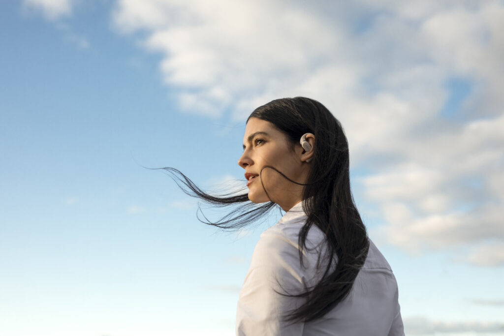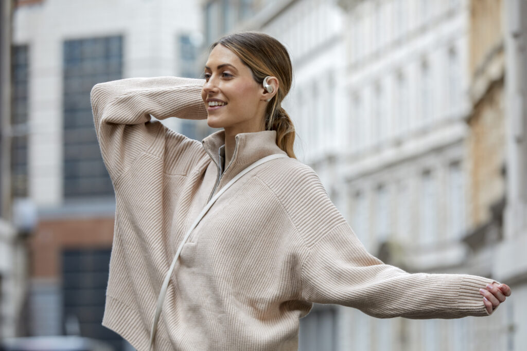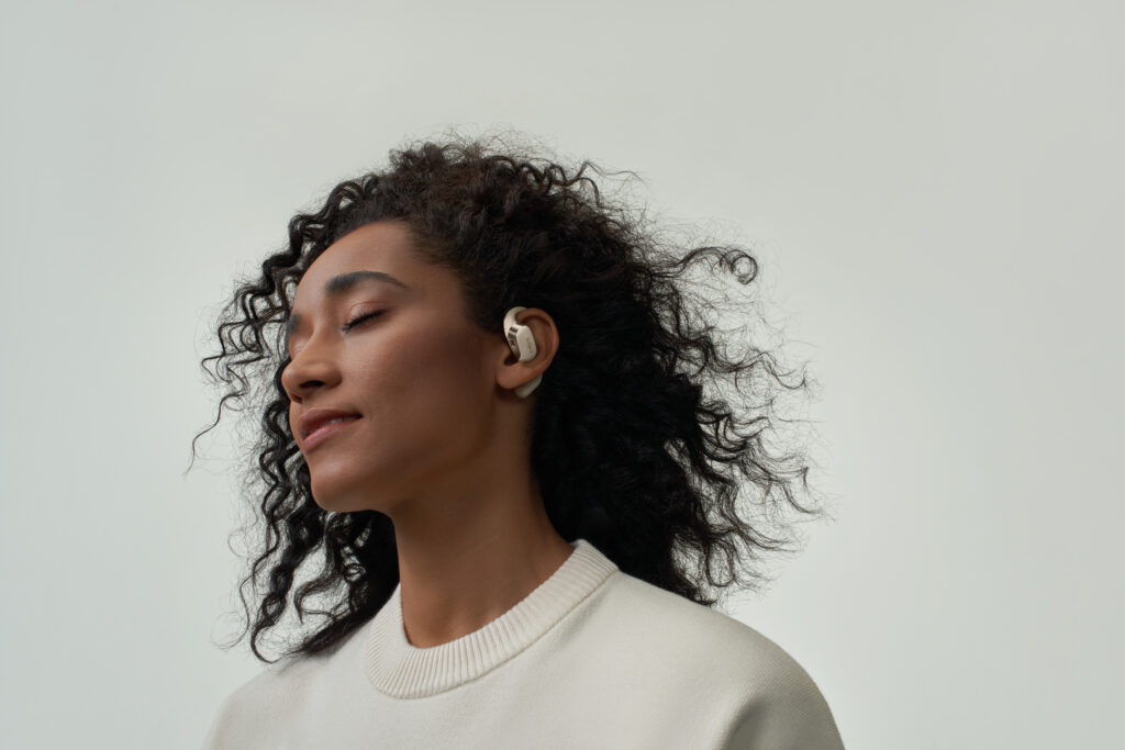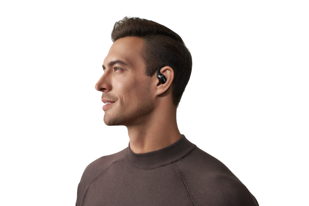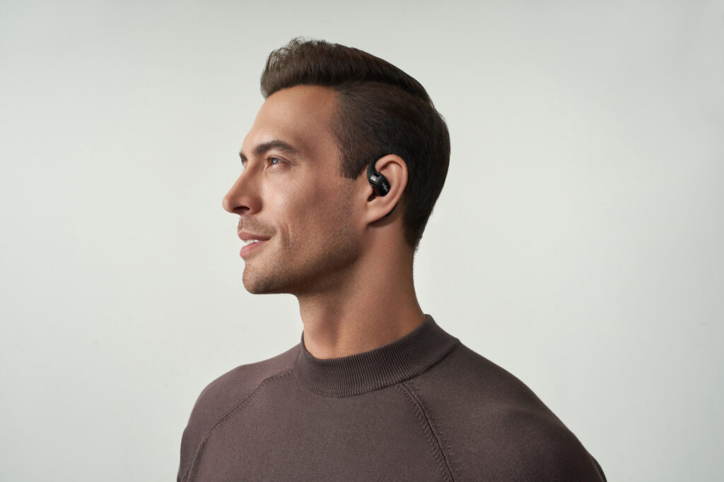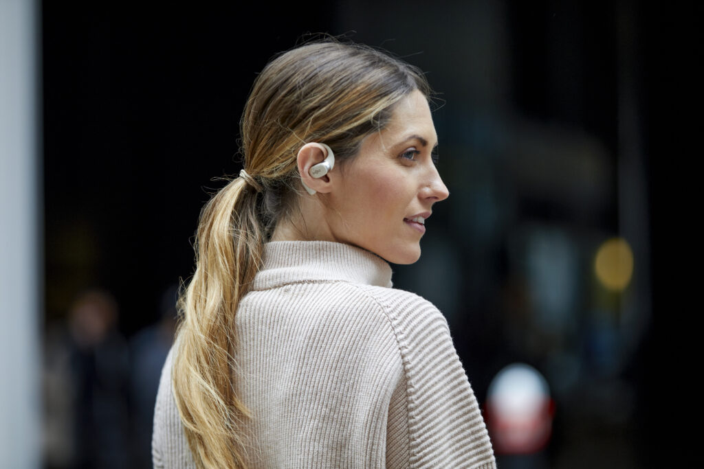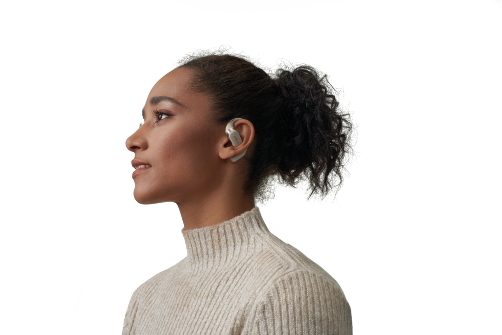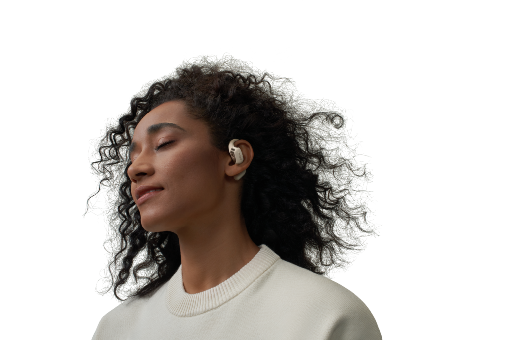 L’OpenFit se compose d’un crochet en forme de dauphin maintenant un coussin au-dessus du conduit auditif. Résultat : un son immersif sans obstruction physique de l’oreille. Les bruits environnants restent ainsi parfaitement audibles.