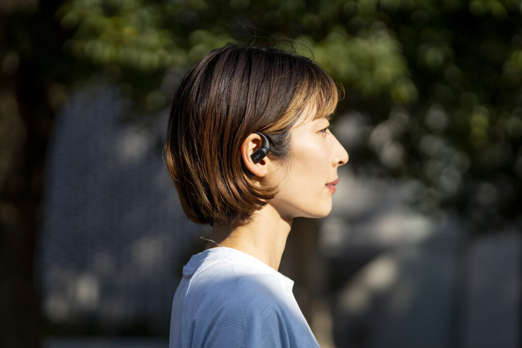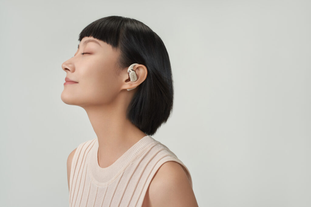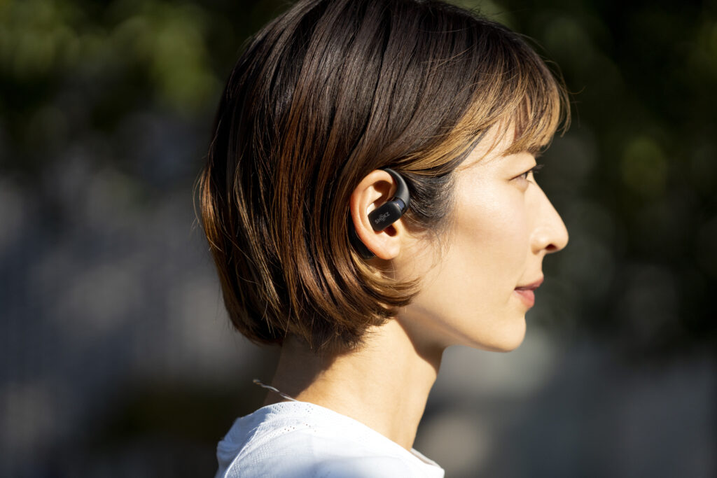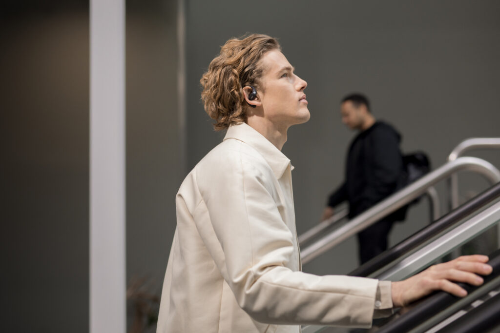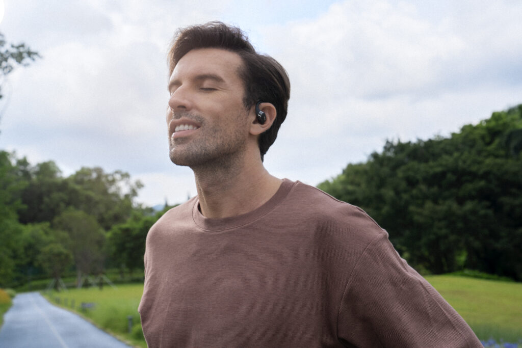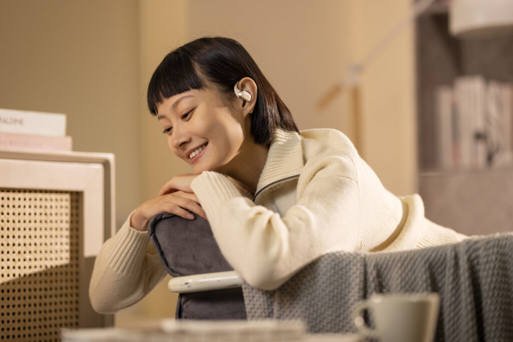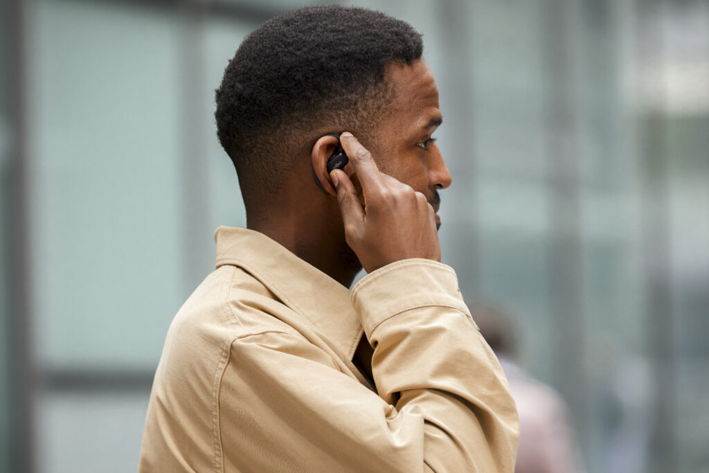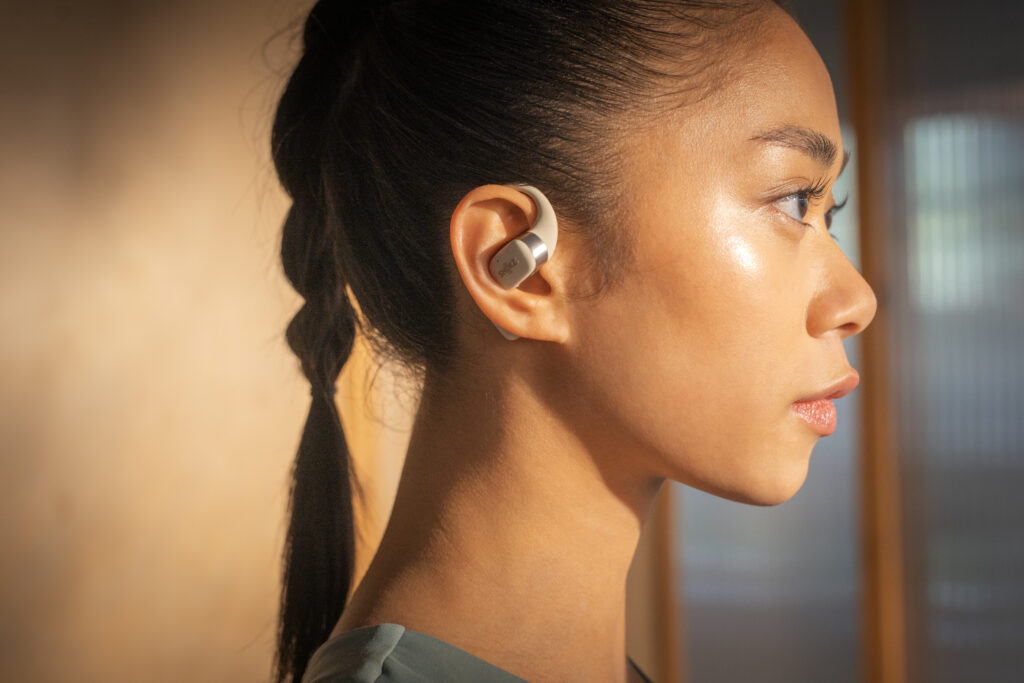 L’OpenFit se compose d’un crochet en forme de dauphin maintenant un coussin au-dessus du conduit auditif. Résultat : un son immersif sans obstruction physique de l’oreille. Les bruits environnants restent ainsi parfaitement audibles.
