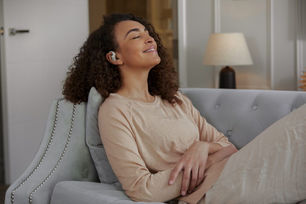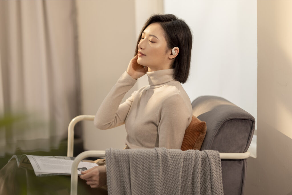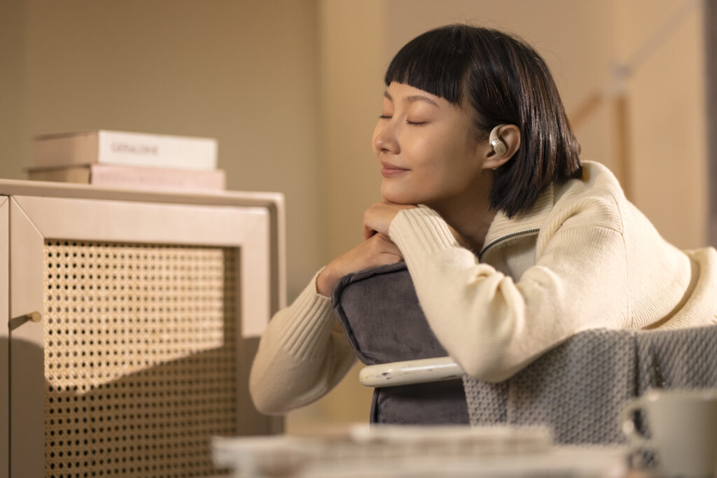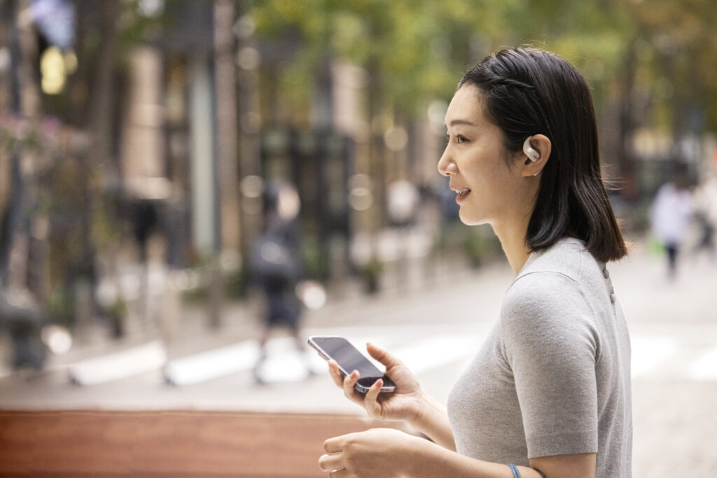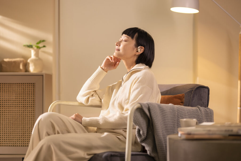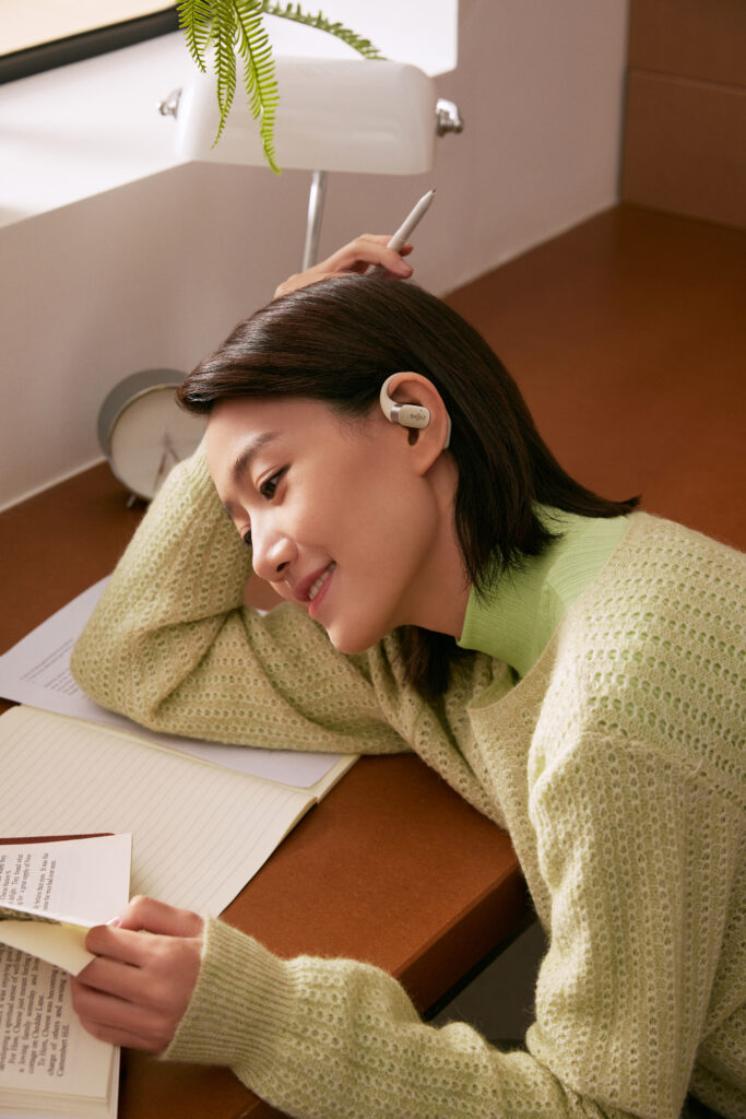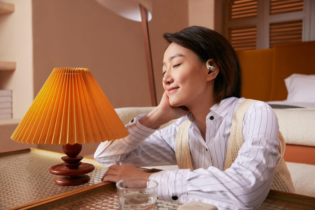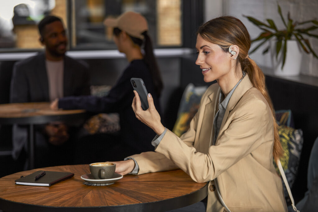 L’OpenFit se compose d’un crochet en forme de dauphin maintenant un coussin au-dessus du conduit auditif. Résultat : un son immersif sans obstruction physique de l’oreille. Les bruits environnants restent ainsi parfaitement audibles.