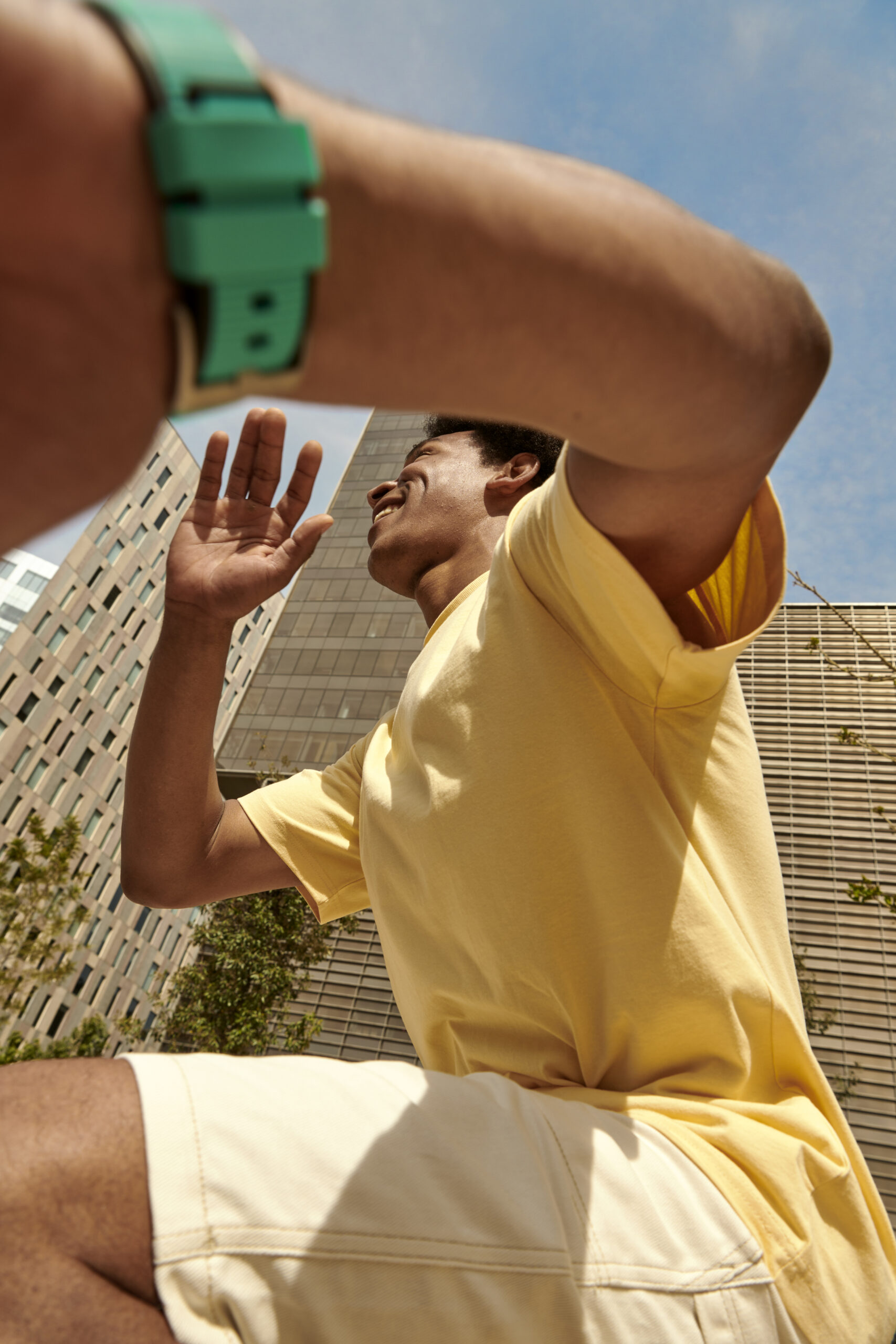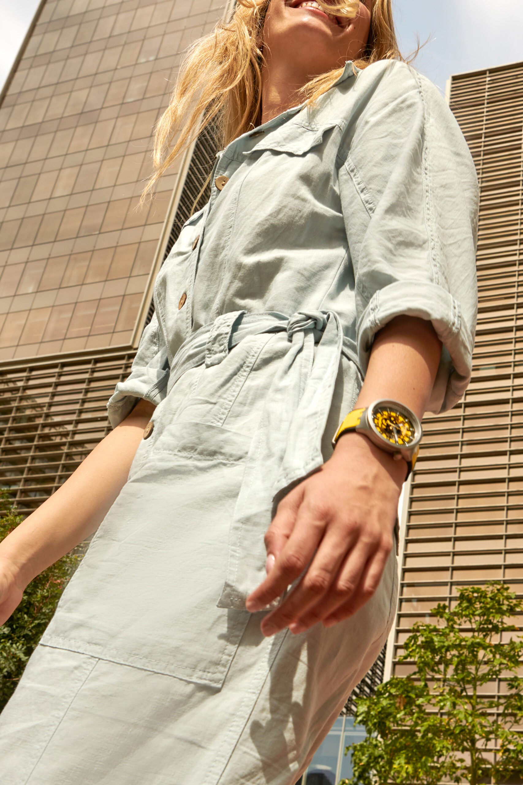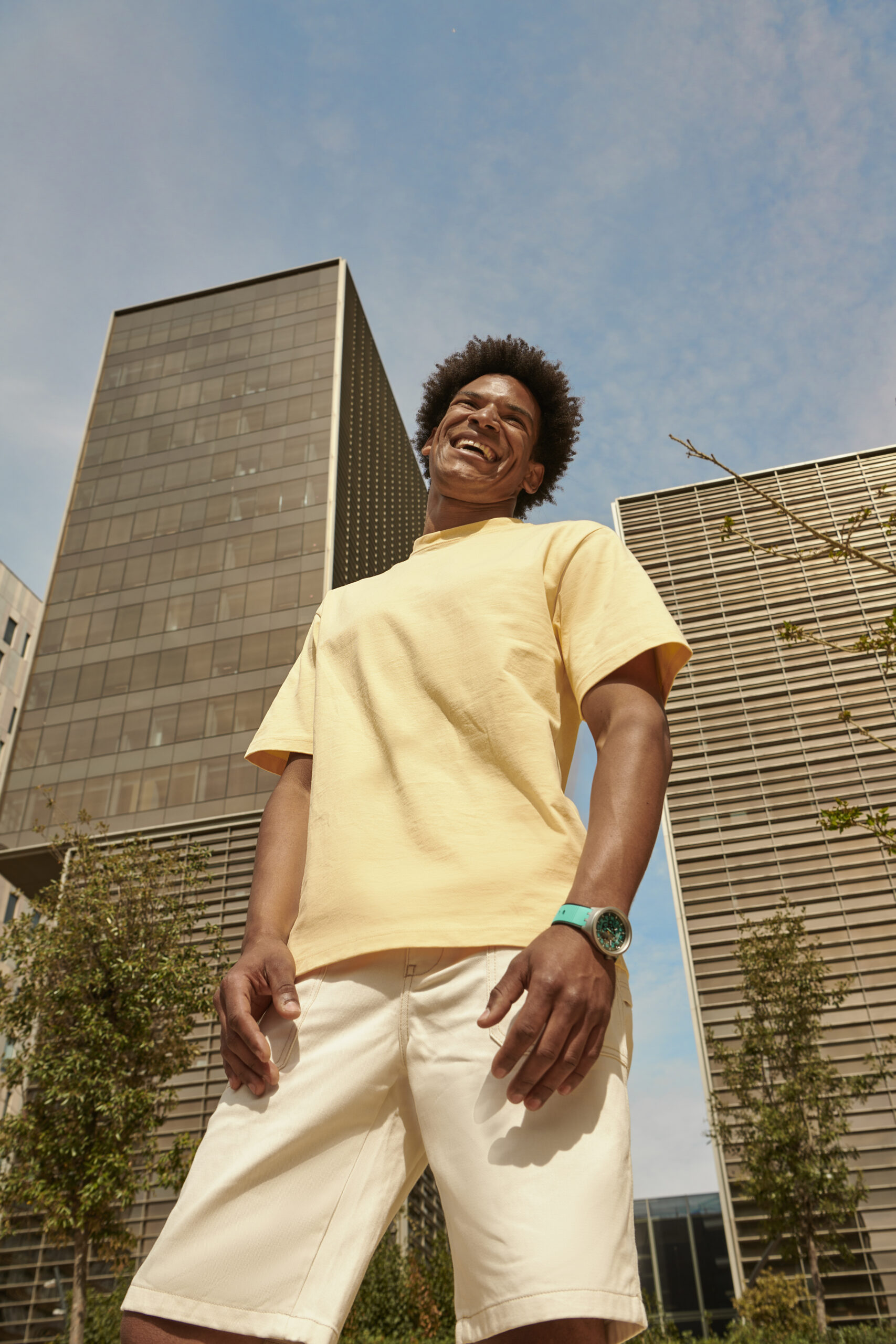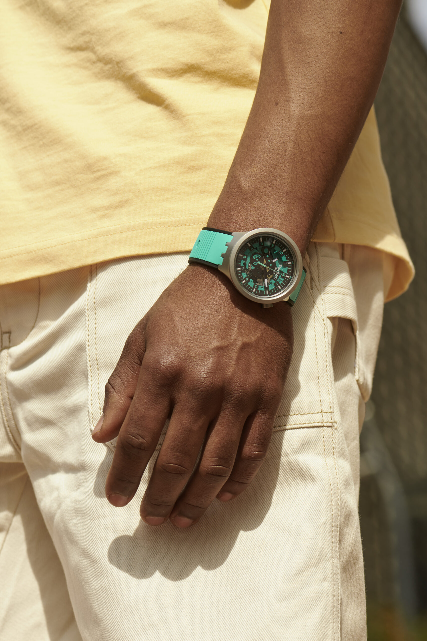 La plaque de cadran en biocéramique ajoute une dimension organique et une touche de couleur pop acidulée. Tandis que le bracelet en caoutchouc insuffle légèreté et confort au poignet. L’association de ces trois éléments génère un style unique.