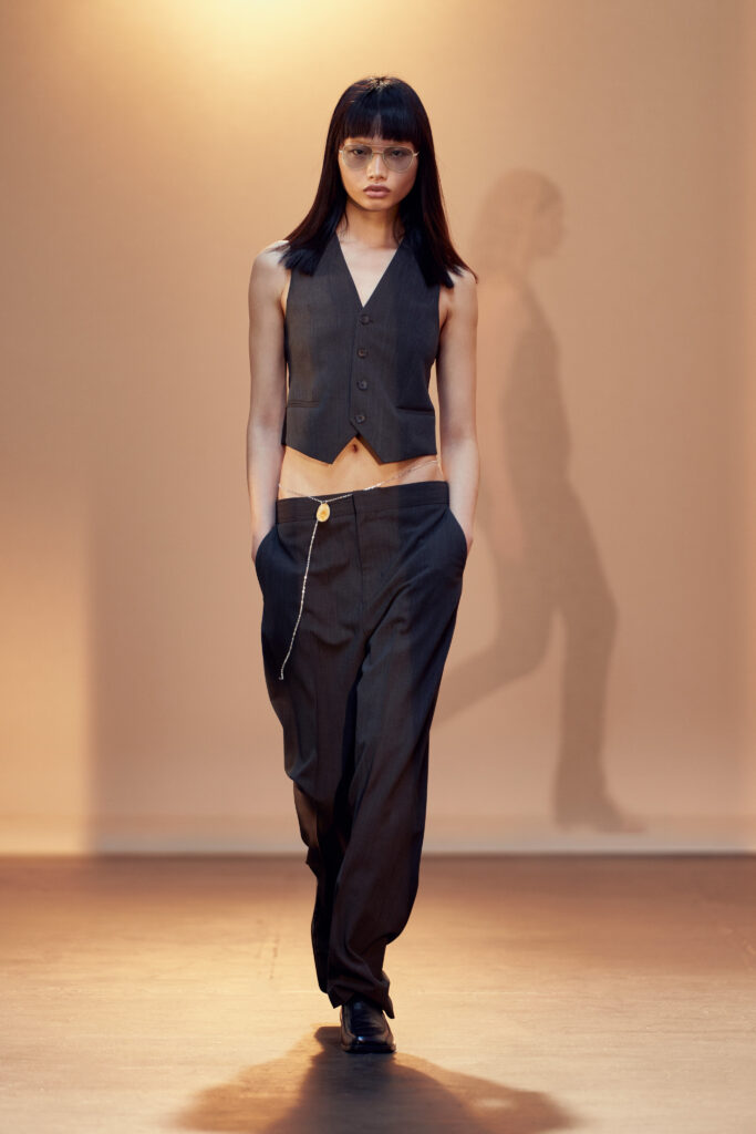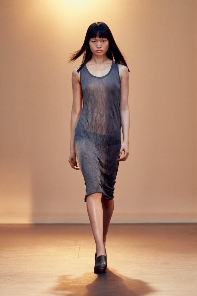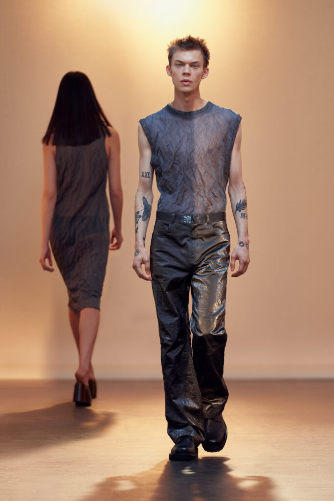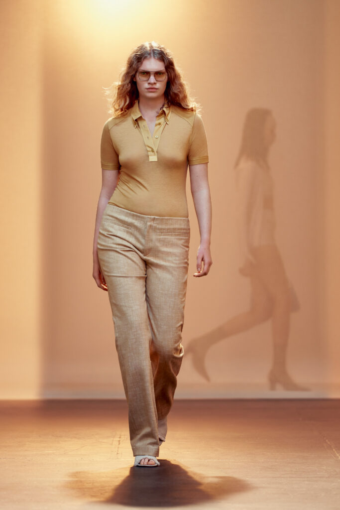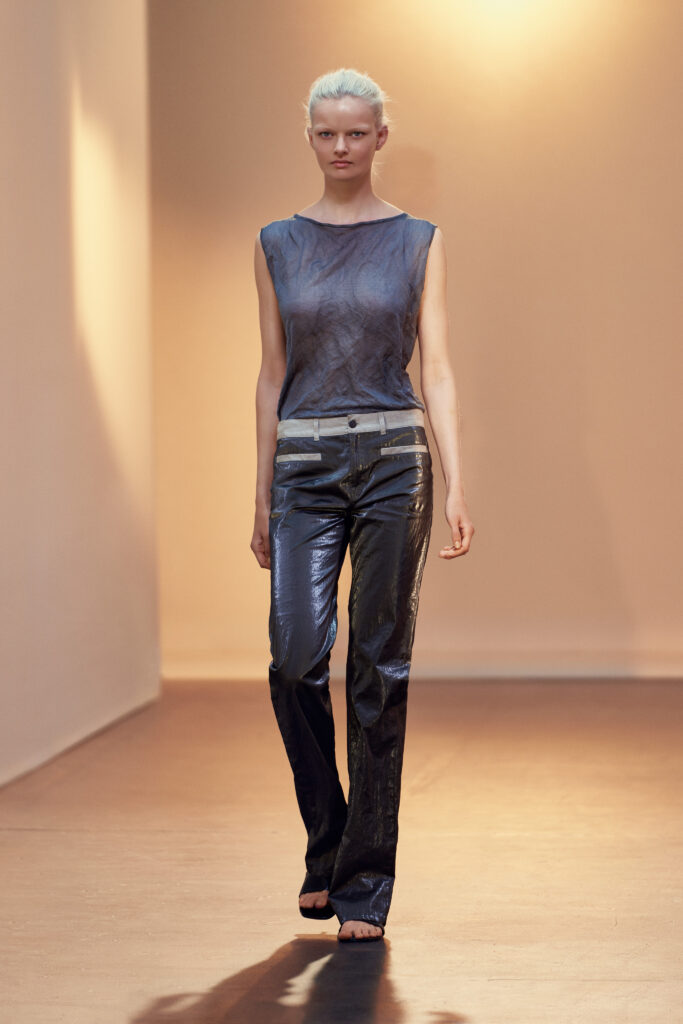 La collection PE24 juxtapose ces références ancrées dans le temps avec des tissus qui portent l’éclat du futur. Les pantalons sont en lin brut recouvert d’une couche métallique qui leur donne un éclat vinylique, tandis que les débardeurs et les robes sont réalisés dans un mélange acier-viscose froissé mais doux, offrant une qualité tactile presque industrielle. Cette saison voit également l’introduction de Re:sourced Crepe**, un nouveau tissu recyclé et renouvelable fabriqué à partir d’une combinaison de déchets textiles et de cellulose de bois, développé en collaboration avec Södra, Lenzing et Riopele – trois entreprises de premier plan dans le domaine des textiles durables.