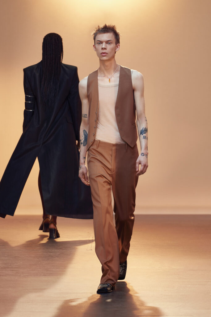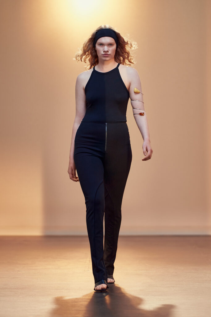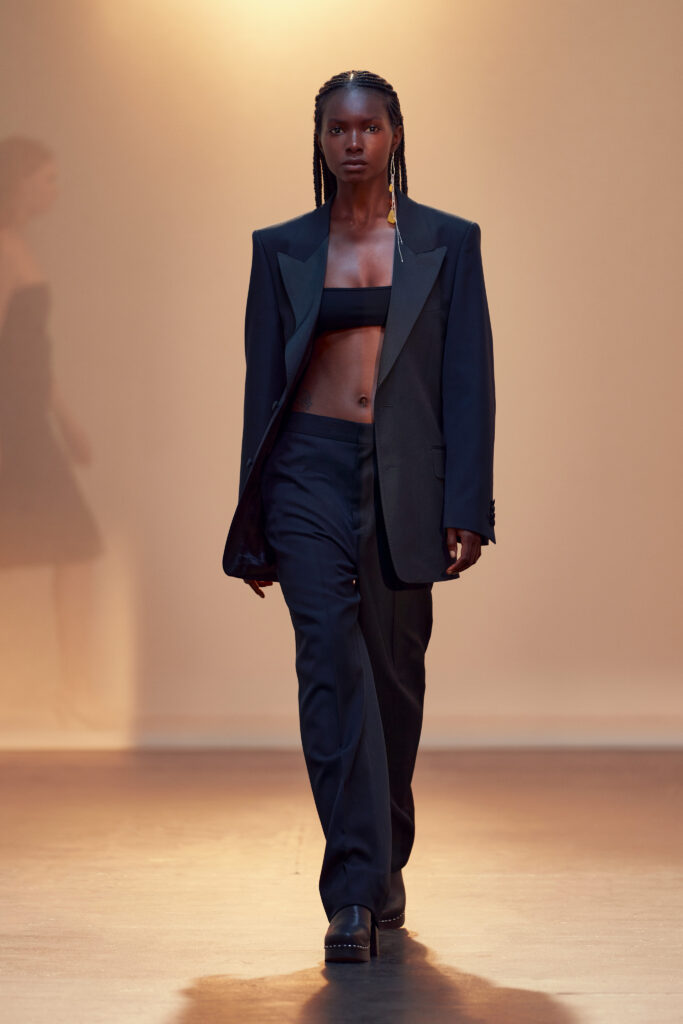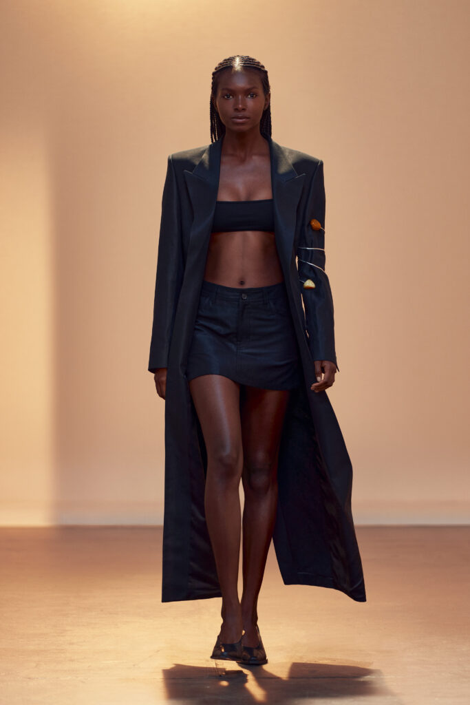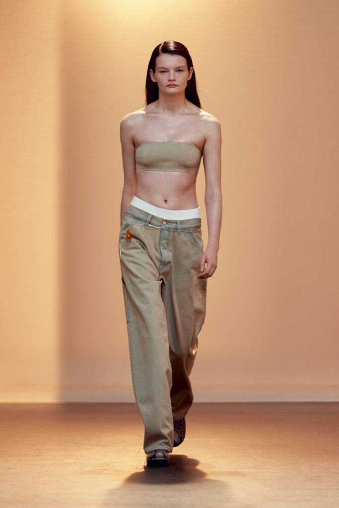 La collection PE24 juxtapose ces références ancrées dans le temps avec des tissus qui portent l’éclat du futur. Les pantalons sont en lin brut recouvert d’une couche métallique qui leur donne un éclat vinylique, tandis que les débardeurs et les robes sont réalisés dans un mélange acier-viscose froissé mais doux, offrant une qualité tactile presque industrielle. Cette saison voit également l’introduction de Re:sourced Crepe**, un nouveau tissu recyclé et renouvelable fabriqué à partir d’une combinaison de déchets textiles et de cellulose de bois, développé en collaboration avec Södra, Lenzing et Riopele – trois entreprises de premier plan dans le domaine des textiles durables.