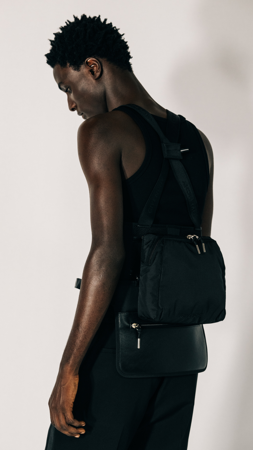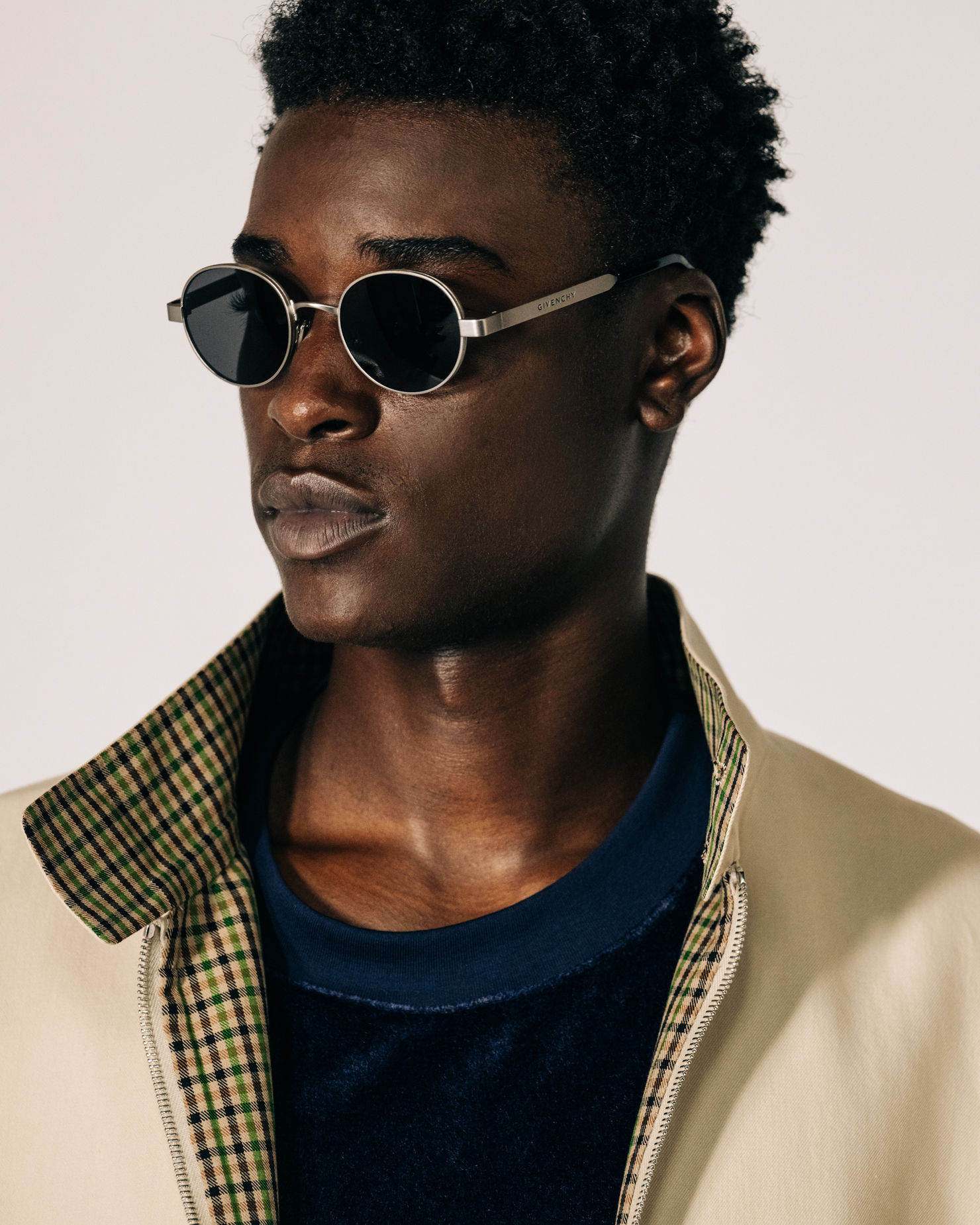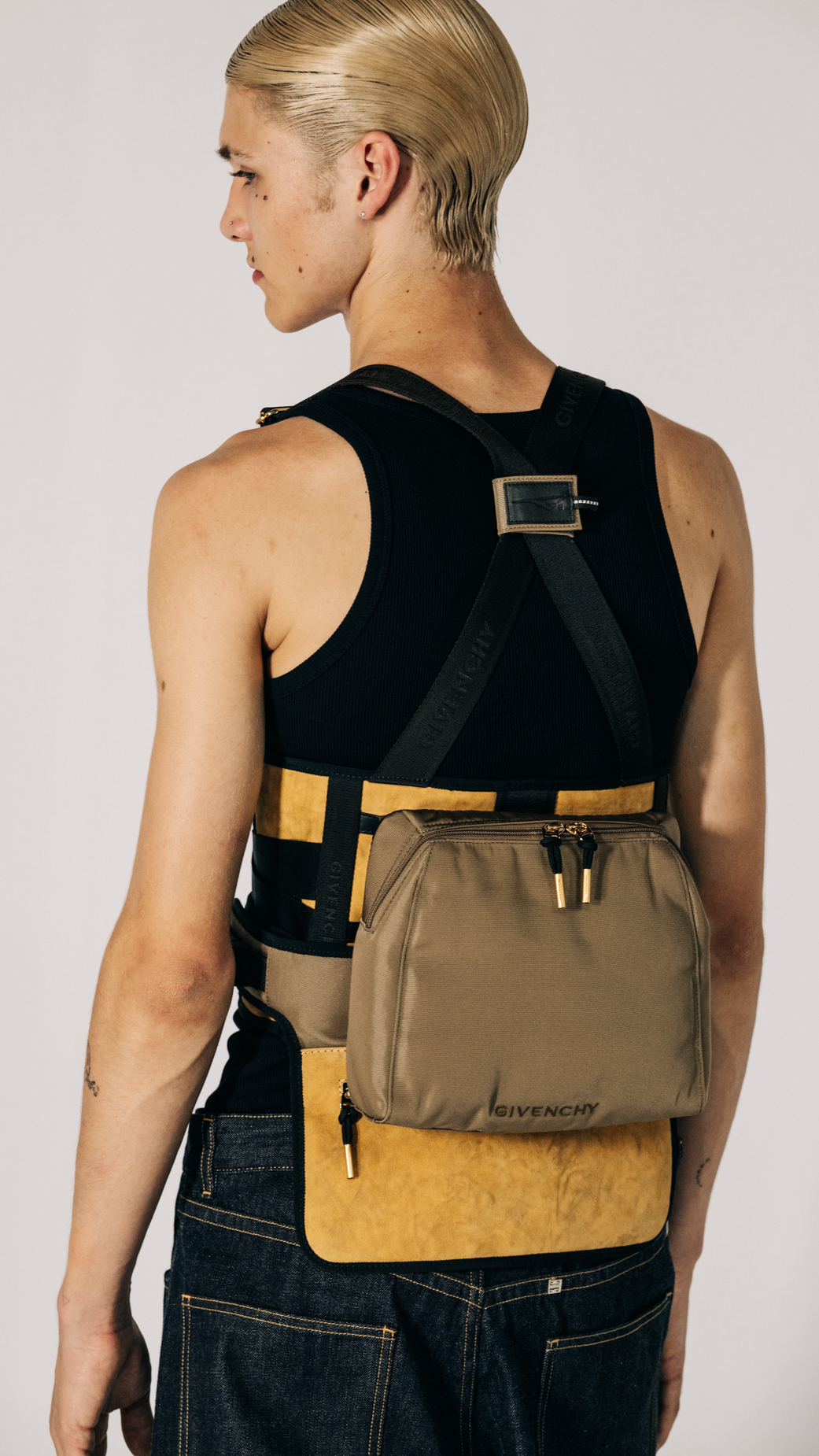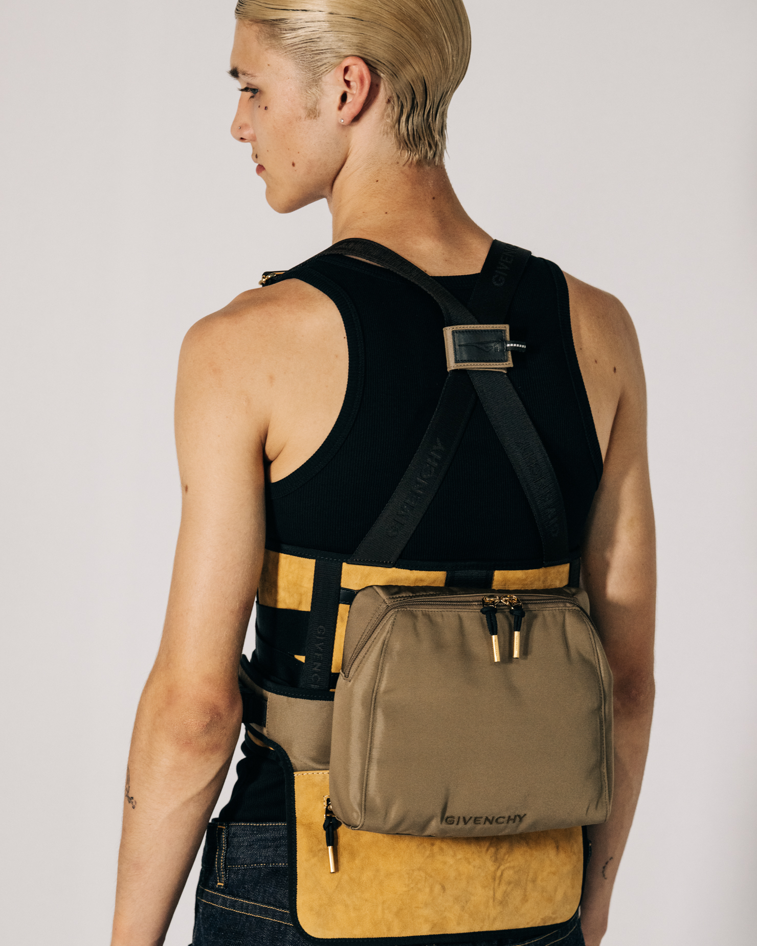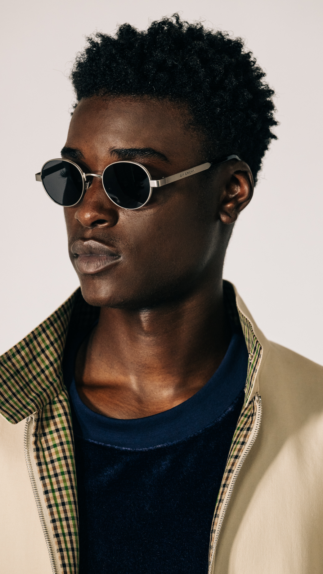 Des sacs techniques en daim, nylon et sangles soulignent une approche réelle et fonctionnelle de l’élégance. Les bijoux rendent hommage à Hubert de Givenchy avec des adaptations d’orchidées, l’une des fleurs préférées du fondateur, soulignant le cœur artisanal de la collection. Les lunettes de soleil réinterprètent des formes classiques dans des montures ovales minimalistes en métal mat.
