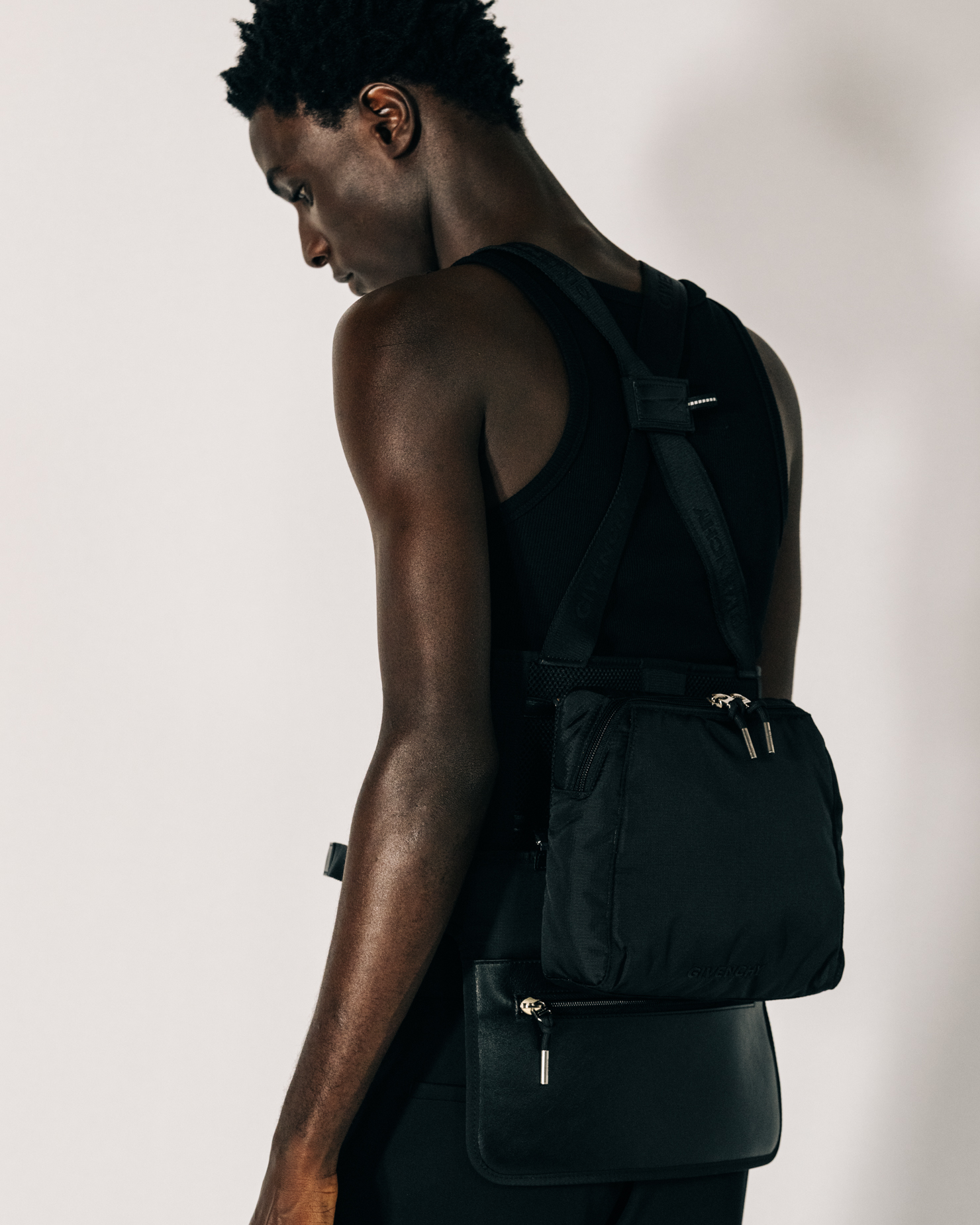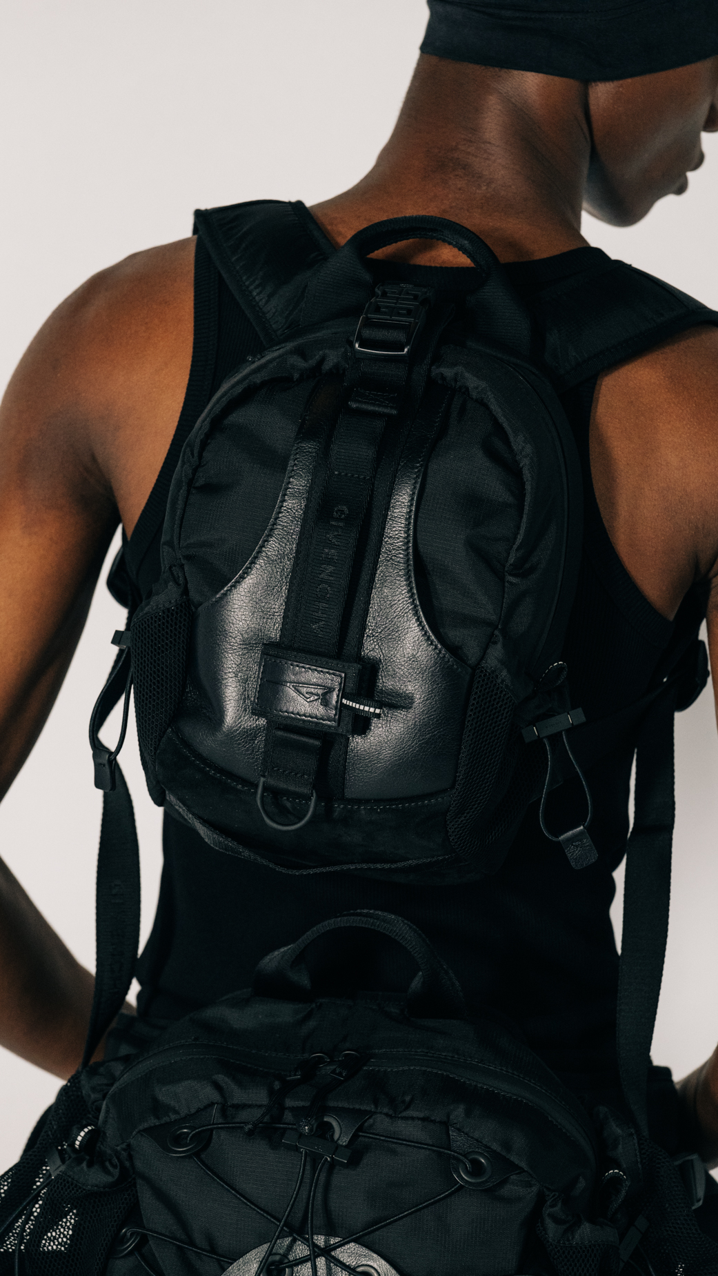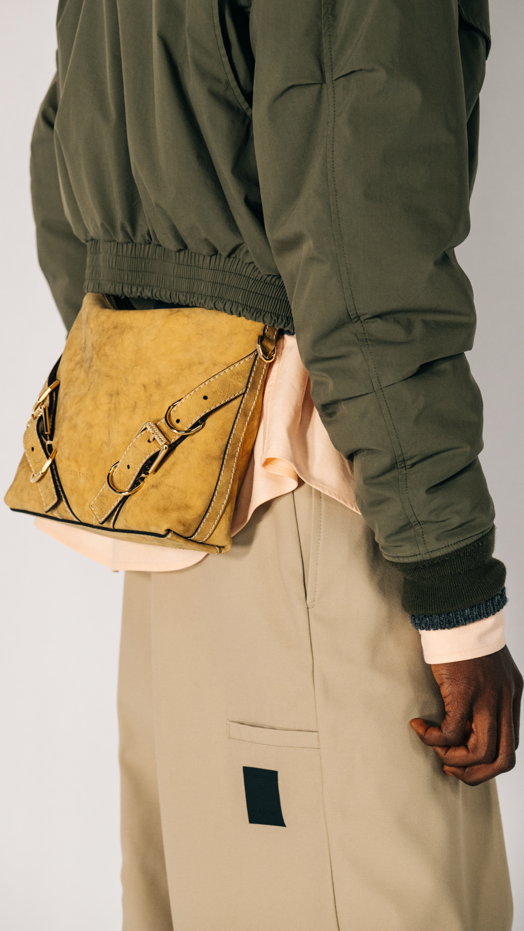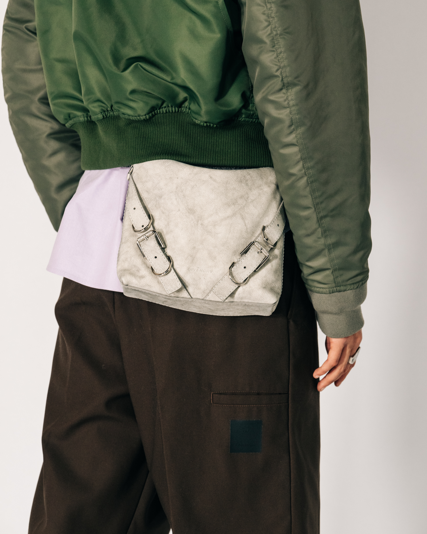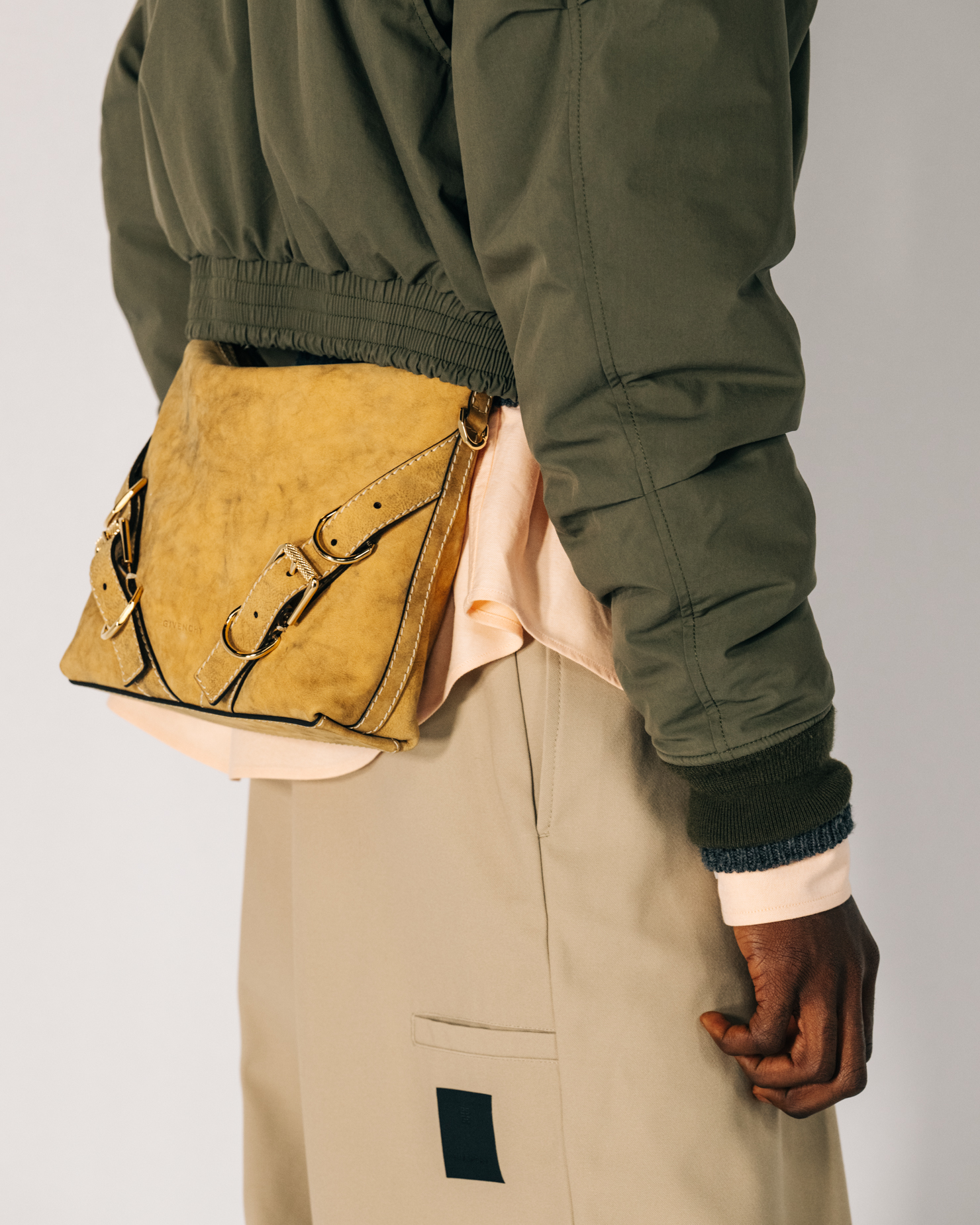 Des sacs techniques en daim, nylon et sangles soulignent une approche réelle et fonctionnelle de l’élégance. Les bijoux rendent hommage à Hubert de Givenchy avec des adaptations d’orchidées, l’une des fleurs préférées du fondateur, soulignant le cœur artisanal de la collection. Les lunettes de soleil réinterprètent des formes classiques dans des montures ovales minimalistes en métal mat.