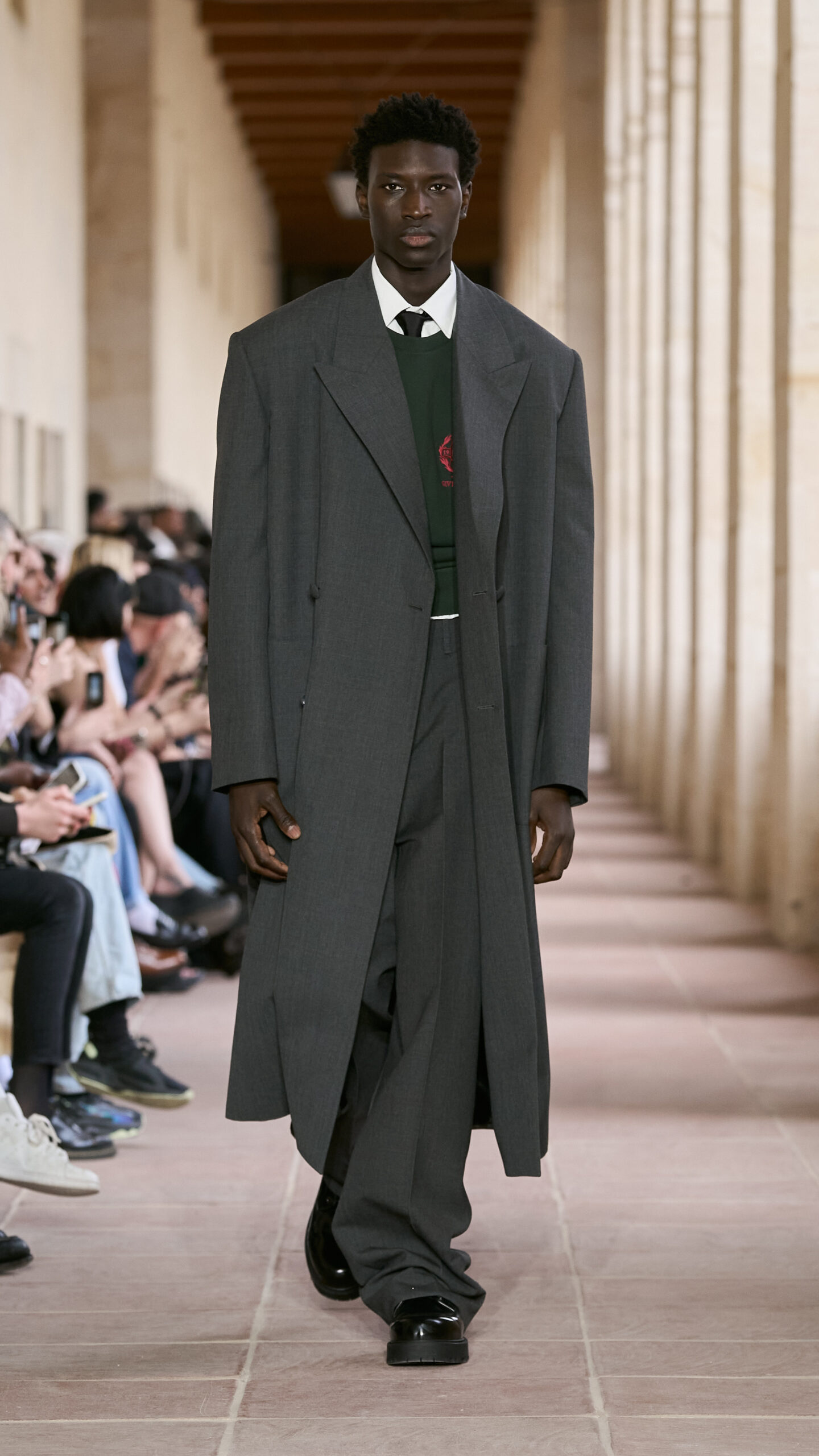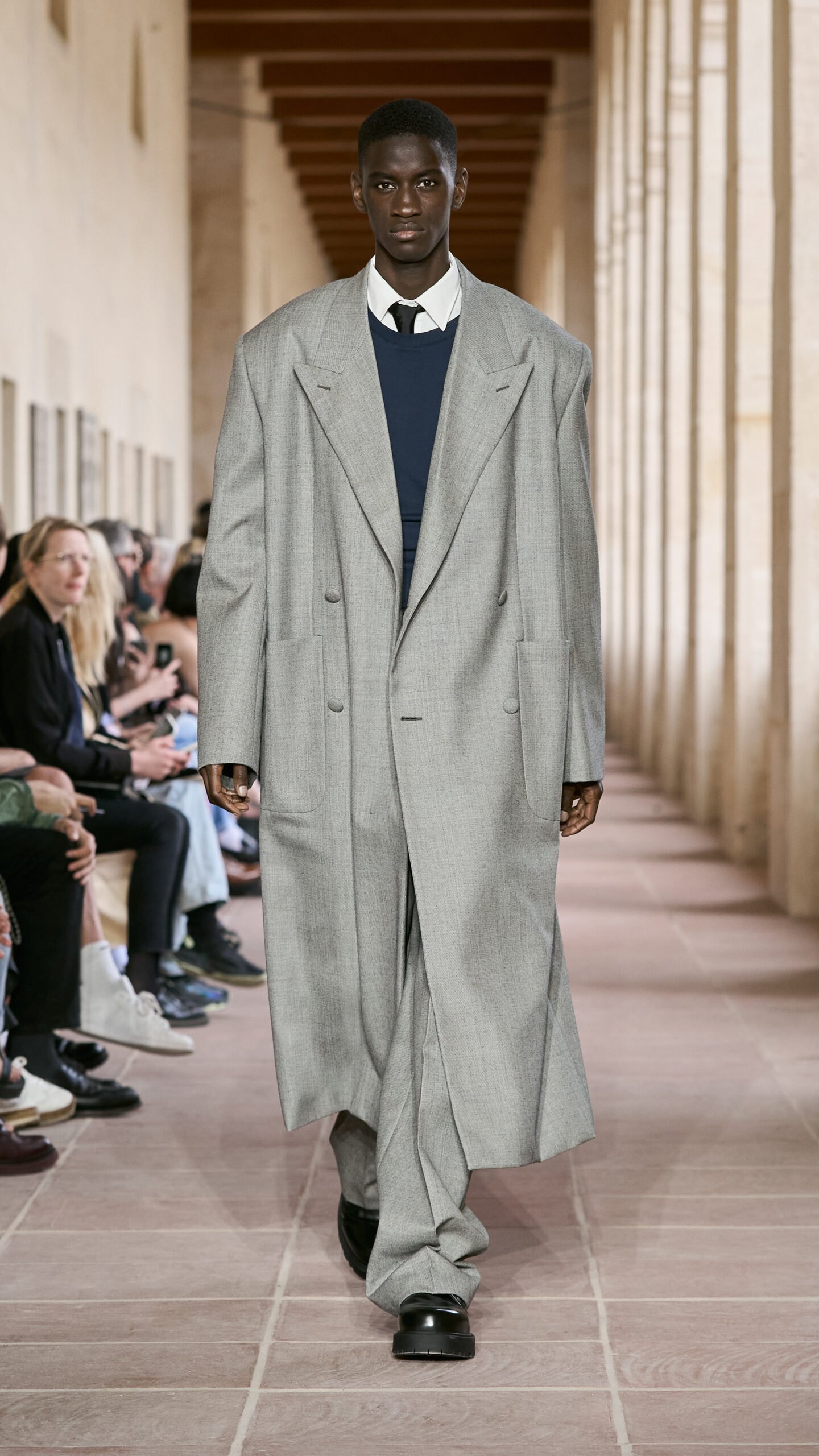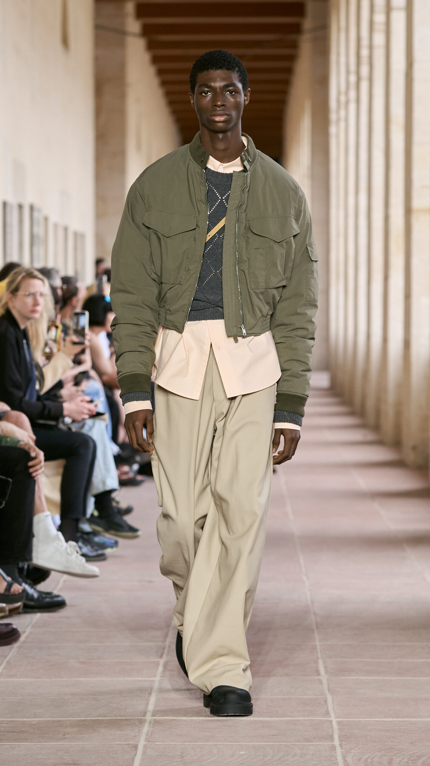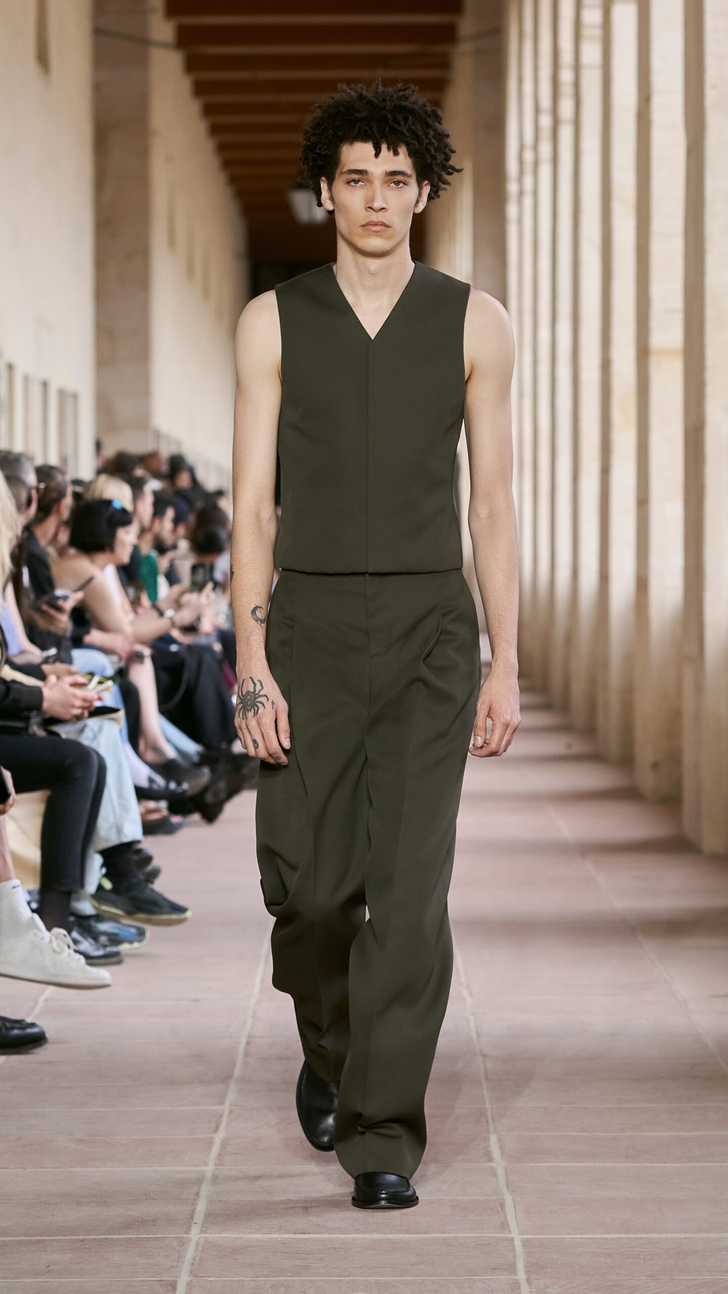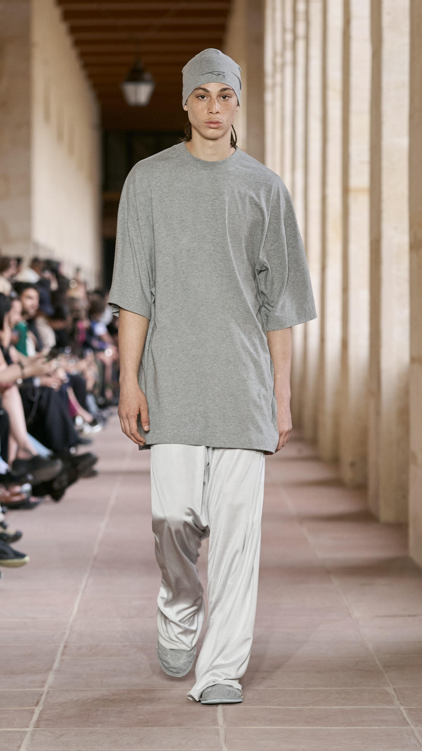 La silhouette évolue pour explorer les articles essentiels de la garde-robe, sublimés par des techniques de luxe. T-shirts longs, pièces en jersey, pantalons cargo larges et chinos surdimensionnés reflètent une idée de proportion réaliste. La texture, l’ajustement et le matériau se fusionnent pour créer une esthétique riche et multidimensionnelle, reflet d’une approche réfléchie de l’élégance masculine.