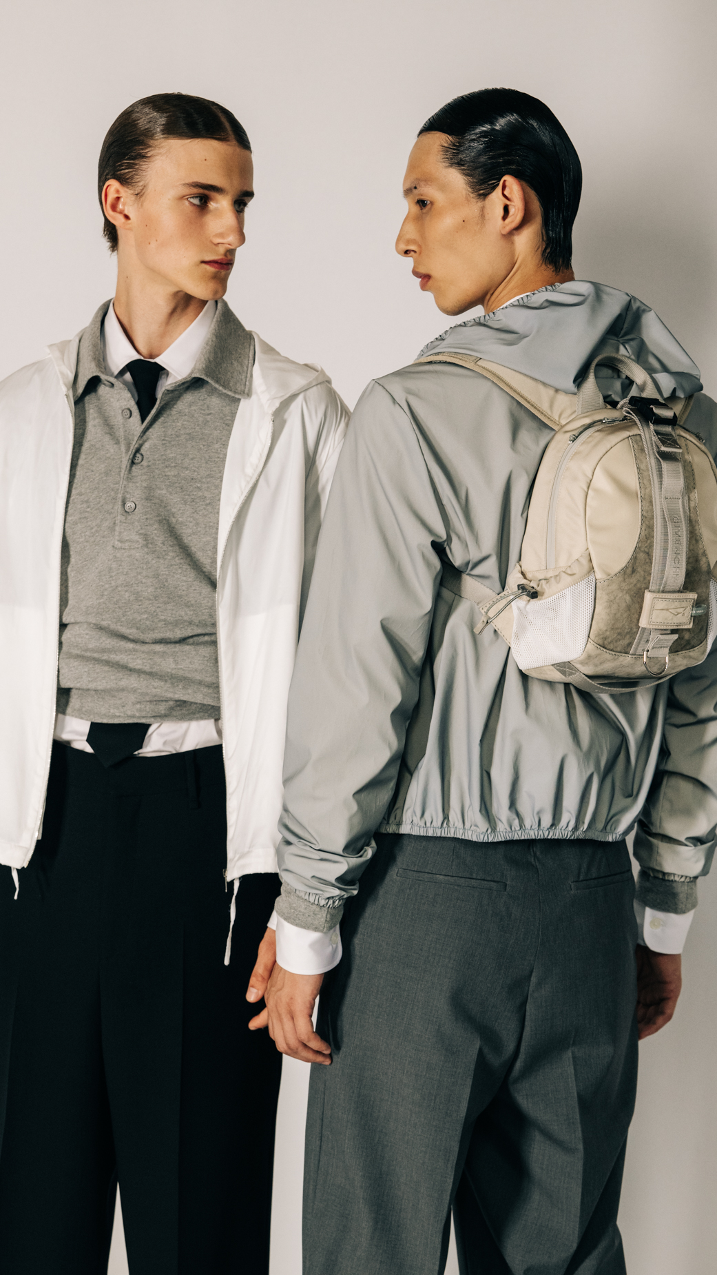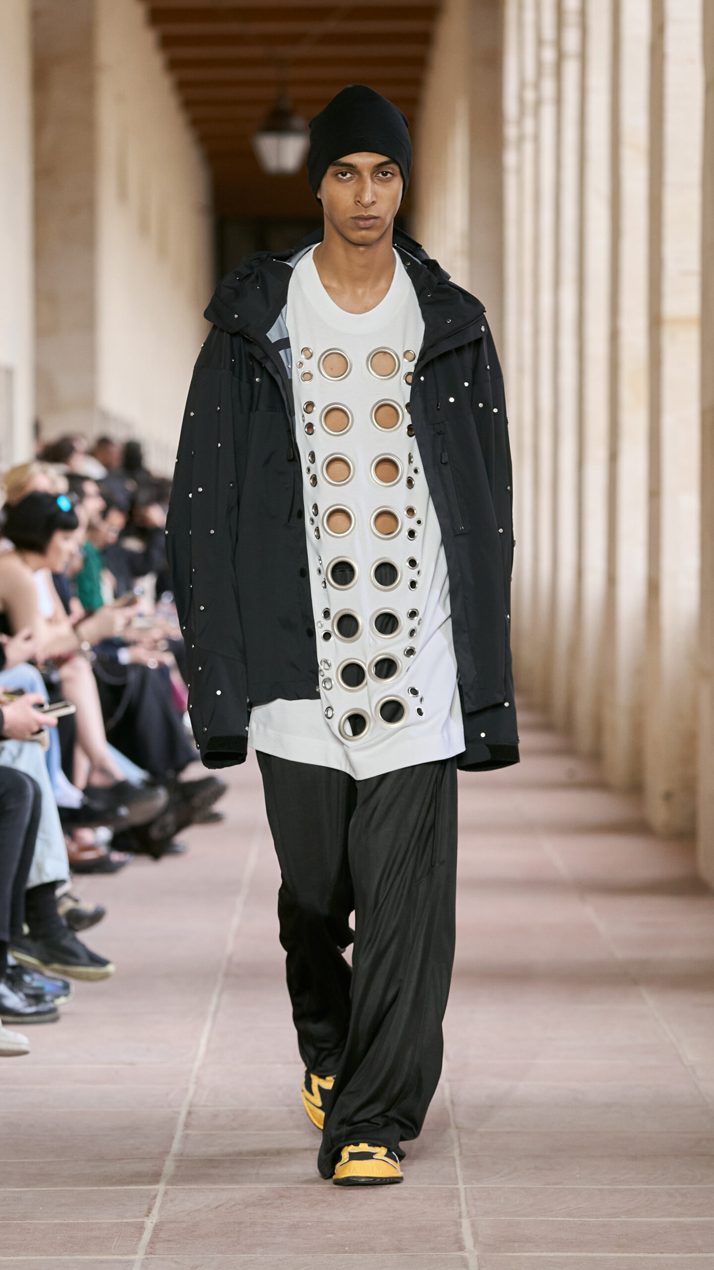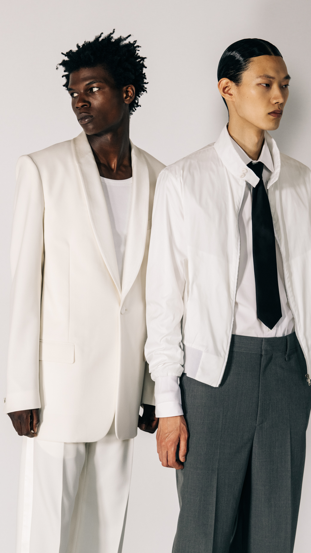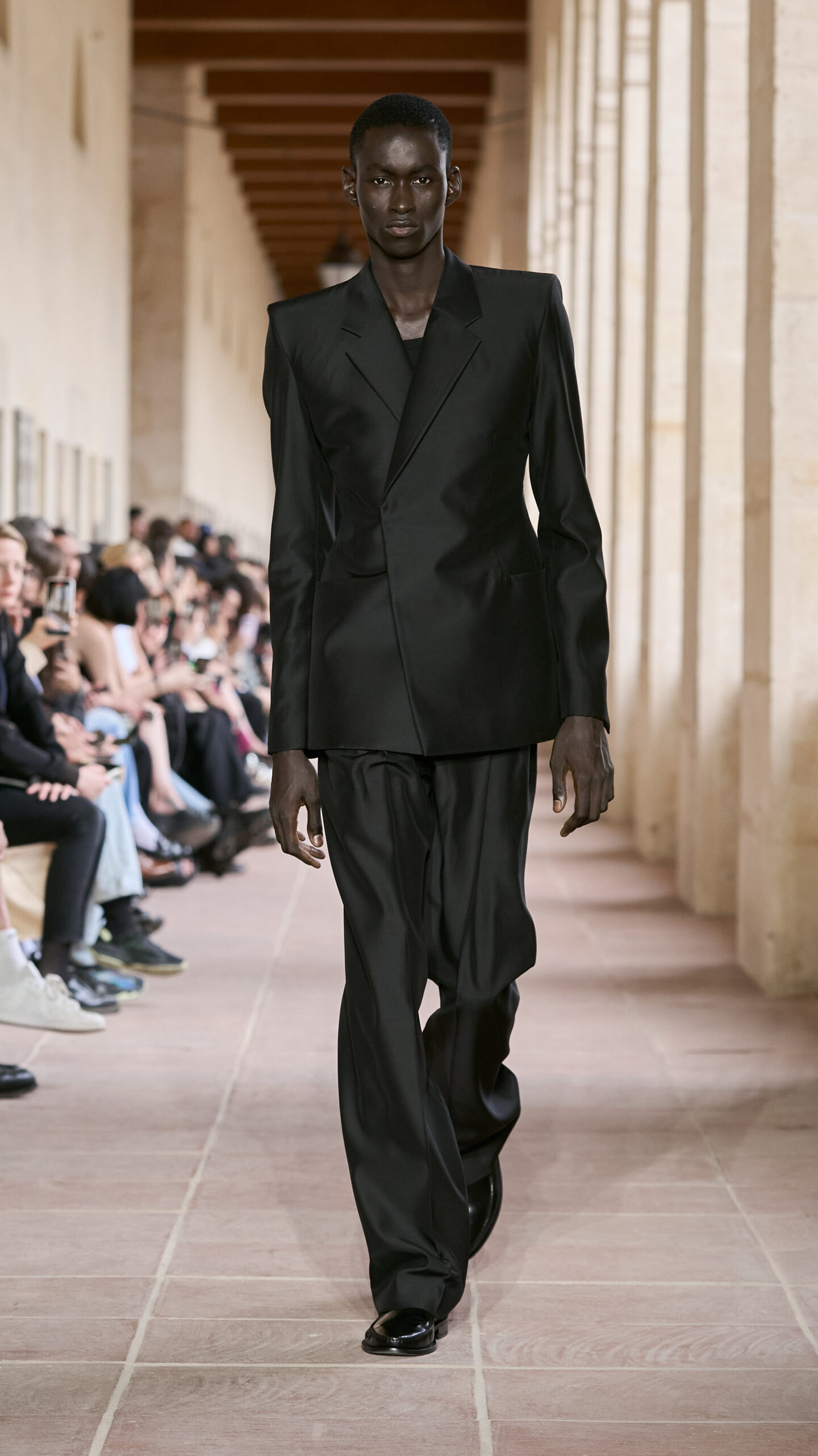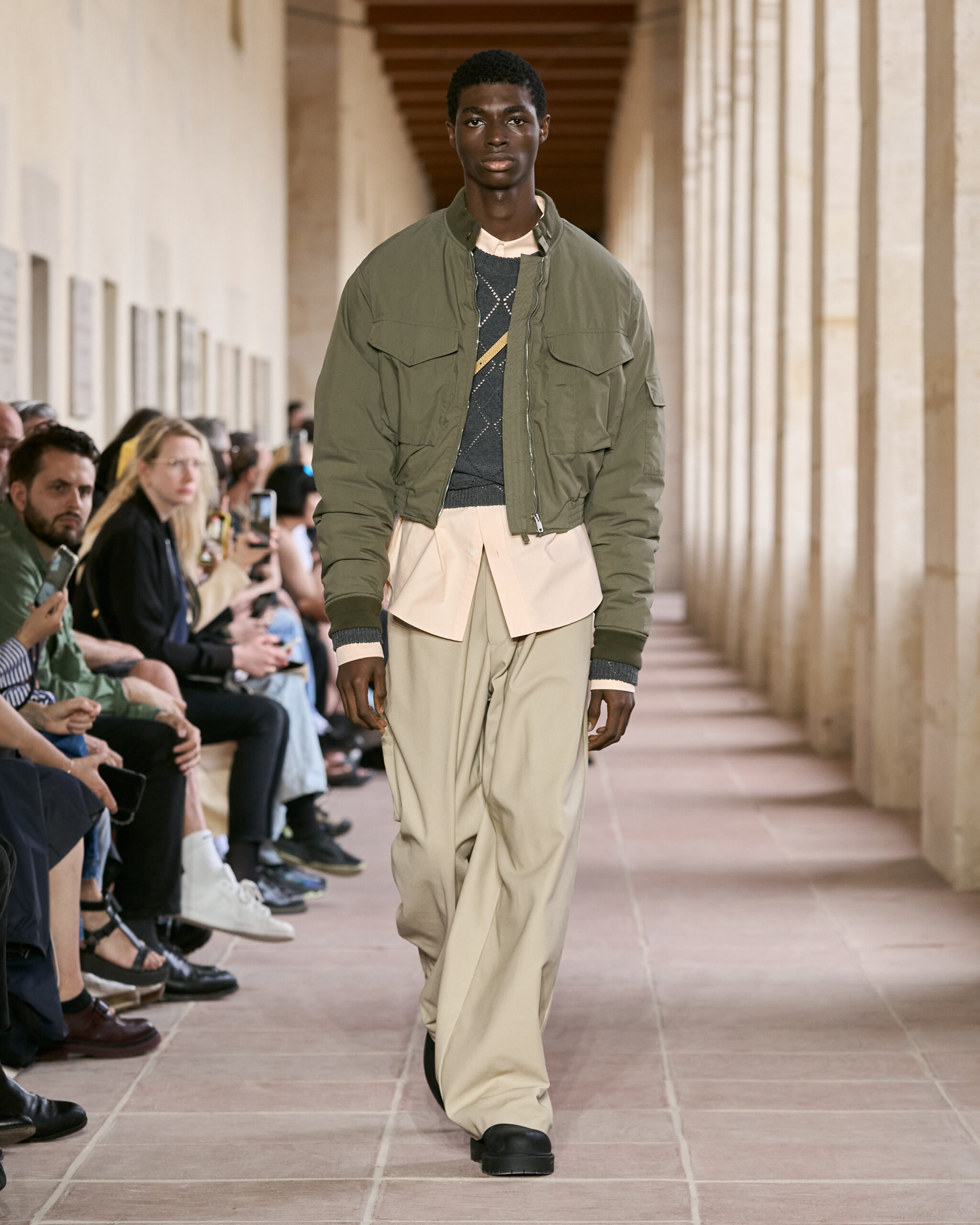 La silhouette évolue pour explorer les articles essentiels de la garde-robe, sublimés par des techniques de luxe. T-shirts longs, pièces en jersey, pantalons cargo larges et chinos surdimensionnés reflètent une idée de proportion réaliste. La texture, l’ajustement et le matériau se fusionnent pour créer une esthétique riche et multidimensionnelle, reflet d’une approche réfléchie de l’élégance masculine.