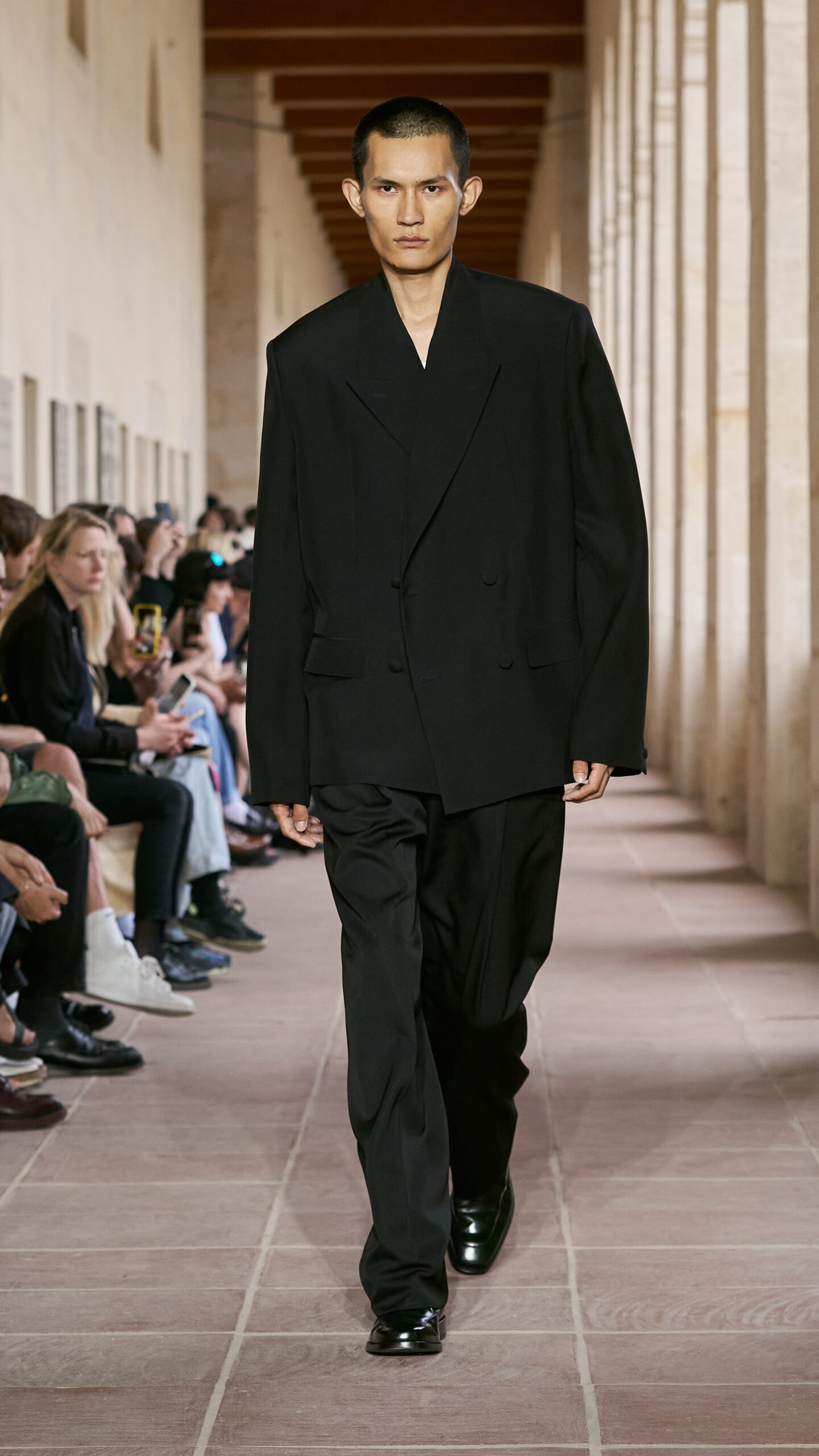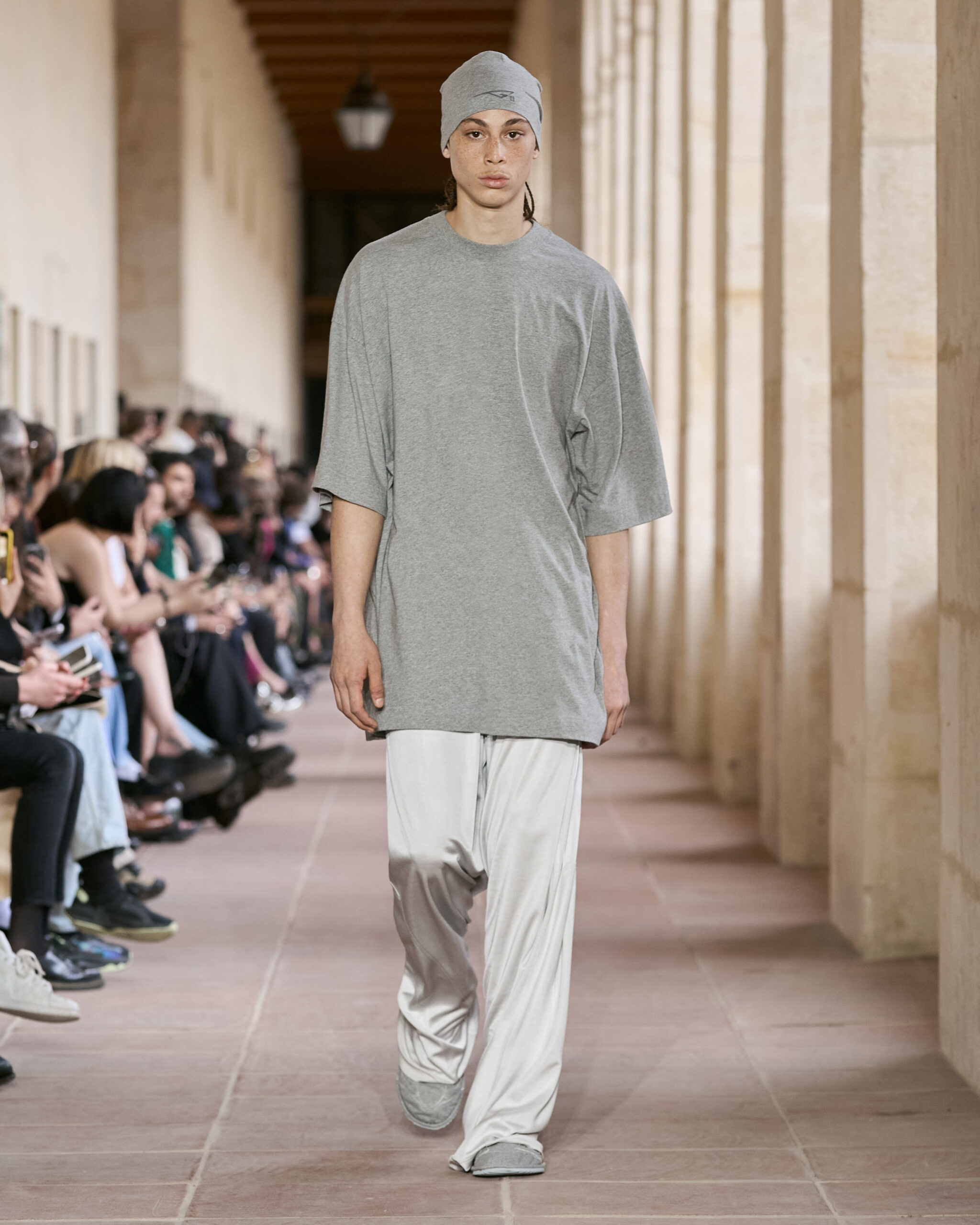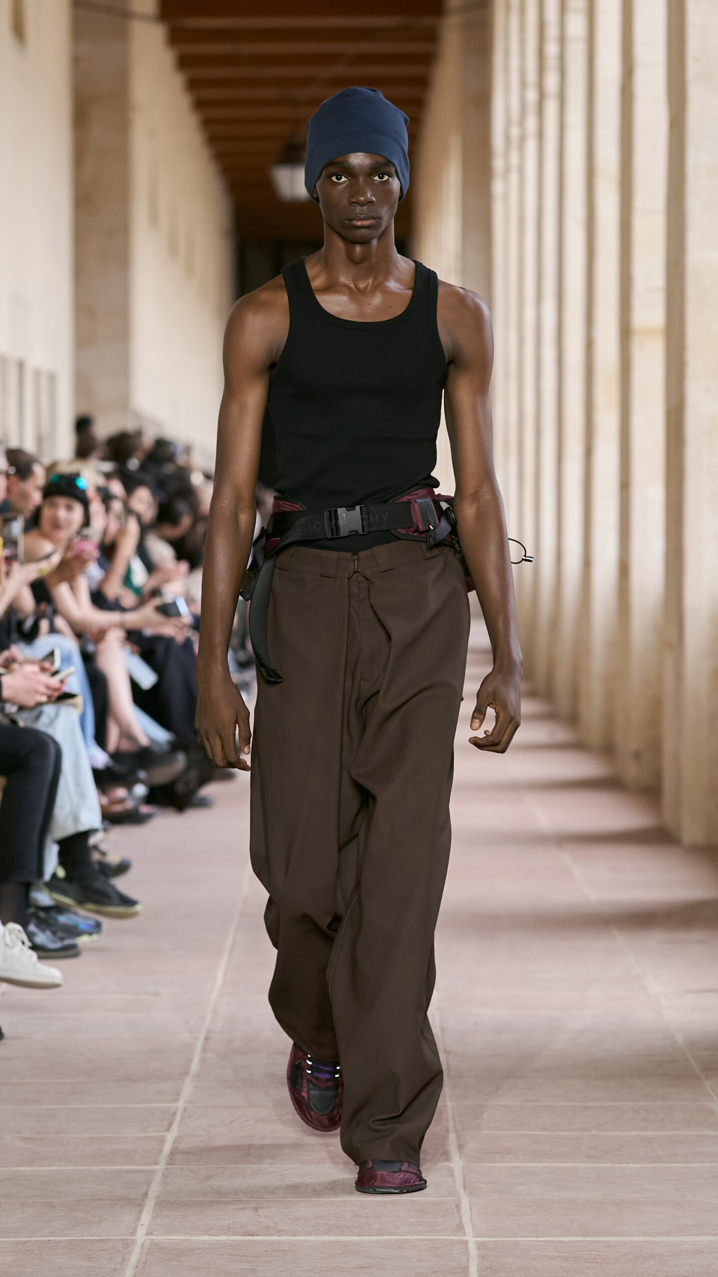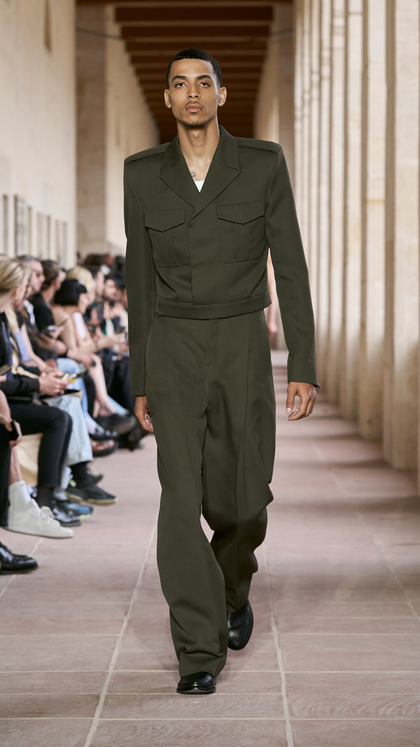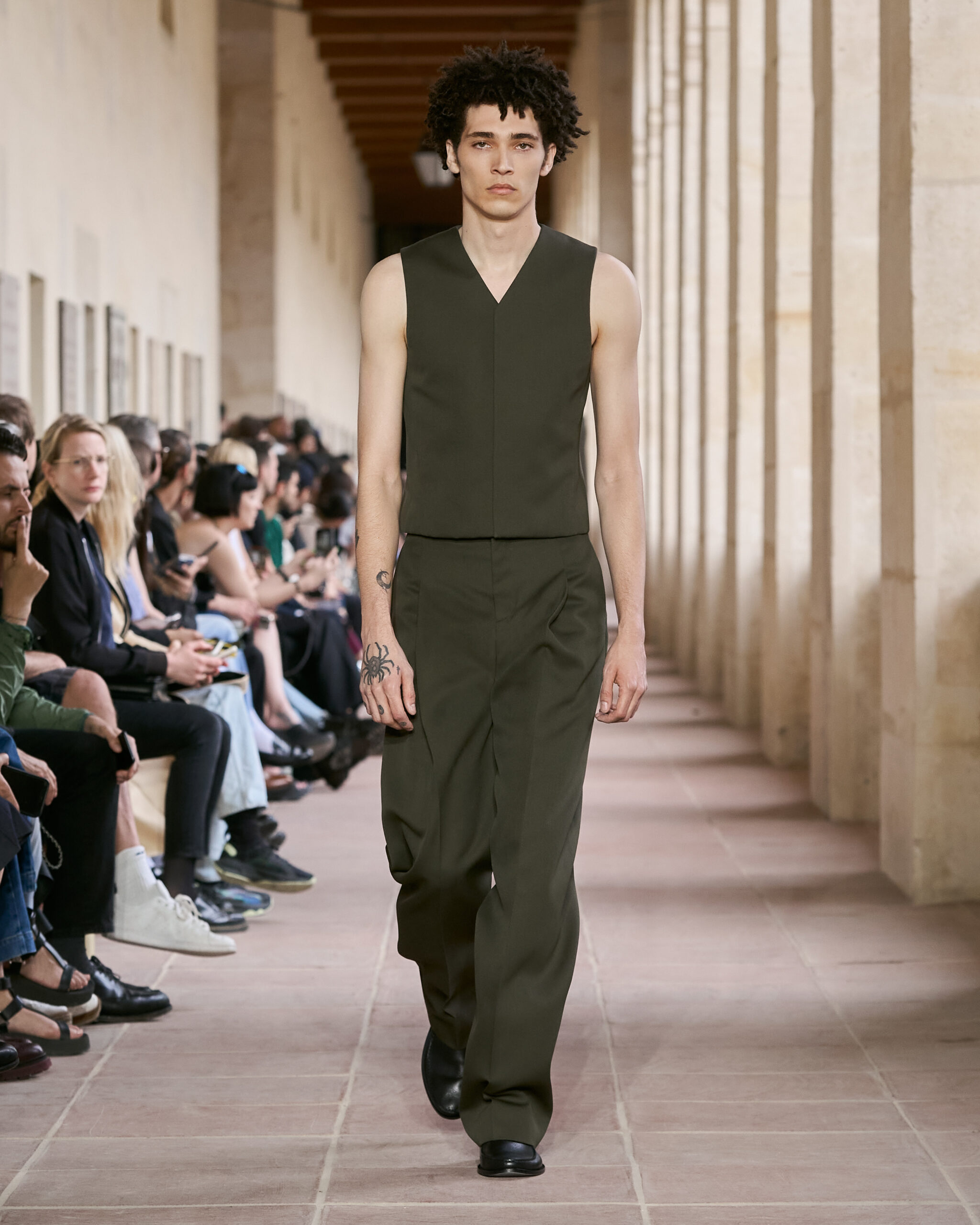 La silhouette évolue pour explorer les articles essentiels de la garde-robe, sublimés par des techniques de luxe. T-shirts longs, pièces en jersey, pantalons cargo larges et chinos surdimensionnés reflètent une idée de proportion réaliste. La texture, l’ajustement et le matériau se fusionnent pour créer une esthétique riche et multidimensionnelle, reflet d’une approche réfléchie de l’élégance masculine.