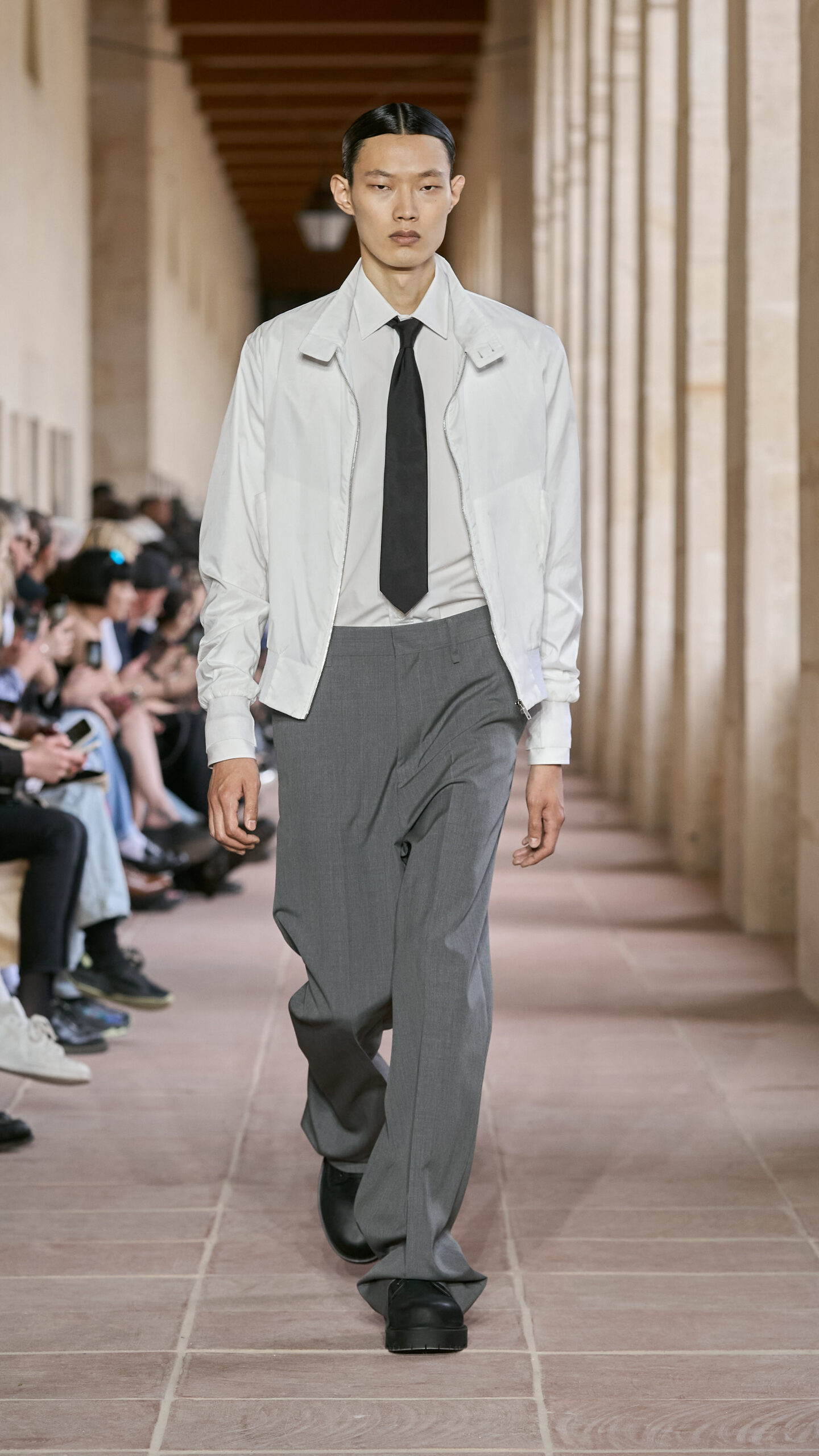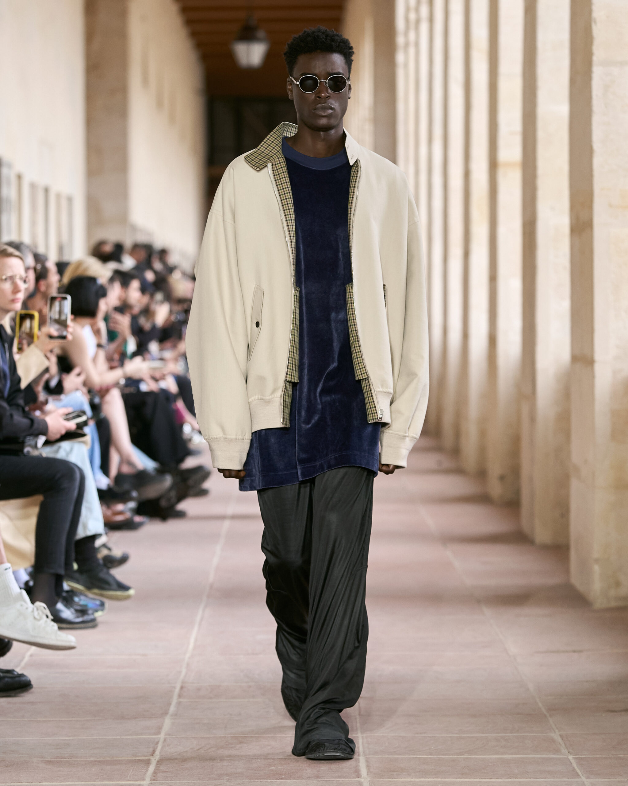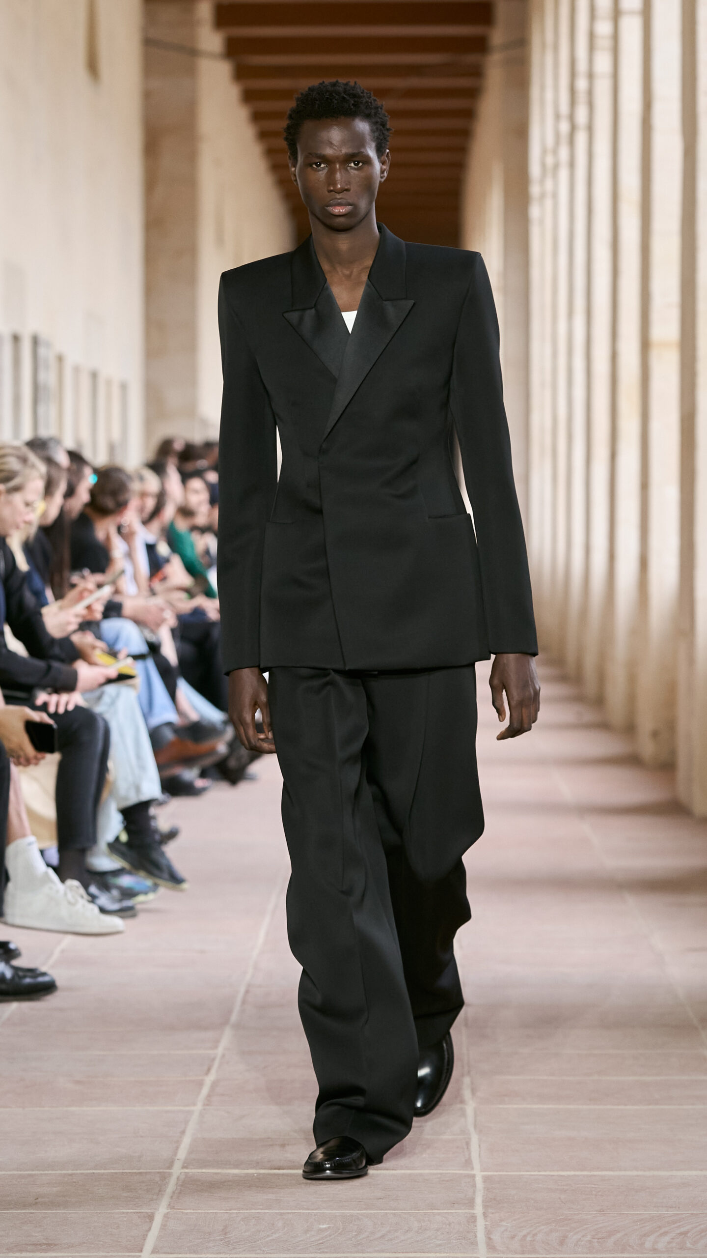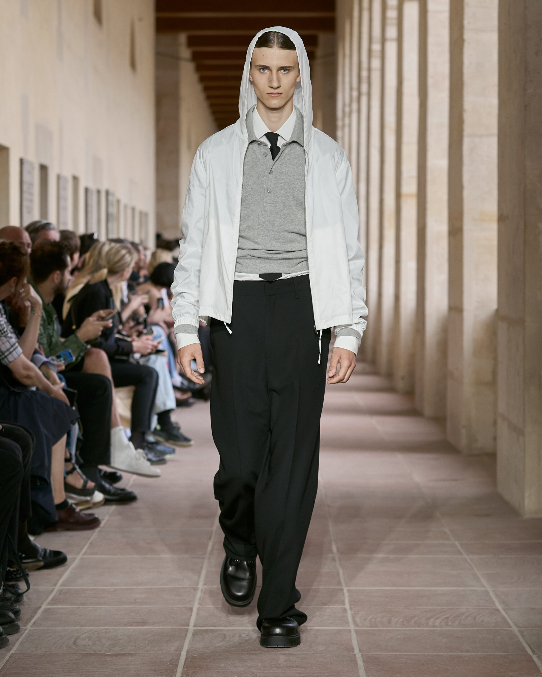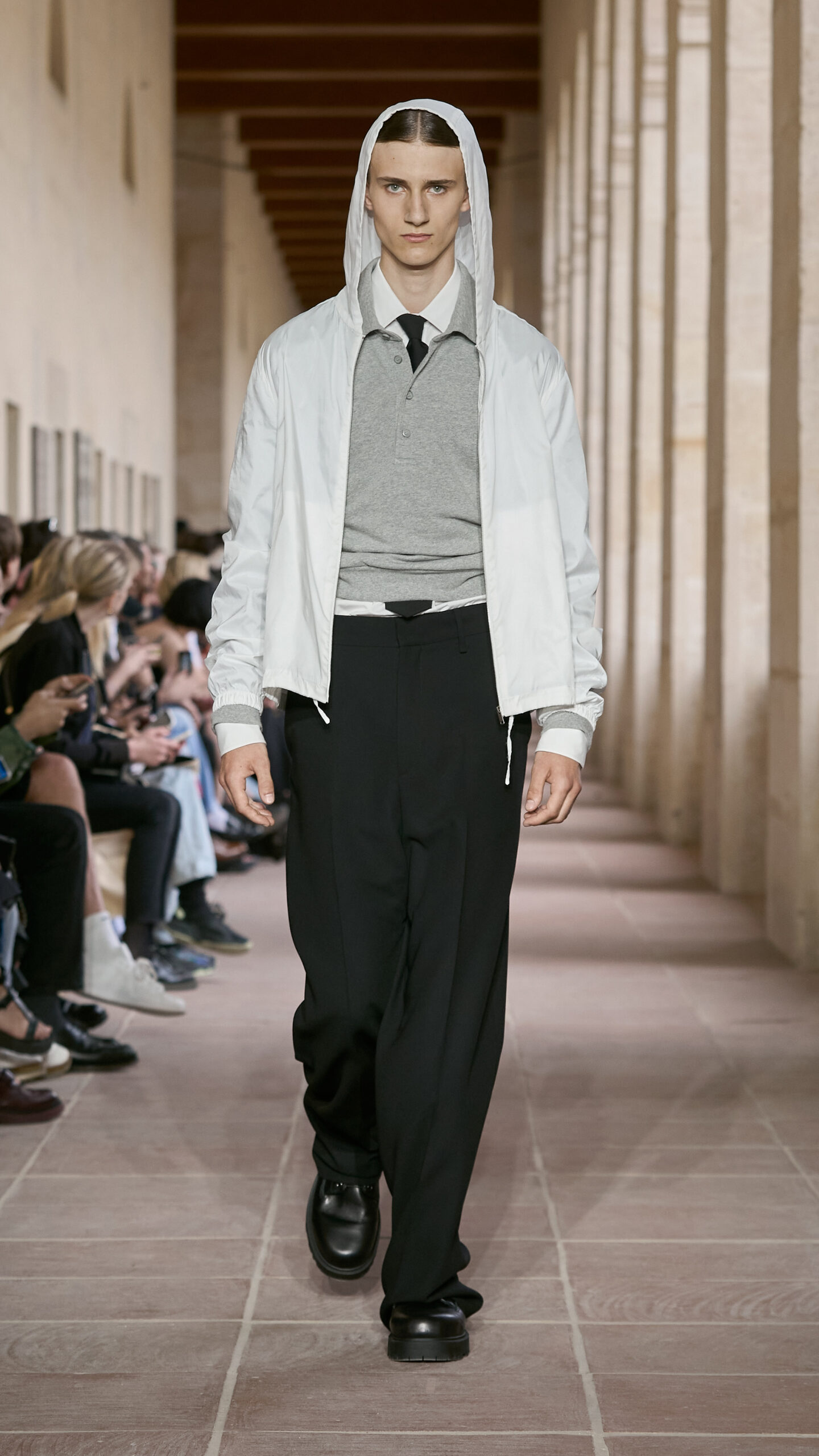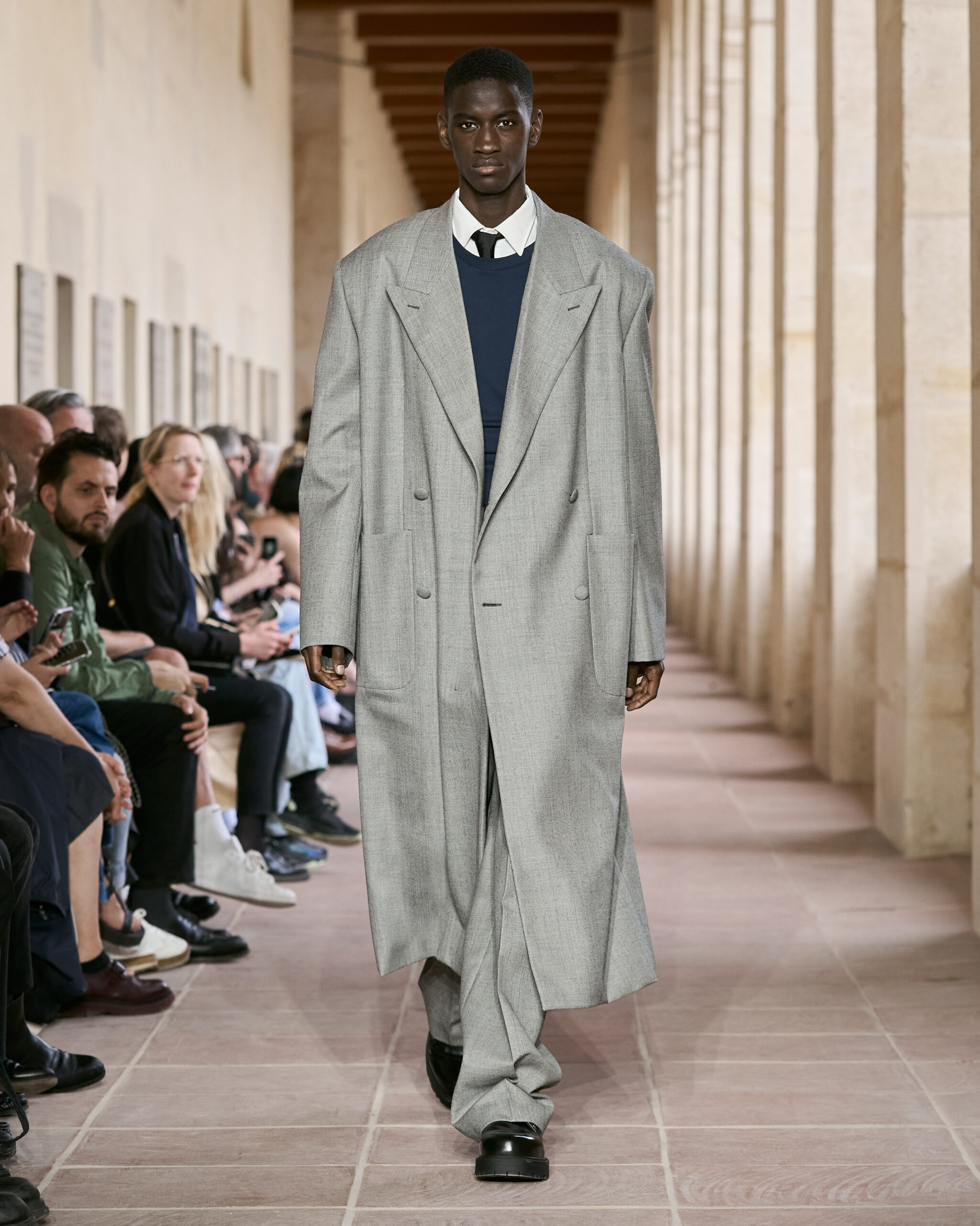 La silhouette évolue pour explorer les articles essentiels de la garde-robe, sublimés par des techniques de luxe. T-shirts longs, pièces en jersey, pantalons cargo larges et chinos surdimensionnés reflètent une idée de proportion réaliste. La texture, l’ajustement et le matériau se fusionnent pour créer une esthétique riche et multidimensionnelle, reflet d’une approche réfléchie de l’élégance masculine.
