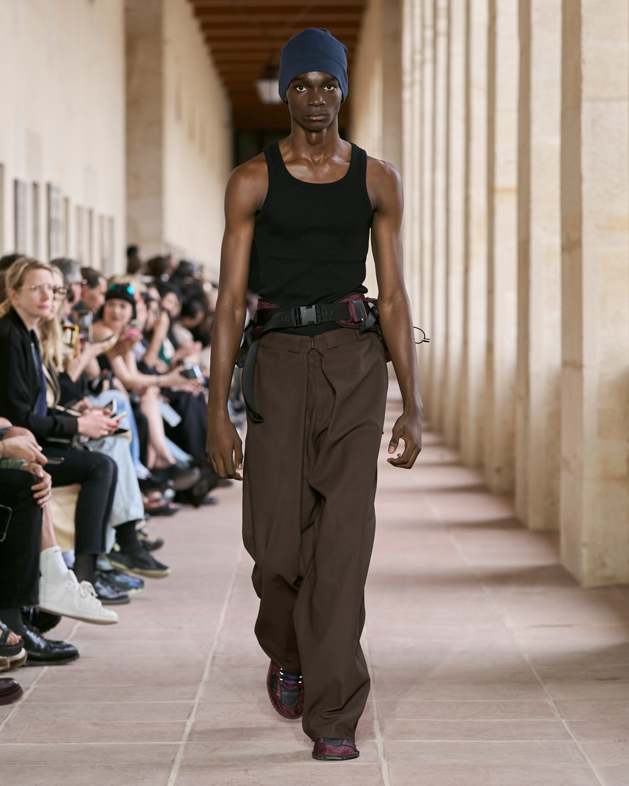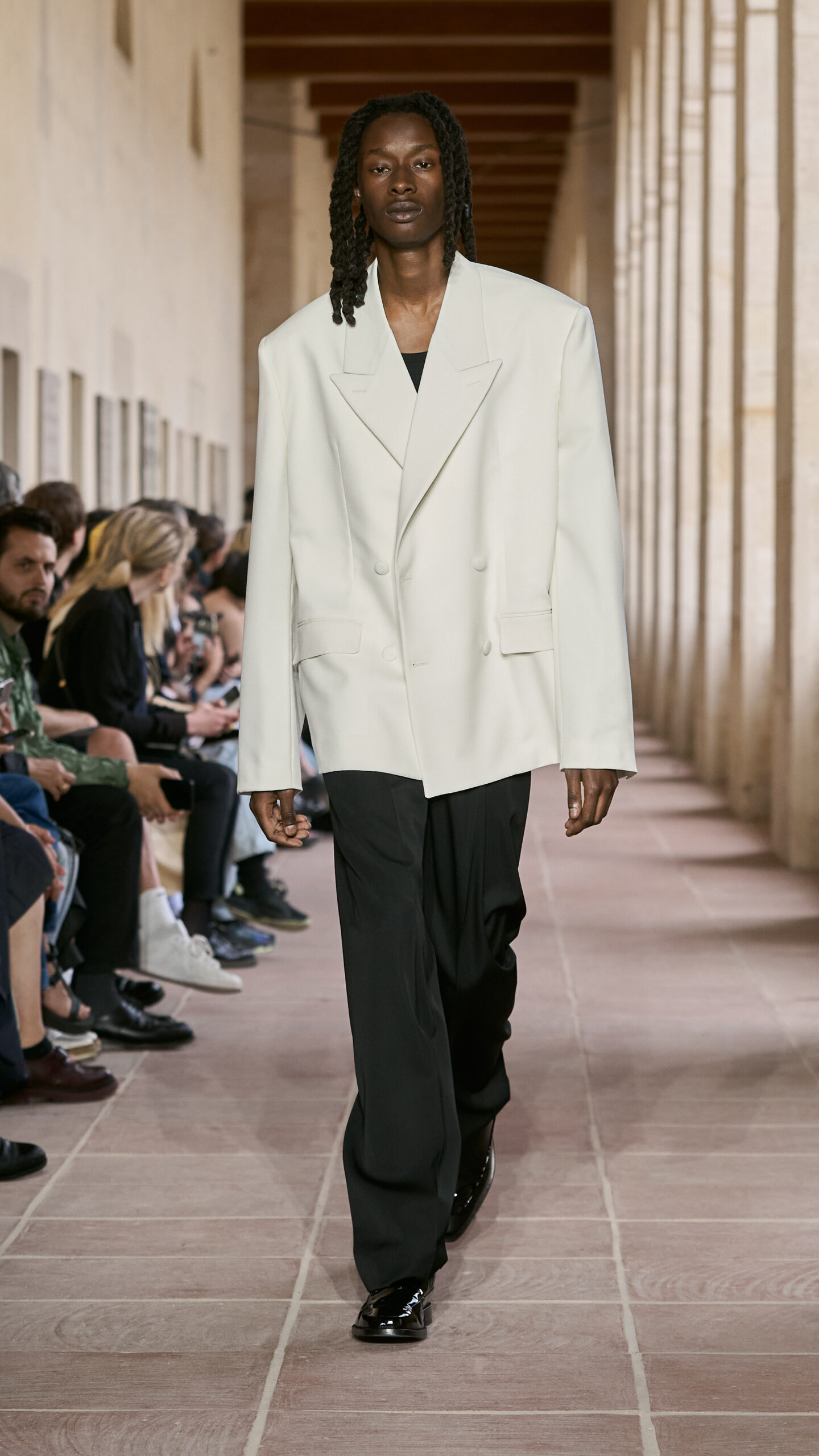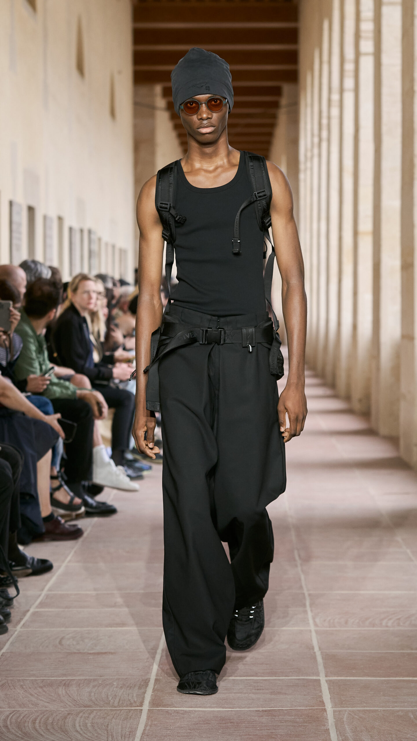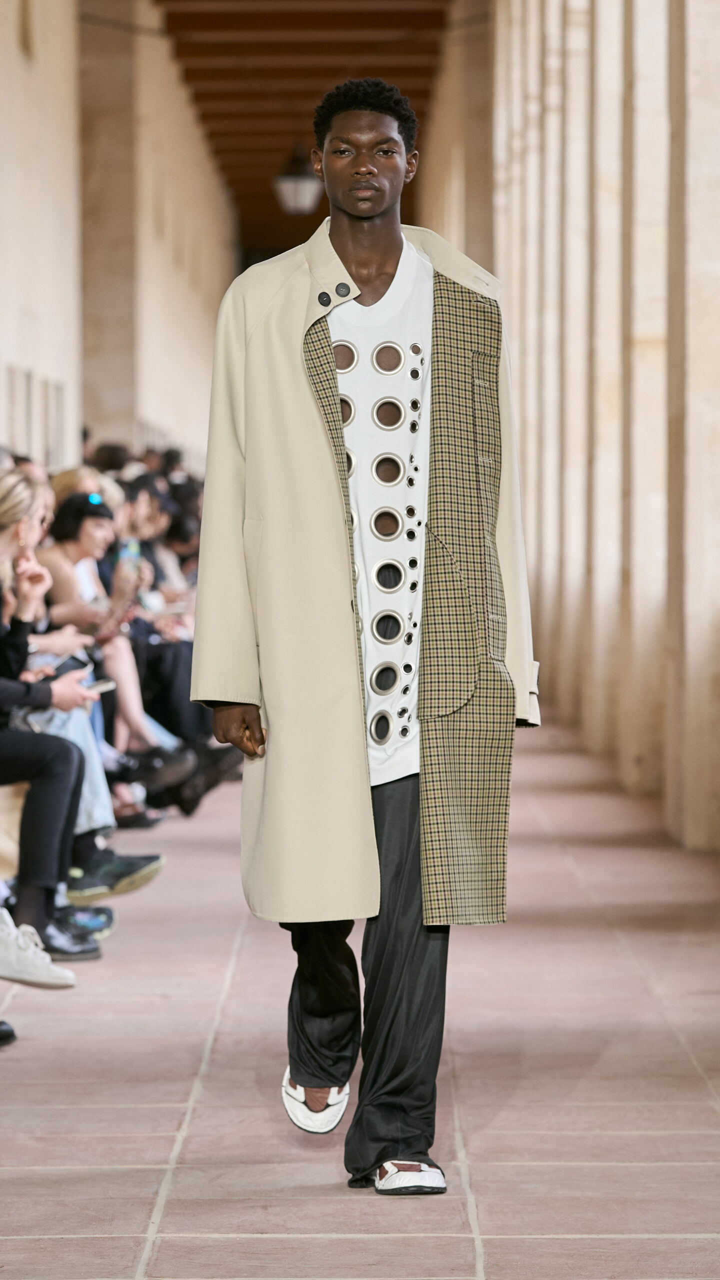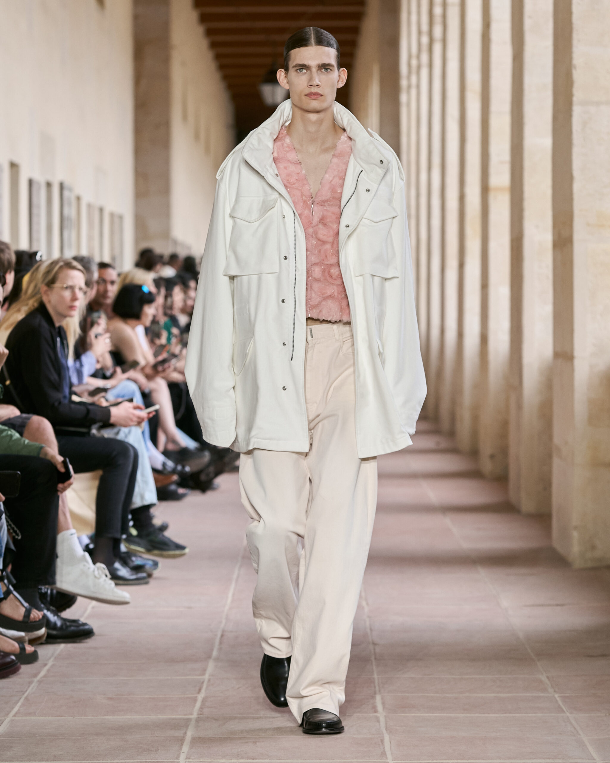 La silhouette évolue pour explorer les articles essentiels de la garde-robe, sublimés par des techniques de luxe. T-shirts longs, pièces en jersey, pantalons cargo larges et chinos surdimensionnés reflètent une idée de proportion réaliste. La texture, l’ajustement et le matériau se fusionnent pour créer une esthétique riche et multidimensionnelle, reflet d’une approche réfléchie de l’élégance masculine.
