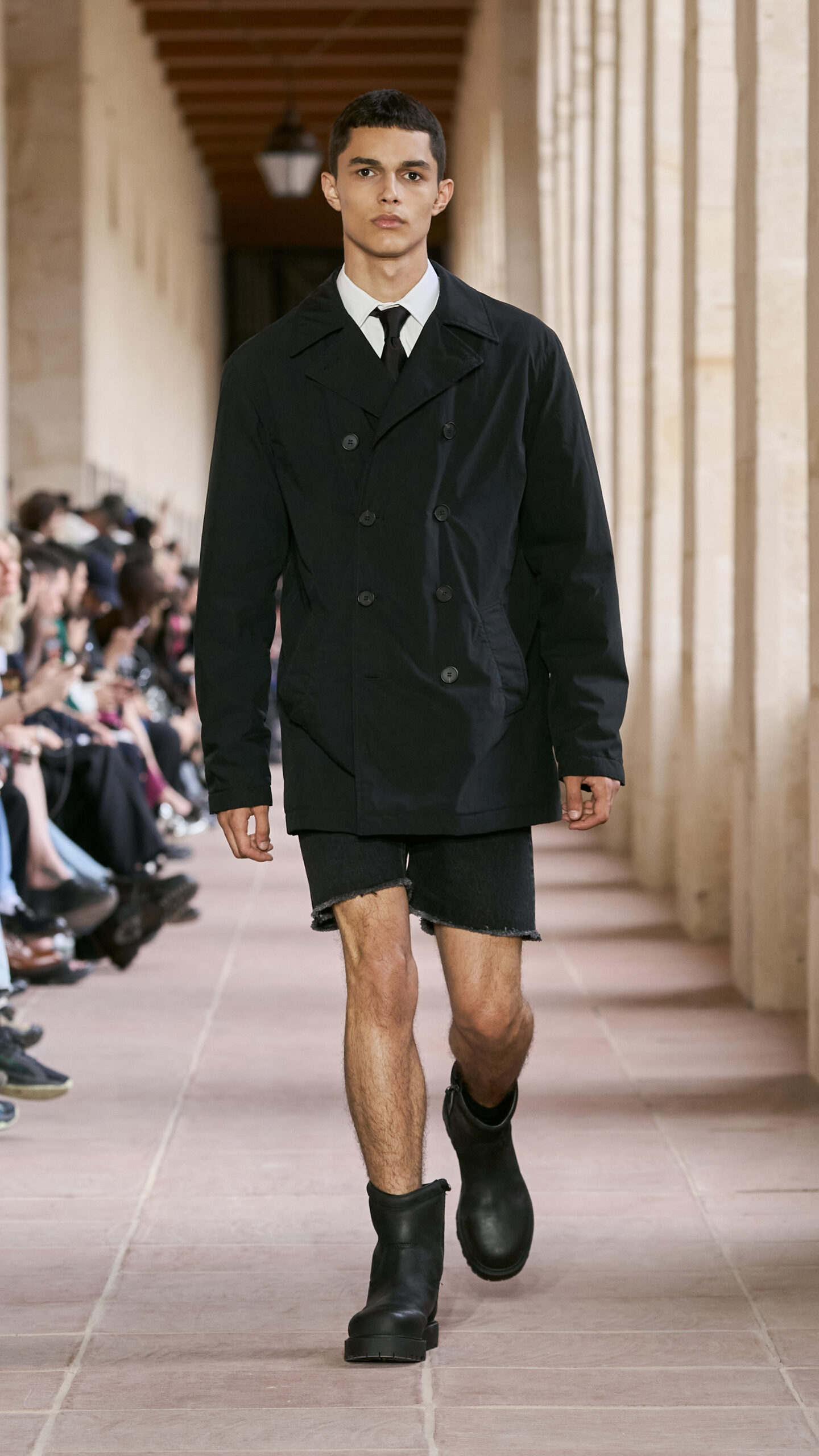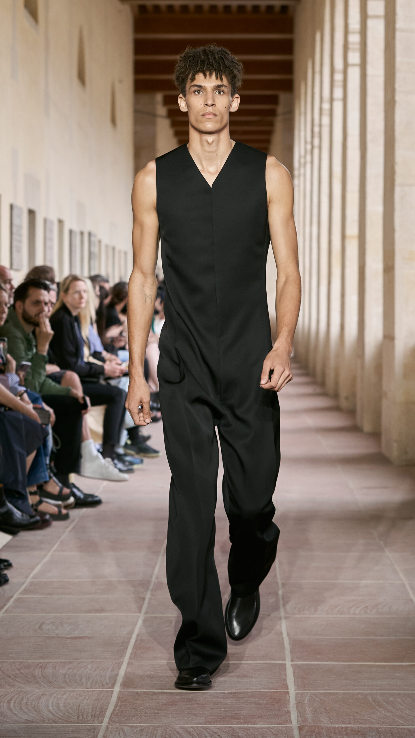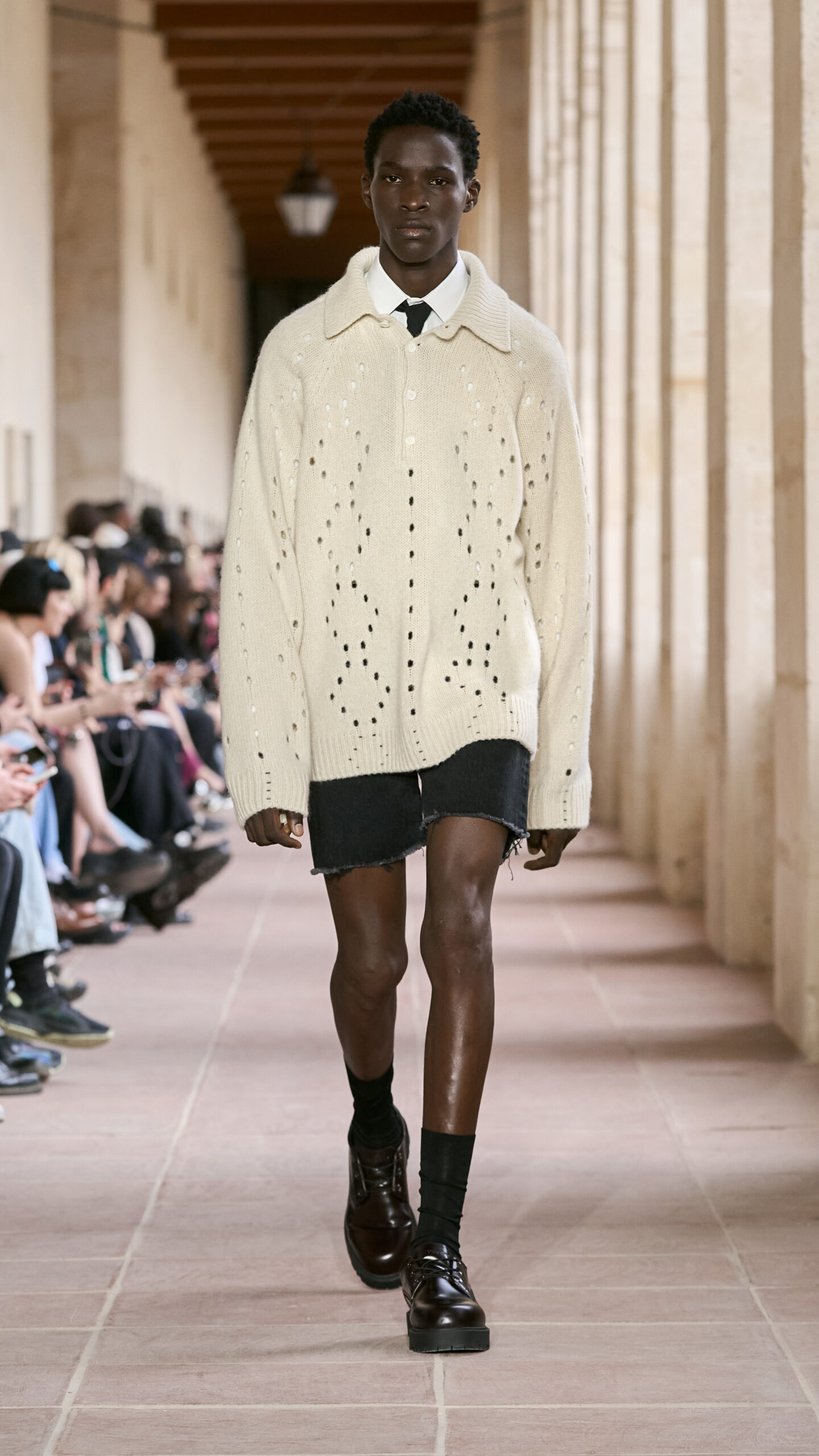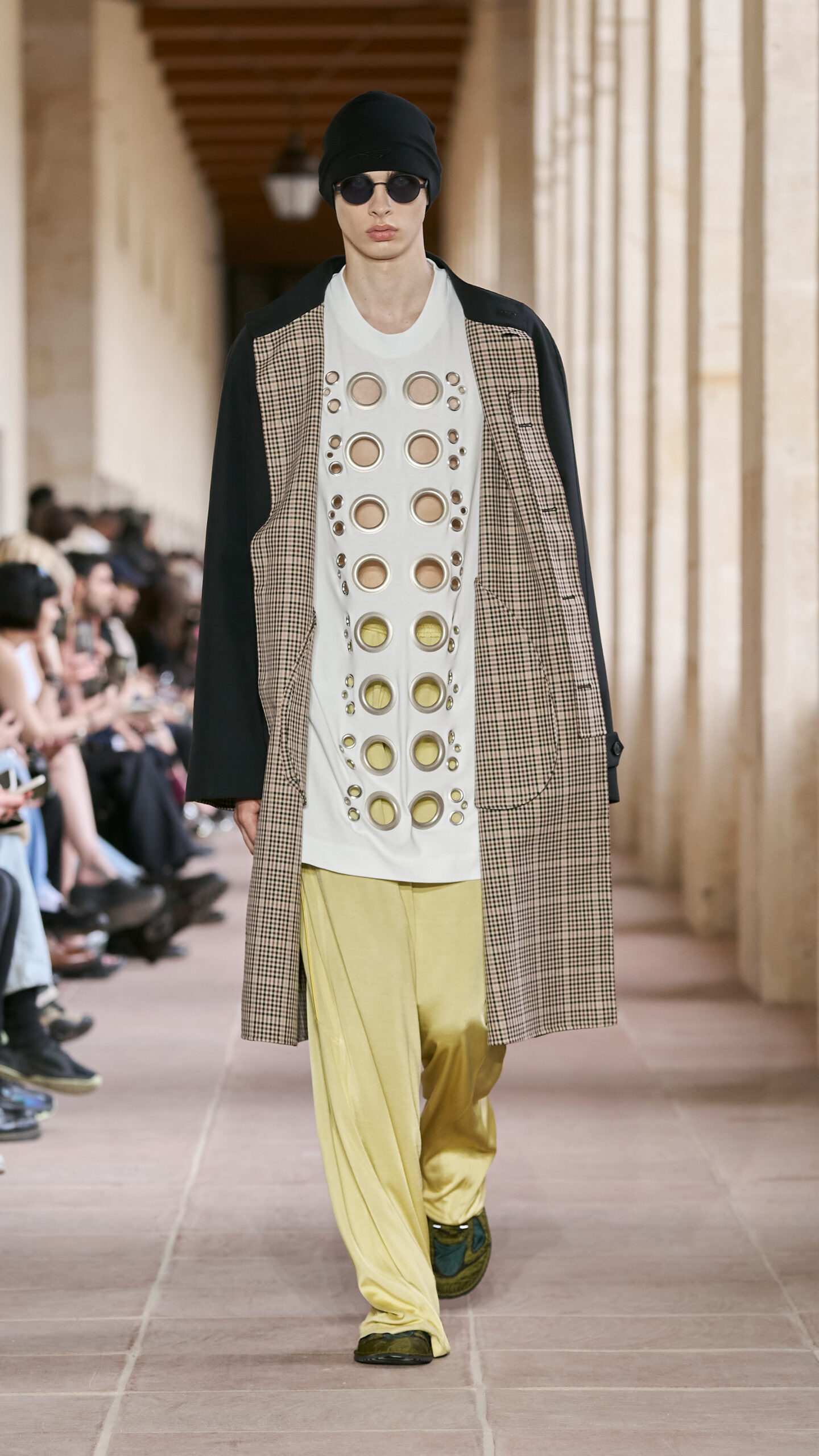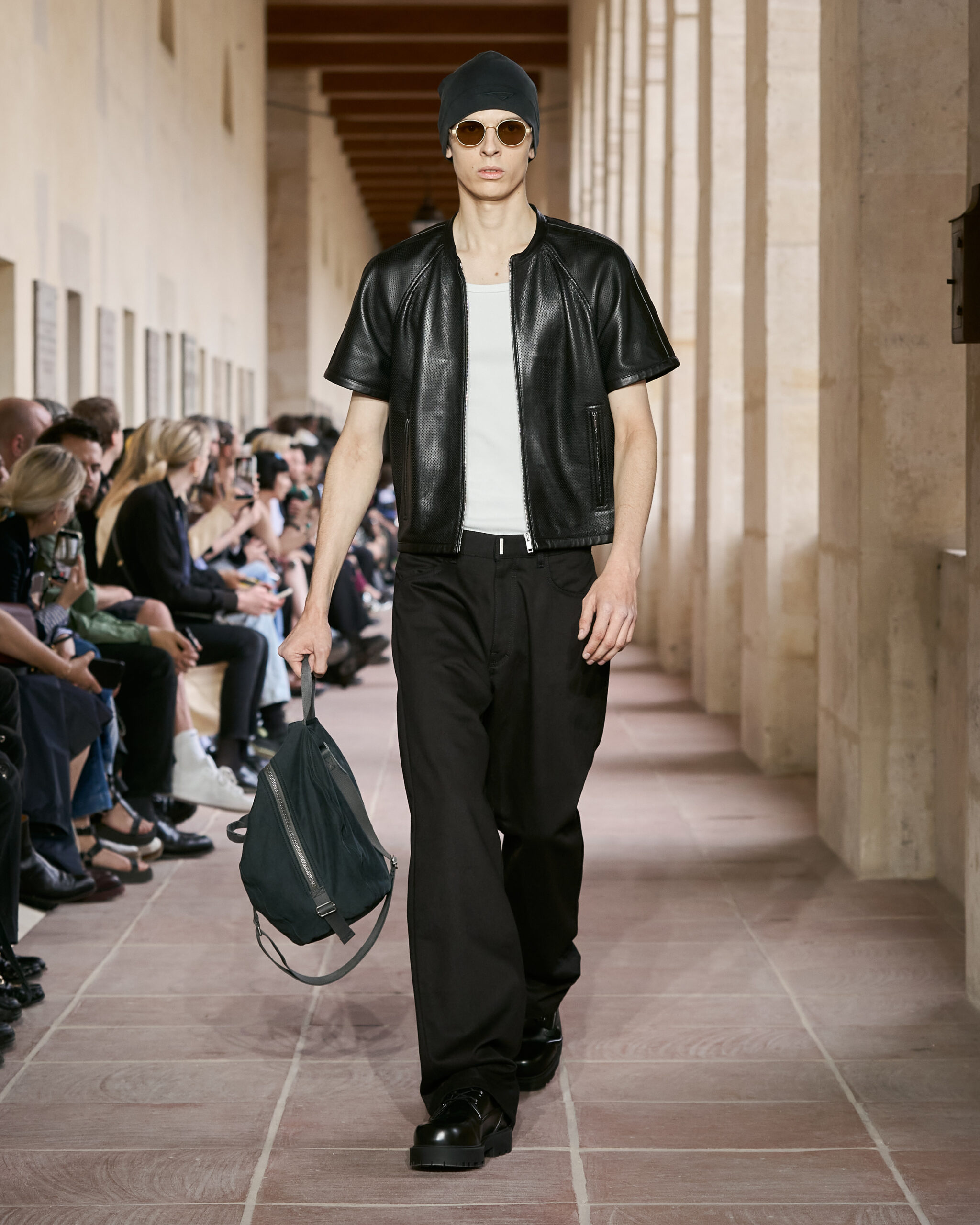 La silhouette évolue pour explorer les articles essentiels de la garde-robe, sublimés par des techniques de luxe. T-shirts longs, pièces en jersey, pantalons cargo larges et chinos surdimensionnés reflètent une idée de proportion réaliste. La texture, l’ajustement et le matériau se fusionnent pour créer une esthétique riche et multidimensionnelle, reflet d’une approche réfléchie de l’élégance masculine.
