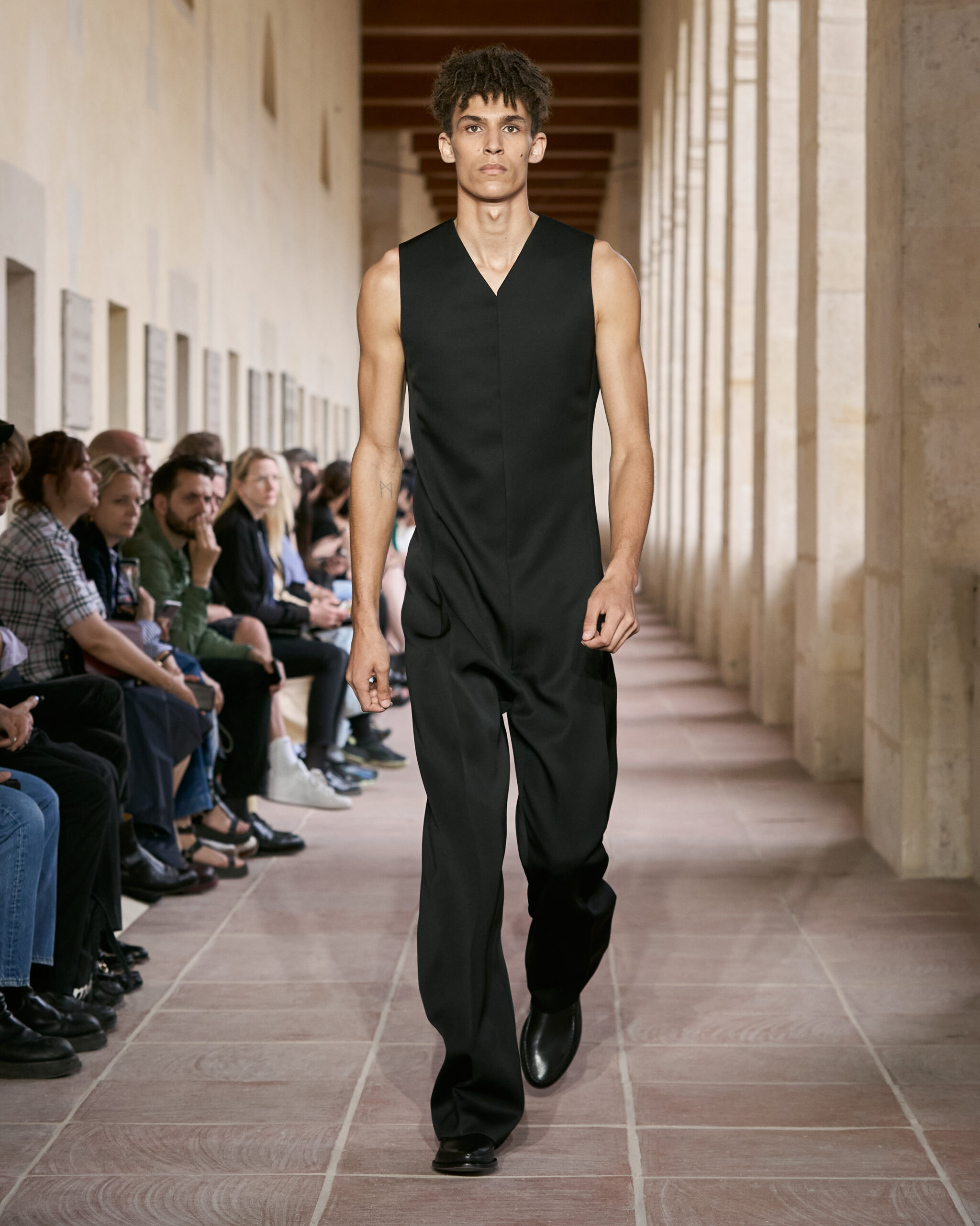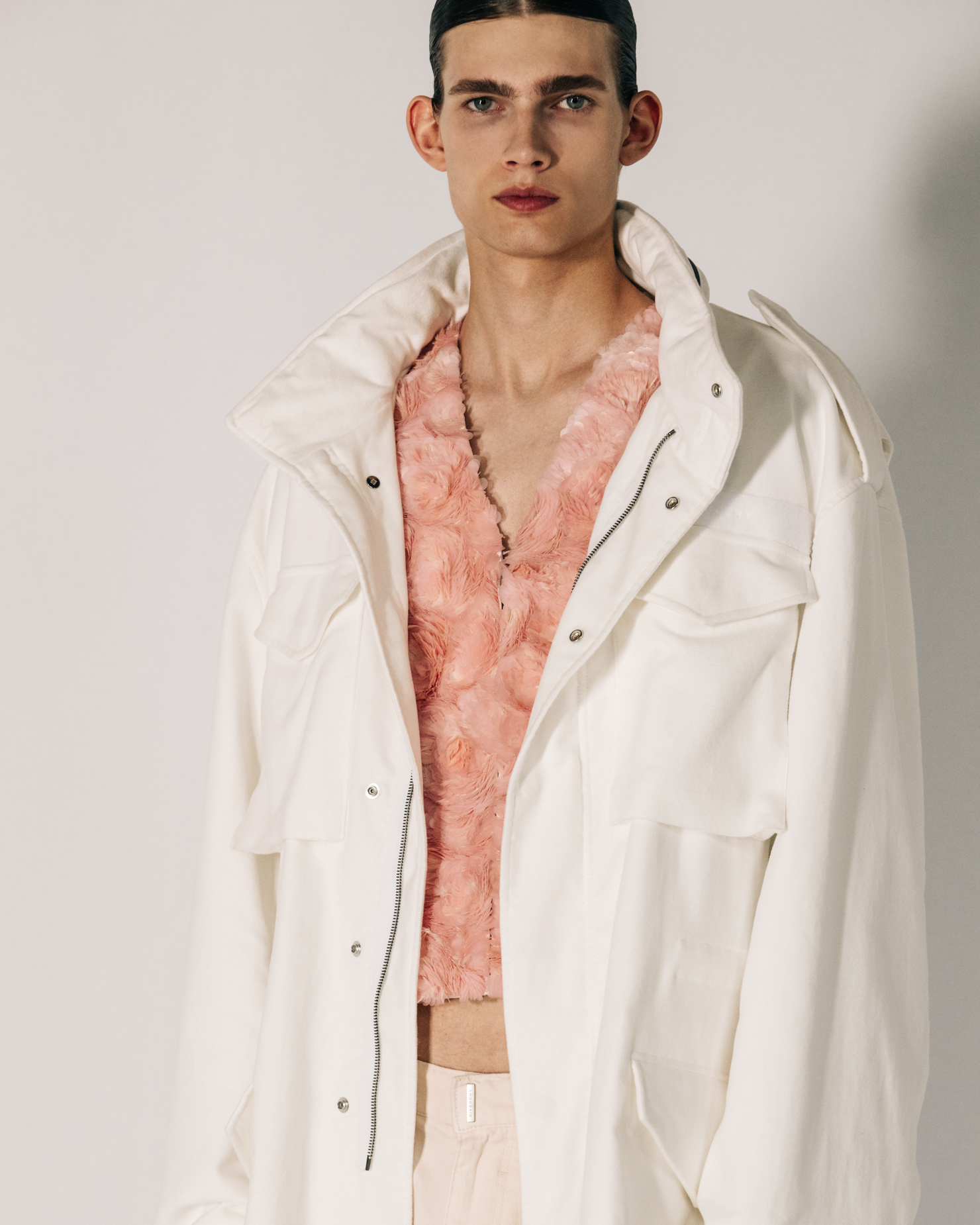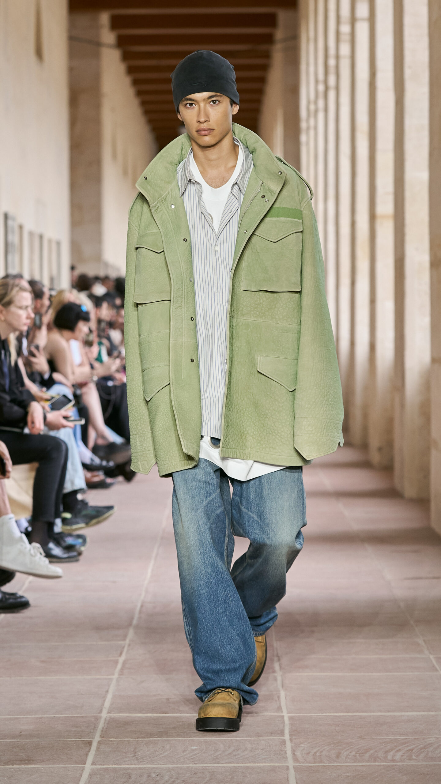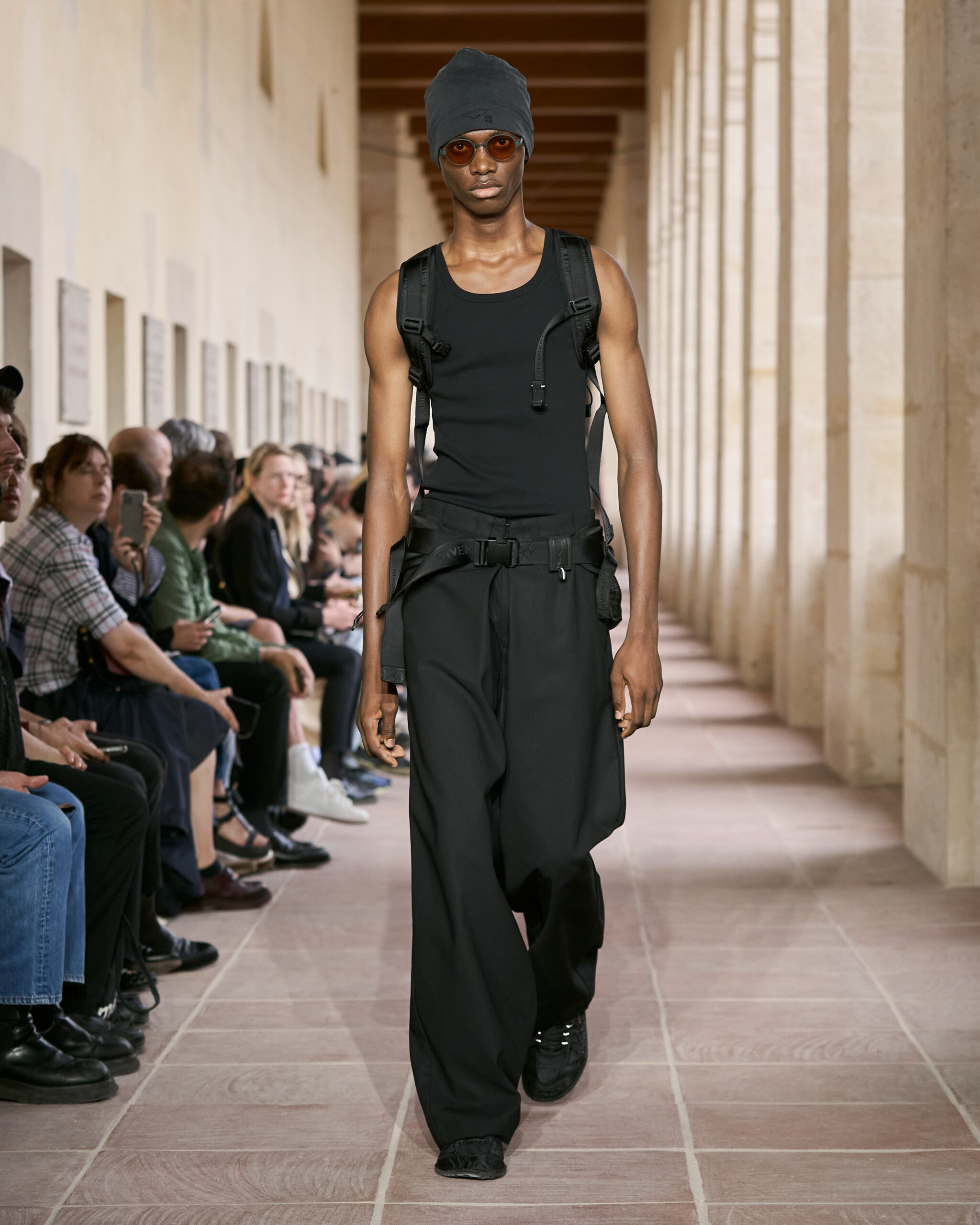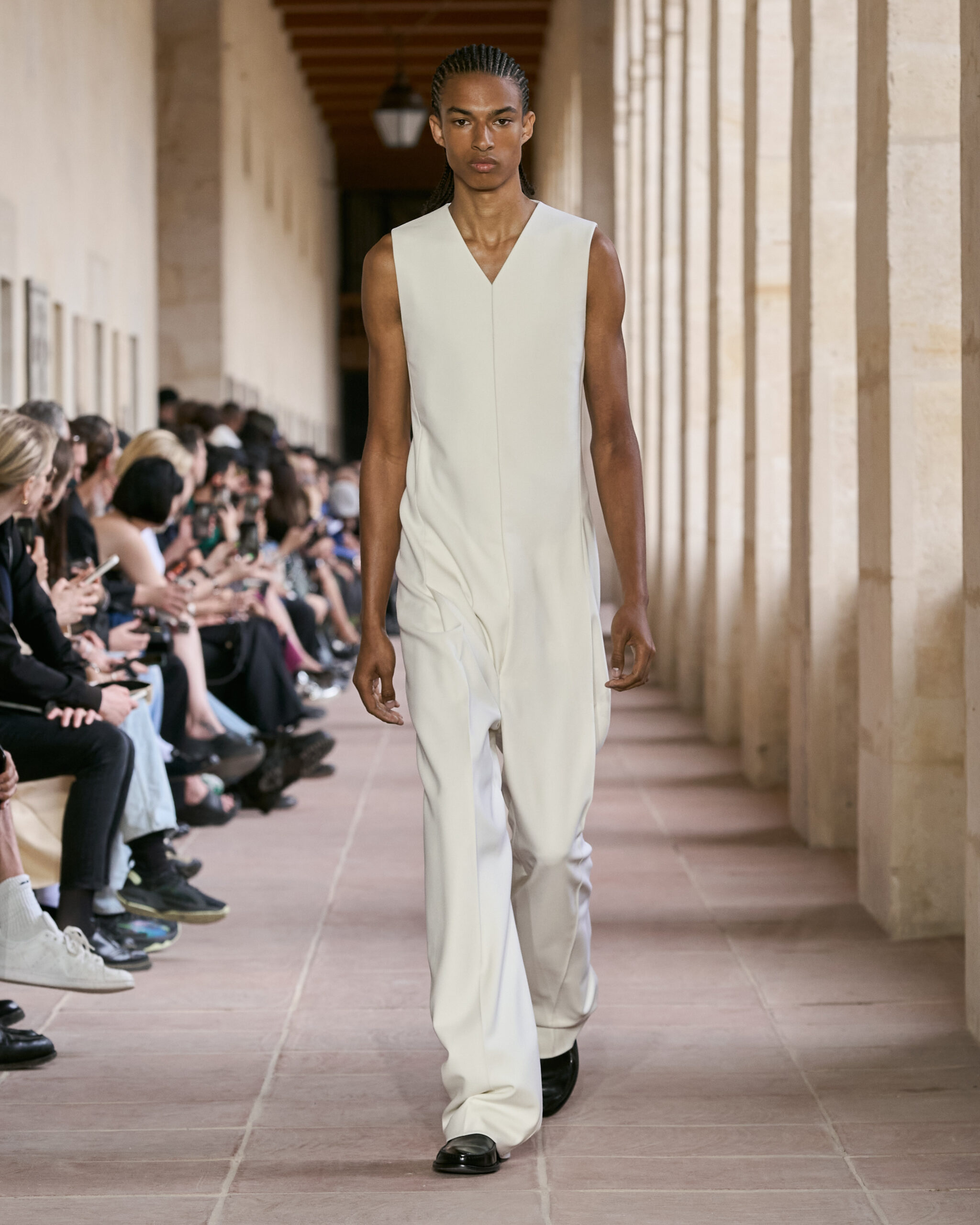 La silhouette évolue pour explorer les articles essentiels de la garde-robe, sublimés par des techniques de luxe. T-shirts longs, pièces en jersey, pantalons cargo larges et chinos surdimensionnés reflètent une idée de proportion réaliste. La texture, l’ajustement et le matériau se fusionnent pour créer une esthétique riche et multidimensionnelle, reflet d’une approche réfléchie de l’élégance masculine.